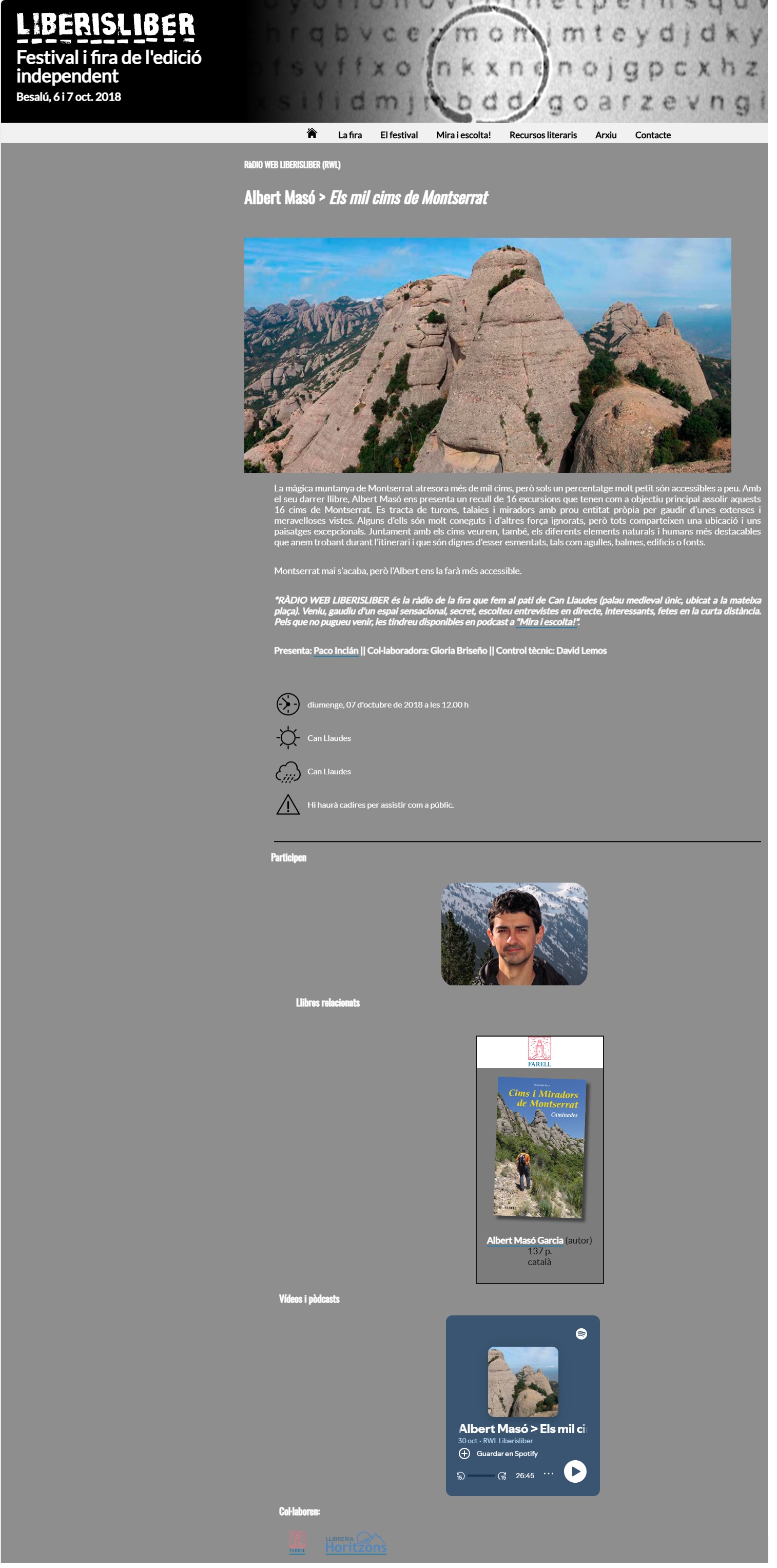 - “Els mil cims de Montserrat”, de Ràdio Web Liberisliber (RWL), dins la Fira d’editorials independents de Besalú (Garrotxa), any 2018. Entrevista realitzada el dia 7 d’octubre de 2018 per l’editor Paco Inclán a Albert Masó Garcia al voltant de la publicació del seu llibre “Cims i miradors de Montserrat“. Veure imatge de la web aquí.