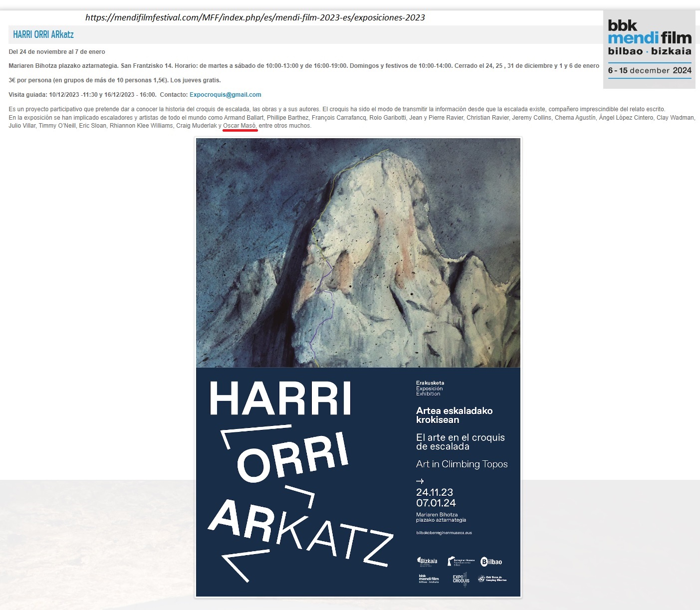 - “Harri-Orri-Arkatz”, exposició de croquis d’escalada a nivell mundial, del 24-11-2023 al 07-01-2024, situada dins l’impressionant jaciment de la plaça Corazón de María de Bilbao, dins del marc del BBK Mendi Film Bilbao Bizkaia, realitzat pel mateix grup d'”Expocroquis”, format per Eli Azurmendi, Rafa Elorza i Juancar Sanz, autors del llibre “El arte en el croquis de escalada”, on hi van col·laborar Albert i Òscar Masó Garcia, els quals també han col·laborat en aquesta exposició aportant contactes i dades rellevants sobre el món dels croquis d’escalada: