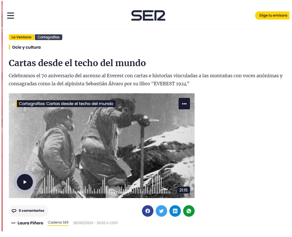- Programa de ràdio “La ventana” de la cadena SER, dirigit per Carles Francino. Dia 29-5-2023, apartat “Cartagrafías” dedicat a les cartes, amb el capítol “Cartas desde el techo del mundo”, realitzat per Laura Piñero acompanyada de C. Francino. Es parla de “Libros de cima, una historia de pasión y conquista”, on surt Òscar Masó Garcia entrevistat, i també s’entrevista a l’alpinista Sebastián Álvaro. Es pot escoltar el podcast aquí. En castellà.