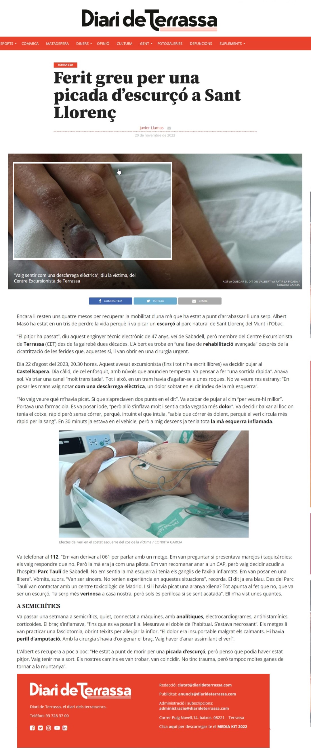 - Ferit greu per una picada d’escurçó a Sant Llorenç, Diari de Terrassa, versió web del dia 20-11-2023 amb dues fotografies de Conxita Garcia Pérez i versió paper del dia 21-11-2023. Entrevista-crònica de Javier Llamas a Albert Masó, que tracta sobre la picada d’escurçó patida per l’Albert i les seves conseqüències. La mateixa notícia va aparèixer el dia 21-11-2023 a Nació Terrassa i a la Ràdio Sabadell (versió web, Facebook, etc) maquillada però extreta fil per randa de la notícia original del Diari de Terrassa.