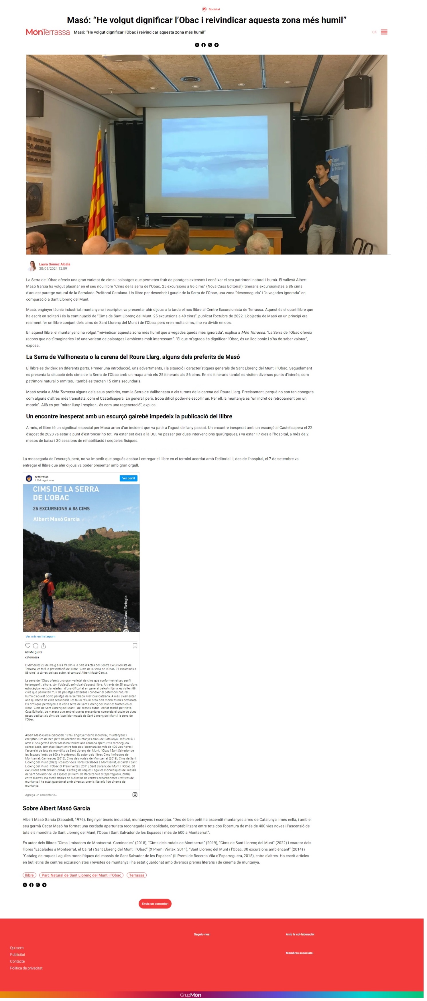 - MónTerrassa (noticiari): “Masó: “He volgut dignificar l’Obac i reivindicar aquesta zona més humil”, dia 30-05-2024. Entrevista realitzada per Laura Gómez Alcalà a Albert Masó Garcia sobre el llibre “Cims de la Serra de l’Obac”.