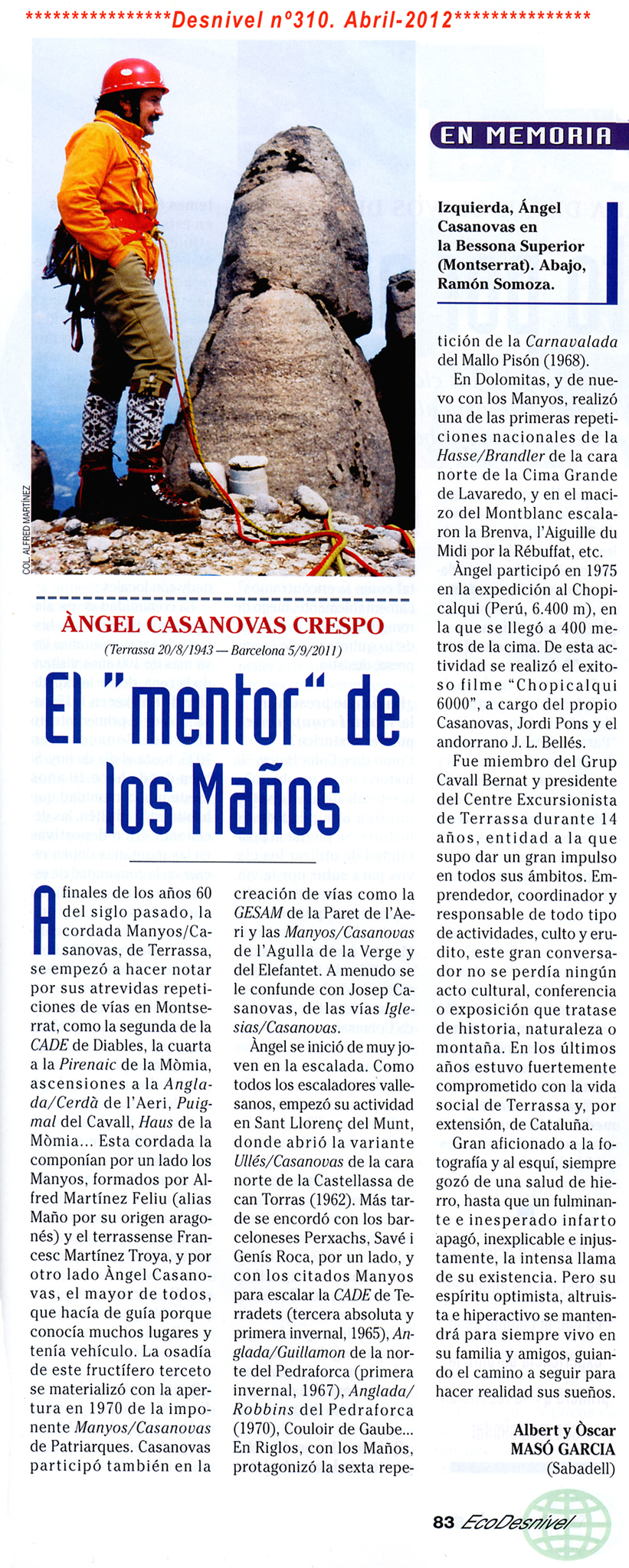- “Àngel Casanovas Crespo. El mentor de los Maños”. Revista DESNIVEL. Nº 310 (abril 2012), secció “En memoria“. Obituari biogràfic dedicat a un destacat alpinista terrassenc, aperturista, emprenedor i president del C.E. de Terrassa. En castellà.