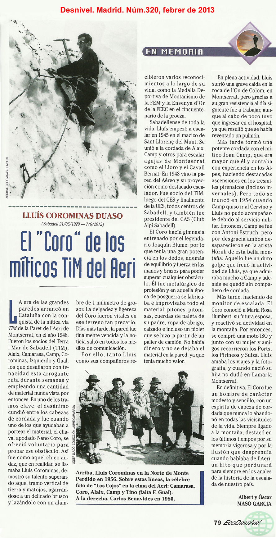 - “El “Coro” de los míticos TIM del Aeri”. Revista DESNIVEL. Nº 320 (febrer 2013), secció “En memoria“. Obituari biogràfic dedicat a Lluís Corominas Duaso, pioner escalador sabadellenc que formà part dels aperturistes de la històrica via TIM a la Paret de l’Aeri de Montserrat, l’any 1948. Amb fotografies històriques. En castellà.
