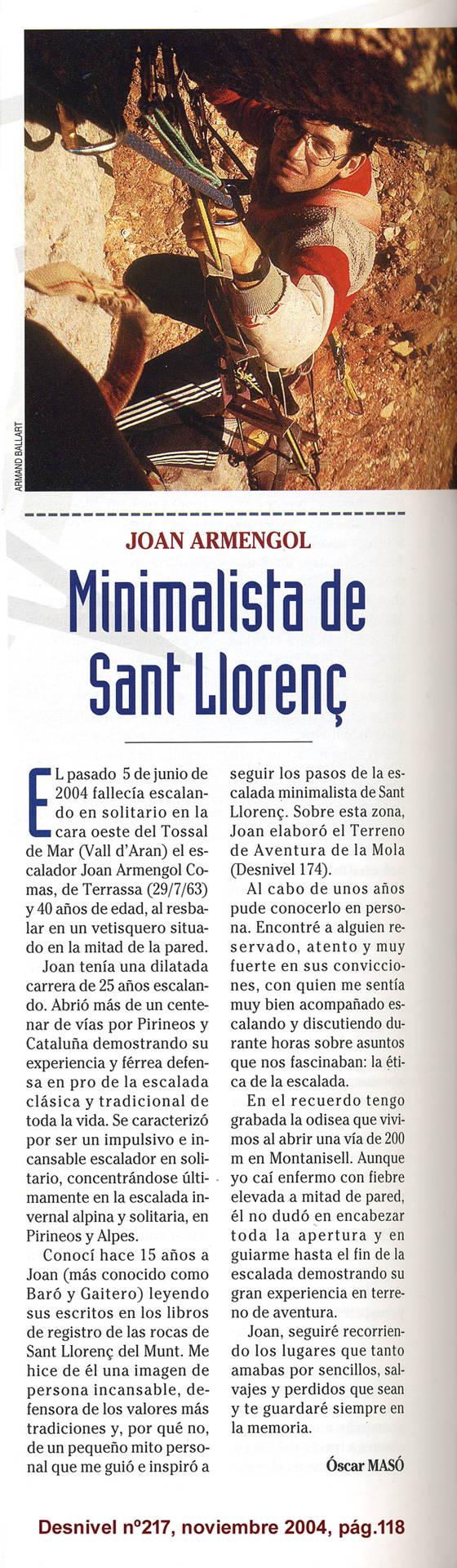 - “Joan Armengol. Minimalista de Sant Llorenç”. Revista DESNIVEL. Nº 217 (novembre 2004), secció “En memoria“. Obituari de l’escalador aperturista i alpinista Joan Armengol Comas, de Terrassa, glossant la seva trajectòria, filosofia i experiència personal. En castellà.