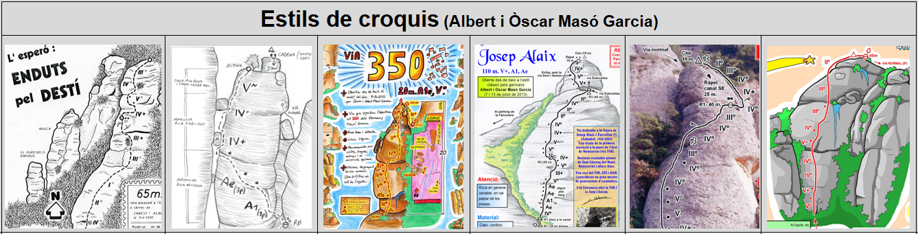 Per cada via oberta han confeccionat una ressenya (o croquis) que consta, essencialment, del recorregut de la via i les seves dades tècniques, sovint amb certs tocs artístics. L’estil de confecció d’aquestes ressenyes és variat, tal i com es pot copsar en el següent recull: