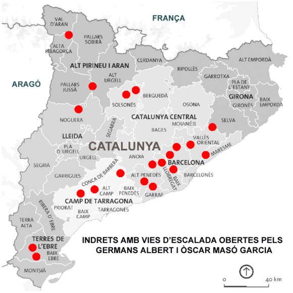 Els germans Albert i Òscar Masó Garcia han obert més de 400 vies d’escalada en roca, de caire clàssic i majoritàriament obertes des de baix en diversos massissos catalans. En el següent mapa s’indiquen els llocs on han obert vies: