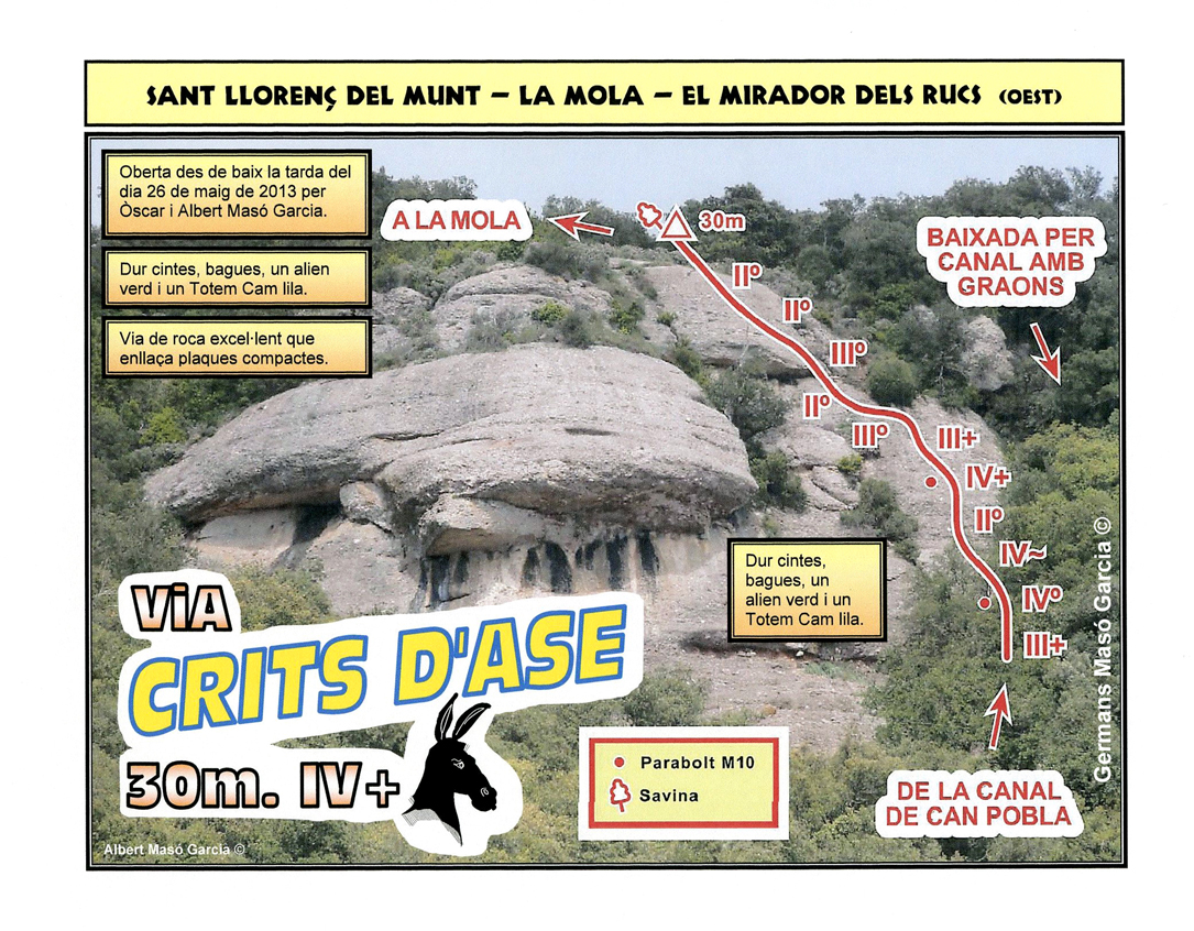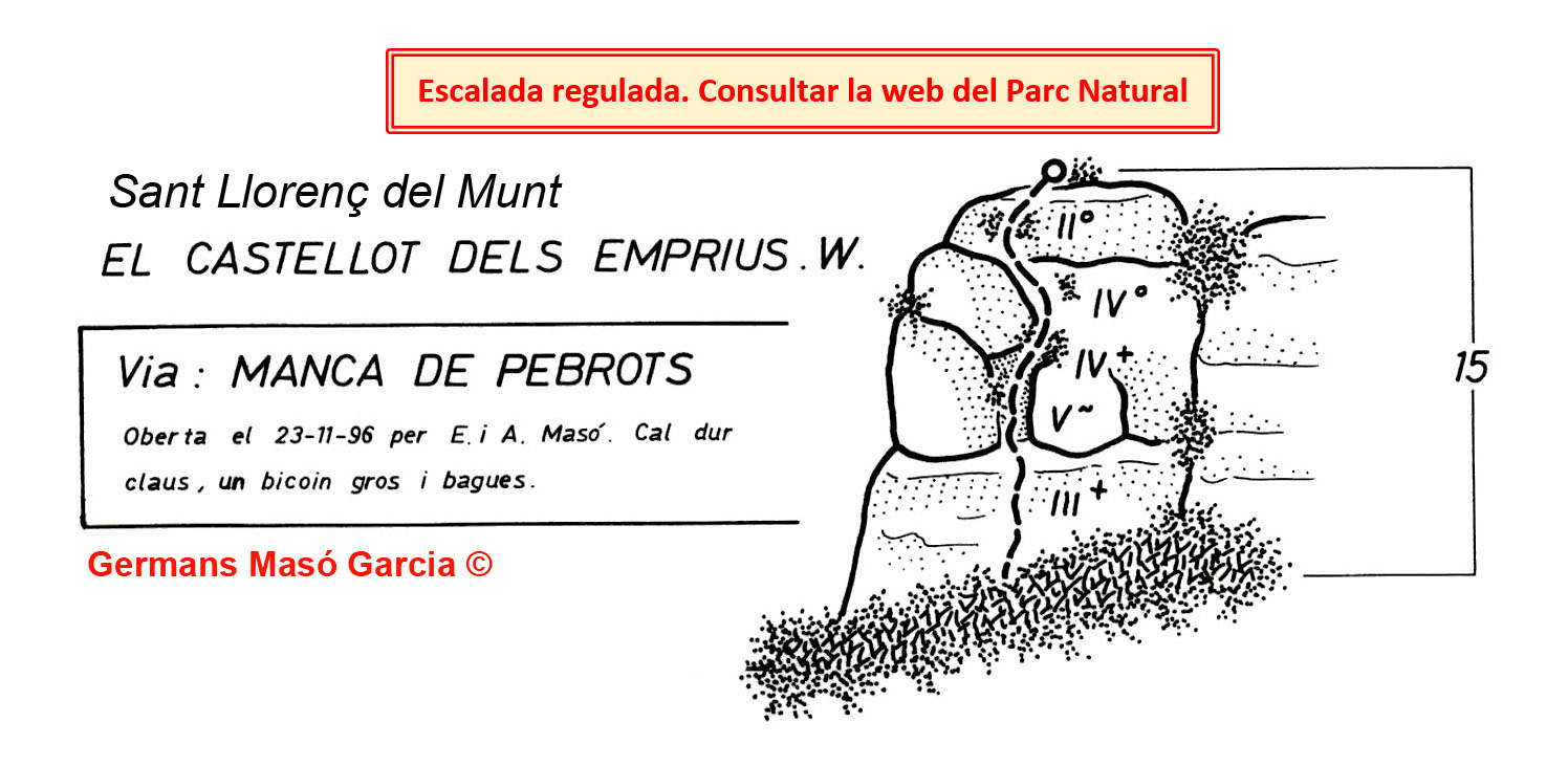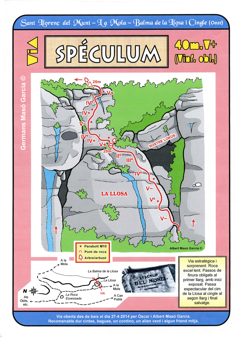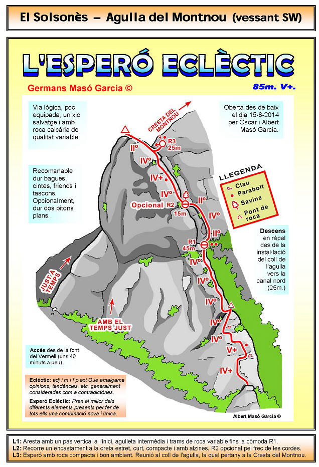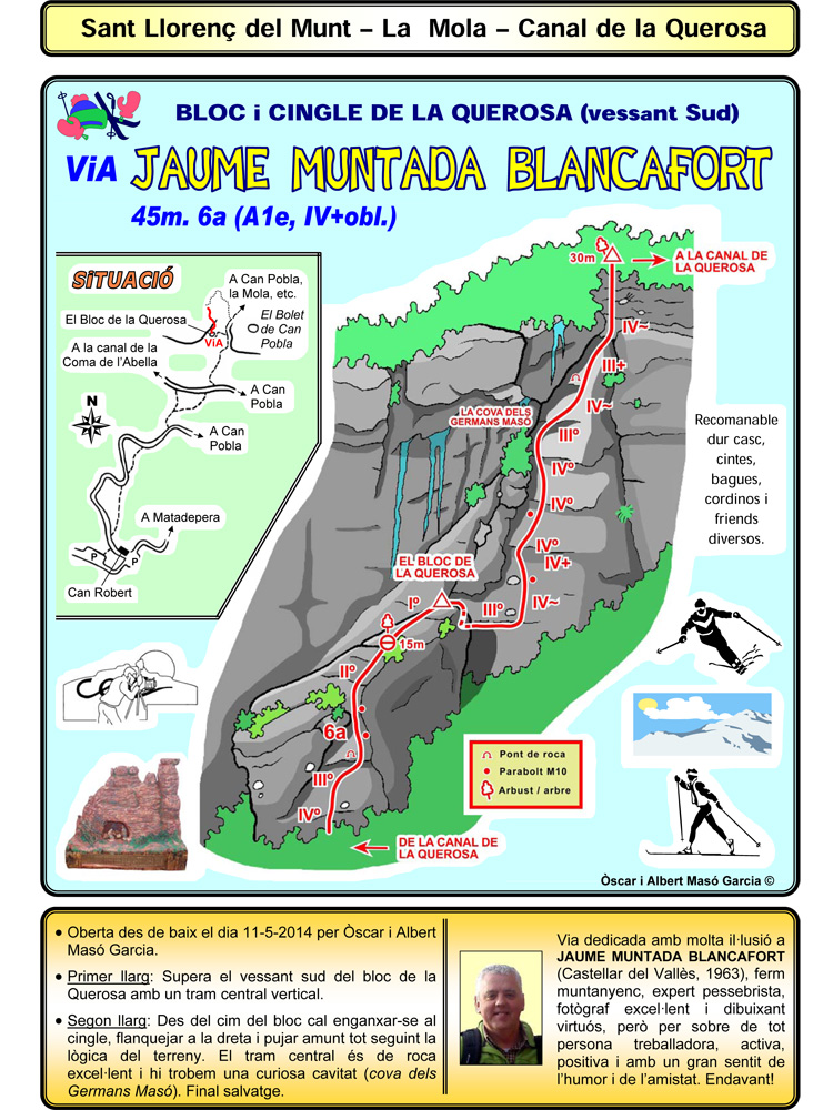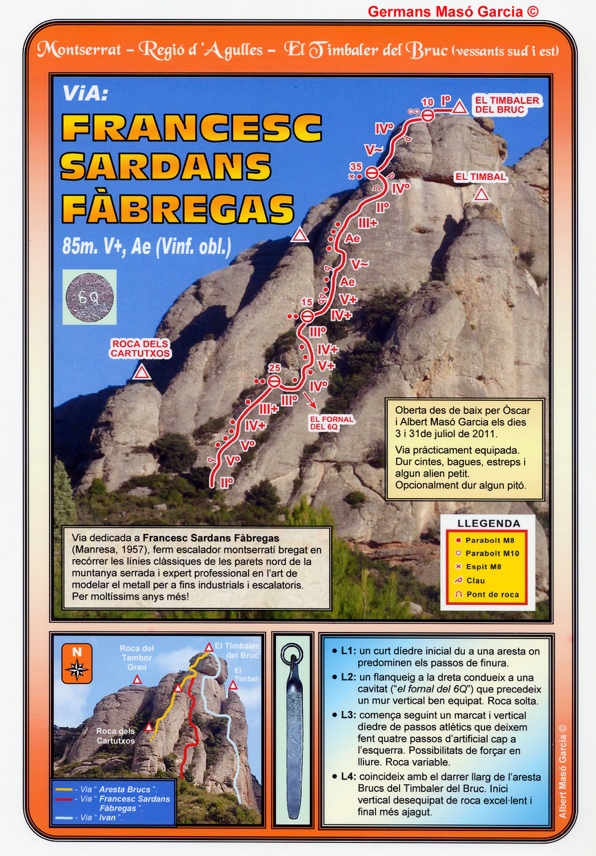 SEGURETAT: La pràctica de l’escalada és un esport que comporta risc. Tothom qui vulgui repetir alguna de les vies ressenyades en aquesta web és l’únic responsable de la seva pròpia seguretat i del conjunt de la cordada. En aquest sentit, els autors de les vies i les ressenyes declinen qualsevol responsabilitat.