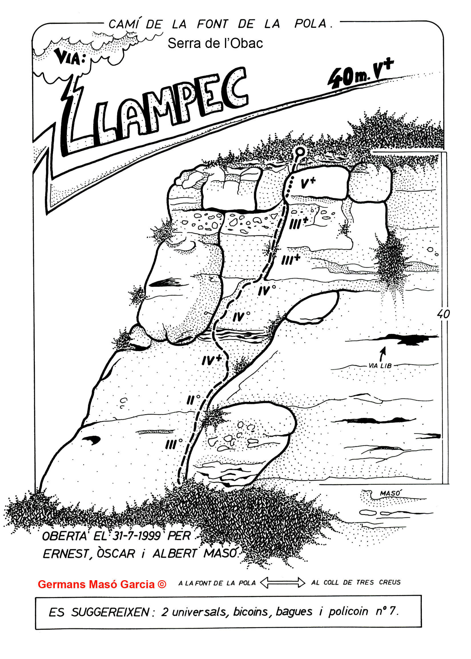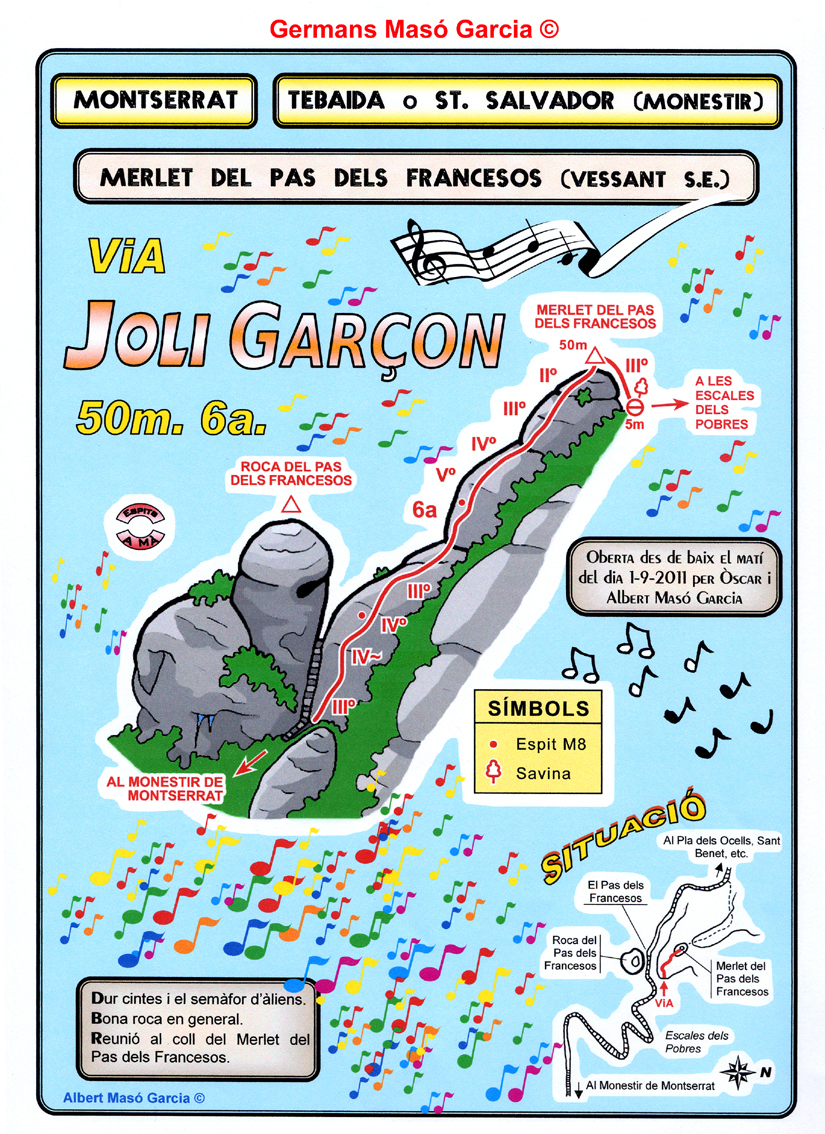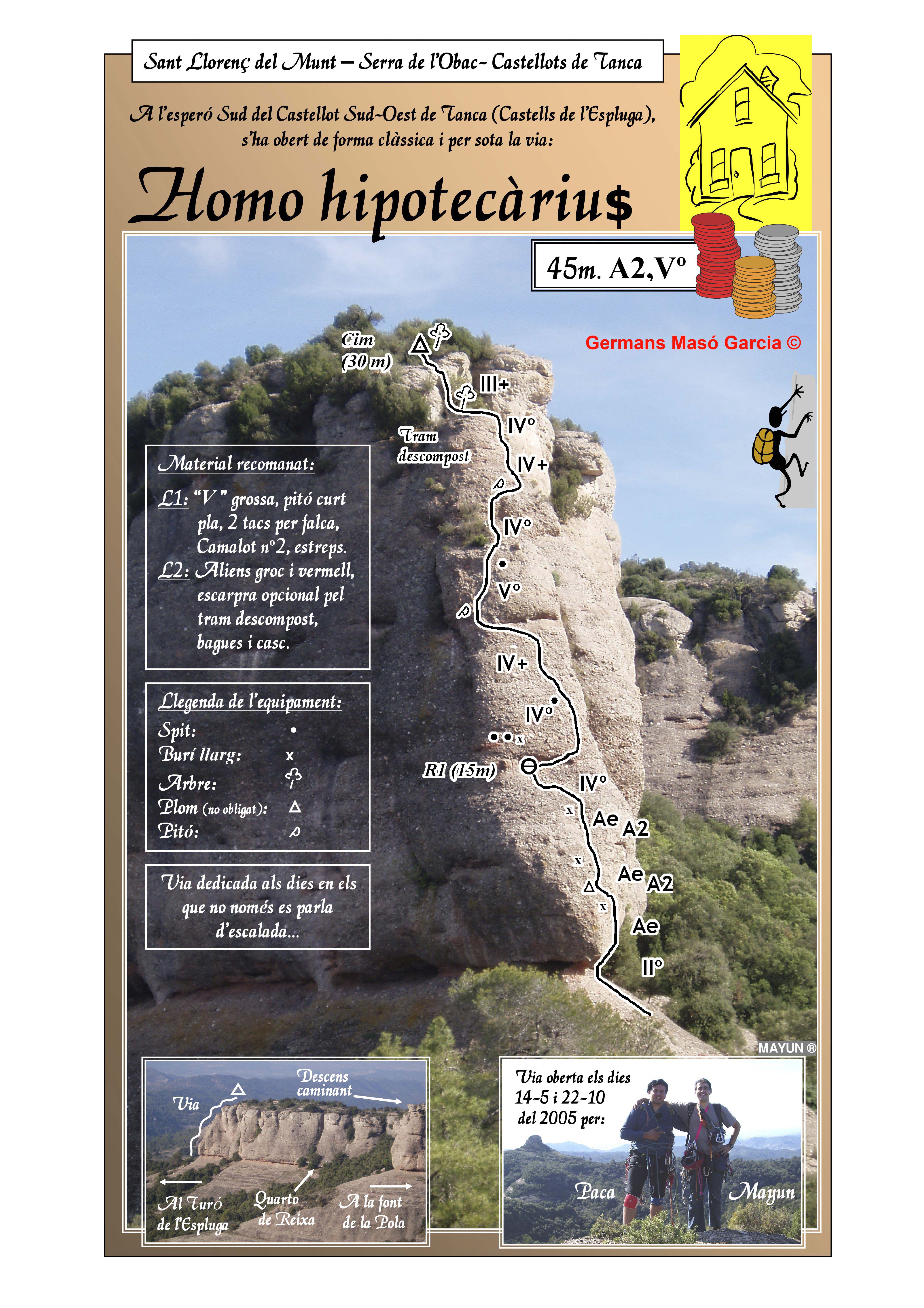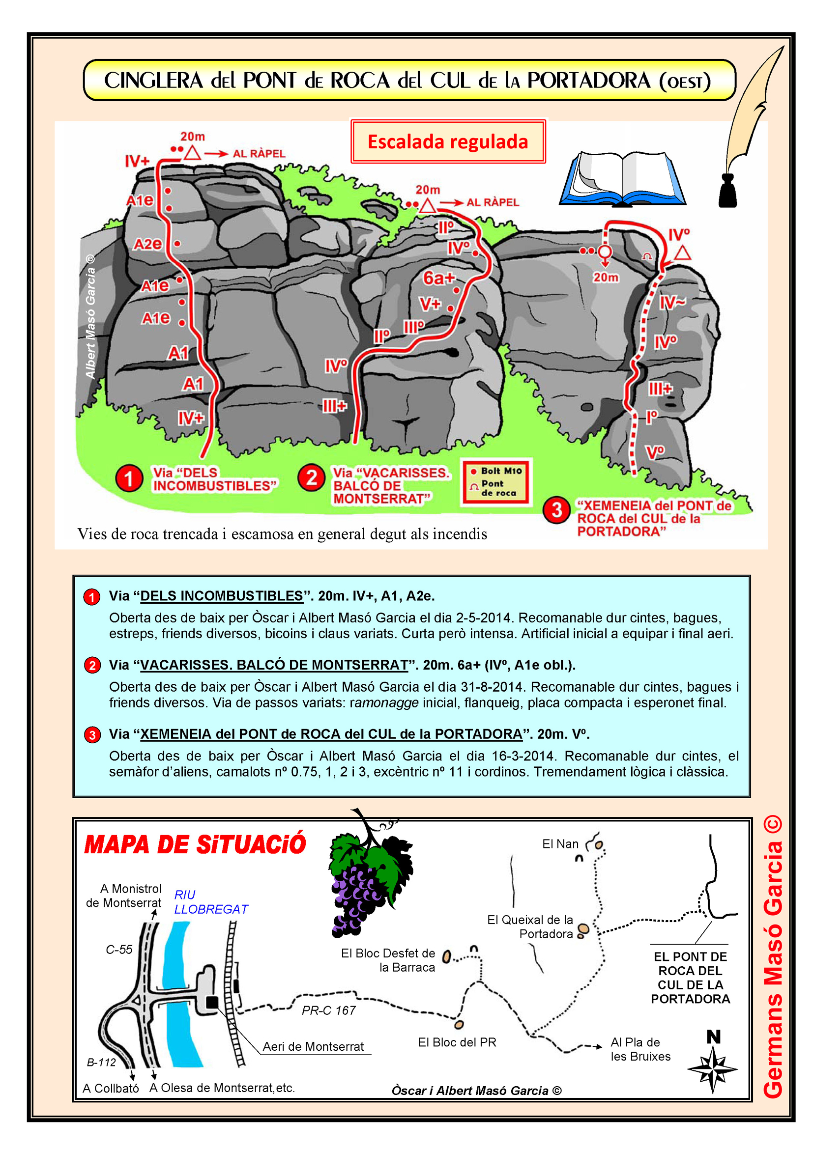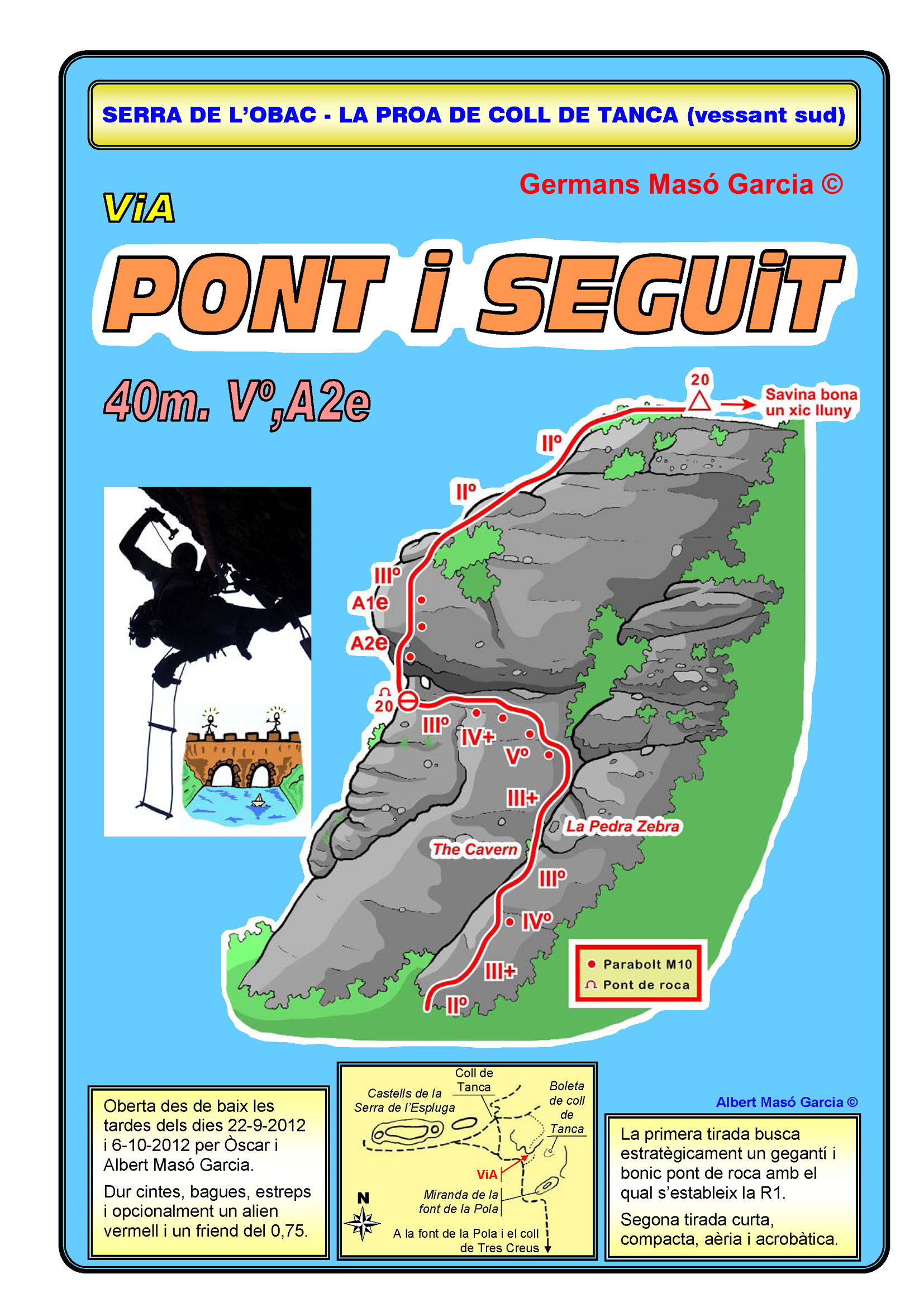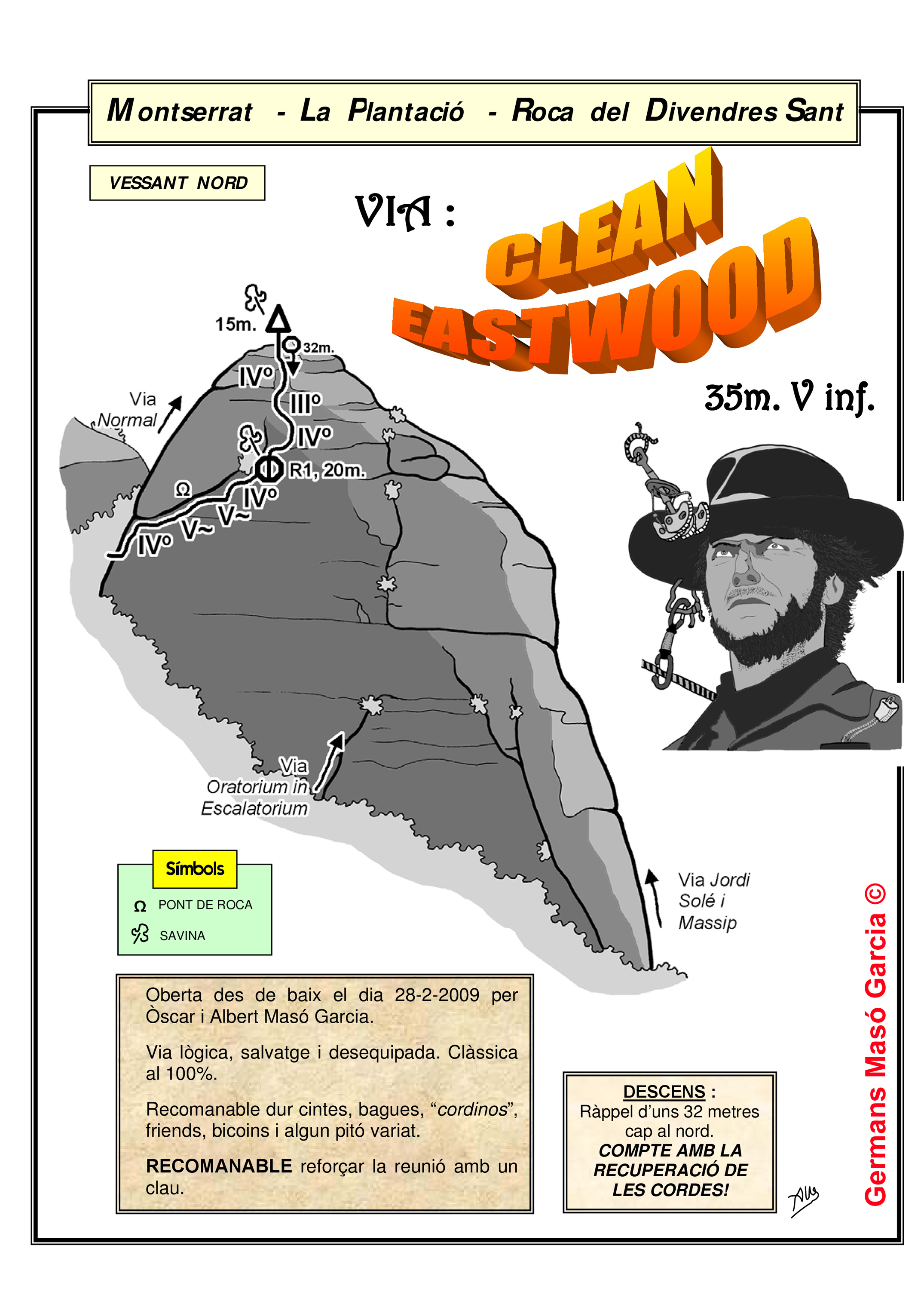 SEGURETAT: La pràctica de l’escalada és un esport que comporta risc. Tothom qui vulgui repetir alguna de les vies ressenyades en aquesta web és l’únic responsable de la seva pròpia seguretat i del conjunt de la cordada. En aquest sentit, els autors de les vies i les ressenyes declinen qualsevol responsabilitat.