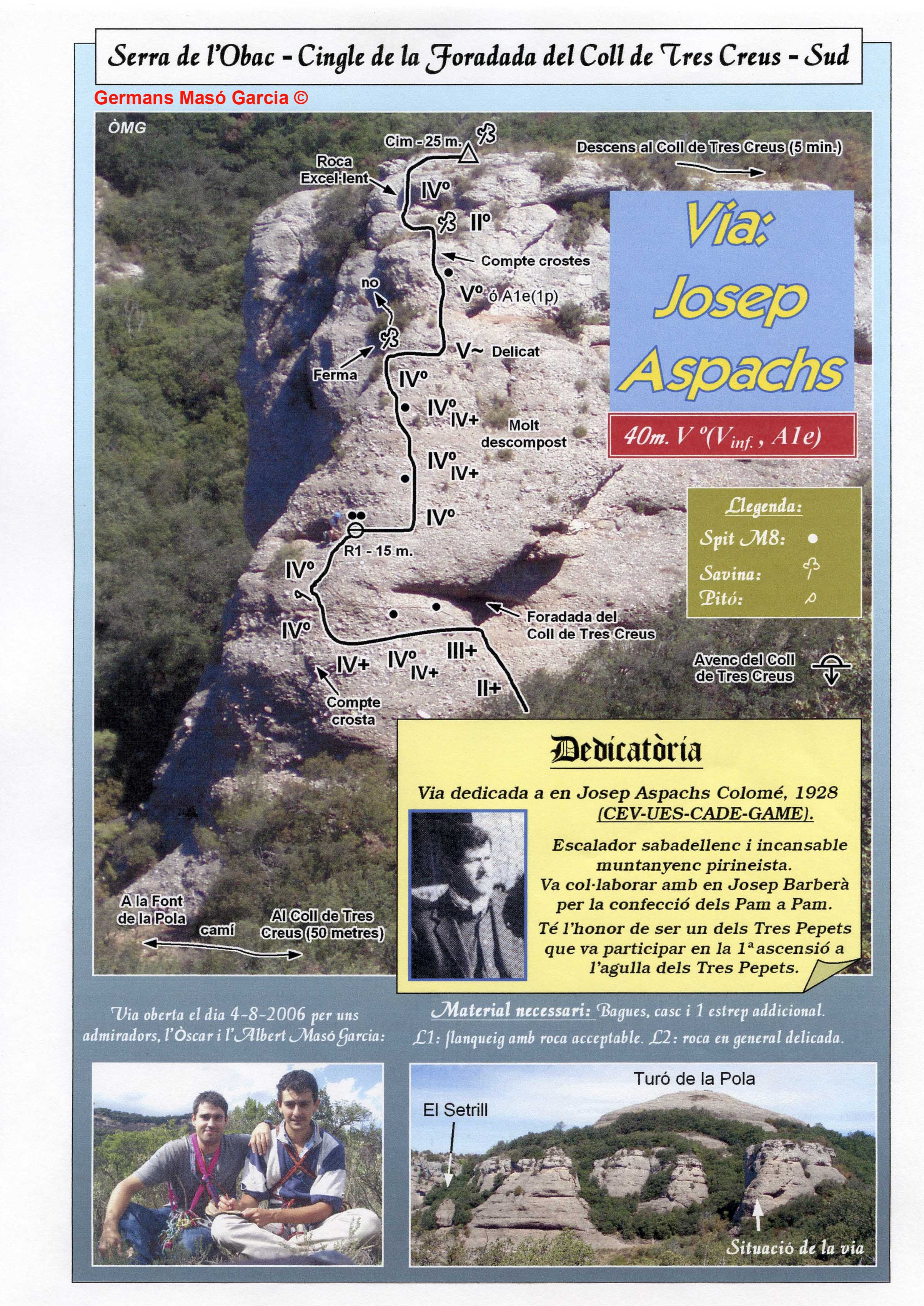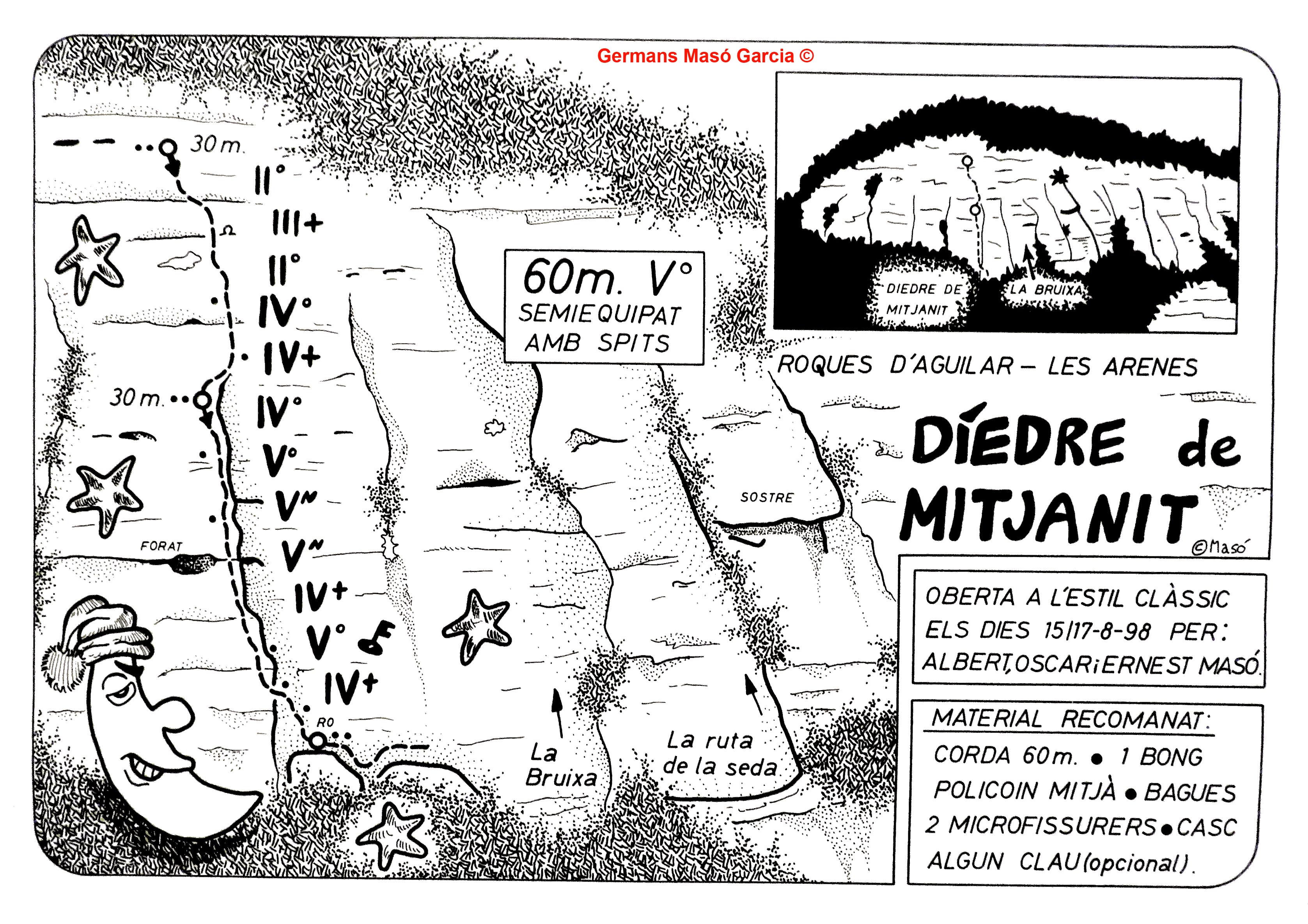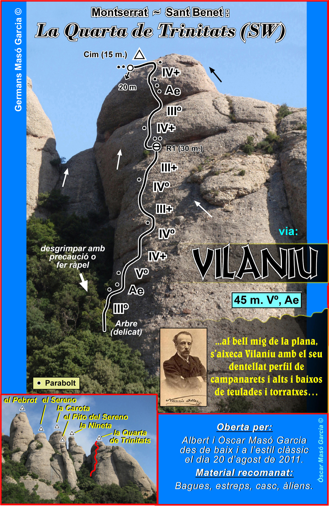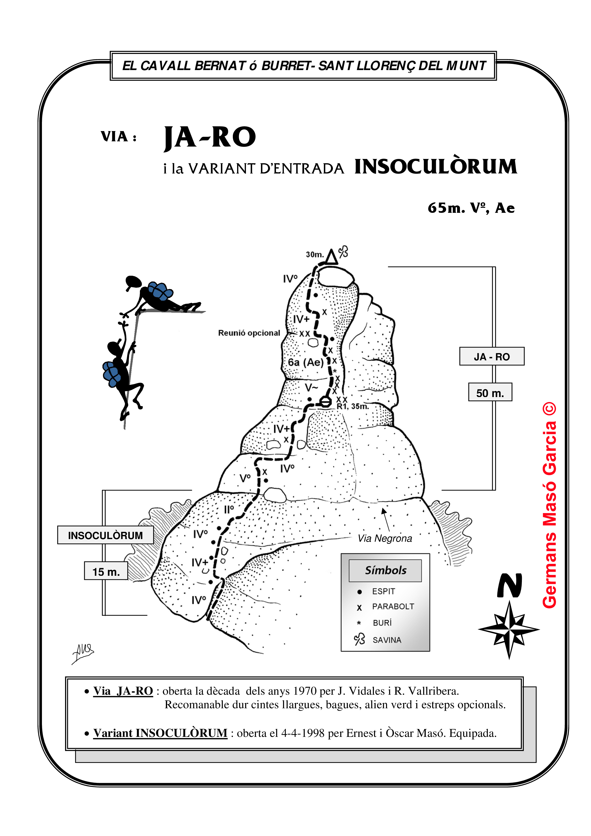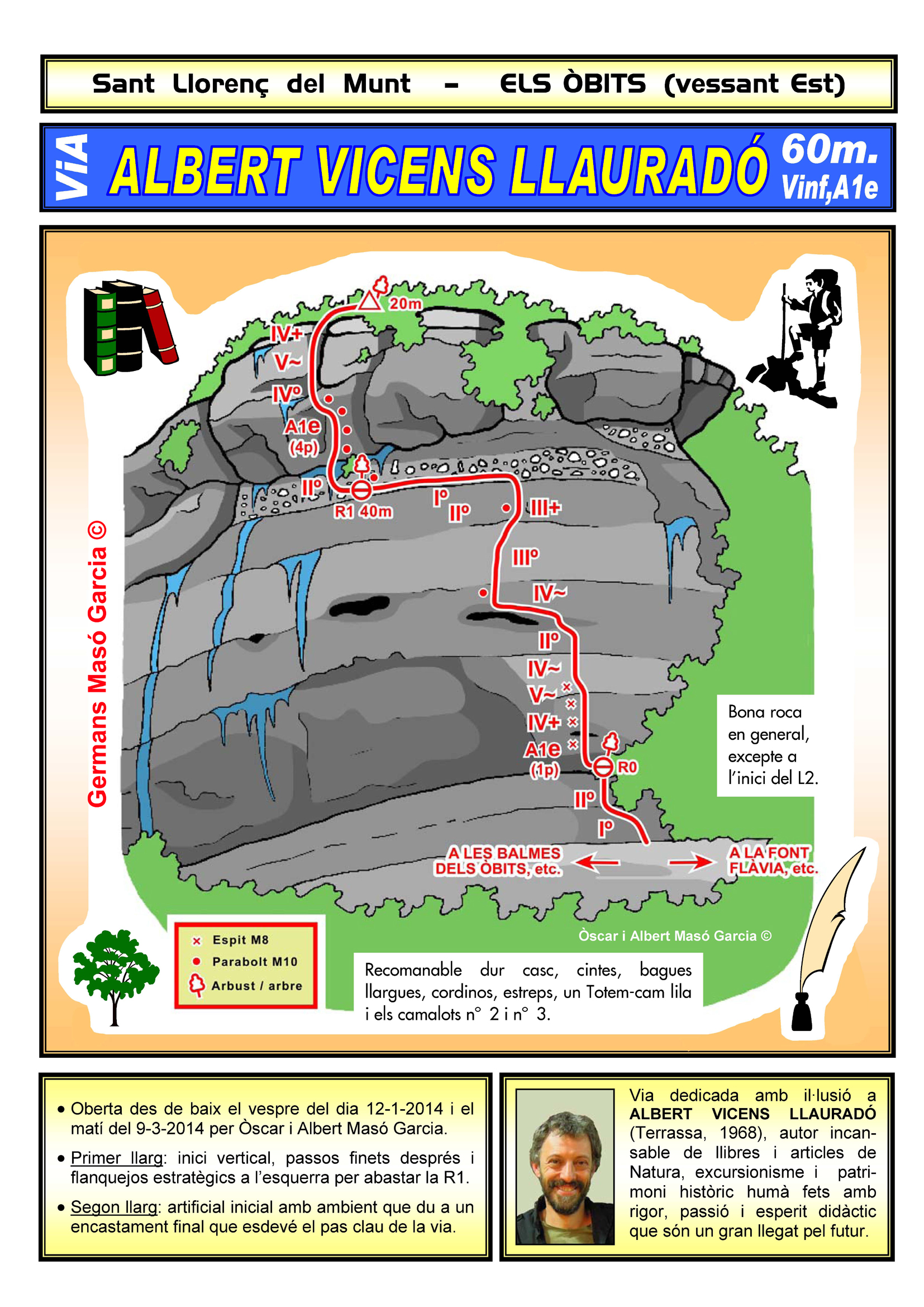 SEGURETAT: La pràctica de l’escalada és un esport que comporta risc. Tothom qui vulgui repetir alguna de les vies ressenyades en aquesta web és l’únic responsable de la seva pròpia seguretat i del conjunt de la cordada. En aquest sentit, els autors de les vies i les ressenyes declinen qualsevol responsabilitat.