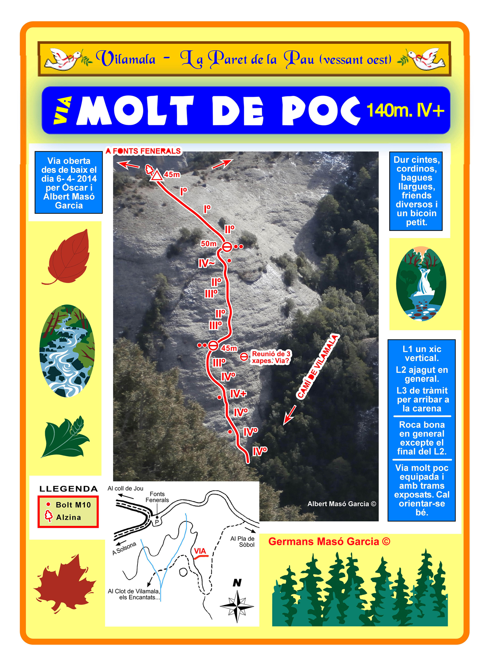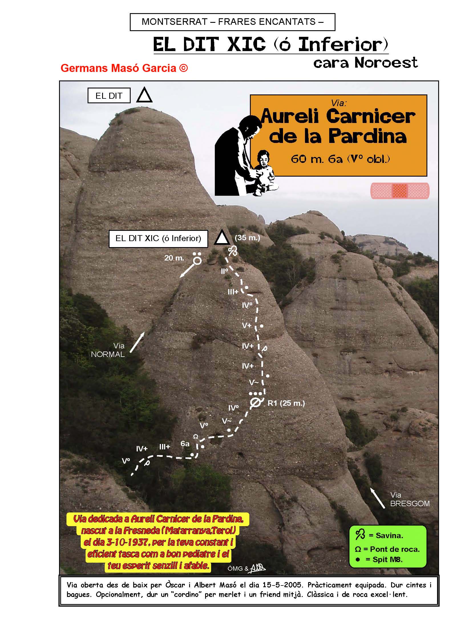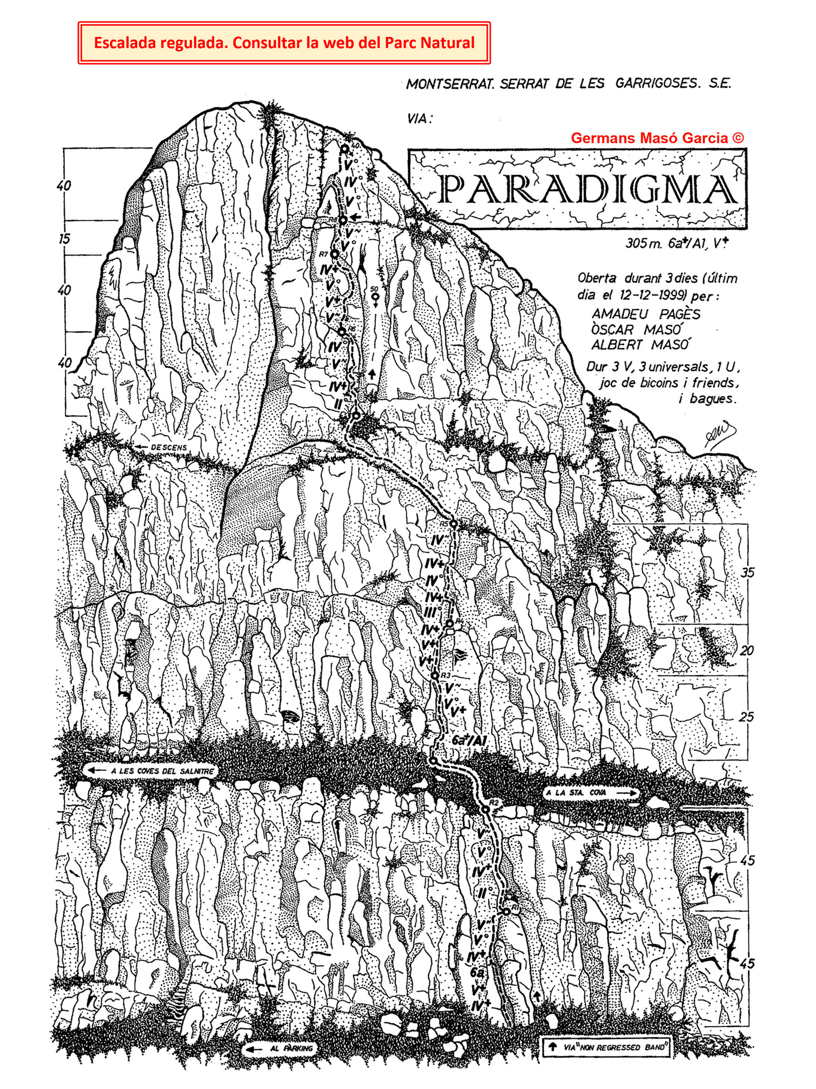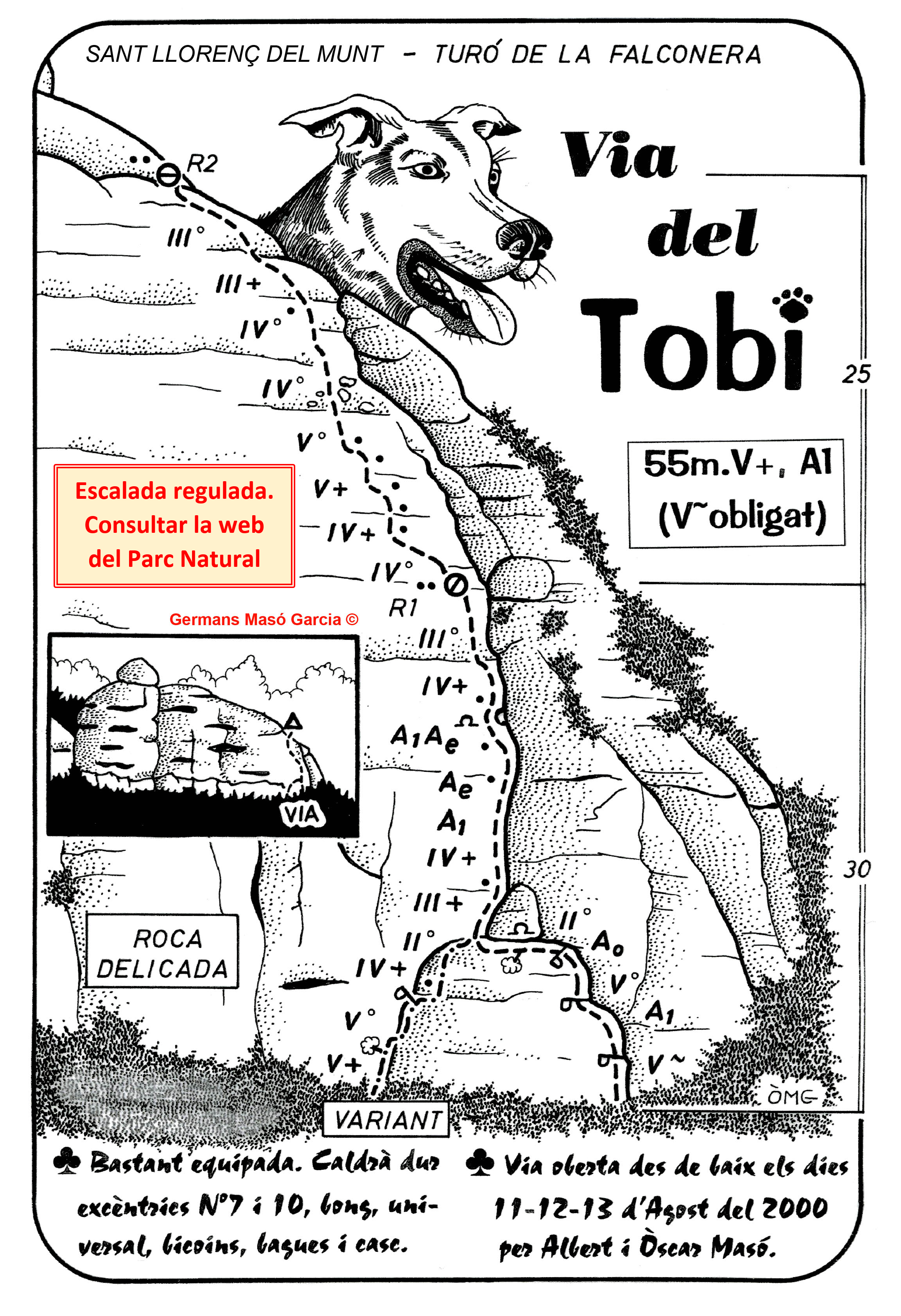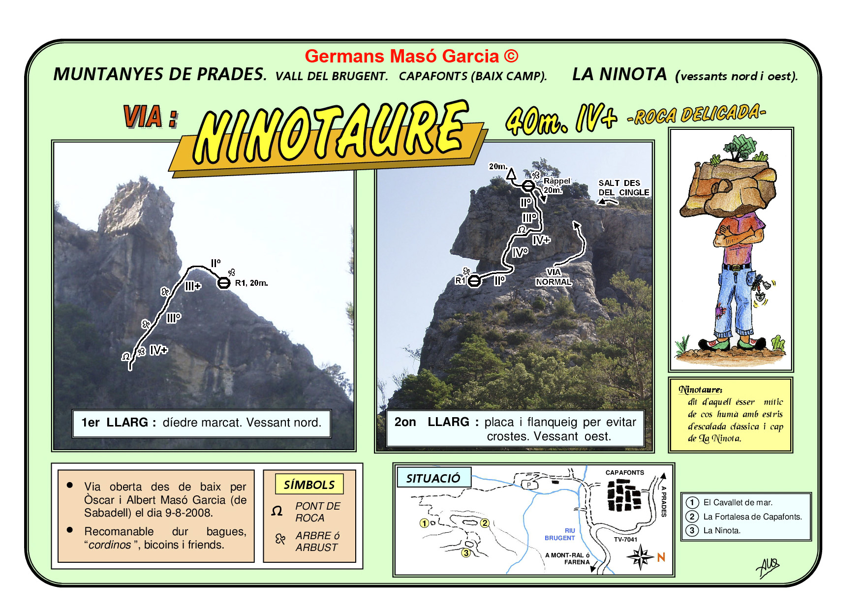 SEGURETAT: La pràctica de l’escalada és un esport que comporta risc. Tothom qui vulgui repetir alguna de les vies ressenyades en aquesta web és l’únic responsable de la seva pròpia seguretat i del conjunt de la cordada. En aquest sentit, els autors de les vies i les ressenyes declinen qualsevol responsabilitat.