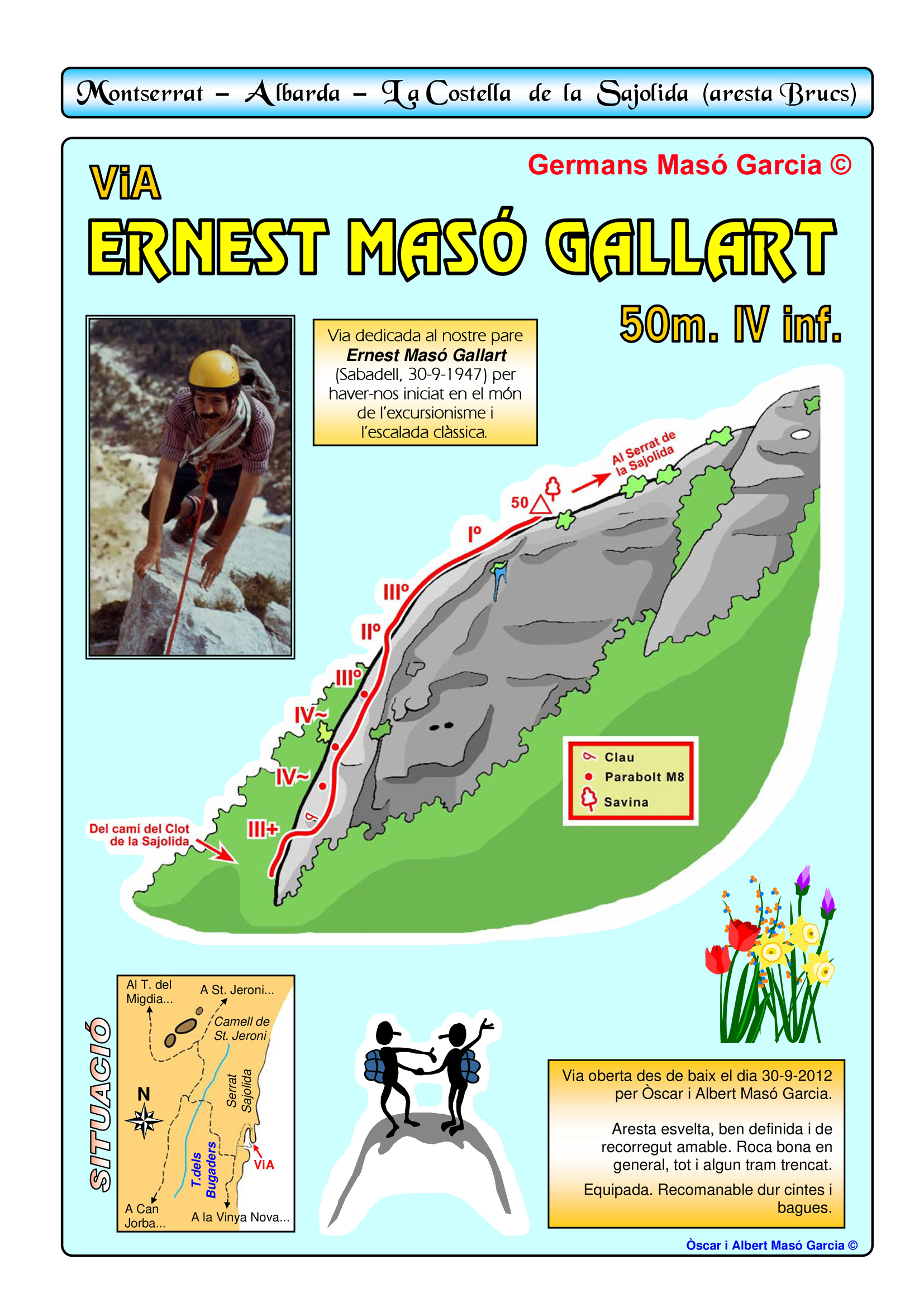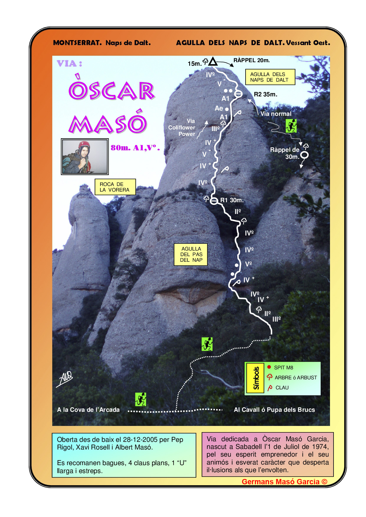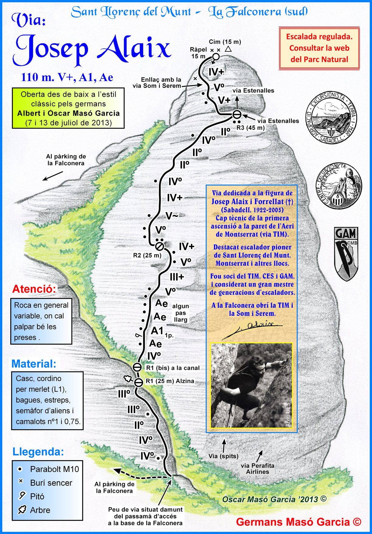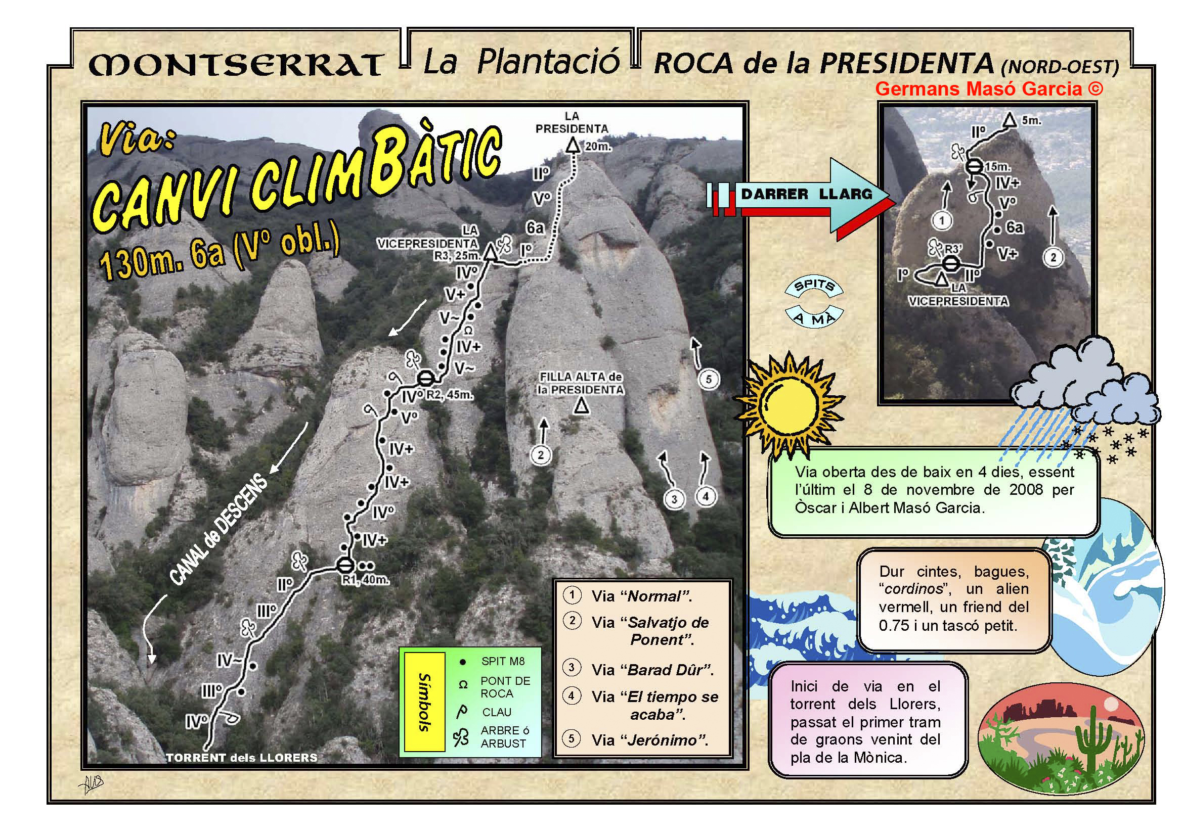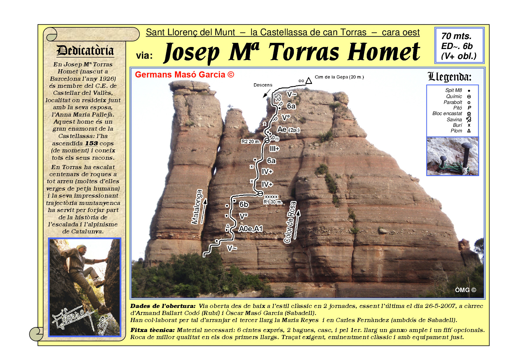 SEGURETAT: La pràctica de l’escalada és un esport que comporta risc. Tothom qui vulgui repetir alguna de les vies ressenyades en aquesta web és l’únic responsable de la seva pròpia seguretat i del conjunt de la cordada. En aquest sentit, els autors de les vies i les ressenyes declinen qualsevol responsabilitat.