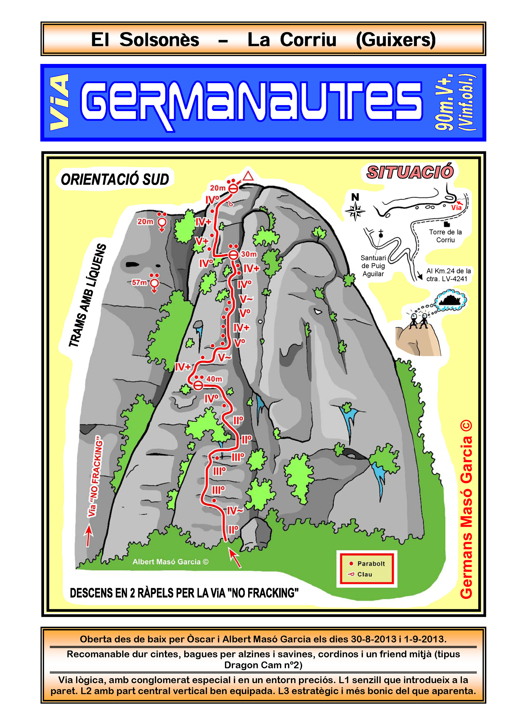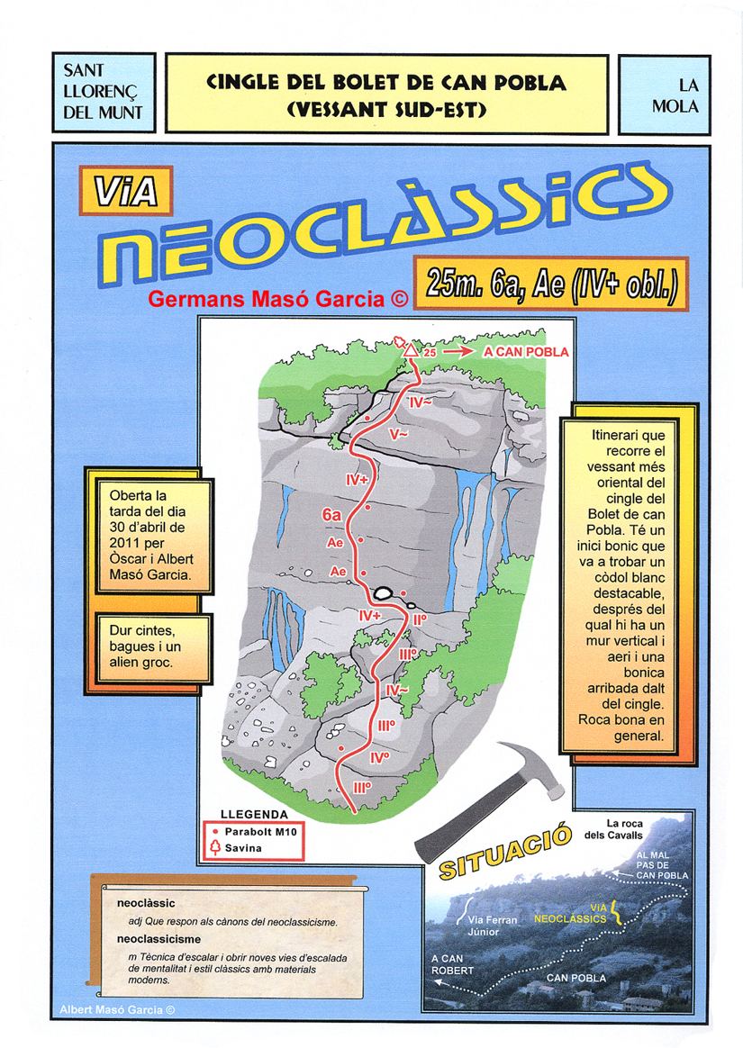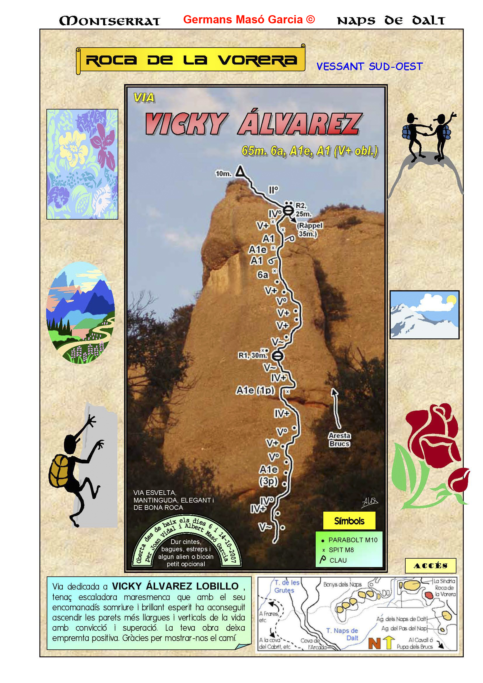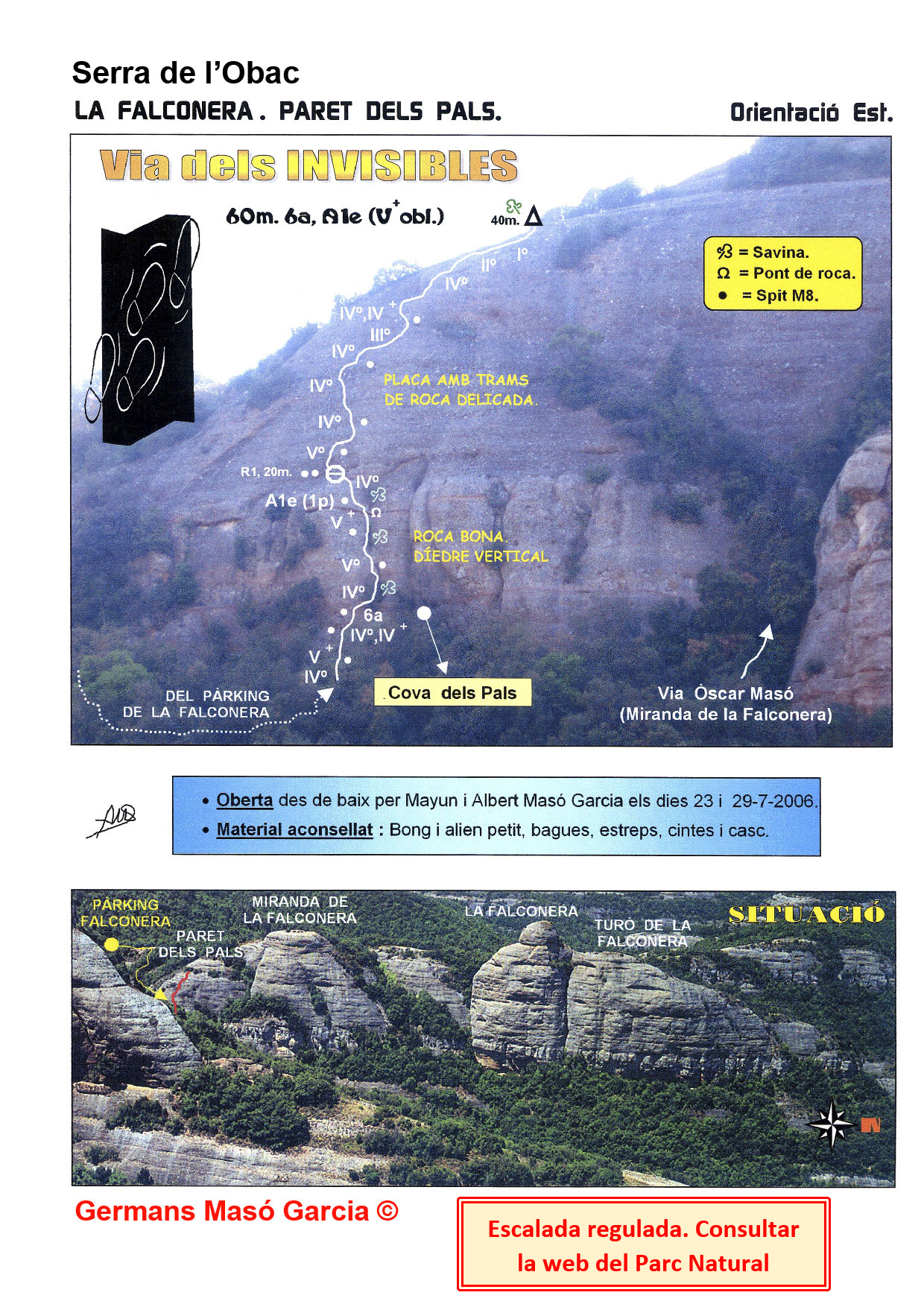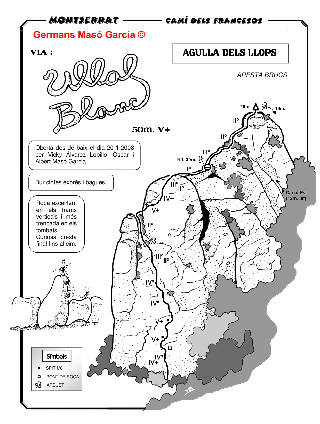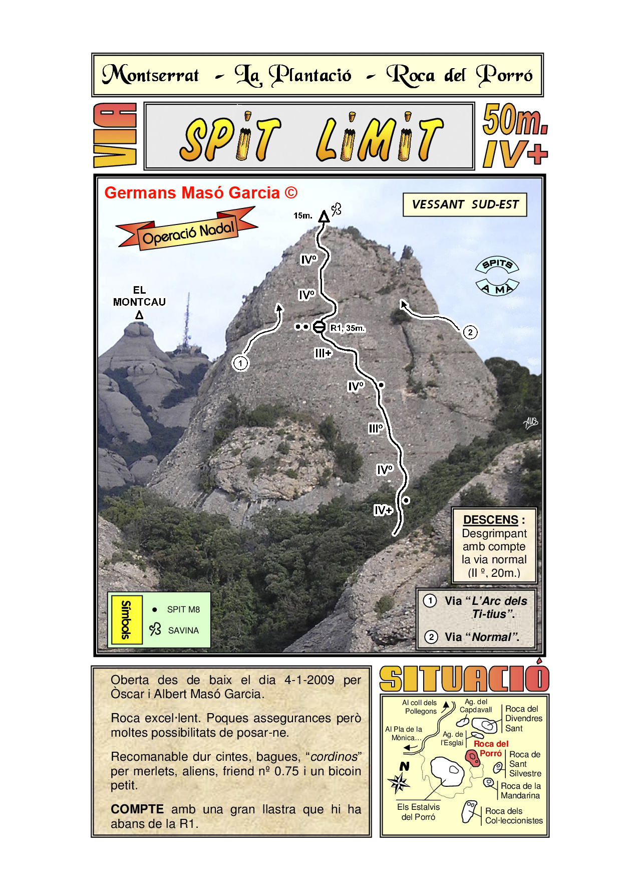 SEGURETAT: La pràctica de l’escalada és un esport que comporta risc. Tothom qui vulgui repetir alguna de les vies ressenyades en aquesta web és l’únic responsable de la seva pròpia seguretat i del conjunt de la cordada. En aquest sentit, els autors de les vies i les ressenyes declinen qualsevol responsabilitat.