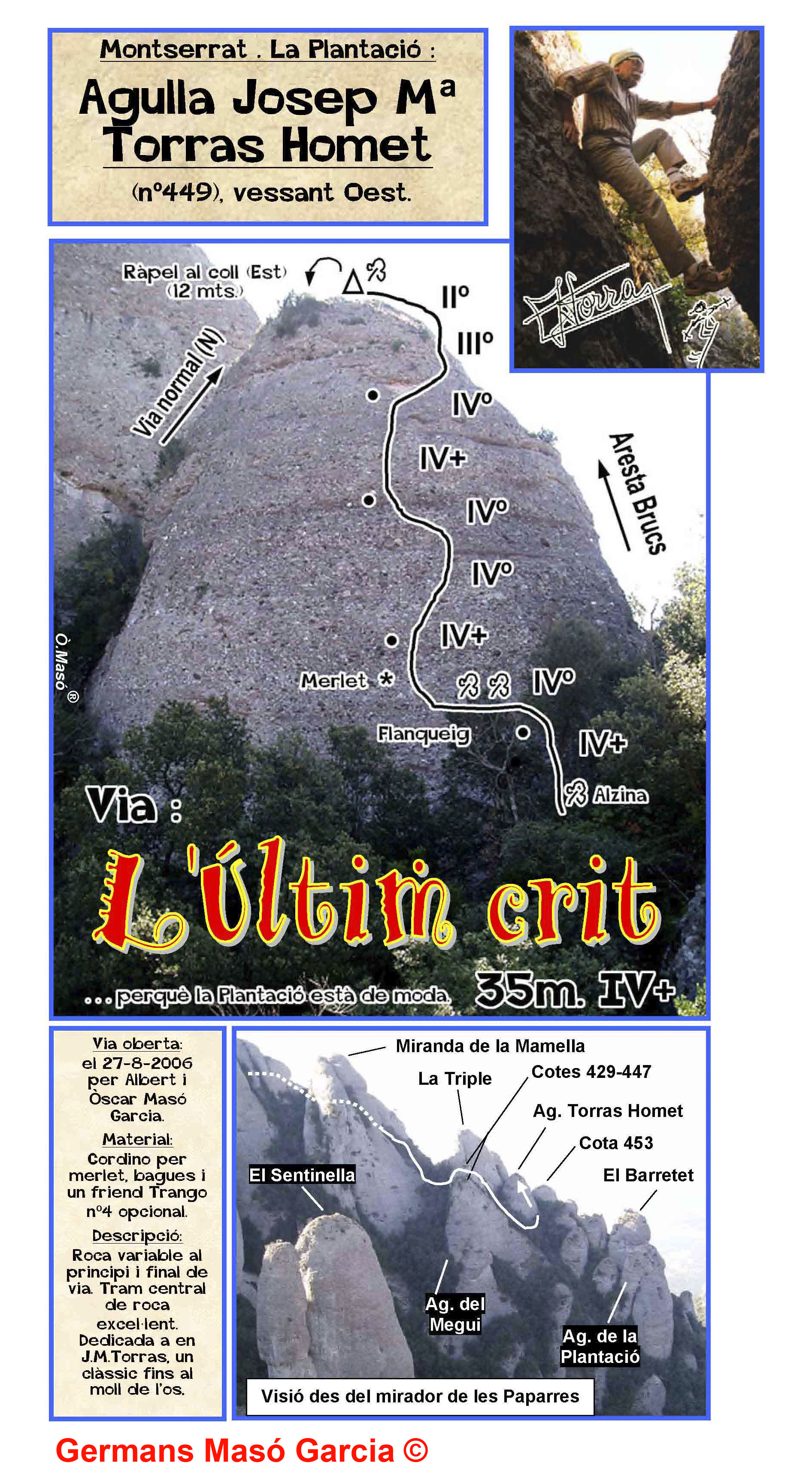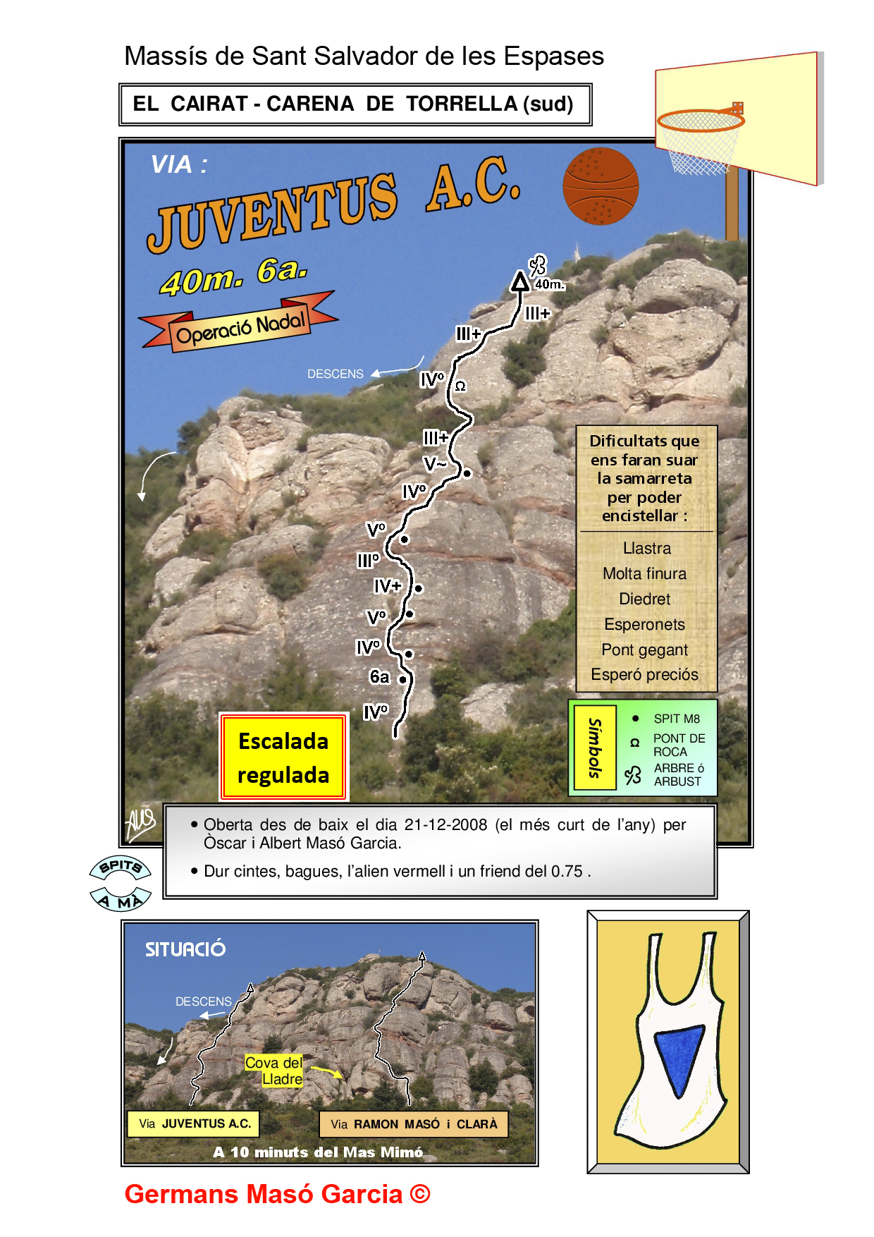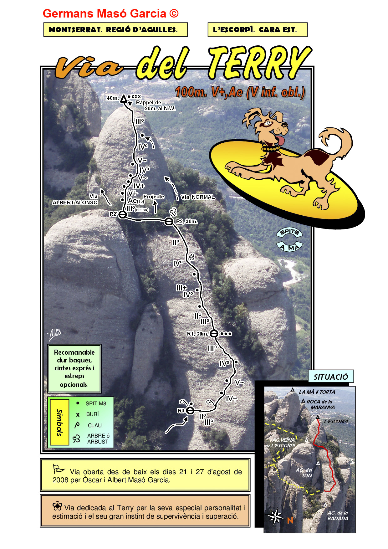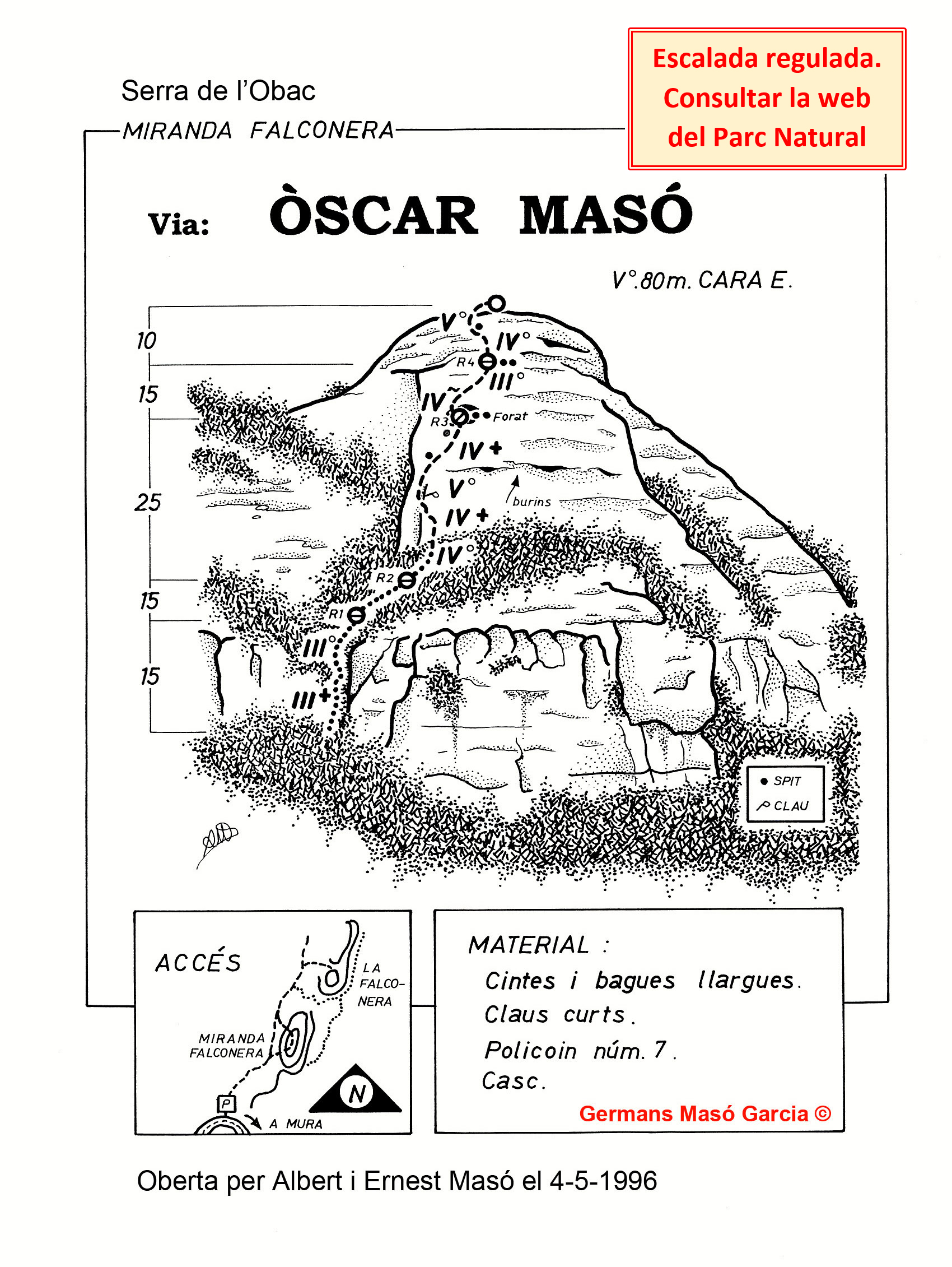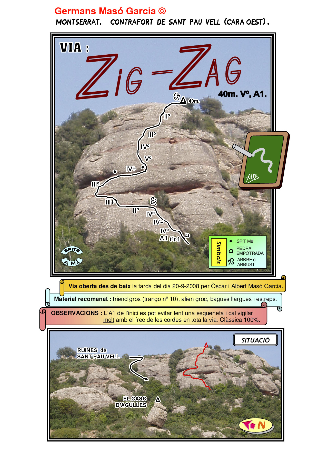 SEGURETAT: La pràctica de l’escalada és un esport que comporta risc. Tothom qui vulgui repetir alguna de les vies ressenyades en aquesta web és l’únic responsable de la seva pròpia seguretat i del conjunt de la cordada. En aquest sentit, els autors de les vies i les ressenyes declinen qualsevol responsabilitat.