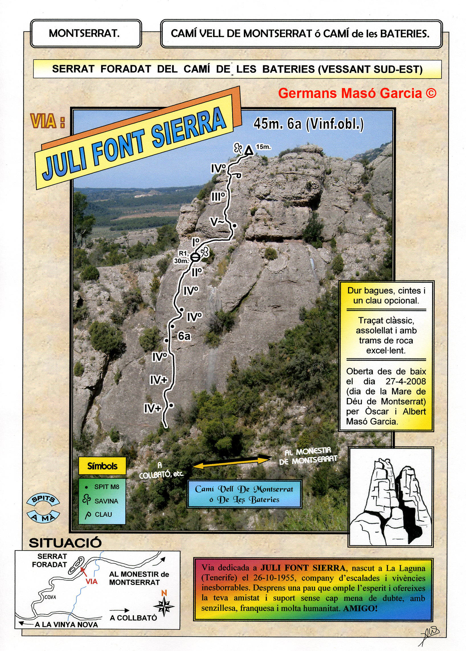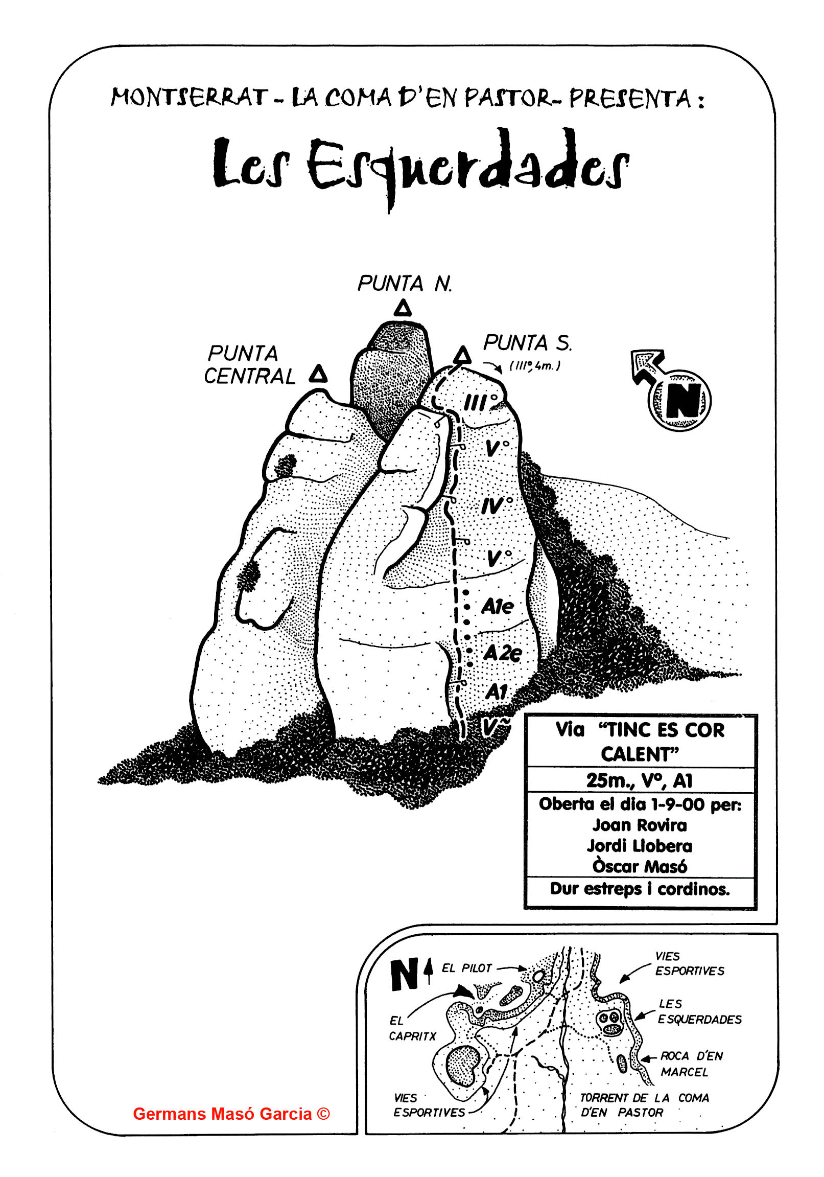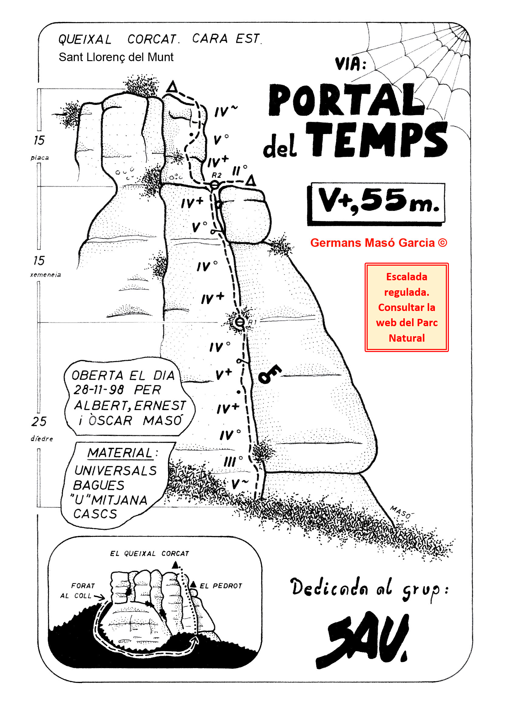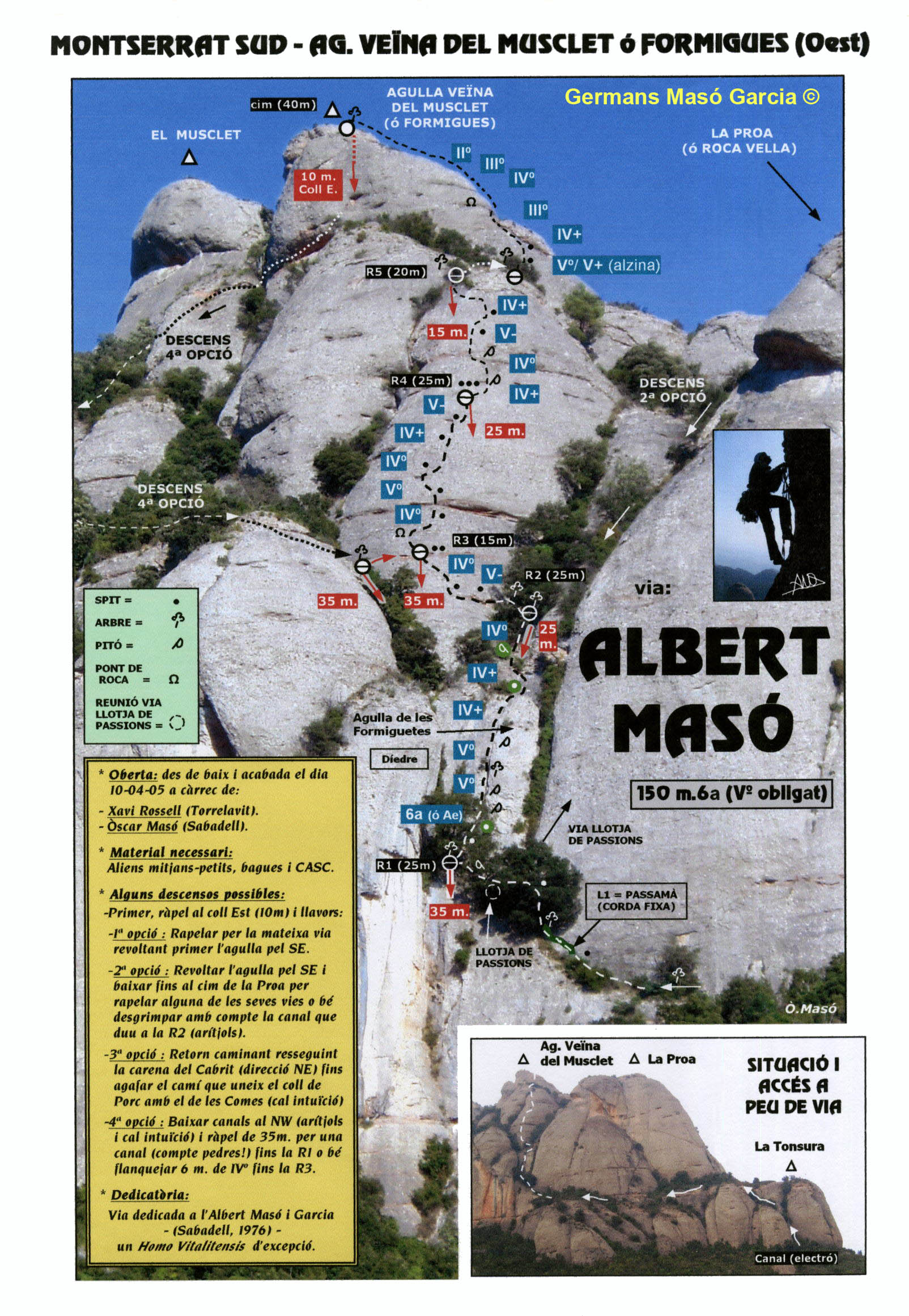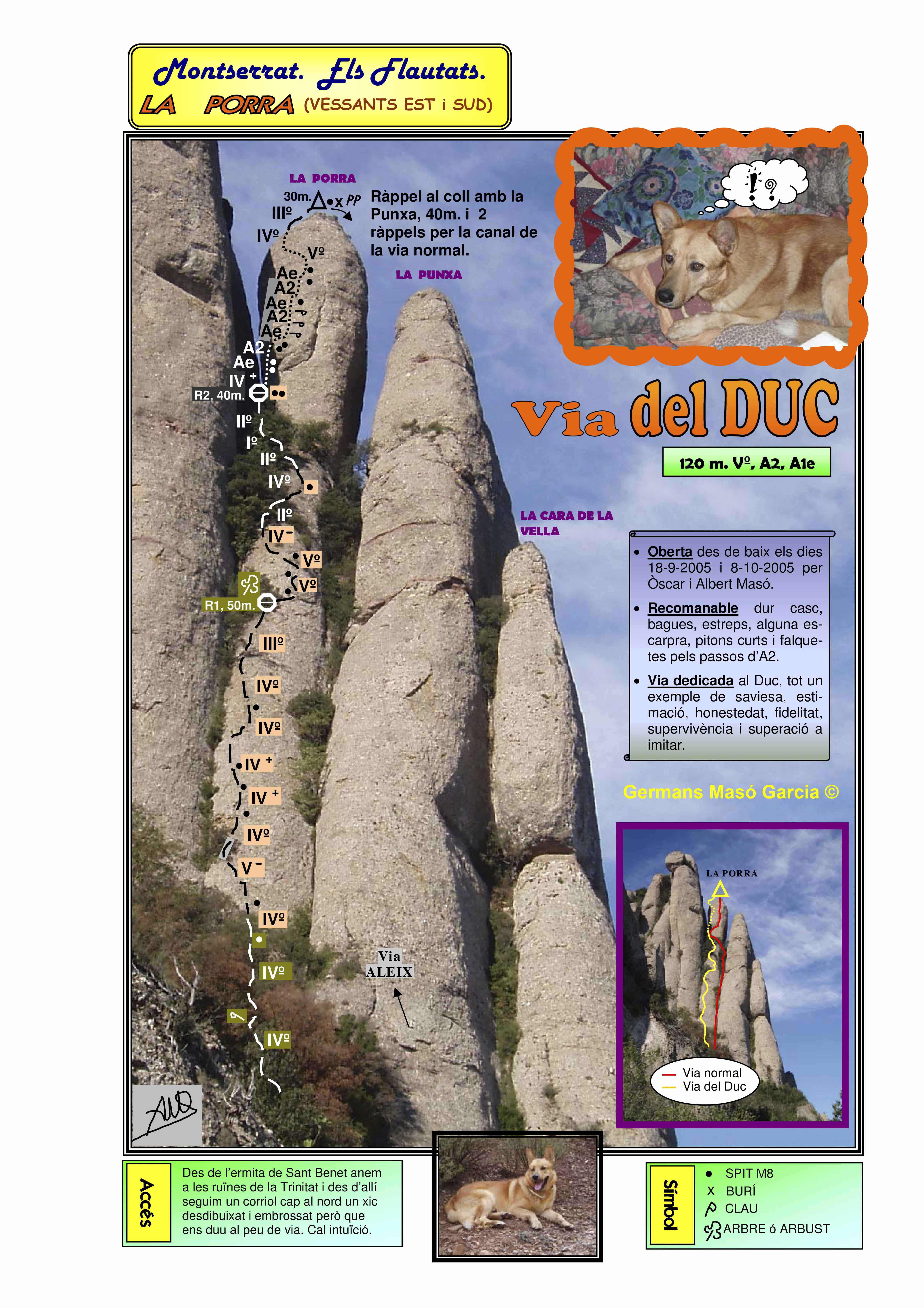 SEGURETAT: La pràctica de l’escalada és un esport que comporta risc. Tothom qui vulgui repetir alguna de les vies ressenyades en aquesta web és l’únic responsable de la seva pròpia seguretat i del conjunt de la cordada. En aquest sentit, els autors de les vies i les ressenyes declinen qualsevol responsabilitat.