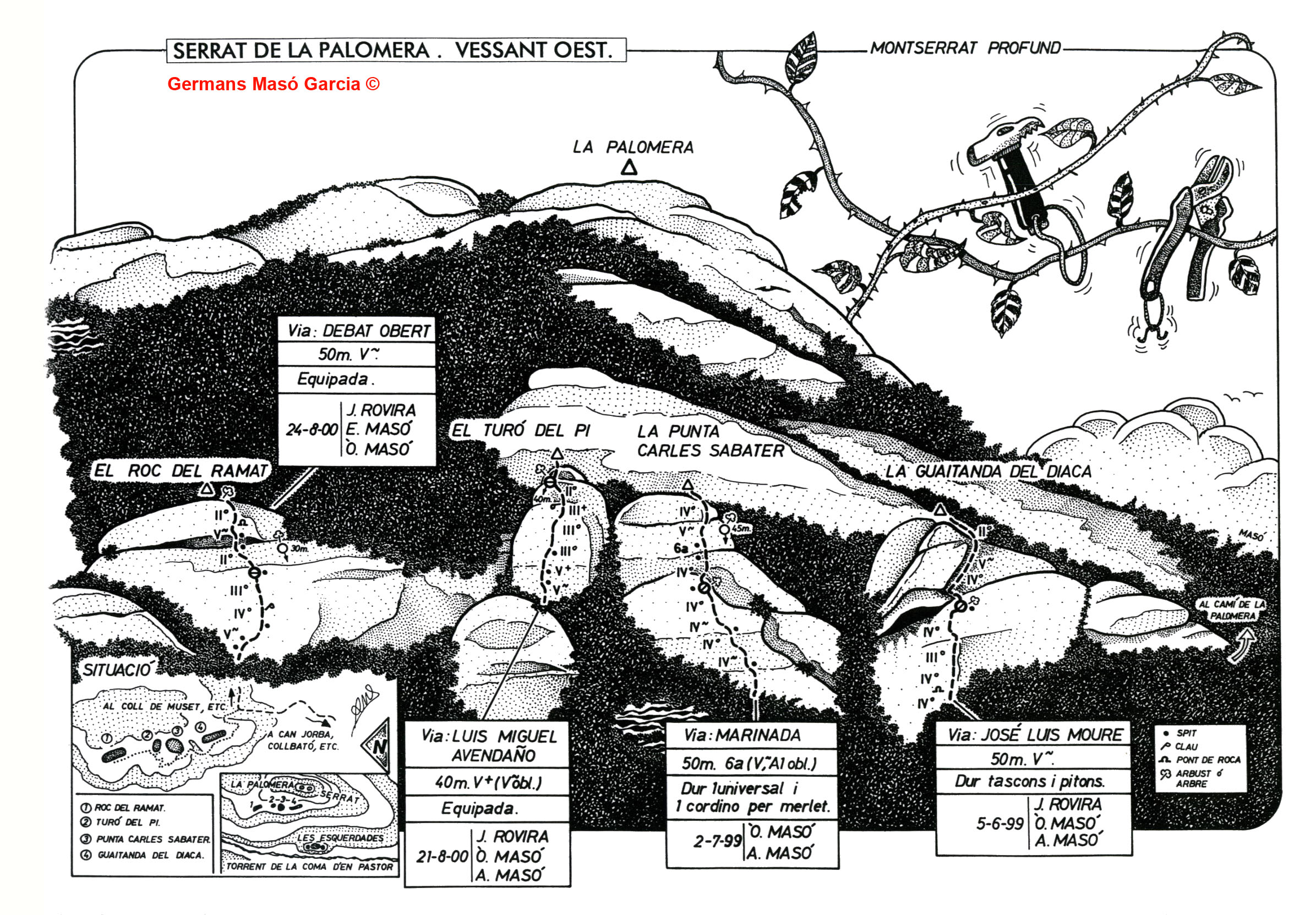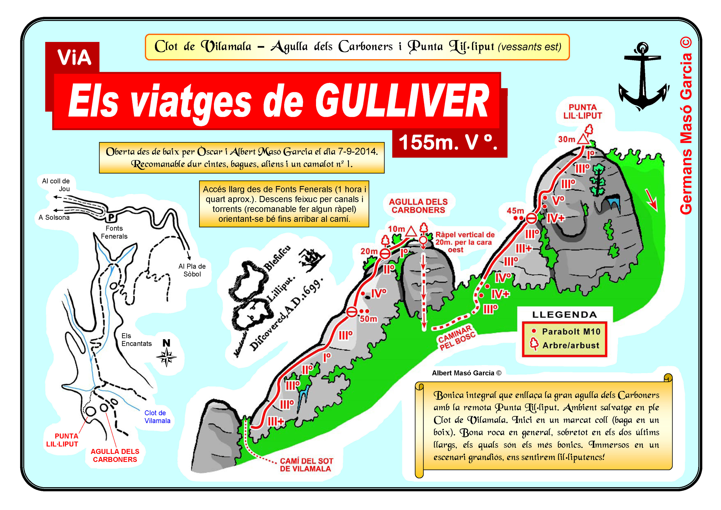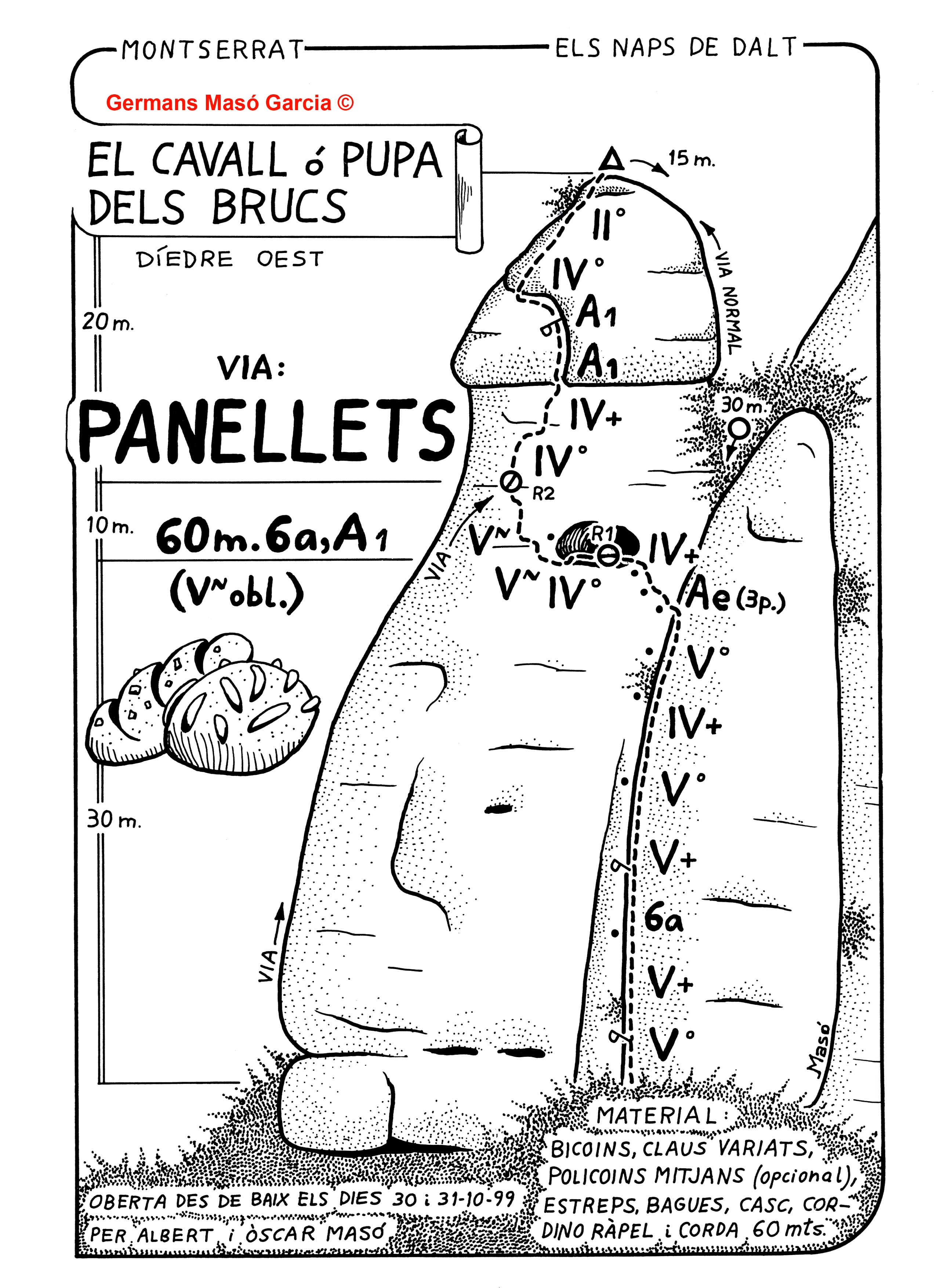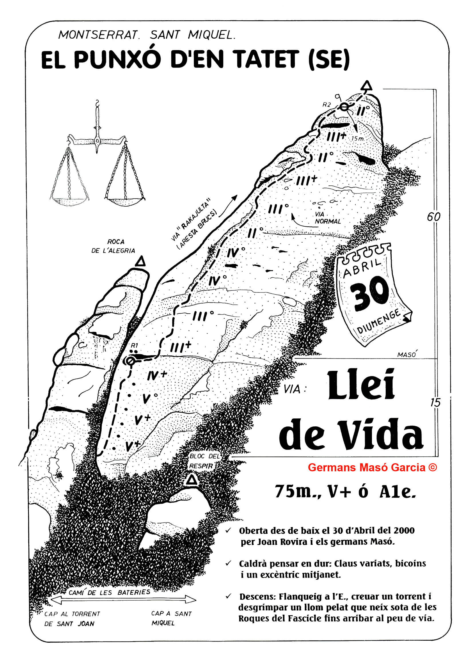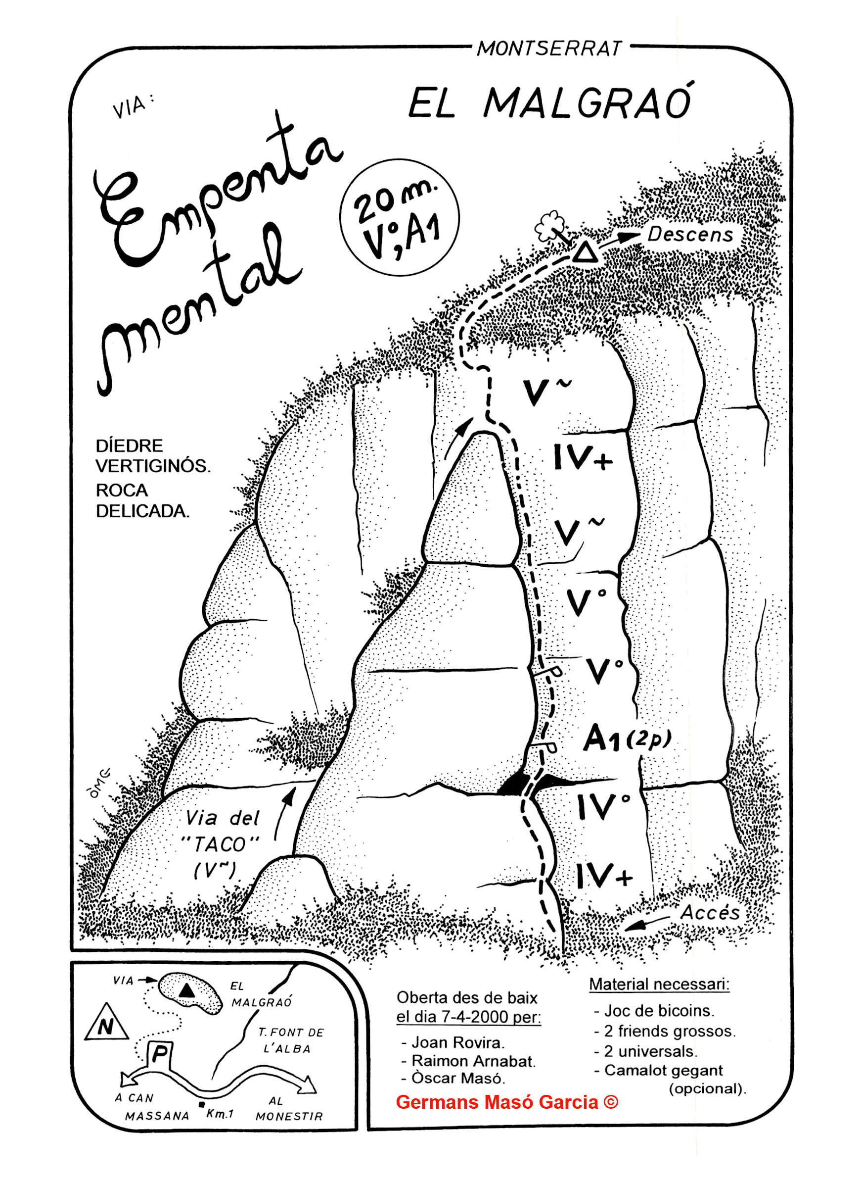 SEGURETAT: La pràctica de l’escalada és un esport que comporta risc. Tothom qui vulgui repetir alguna de les vies ressenyades en aquesta web és l’únic responsable de la seva pròpia seguretat i del conjunt de la cordada. En aquest sentit, els autors de les vies i les ressenyes declinen qualsevol responsabilitat.