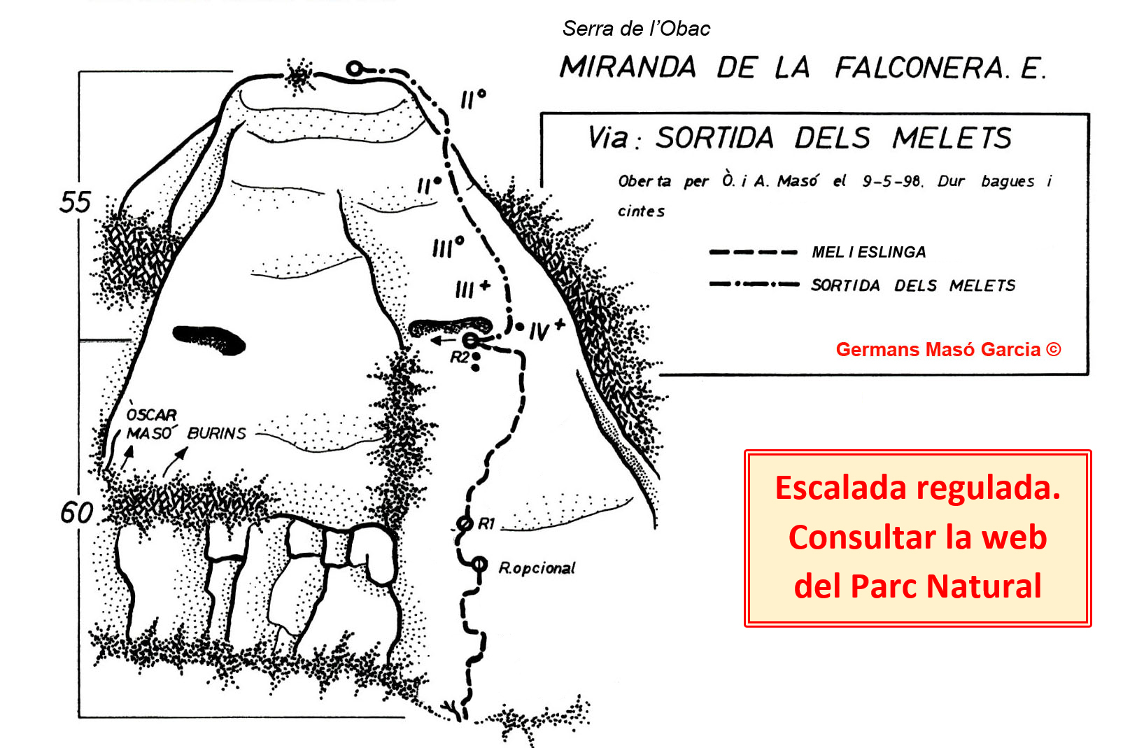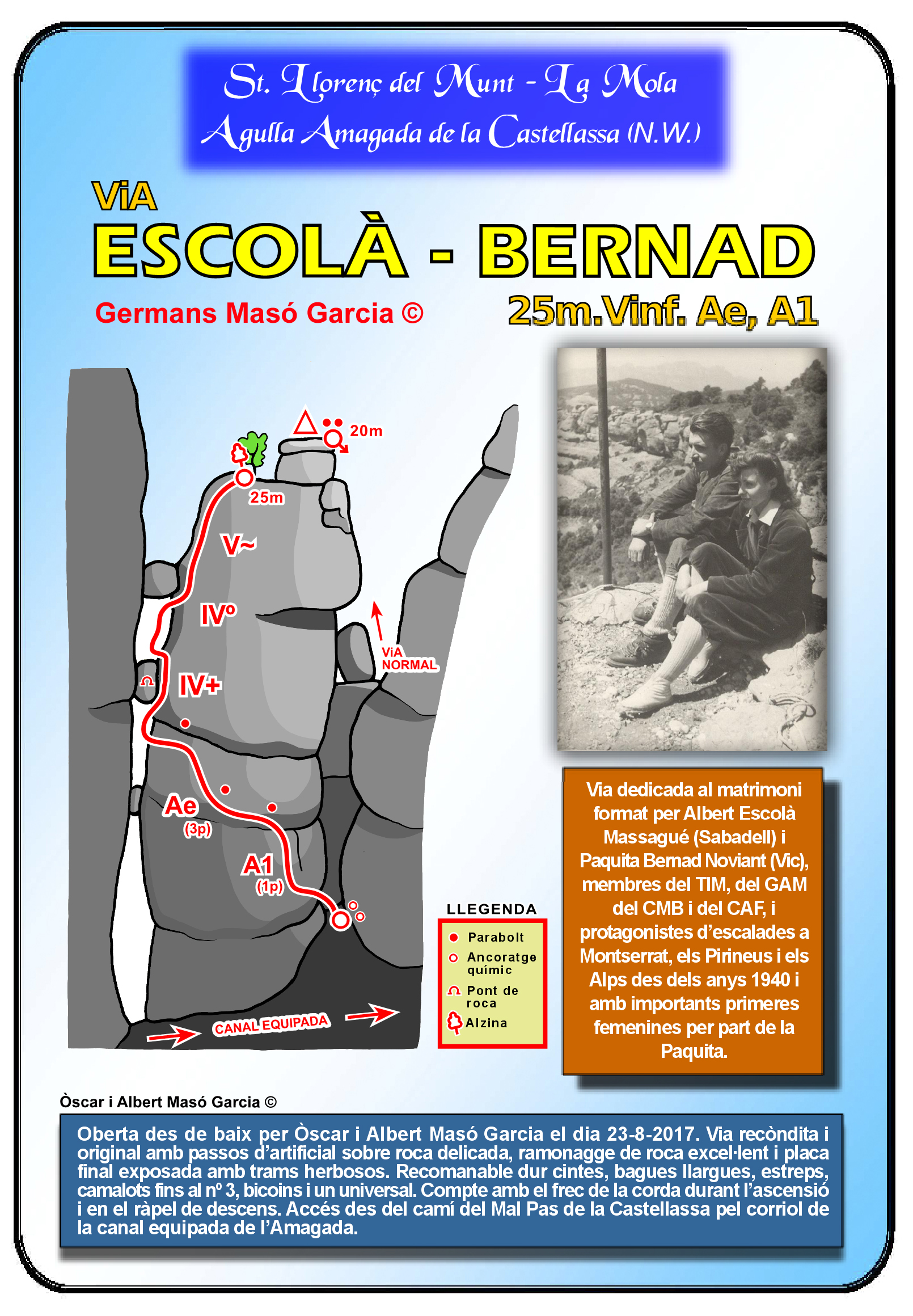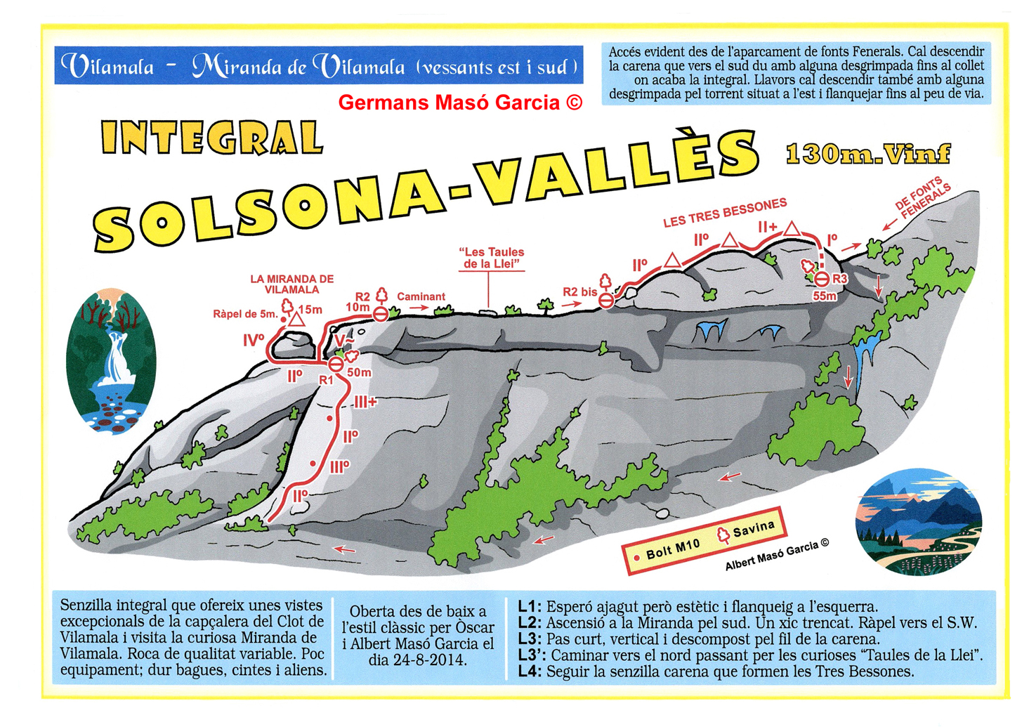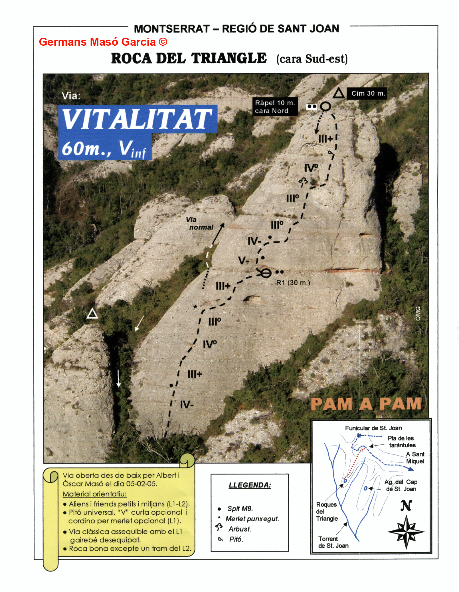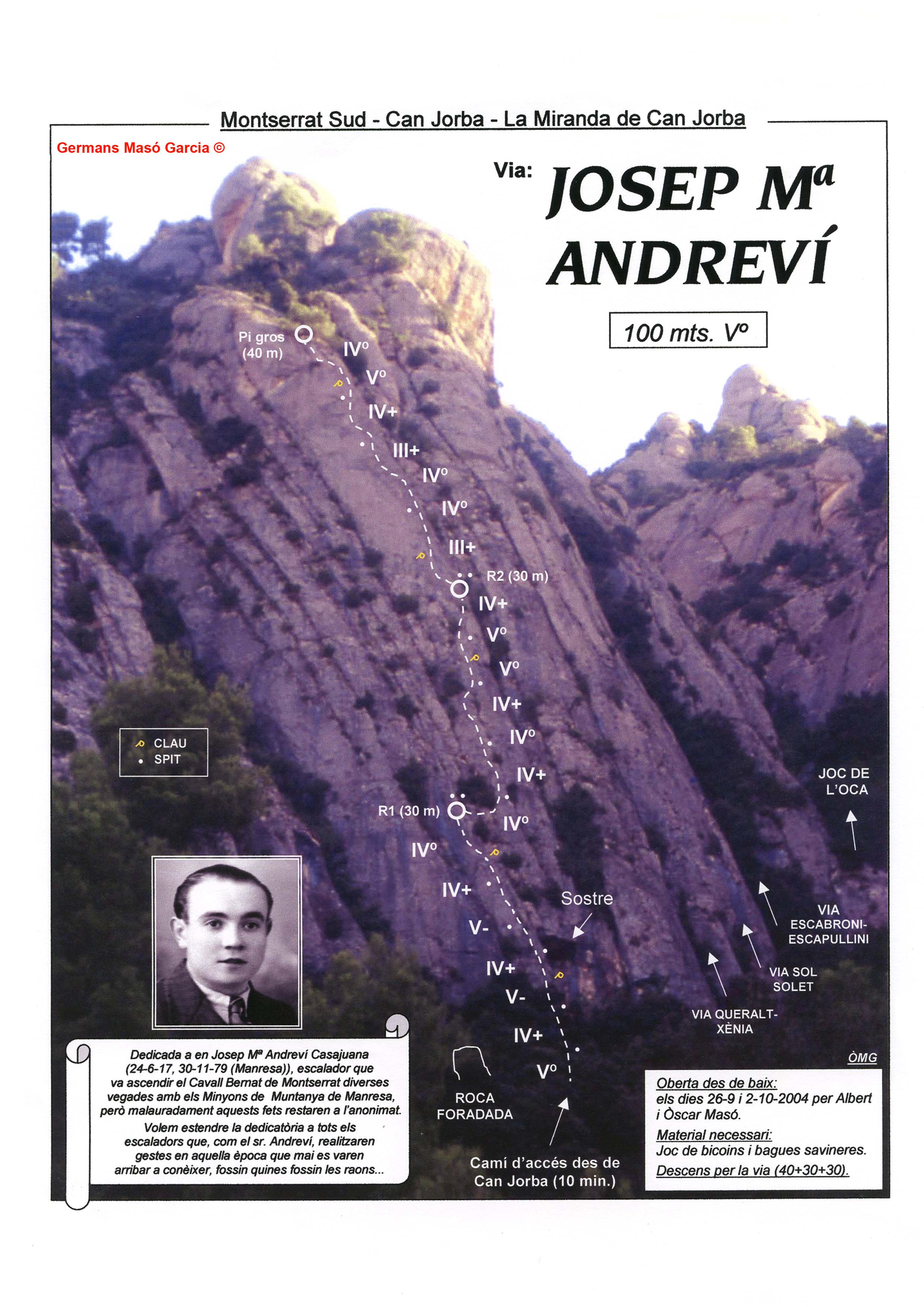 SEGURETAT: La pràctica de l’escalada és un esport que comporta risc. Tothom qui vulgui repetir alguna de les vies ressenyades en aquesta web és l’únic responsable de la seva pròpia seguretat i del conjunt de la cordada. En aquest sentit, els autors de les vies i les ressenyes declinen qualsevol responsabilitat.
