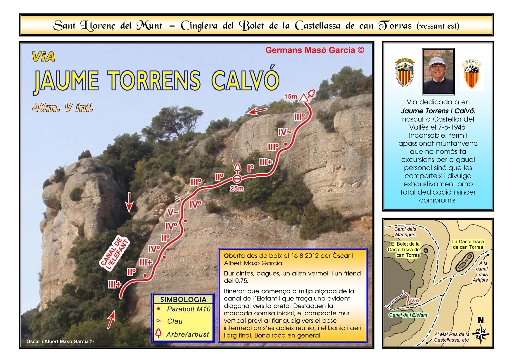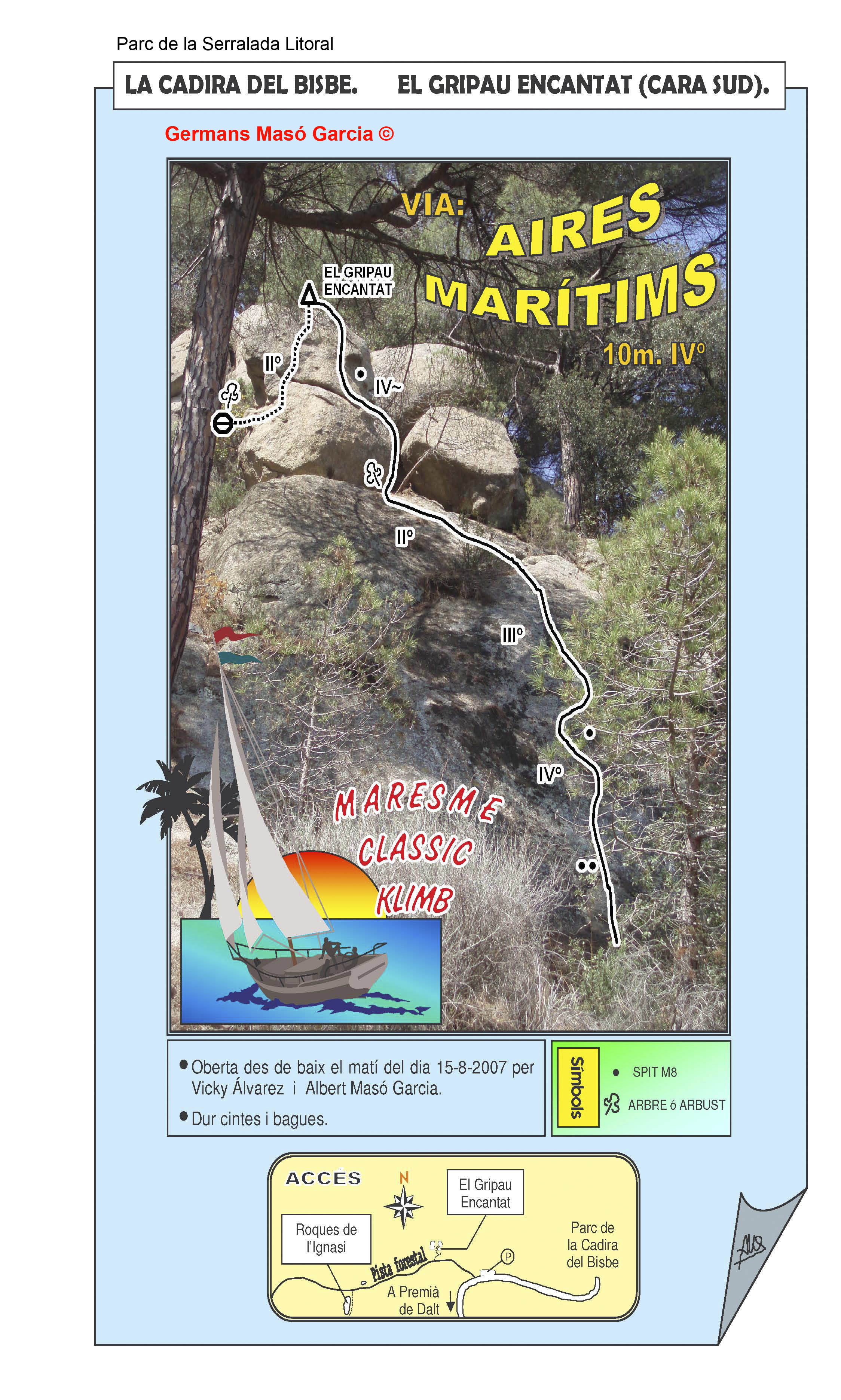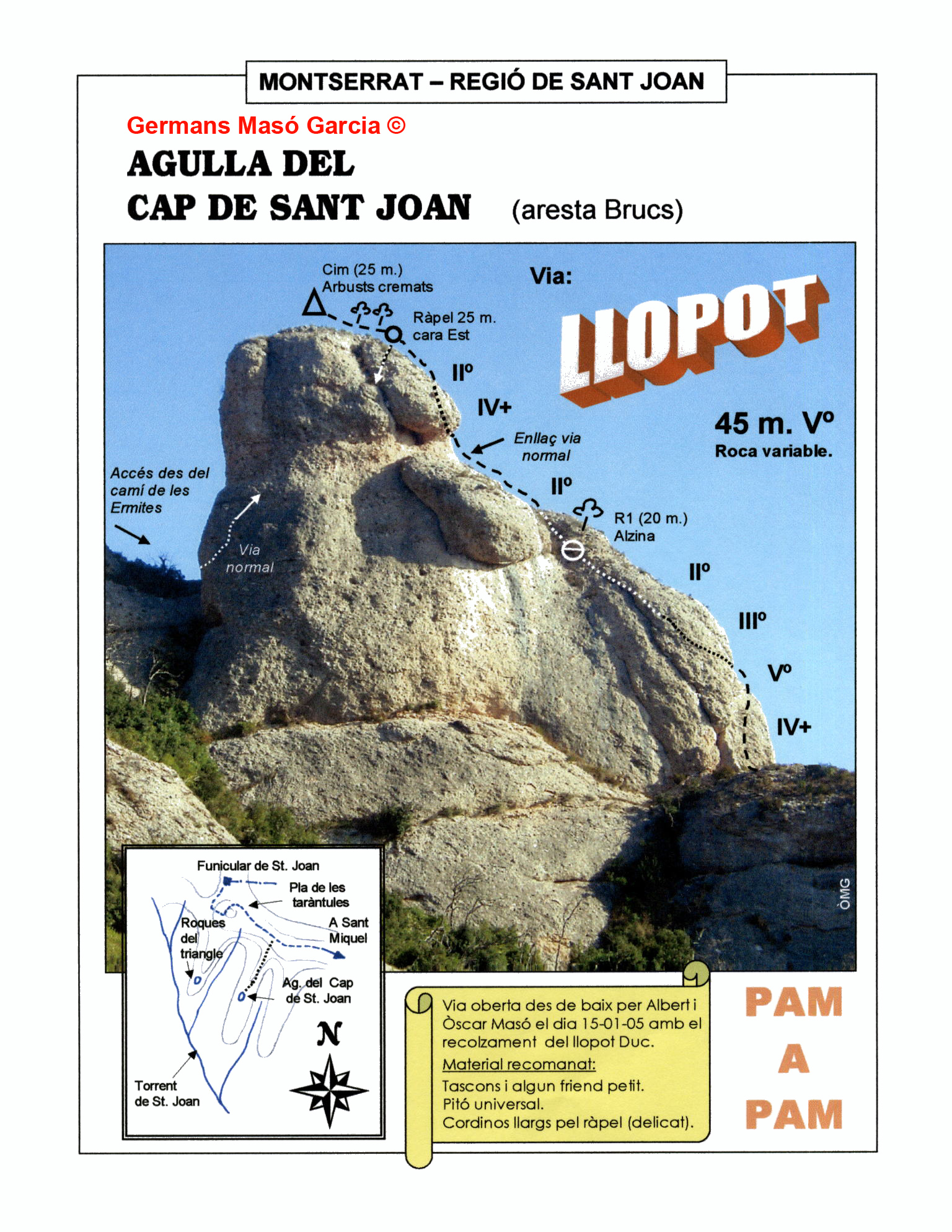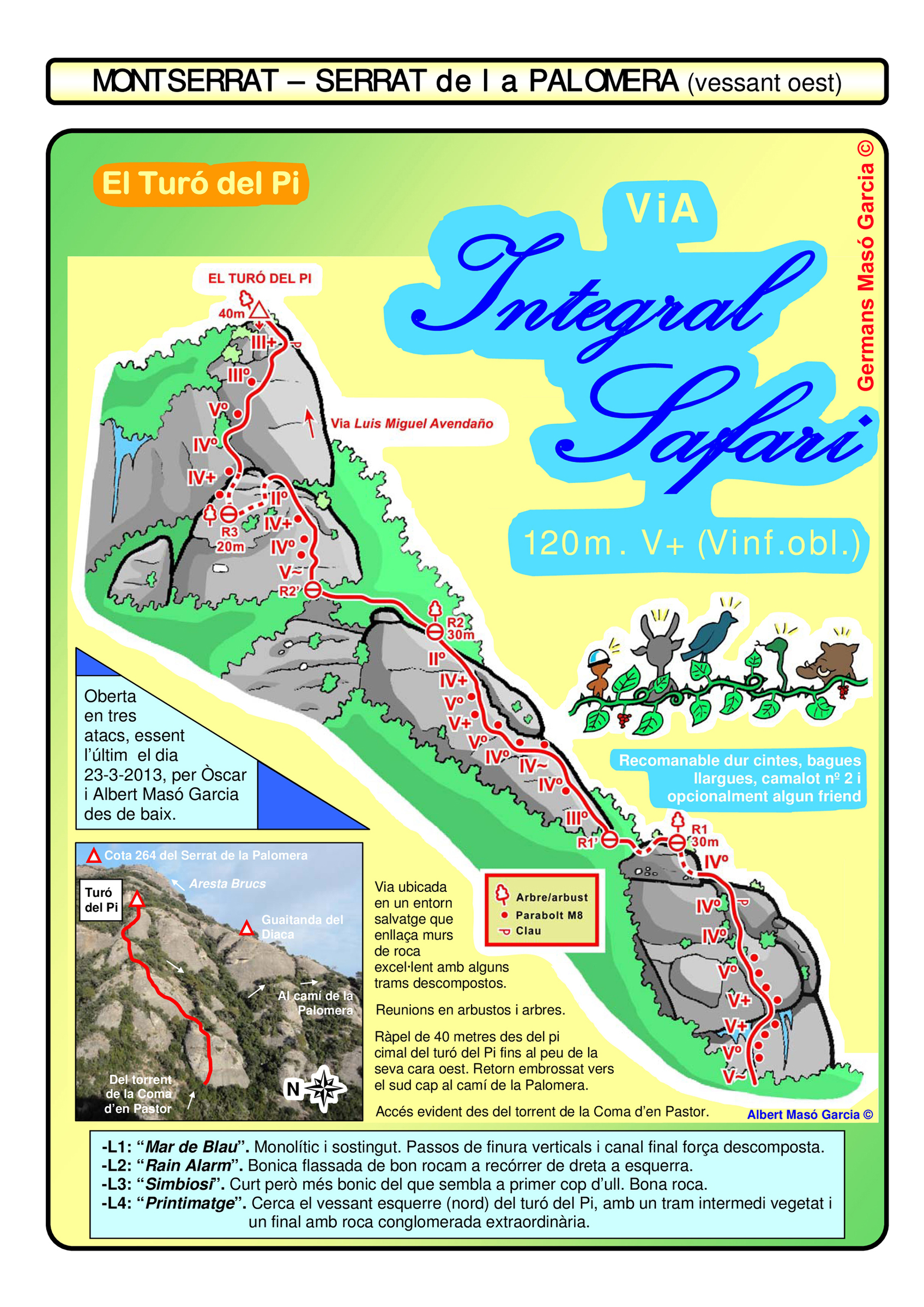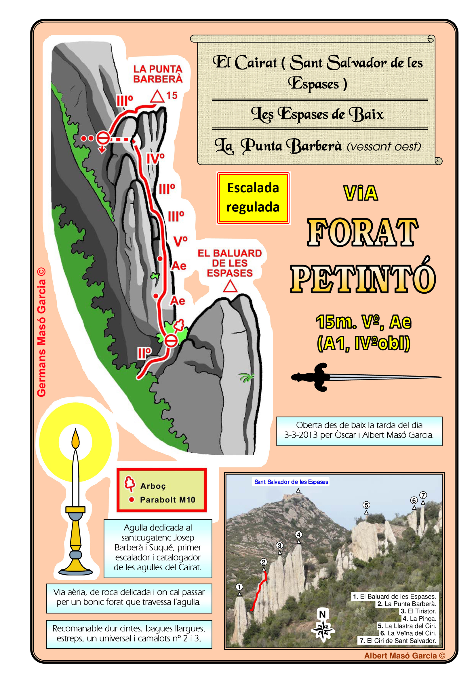 SEGURETAT: La pràctica de l’escalada és un esport que comporta risc. Tothom qui vulgui repetir alguna de les vies ressenyades en aquesta web és l’únic responsable de la seva pròpia seguretat i del conjunt de la cordada. En aquest sentit, els autors de les vies i les ressenyes declinen qualsevol responsabilitat.