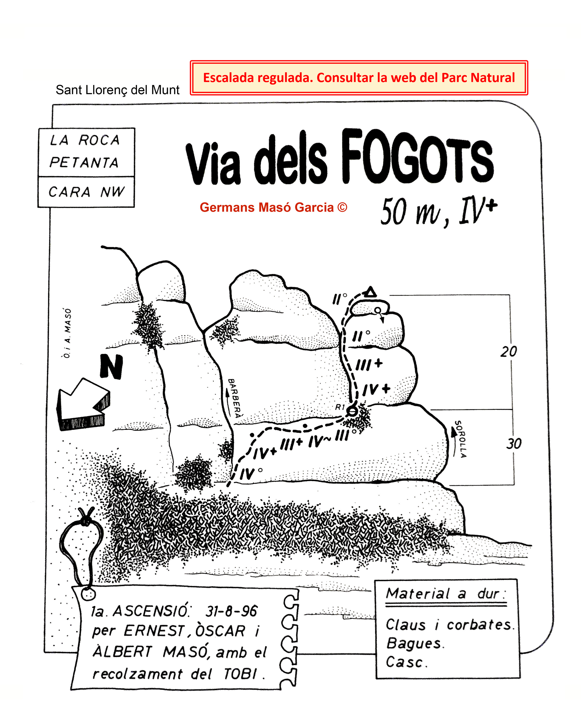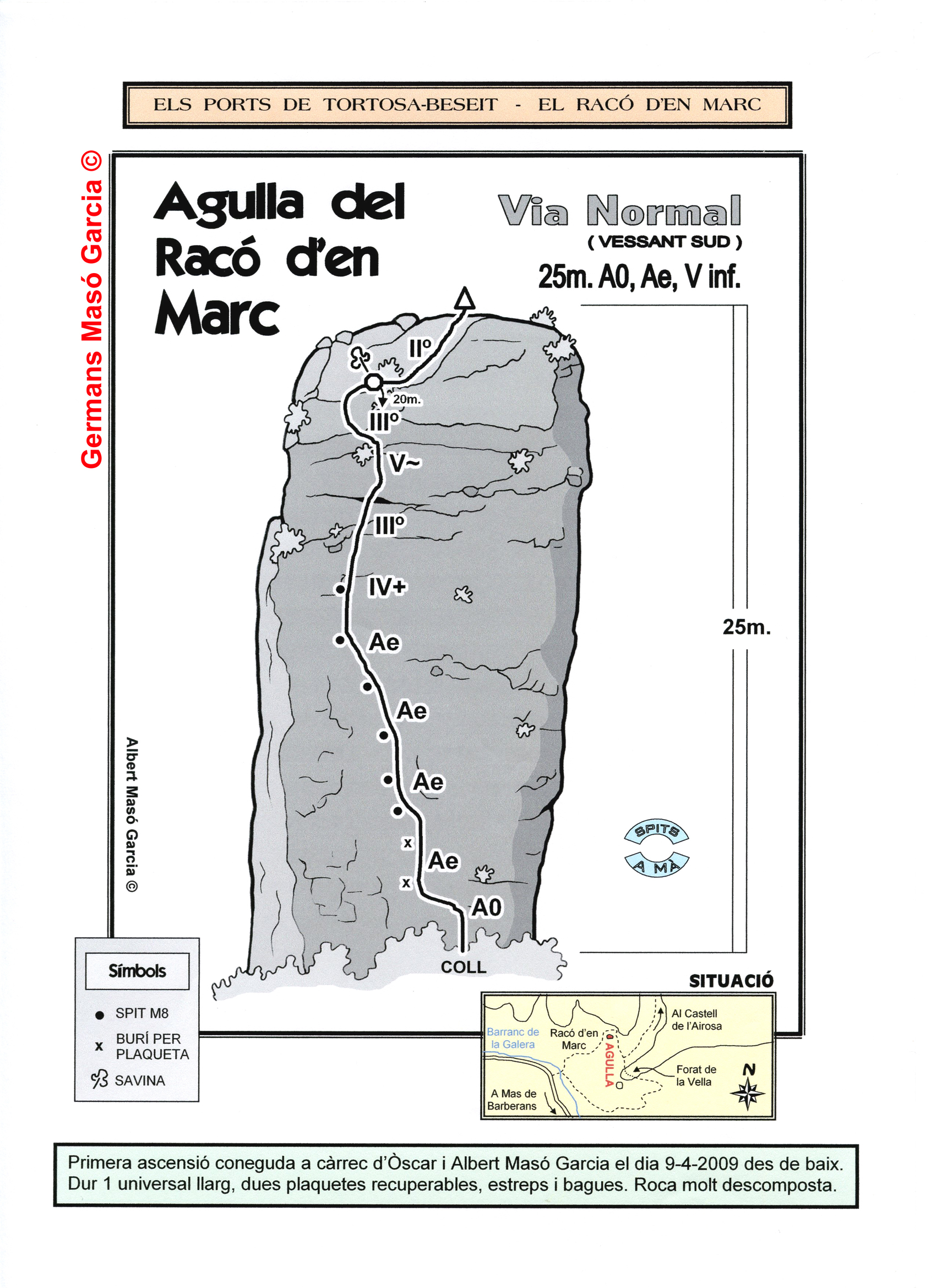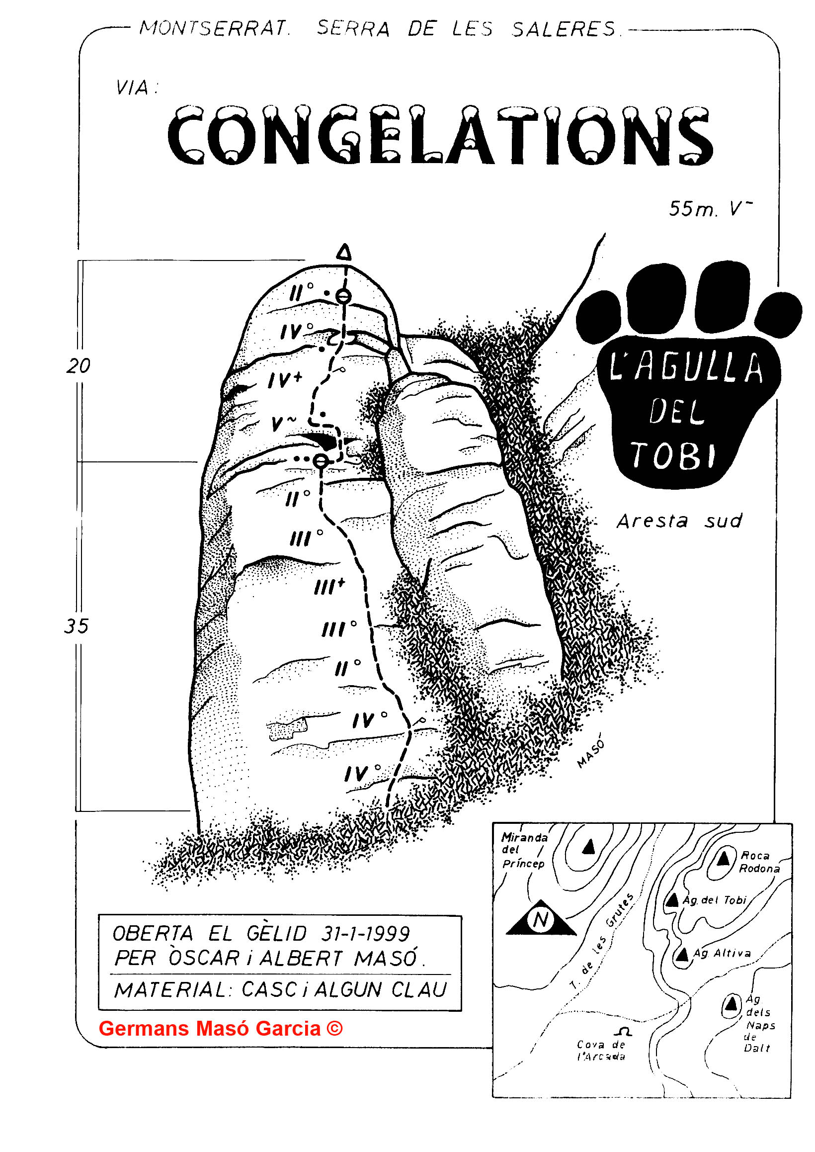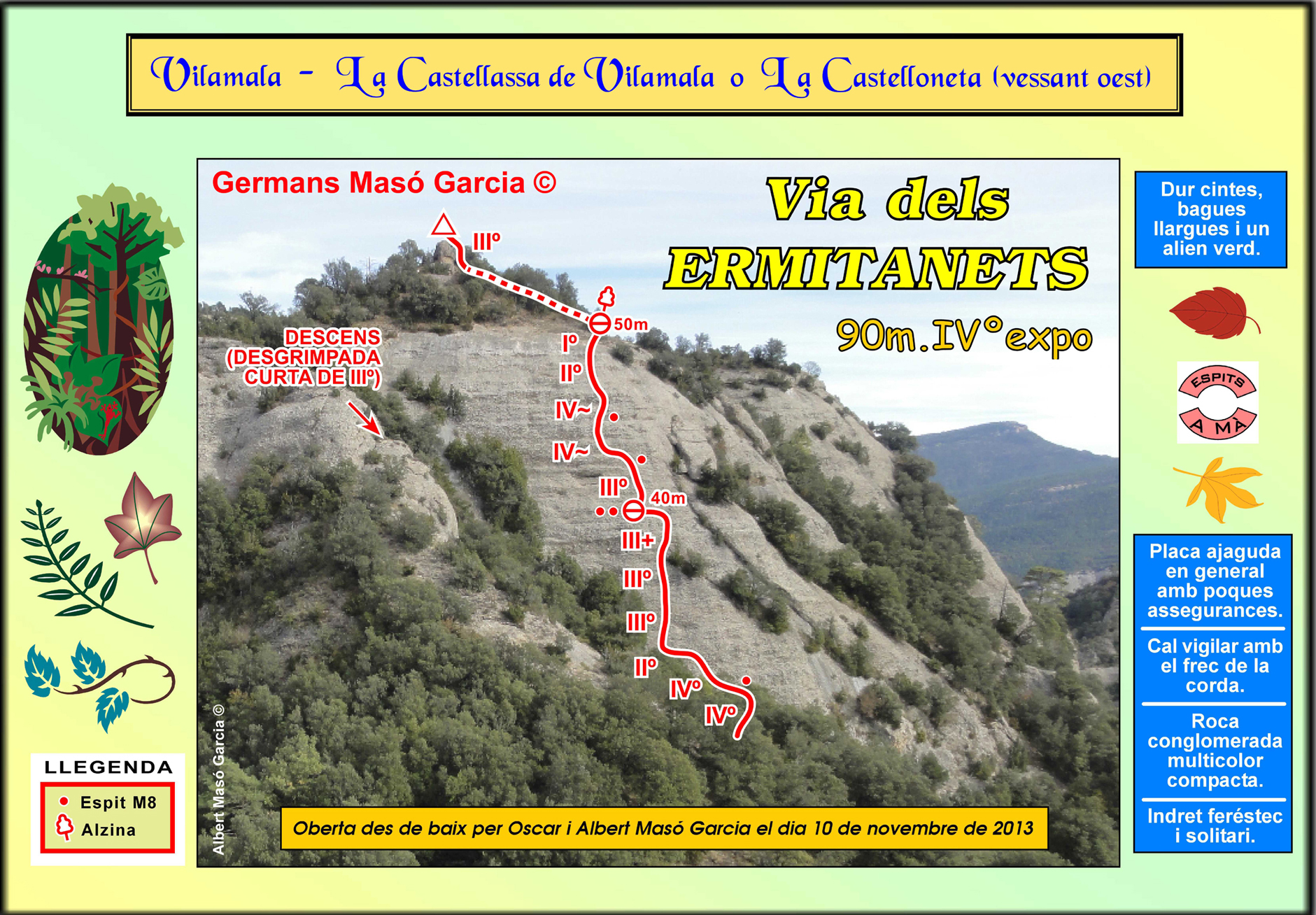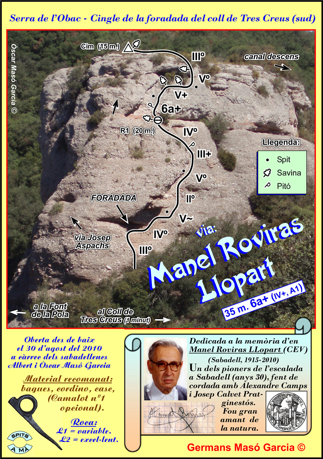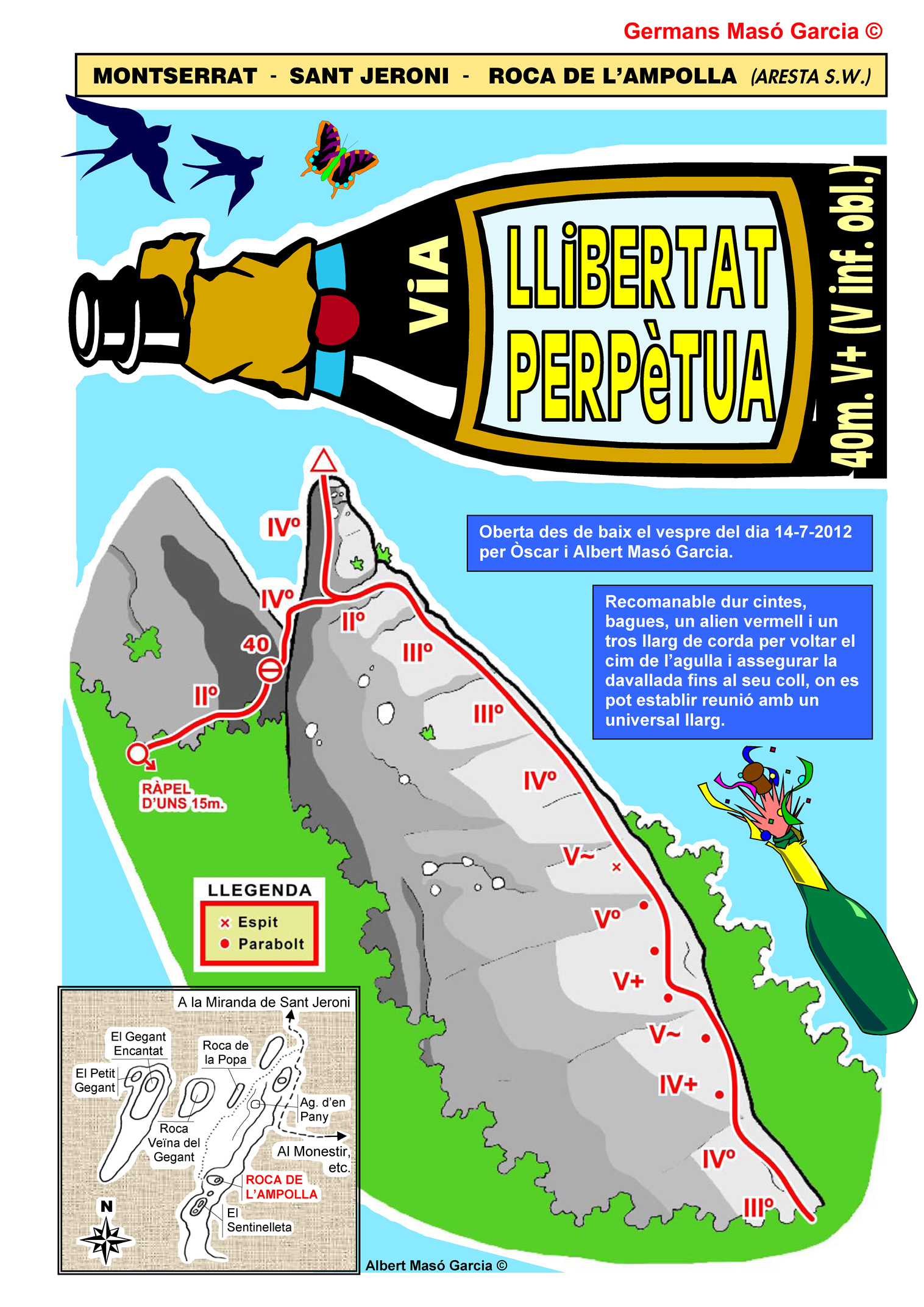 SEGURETAT: La pràctica de l’escalada és un esport que comporta risc. Tothom qui vulgui repetir alguna de les vies ressenyades en aquesta web és l’únic responsable de la seva pròpia seguretat i del conjunt de la cordada. En aquest sentit, els autors de les vies i les ressenyes declinen qualsevol responsabilitat.