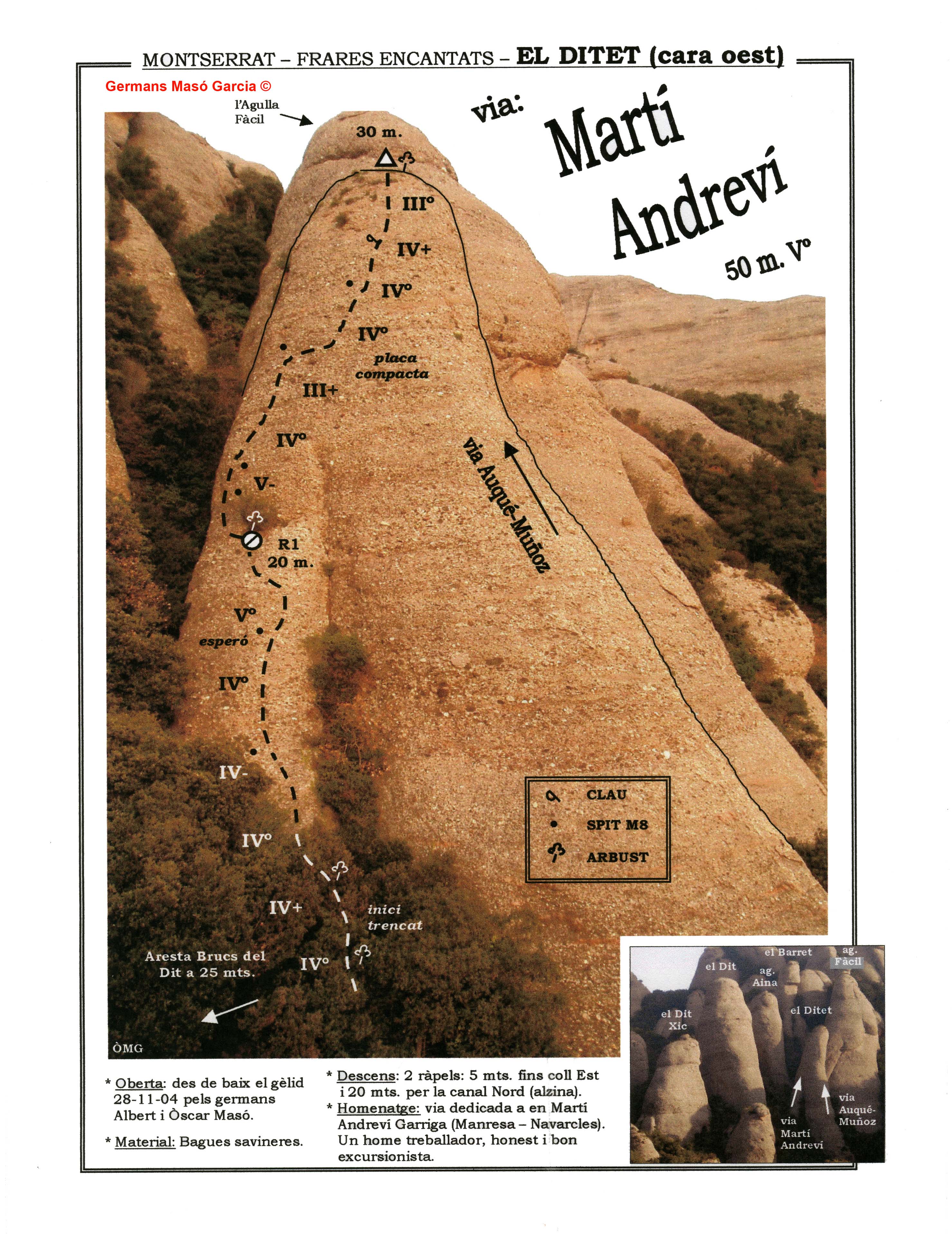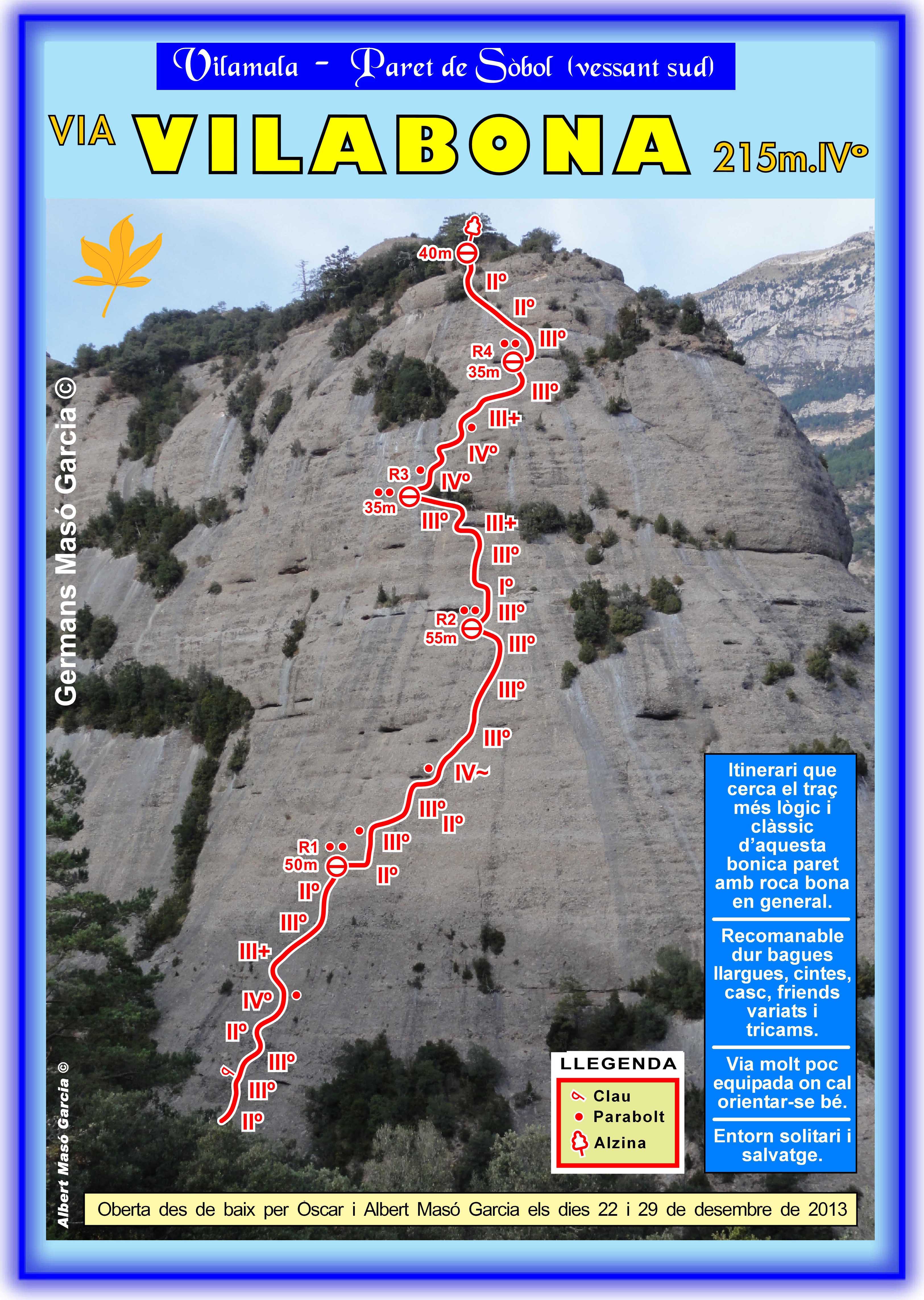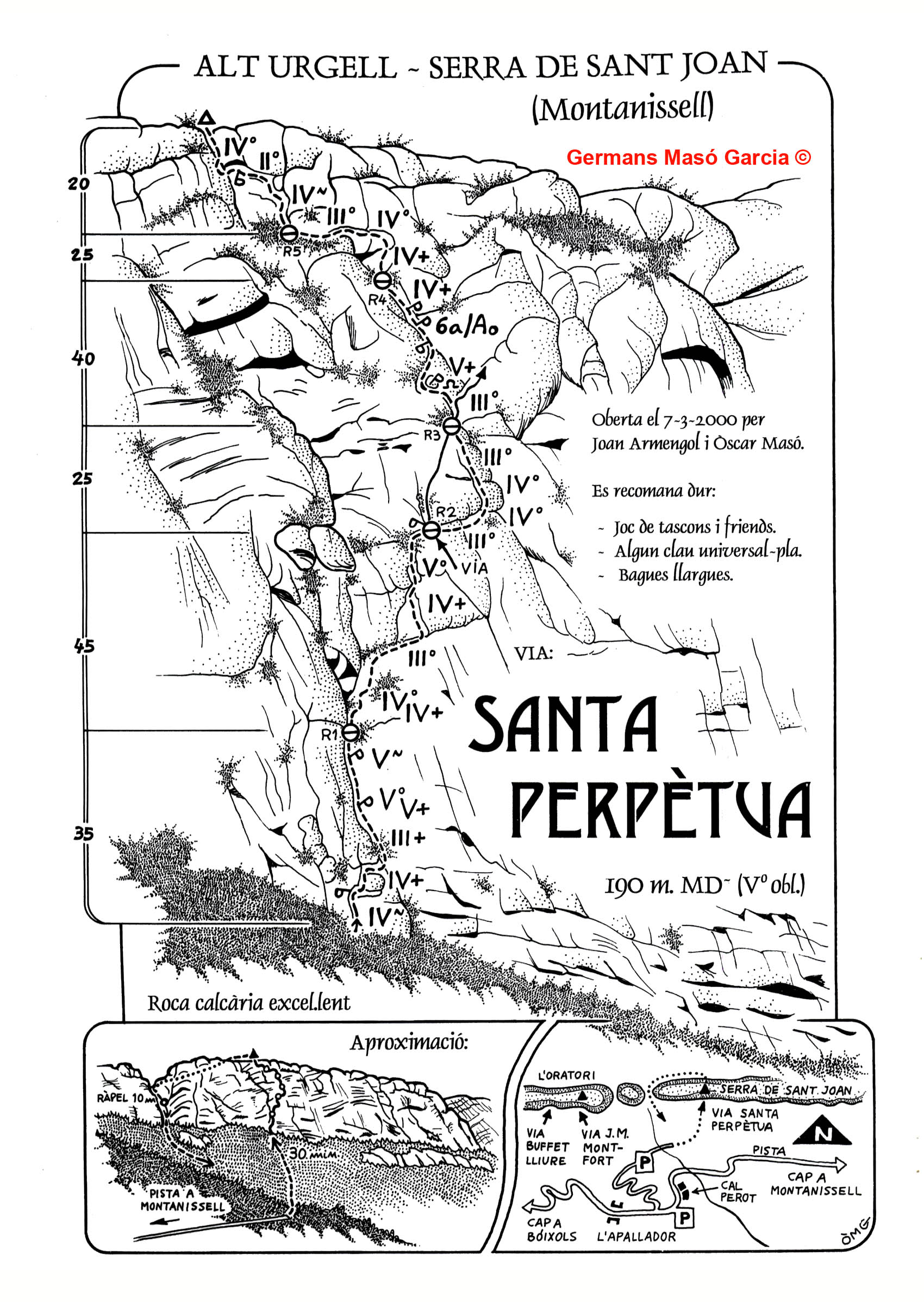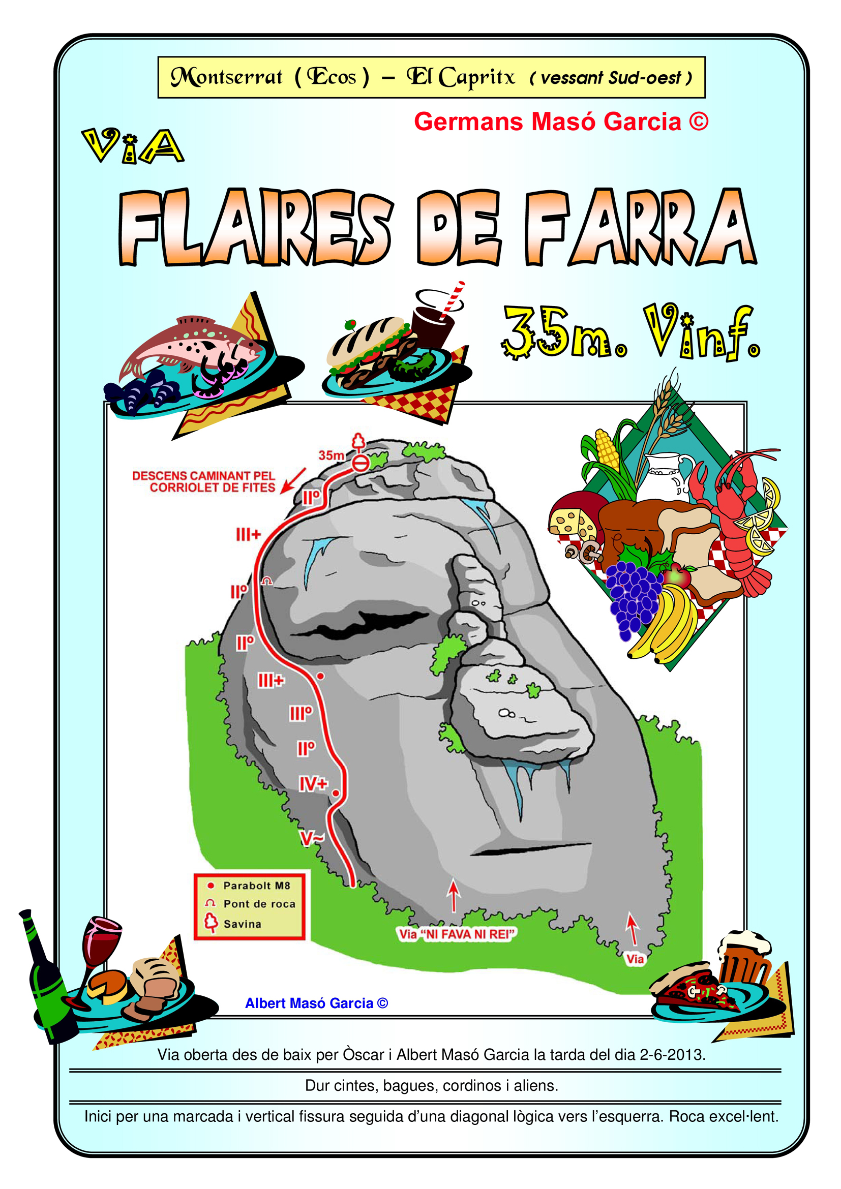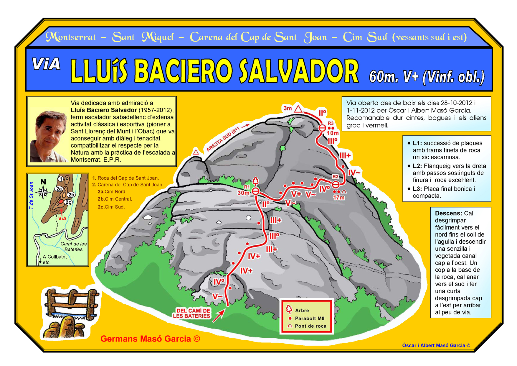 SEGURETAT: La pràctica de l’escalada és un esport que comporta risc. Tothom qui vulgui repetir alguna de les vies ressenyades en aquesta web és l’únic responsable de la seva pròpia seguretat i del conjunt de la cordada. En aquest sentit, els autors de les vies i les ressenyes declinen qualsevol responsabilitat.