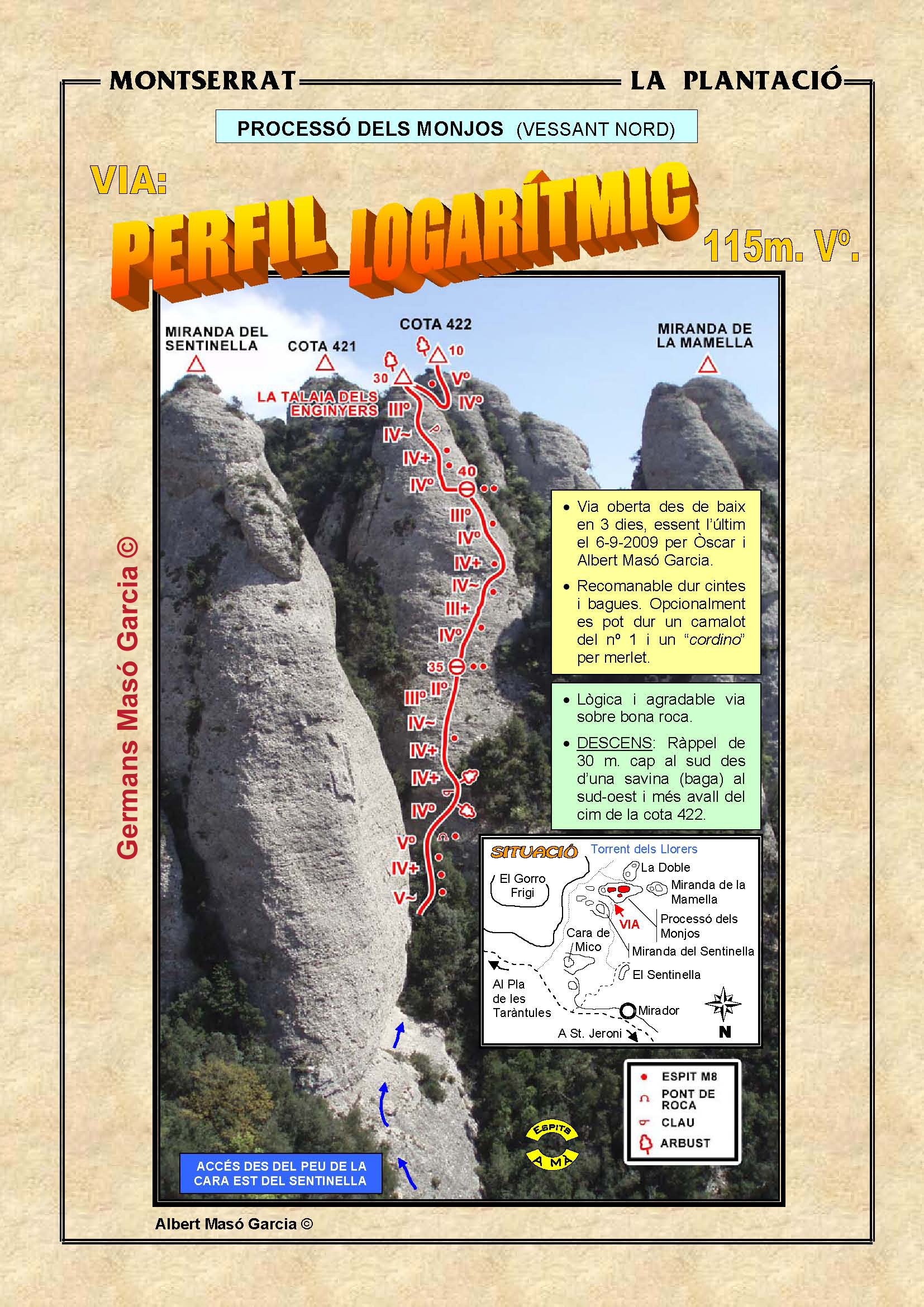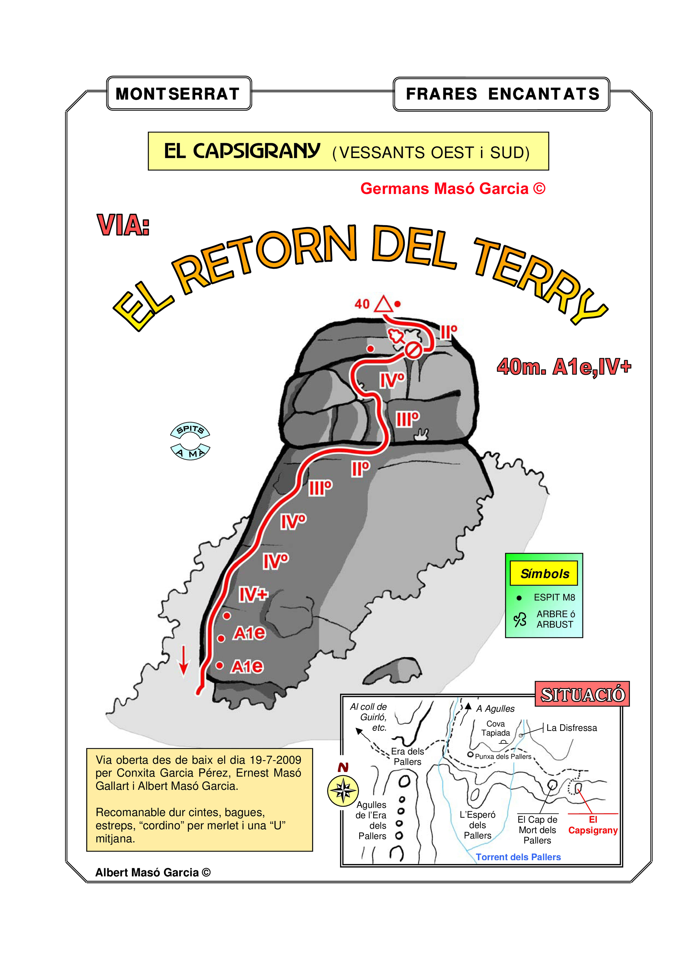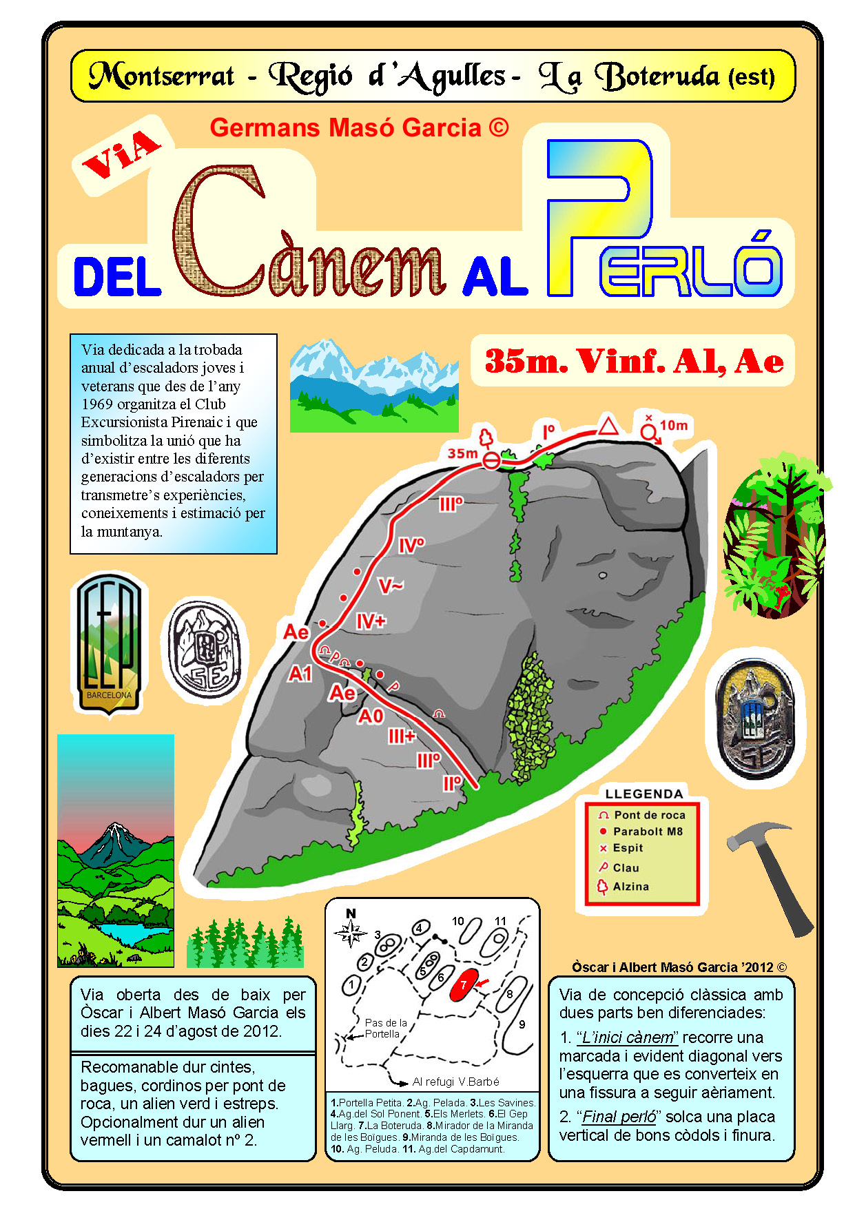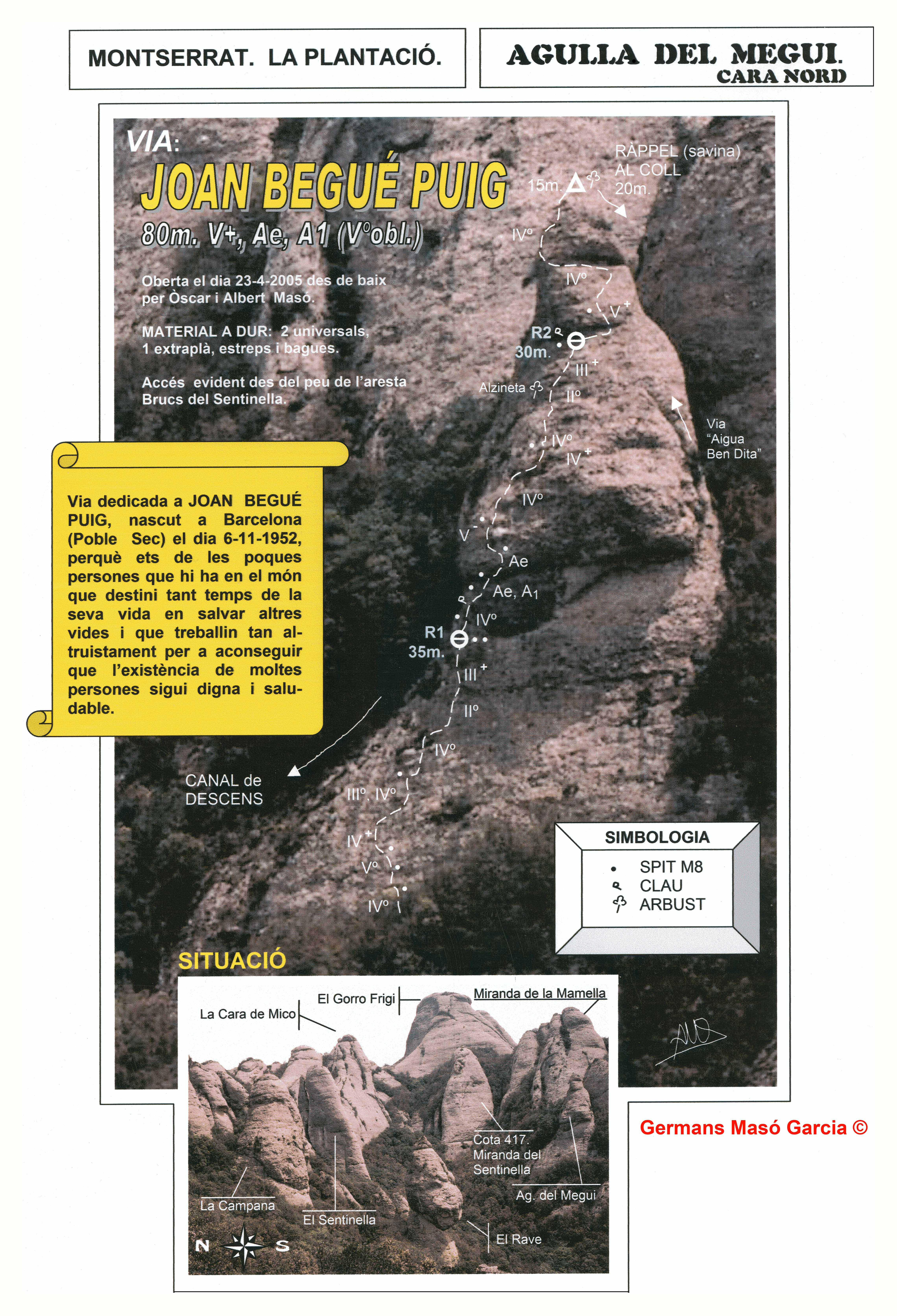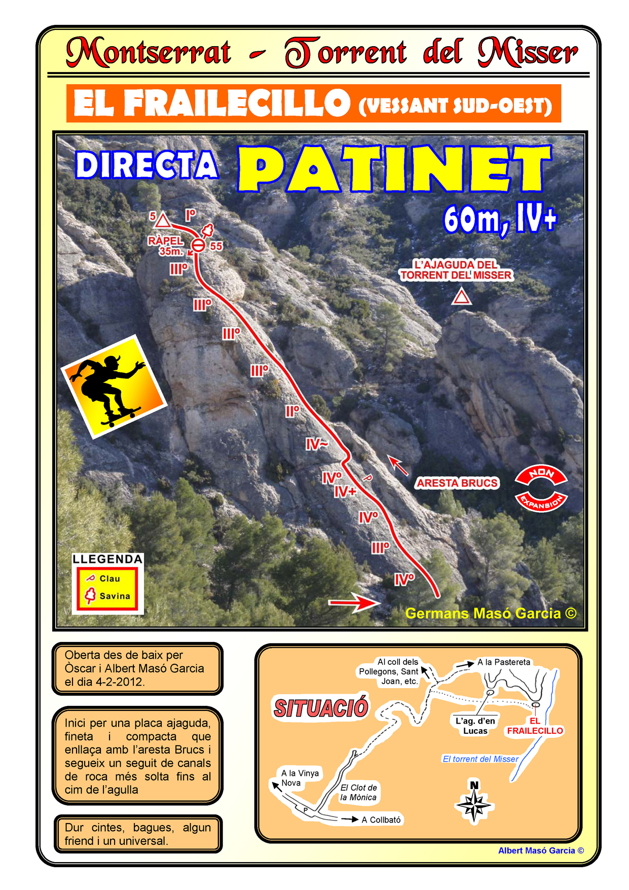 SEGURETAT: La pràctica de l’escalada és un esport que comporta risc. Tothom qui vulgui repetir alguna de les vies ressenyades en aquesta web és l’únic responsable de la seva pròpia seguretat i del conjunt de la cordada. En aquest sentit, els autors de les vies i les ressenyes declinen qualsevol responsabilitat.