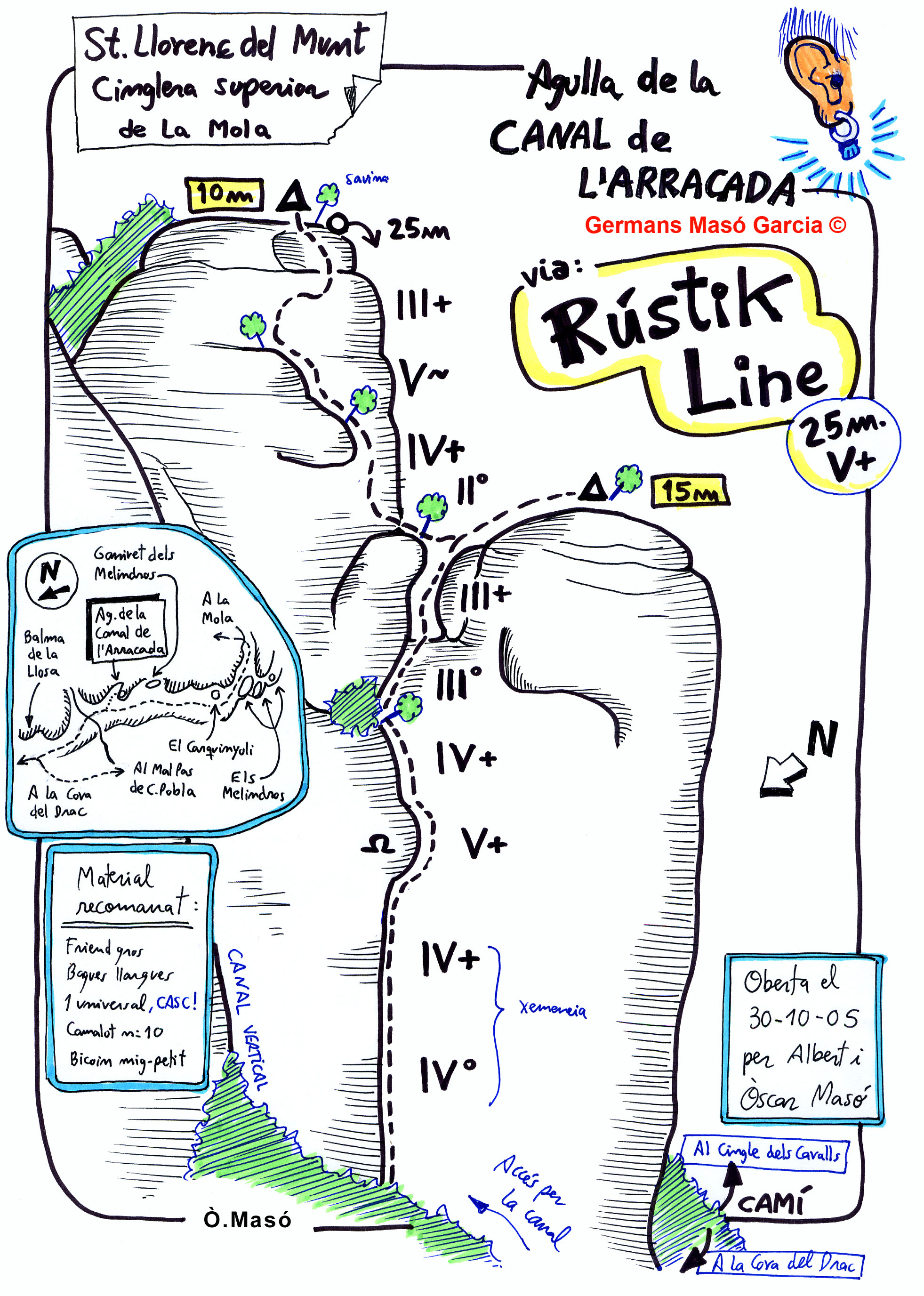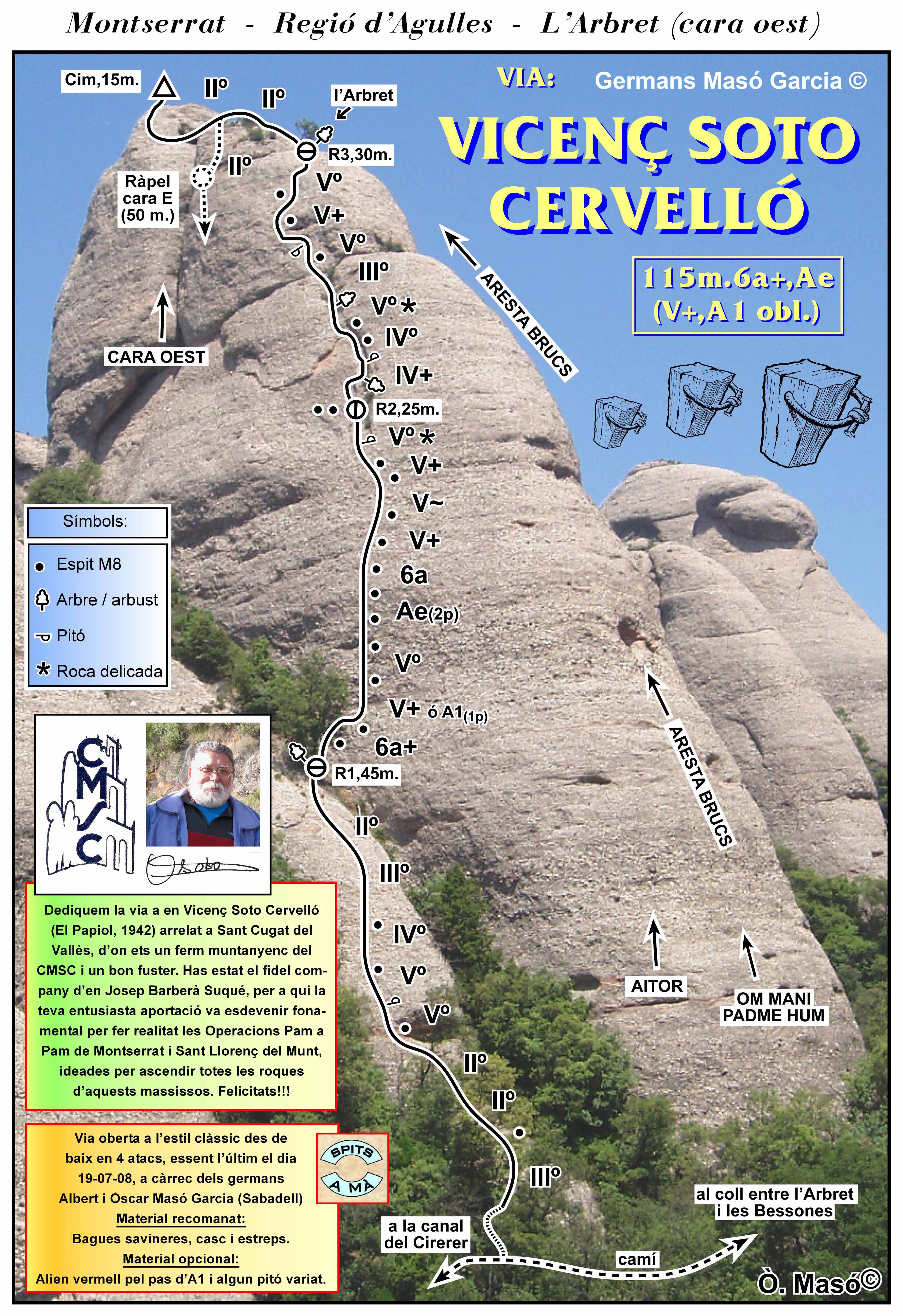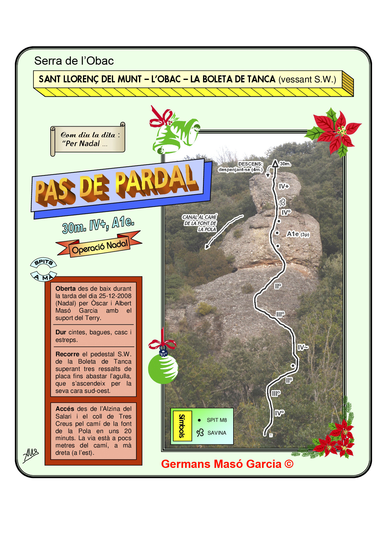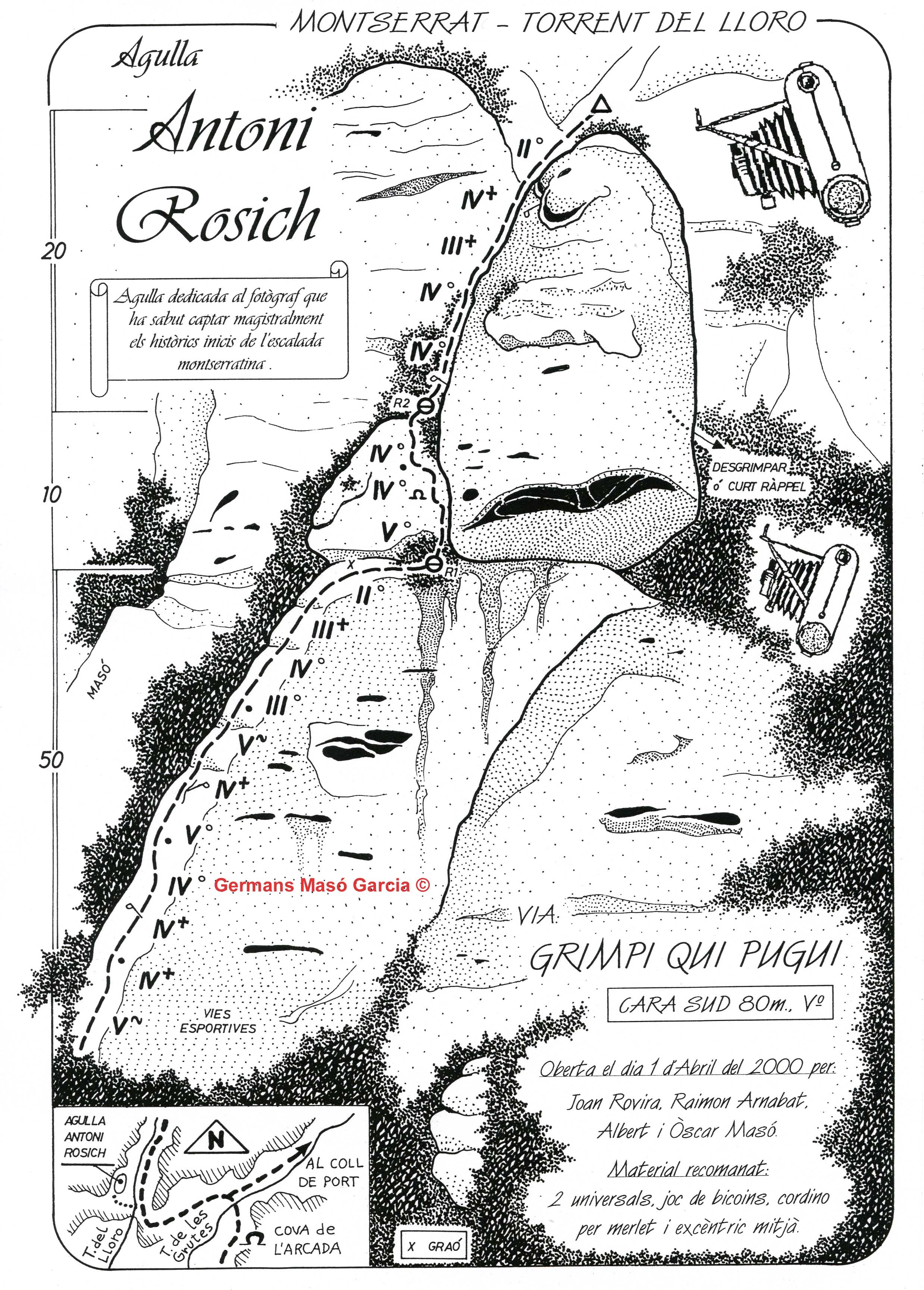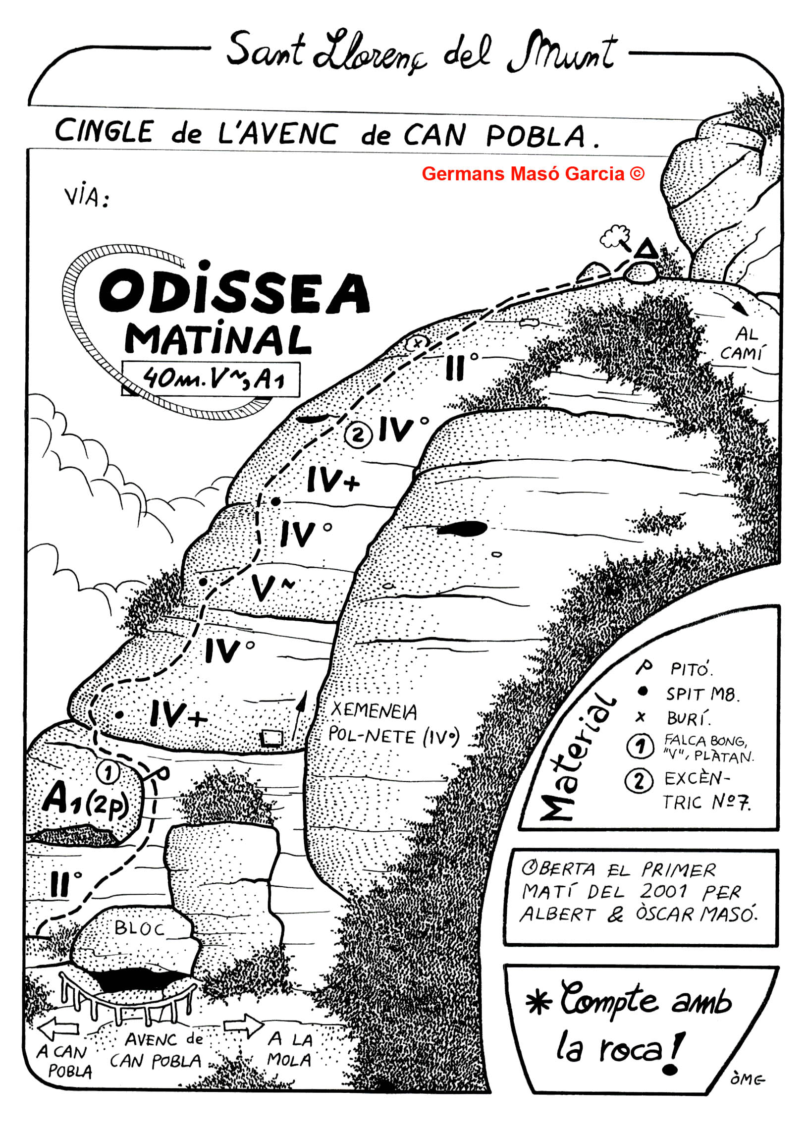 SEGURETAT: La pràctica de l’escalada és un esport que comporta risc. Tothom qui vulgui repetir alguna de les vies ressenyades en aquesta web és l’únic responsable de la seva pròpia seguretat i del conjunt de la cordada. En aquest sentit, els autors de les vies i les ressenyes declinen qualsevol responsabilitat.