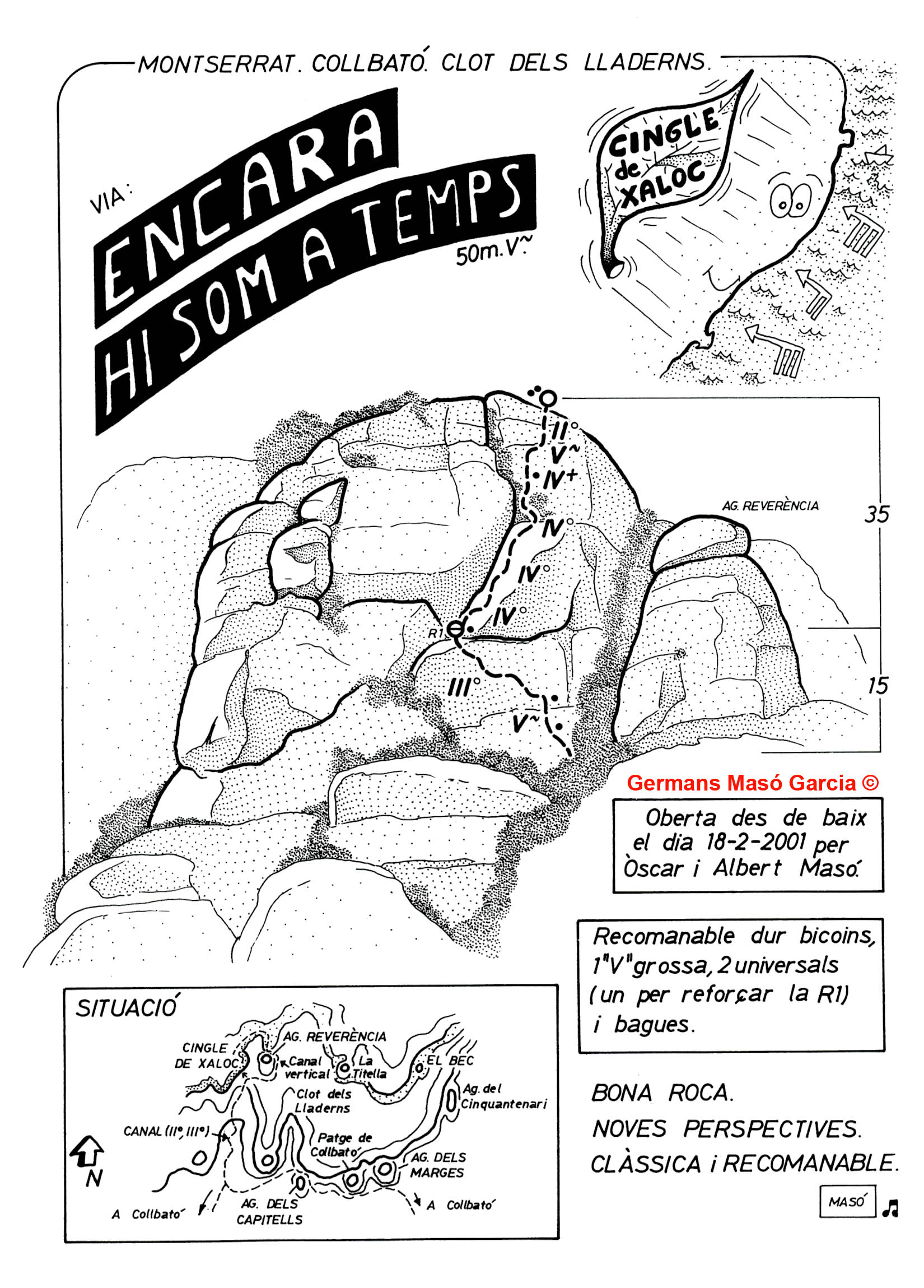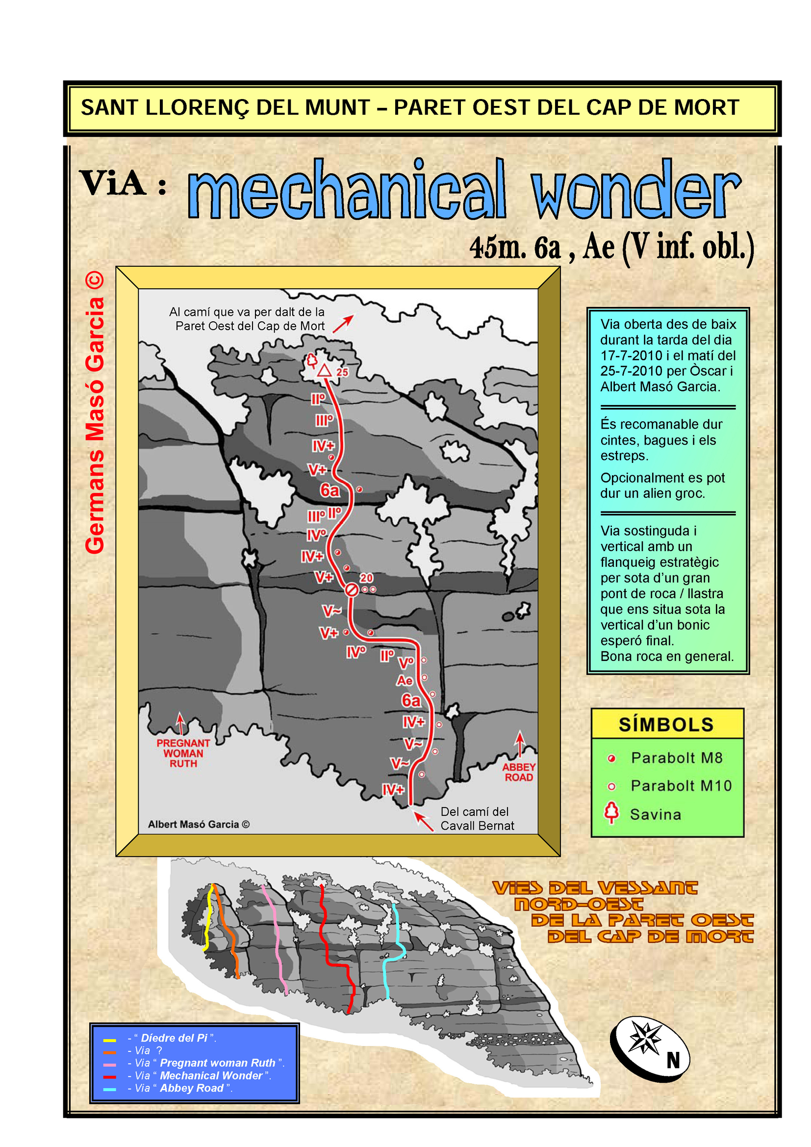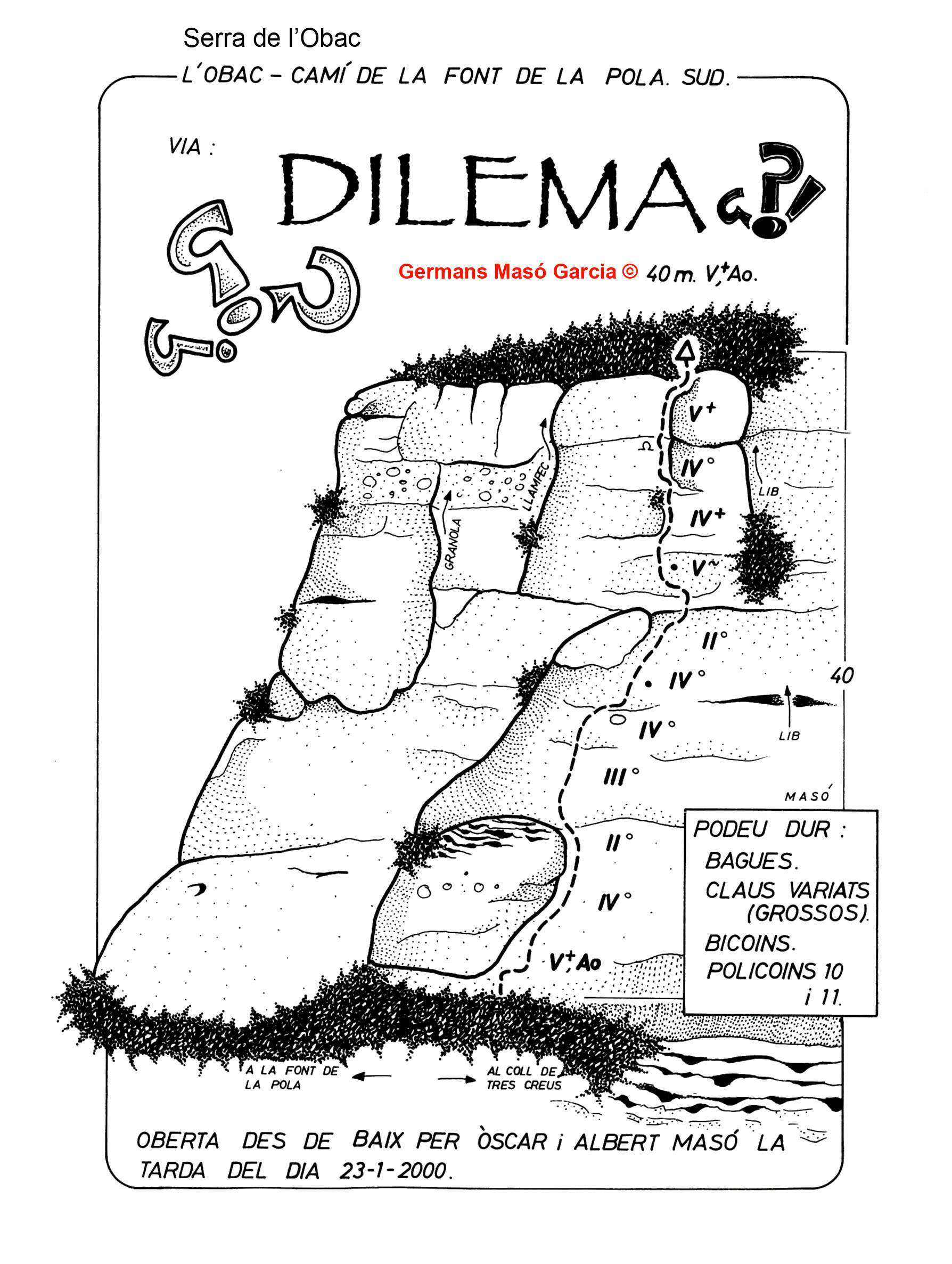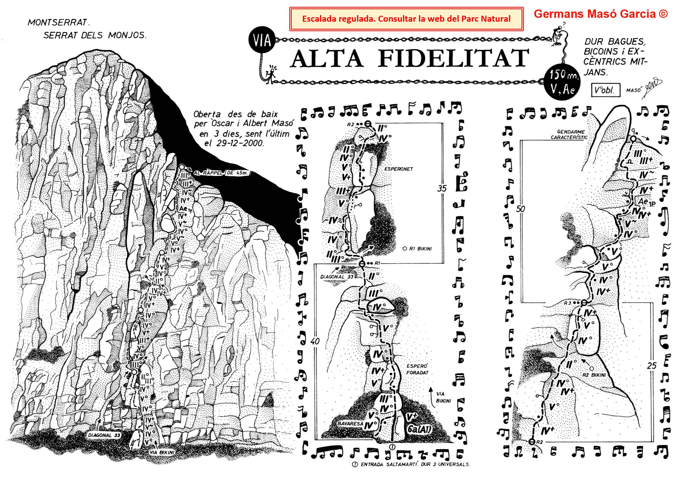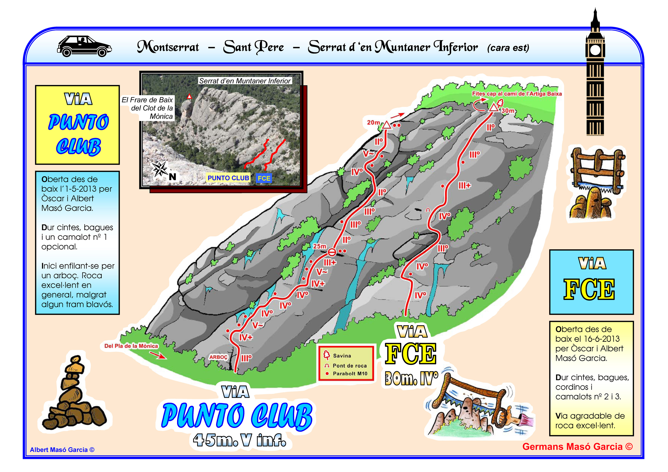 SEGURETAT: La pràctica de l’escalada és un esport que comporta risc. Tothom qui vulgui repetir alguna de les vies ressenyades en aquesta web és l’únic responsable de la seva pròpia seguretat i del conjunt de la cordada. En aquest sentit, els autors de les vies i les ressenyes declinen qualsevol responsabilitat.
