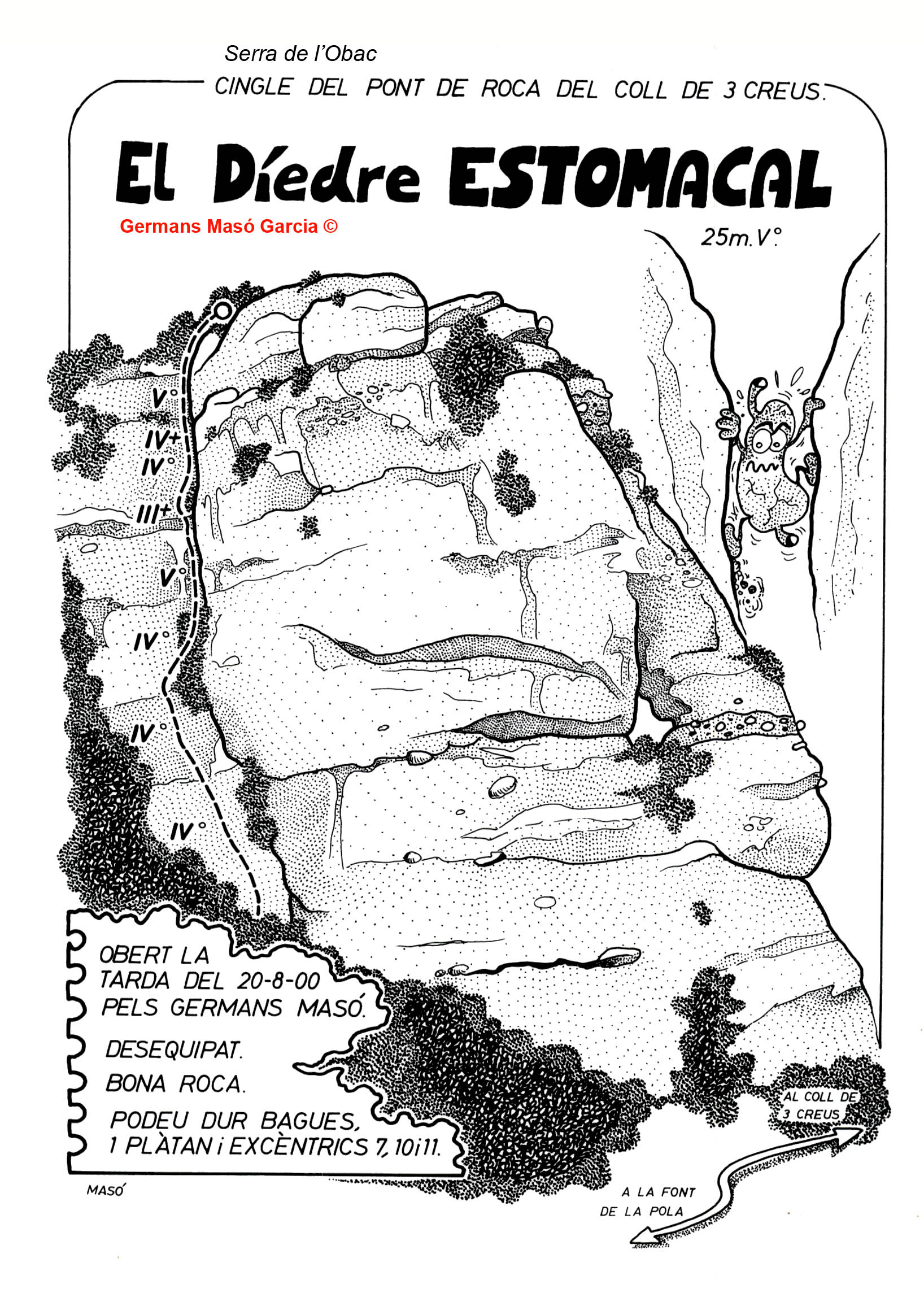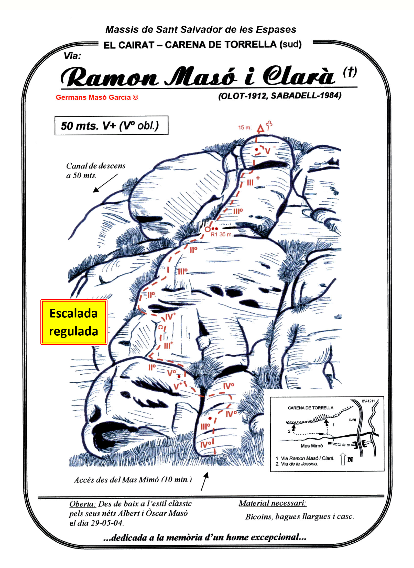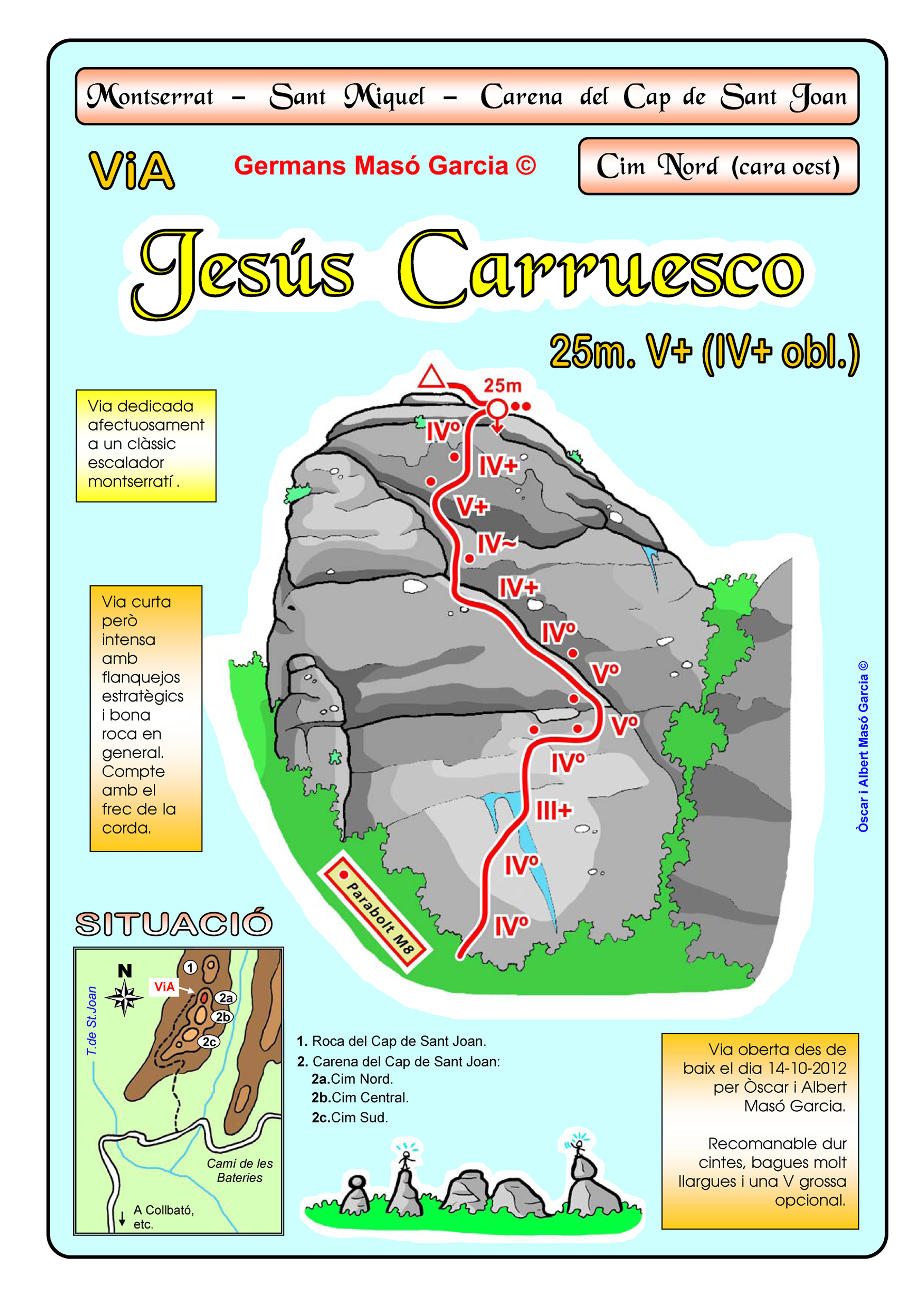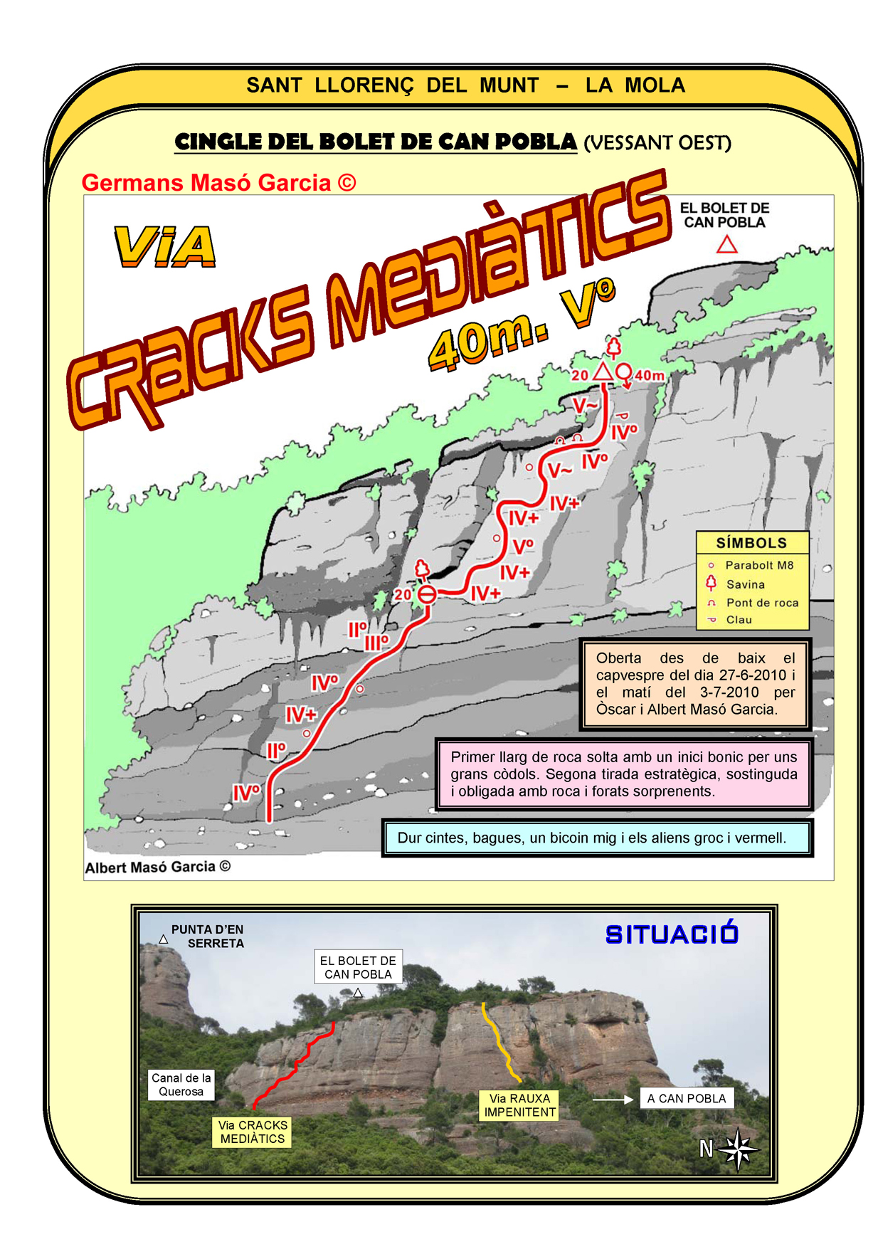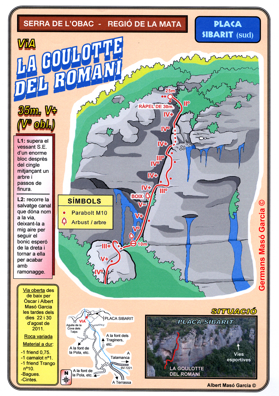 SEGURETAT: La pràctica de l’escalada és un esport que comporta risc. Tothom qui vulgui repetir alguna de les vies ressenyades en aquesta web és l’únic responsable de la seva pròpia seguretat i del conjunt de la cordada. En aquest sentit, els autors de les vies i les ressenyes declinen qualsevol responsabilitat.