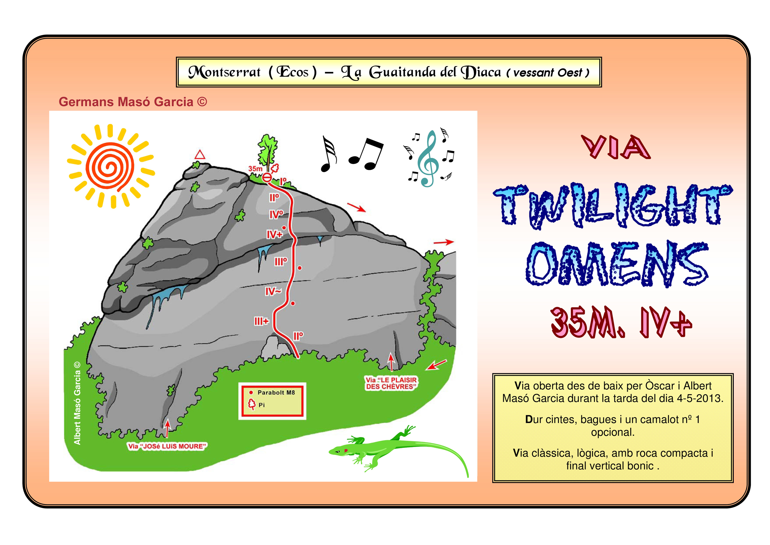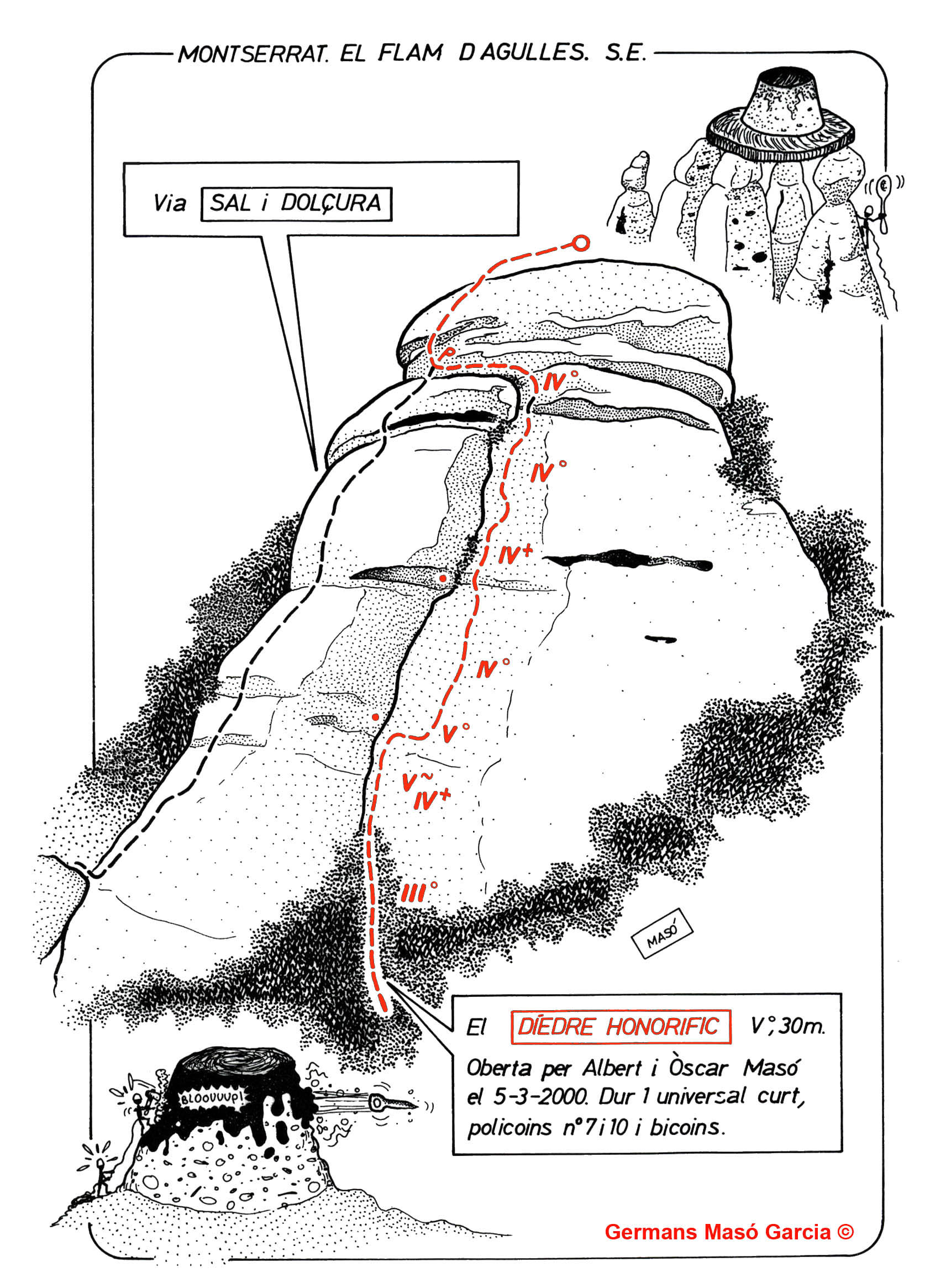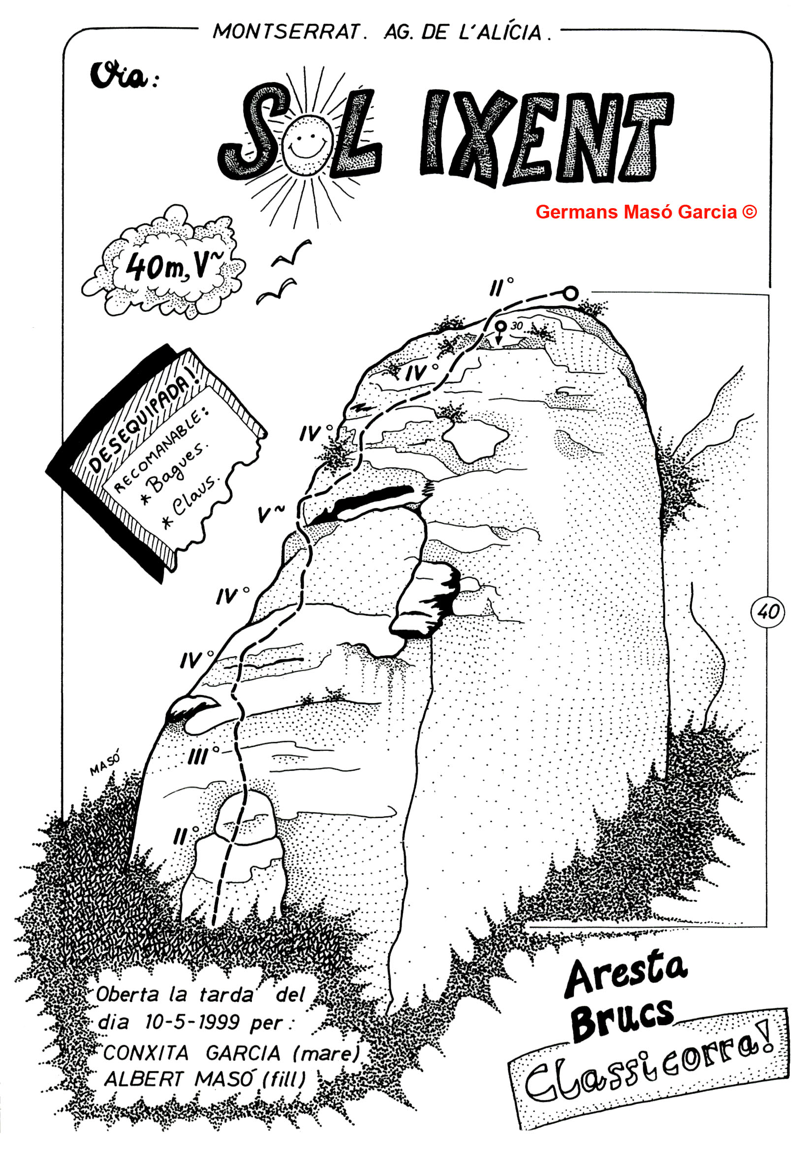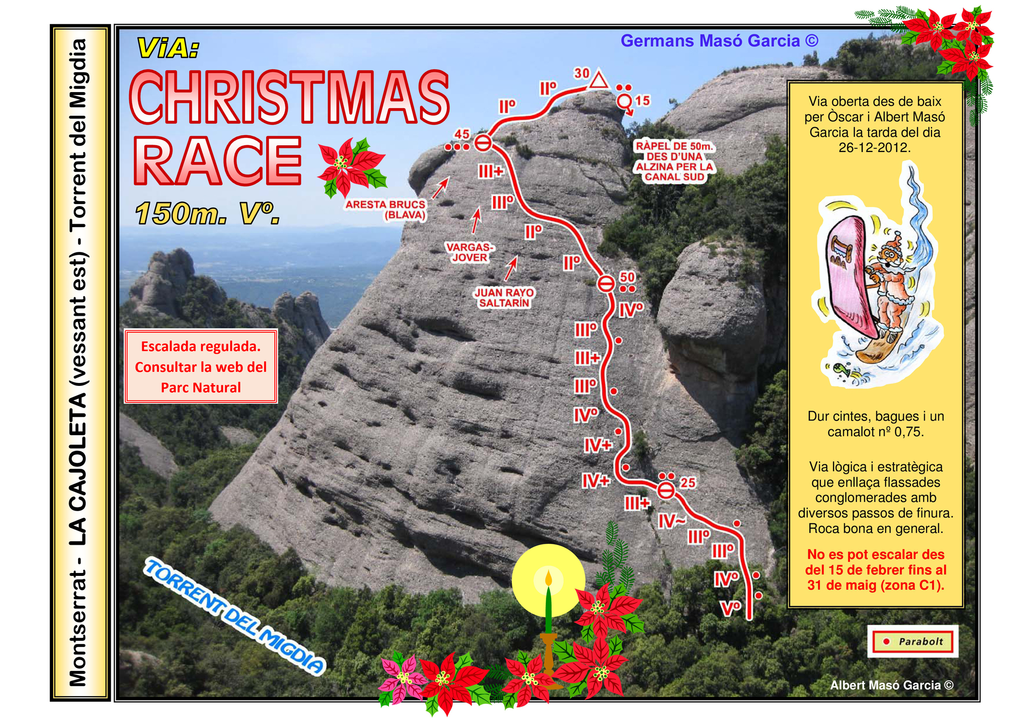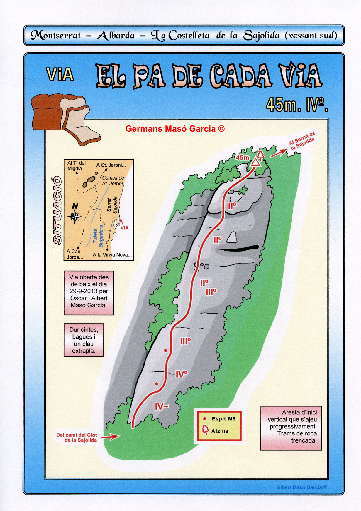 SEGURETAT: La pràctica de l’escalada és un esport que comporta risc. Tothom qui vulgui repetir alguna de les vies ressenyades en aquesta web és l’únic responsable de la seva pròpia seguretat i del conjunt de la cordada. En aquest sentit, els autors de les vies i les ressenyes declinen qualsevol responsabilitat.