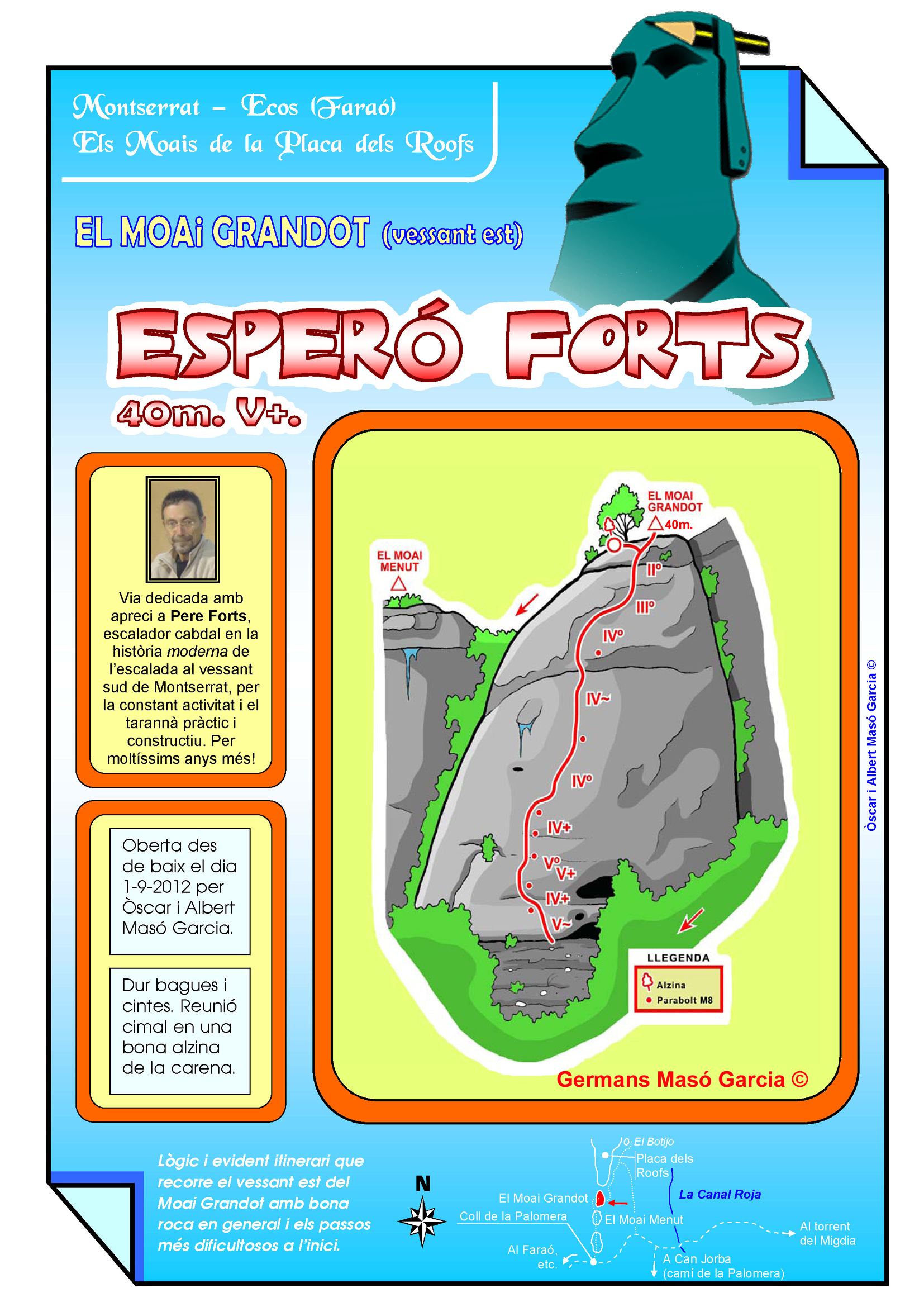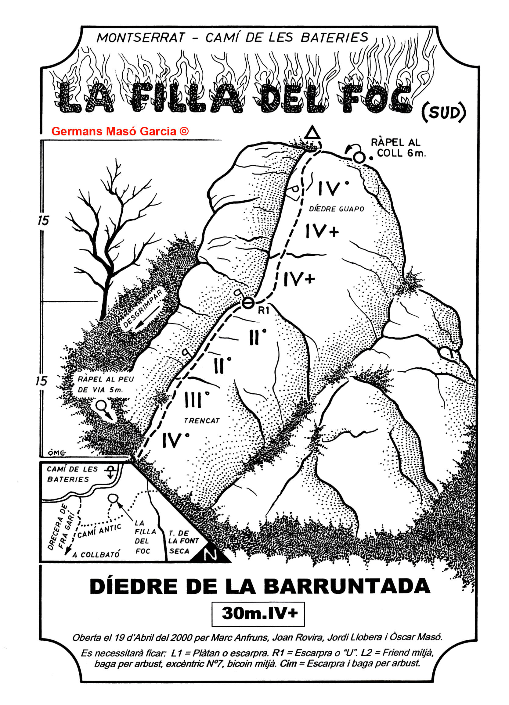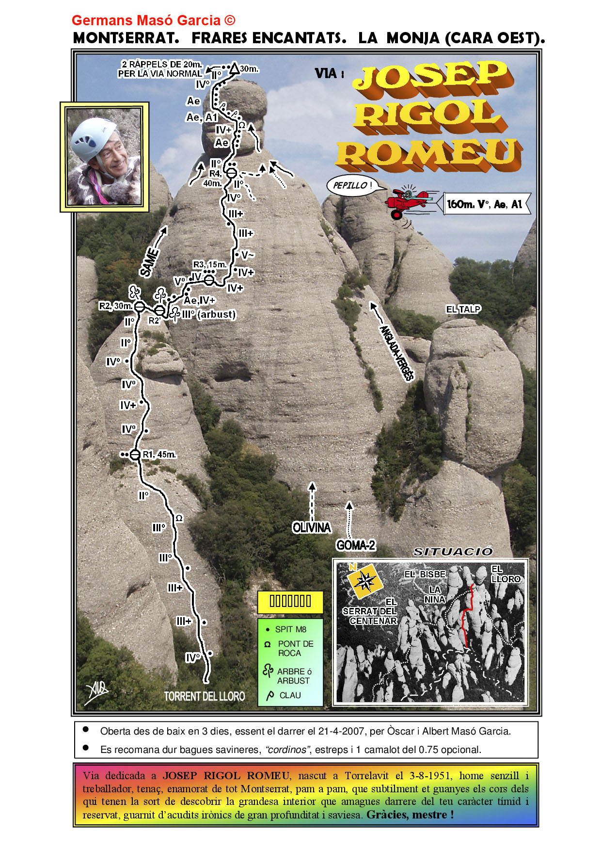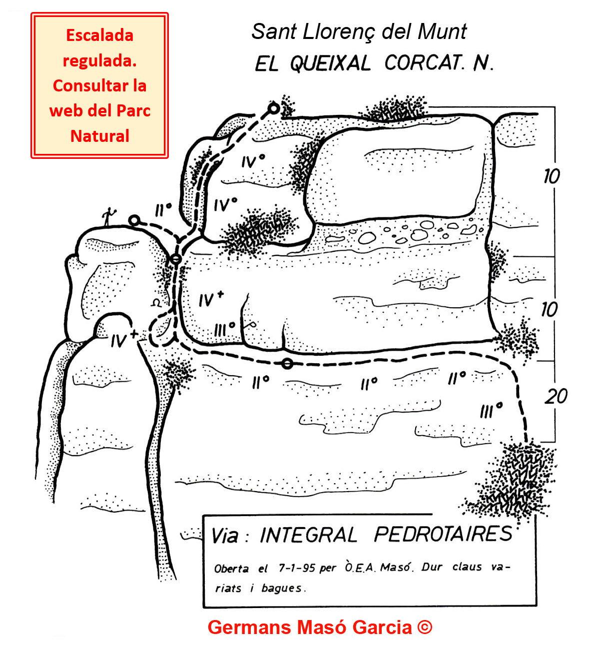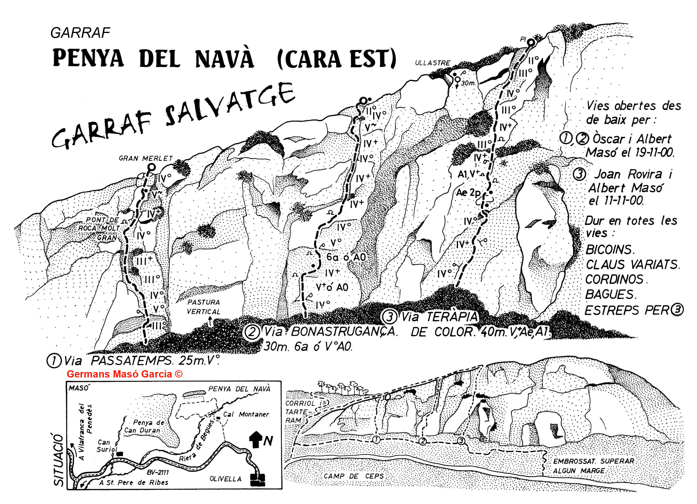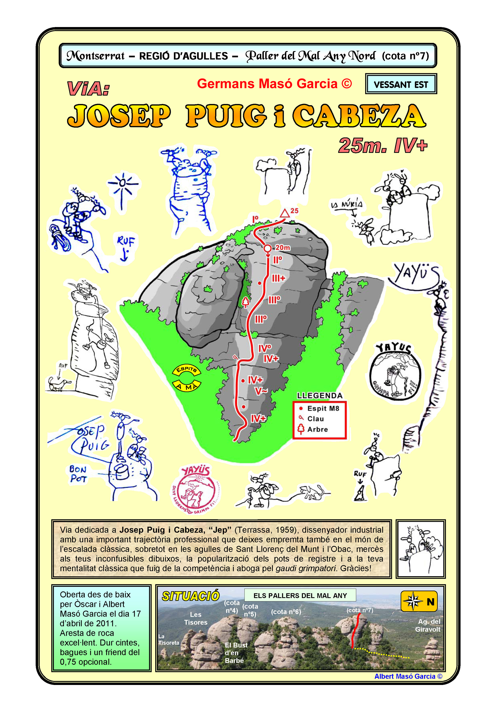 SEGURETAT: La pràctica de l’escalada és un esport que comporta risc. Tothom qui vulgui repetir alguna de les vies ressenyades en aquesta web és l’únic responsable de la seva pròpia seguretat i del conjunt de la cordada. En aquest sentit, els autors de les vies i les ressenyes declinen qualsevol responsabilitat.