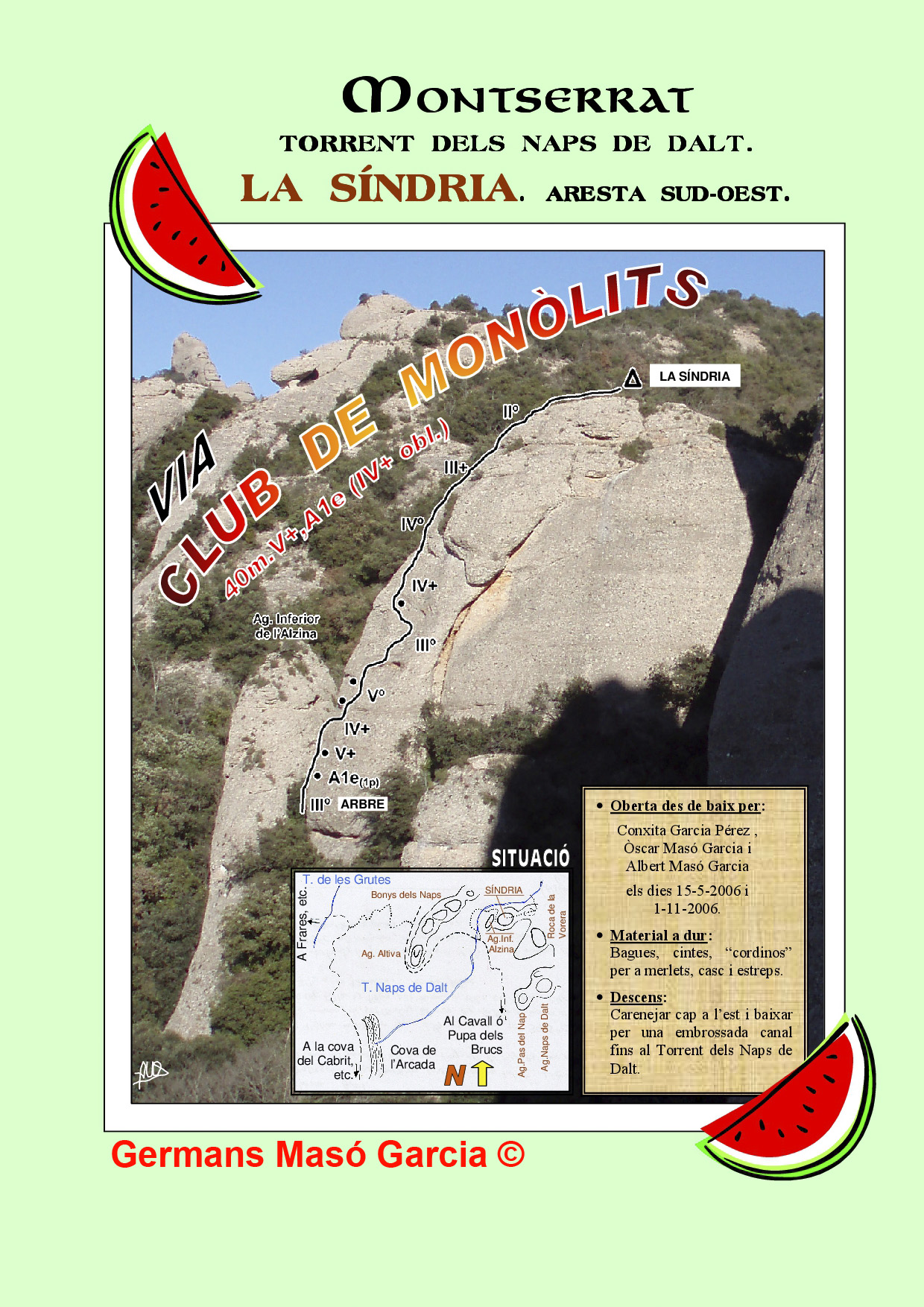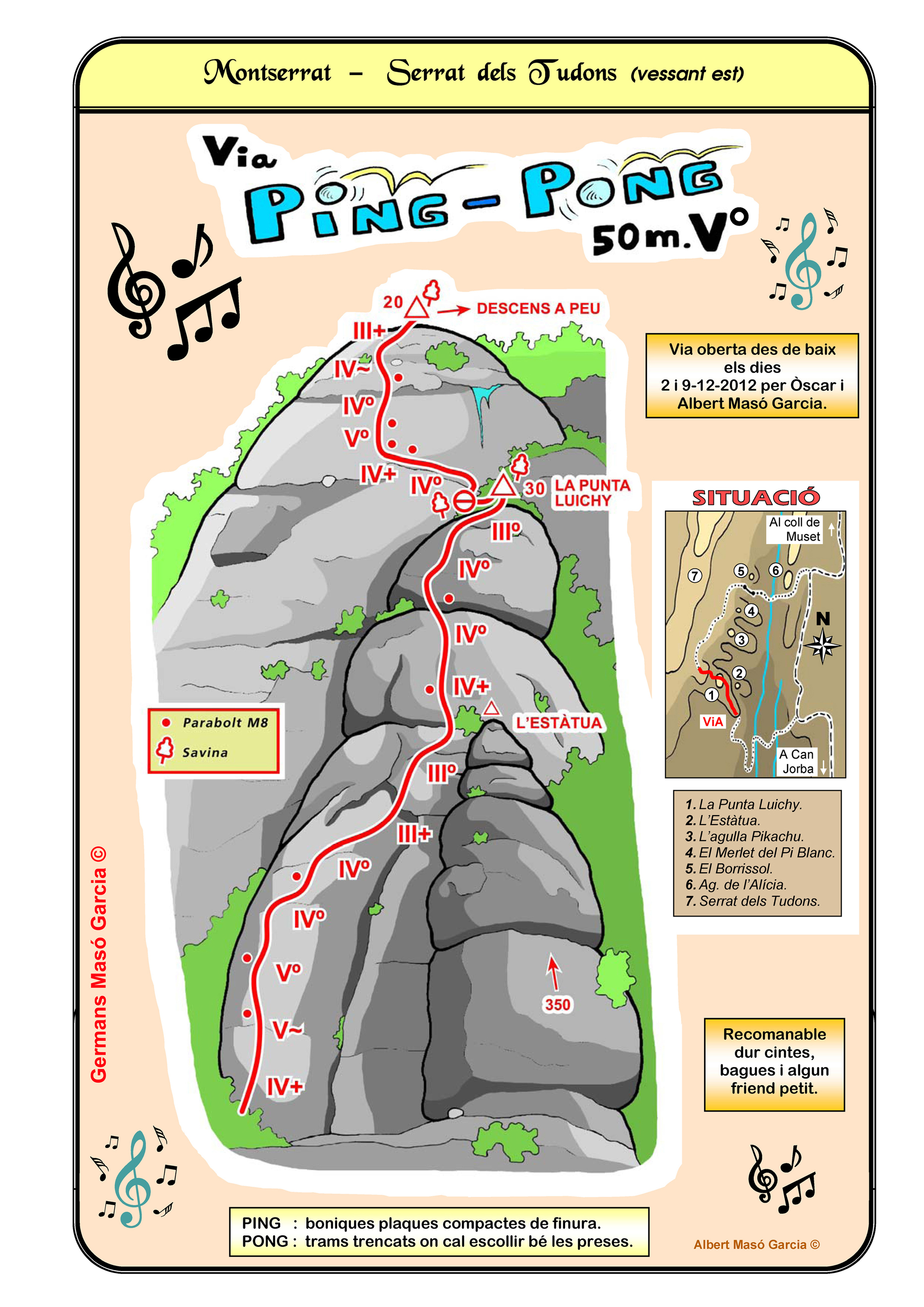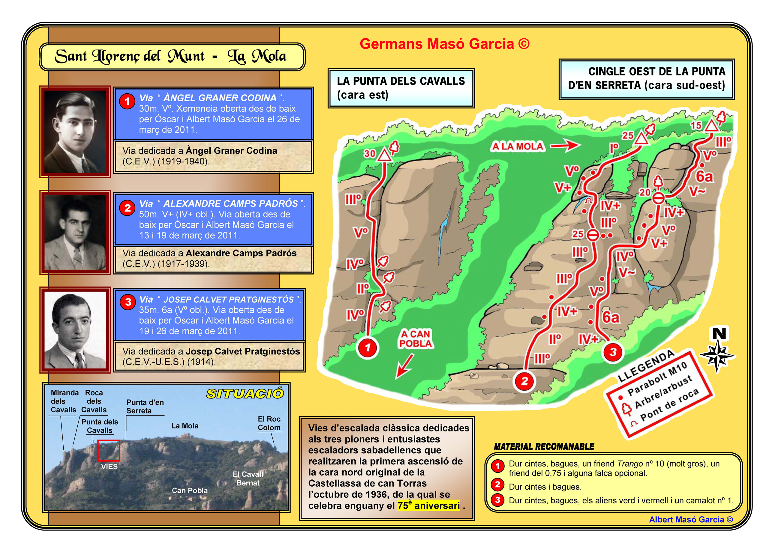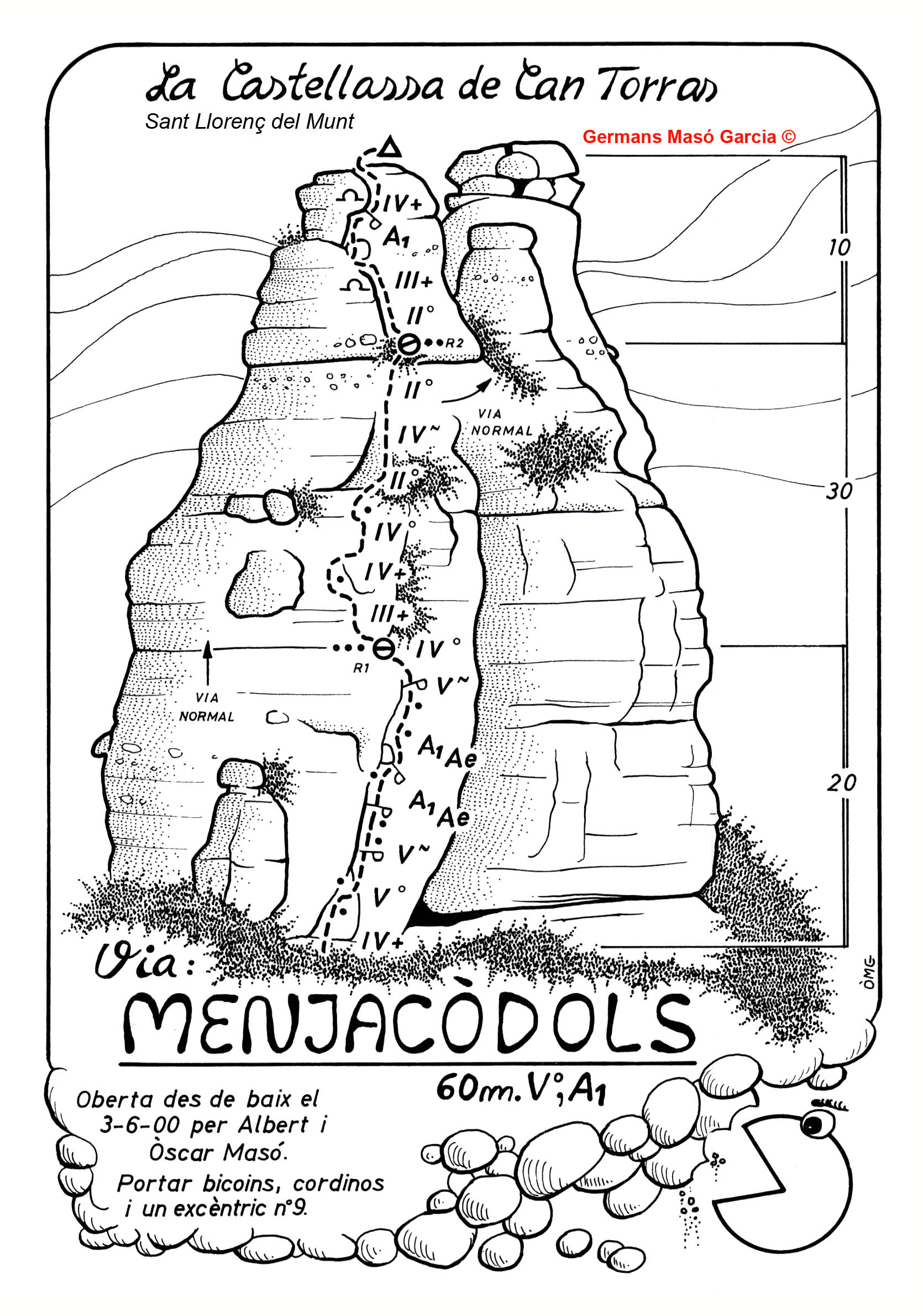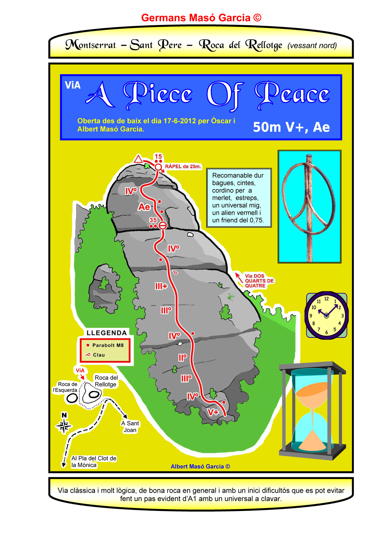 SEGURETAT: La pràctica de l’escalada és un esport que comporta risc. Tothom qui vulgui repetir alguna de les vies ressenyades en aquesta web és l’únic responsable de la seva pròpia seguretat i del conjunt de la cordada. En aquest sentit, els autors de les vies i les ressenyes declinen qualsevol responsabilitat.