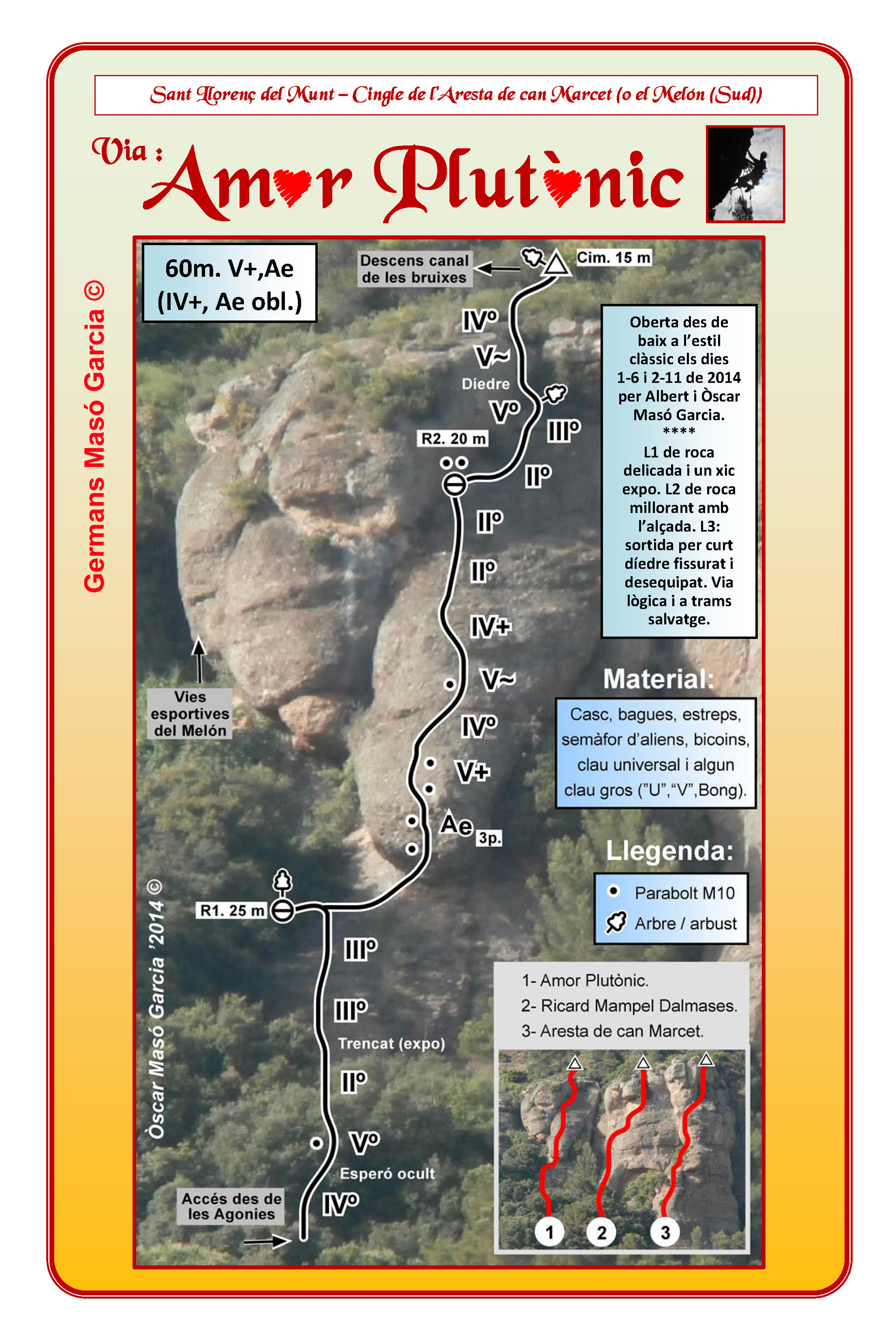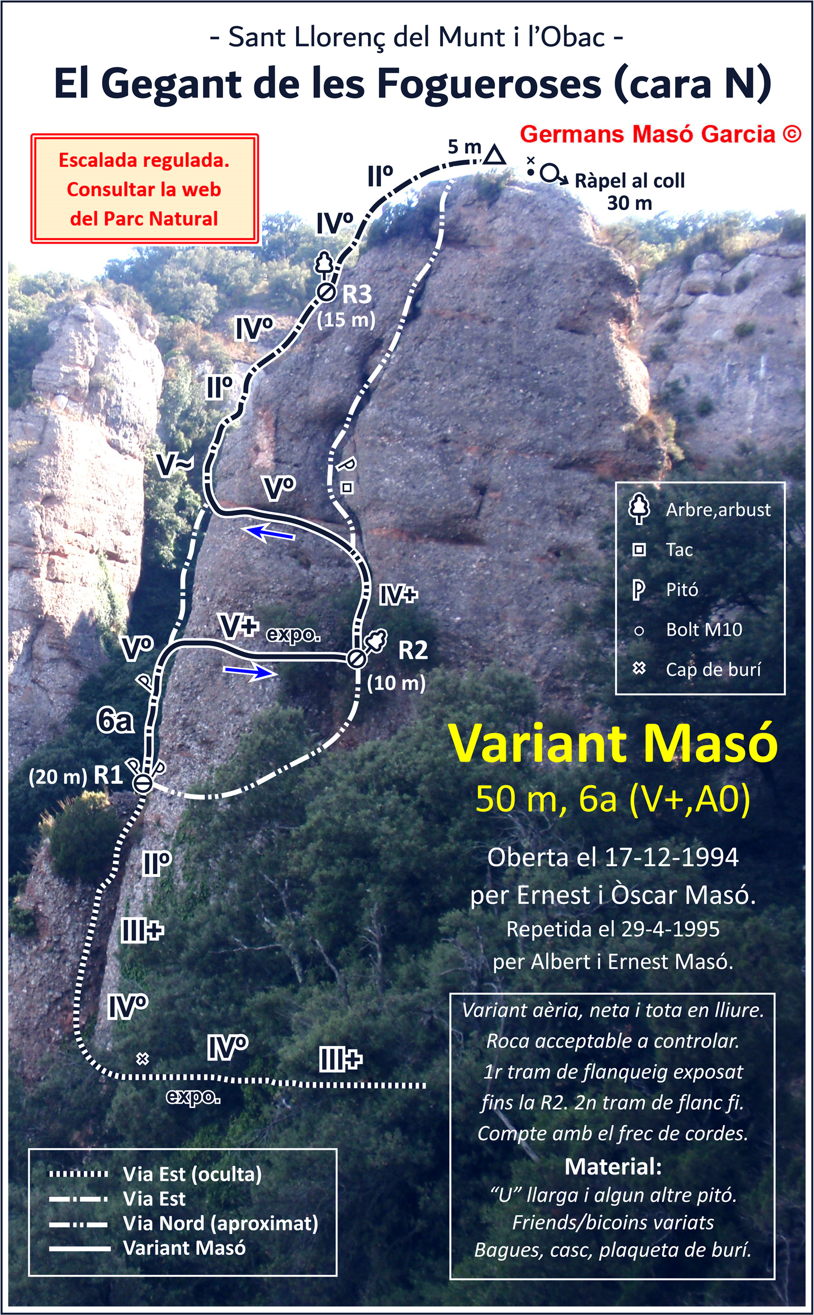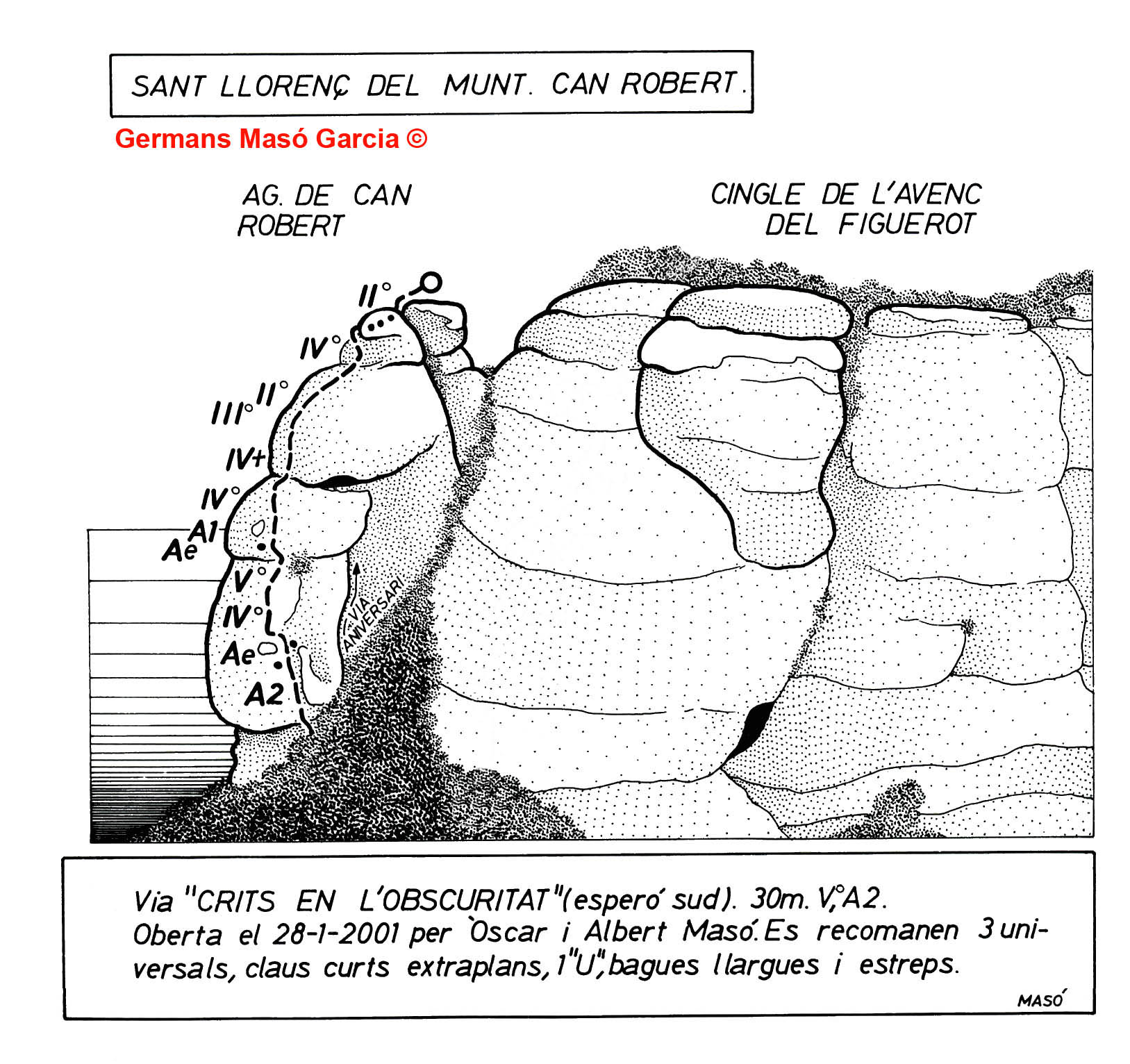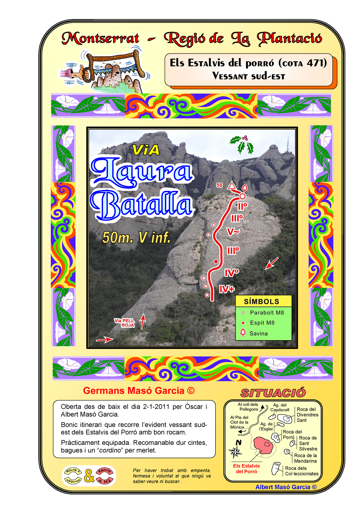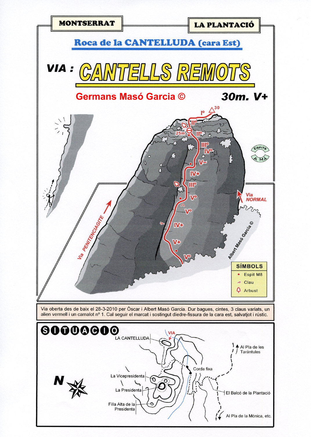 SEGURETAT: La pràctica de l’escalada és un esport que comporta risc. Tothom qui vulgui repetir alguna de les vies ressenyades en aquesta web és l’únic responsable de la seva pròpia seguretat i del conjunt de la cordada. En aquest sentit, els autors de les vies i les ressenyes declinen qualsevol responsabilitat.