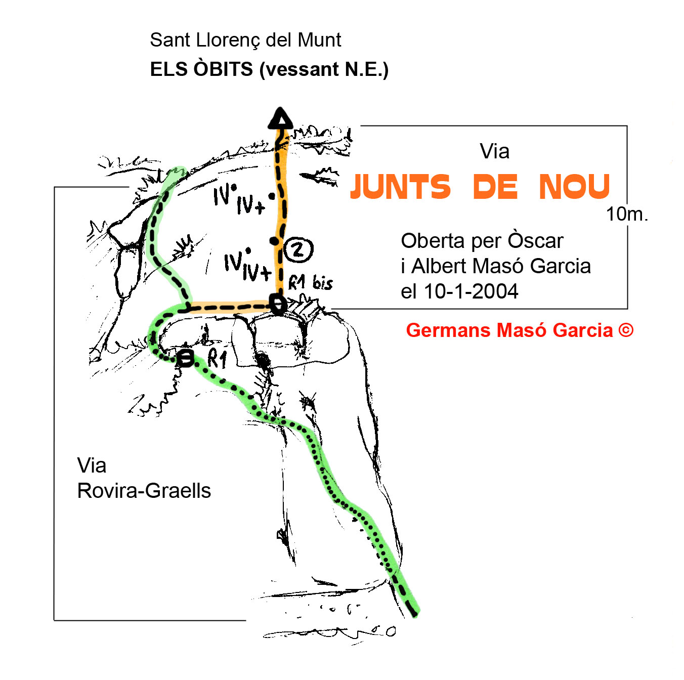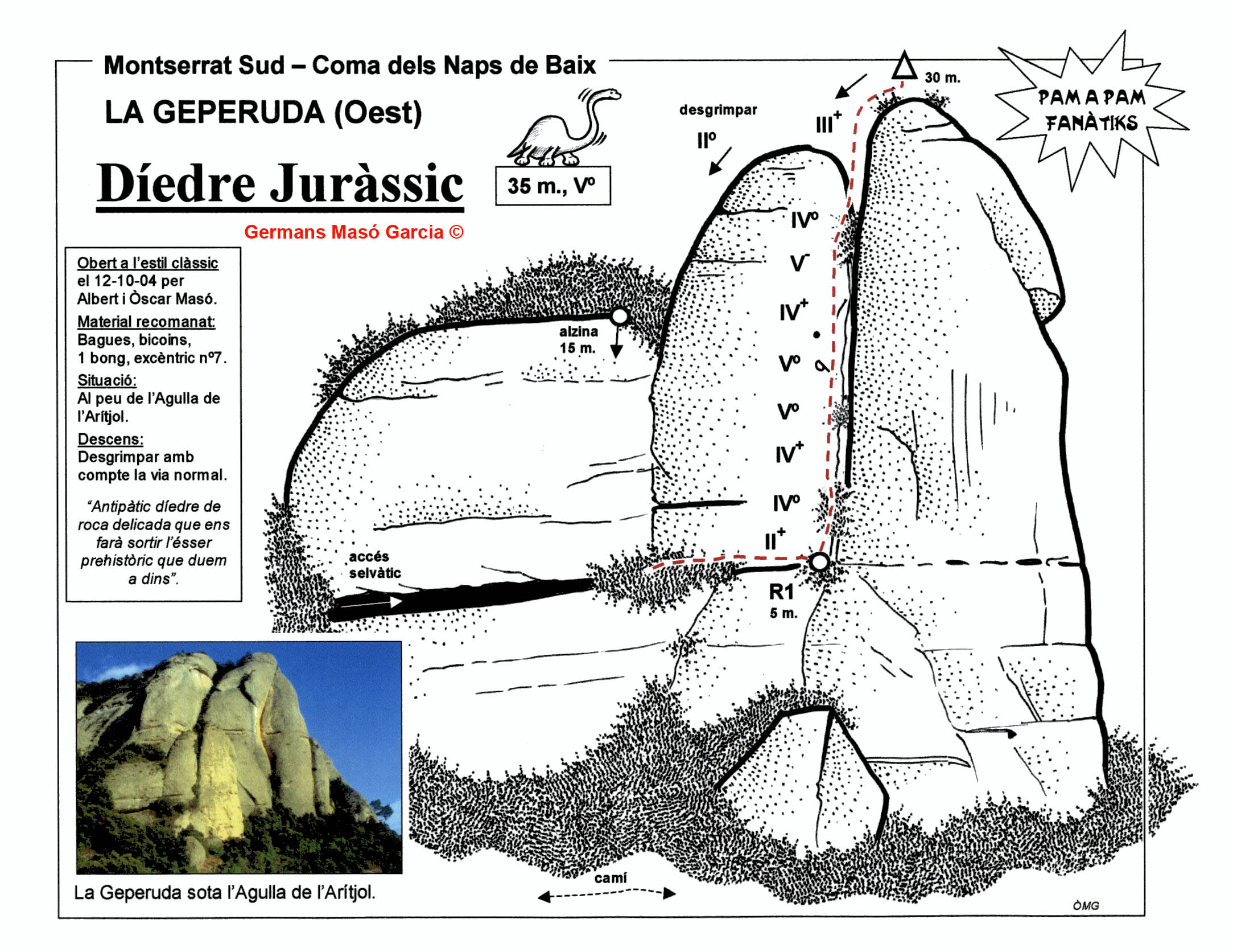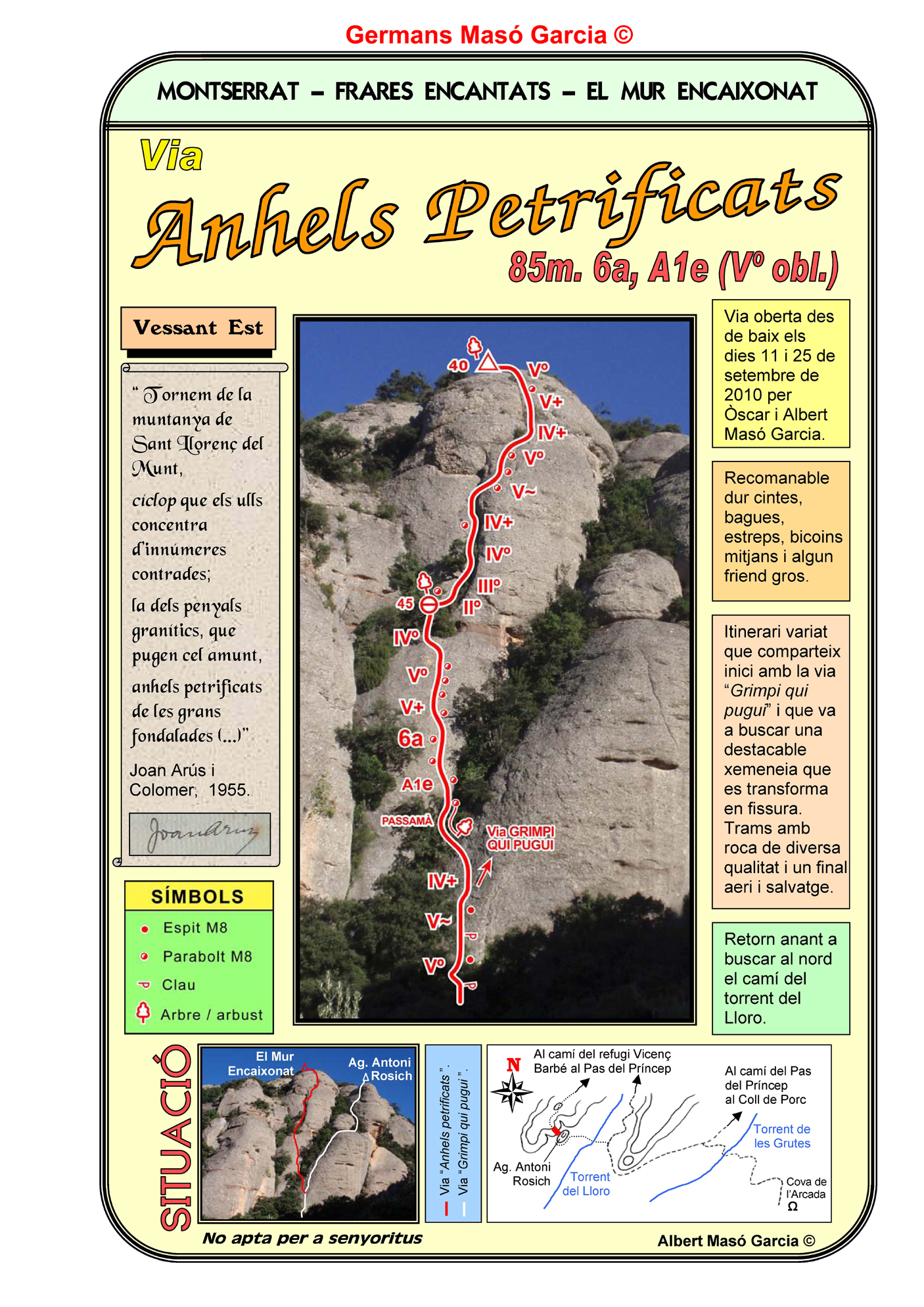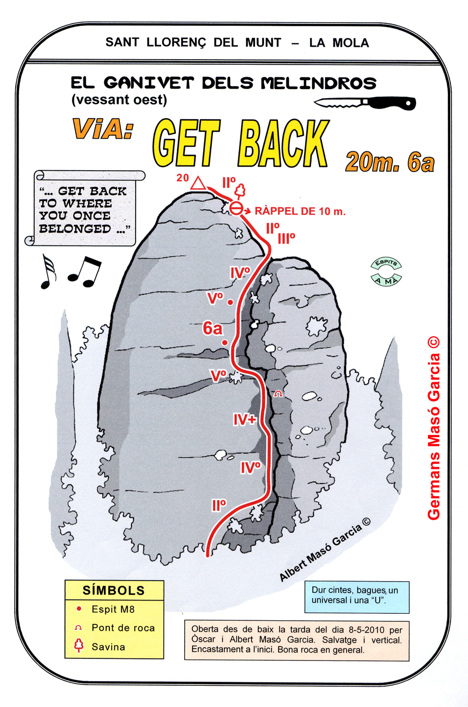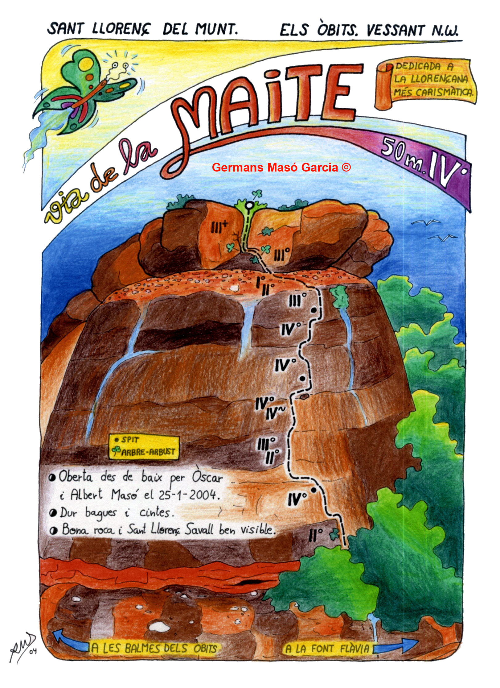 SEGURETAT: La pràctica de l’escalada és un esport que comporta risc. Tothom qui vulgui repetir alguna de les vies ressenyades en aquesta web és l’únic responsable de la seva pròpia seguretat i del conjunt de la cordada. En aquest sentit, els autors de les vies i les ressenyes declinen qualsevol responsabilitat.