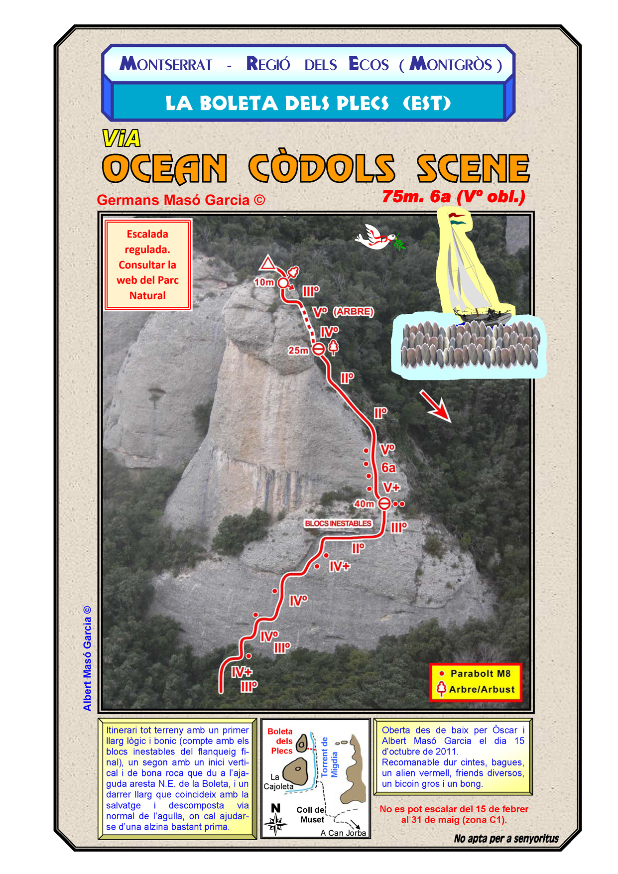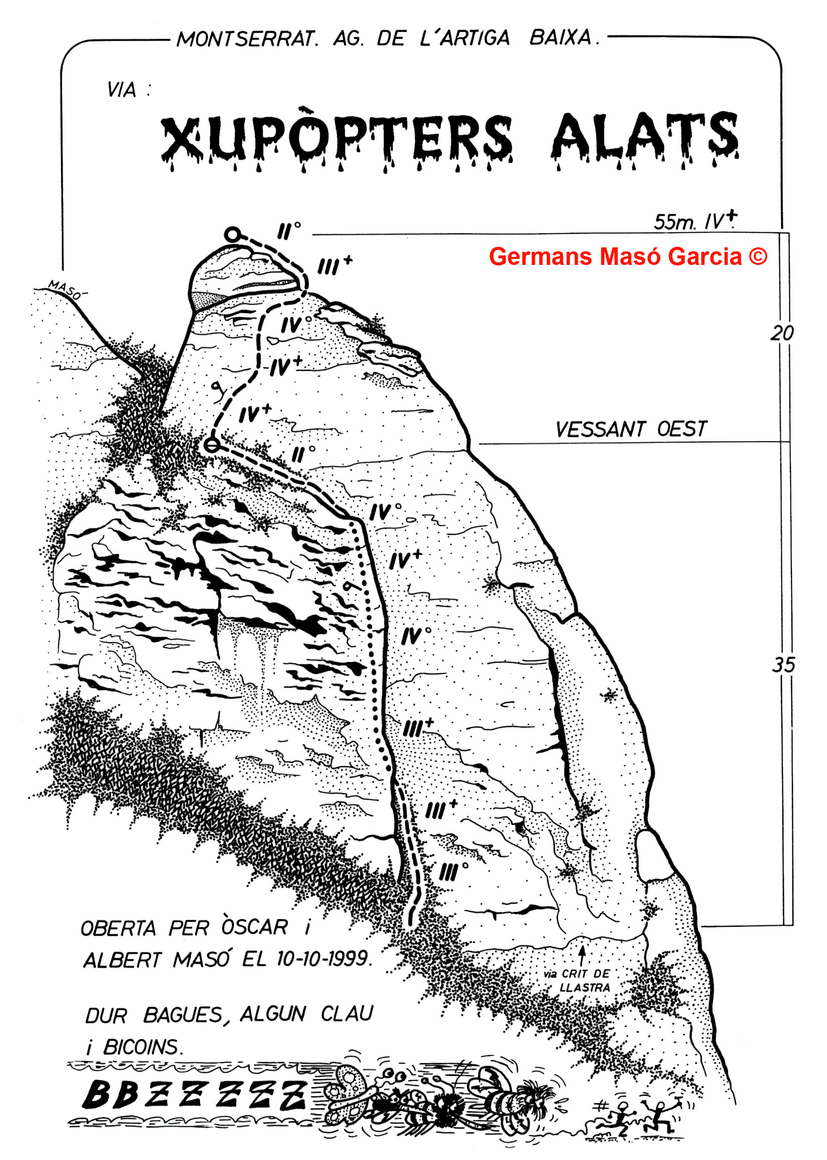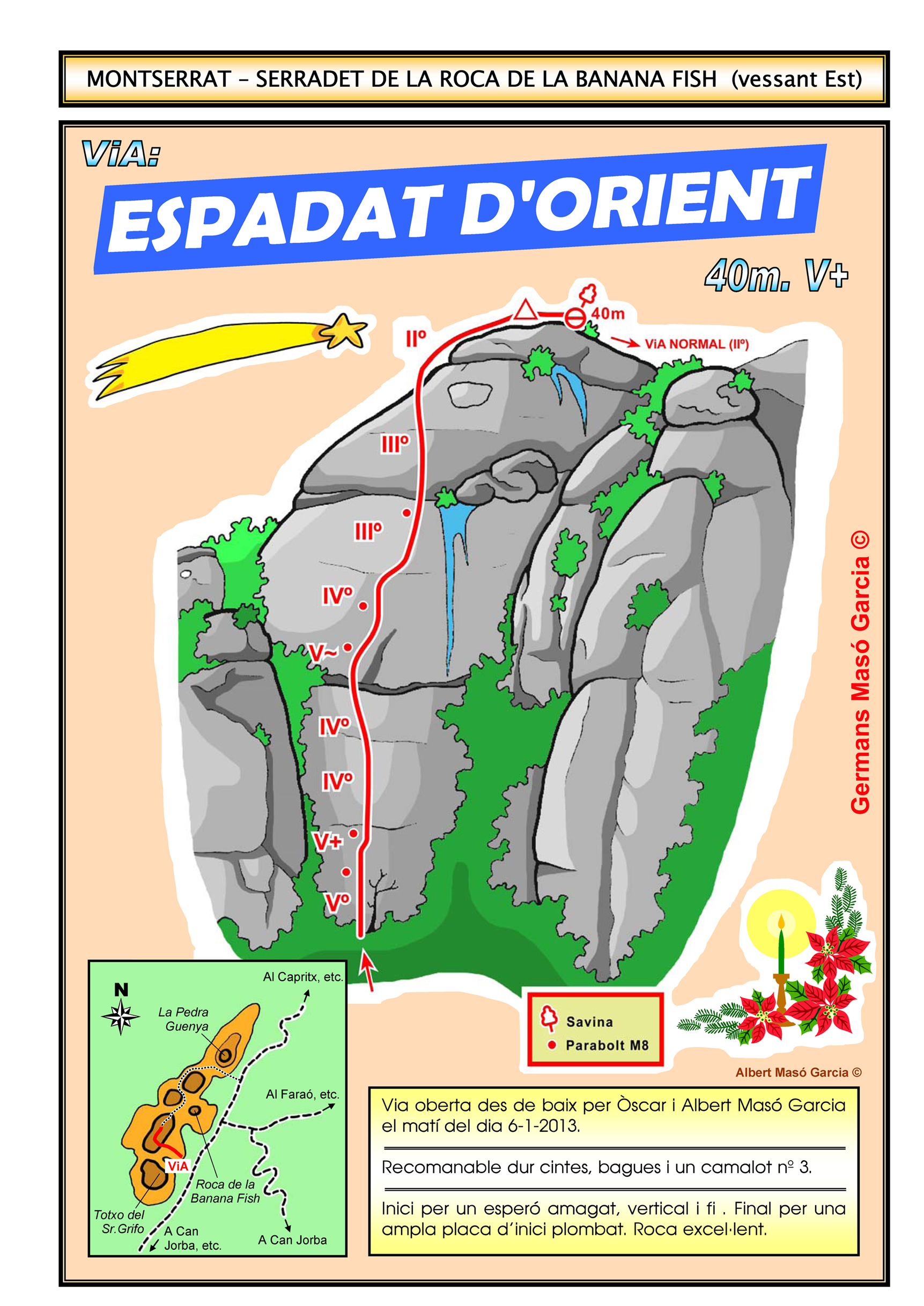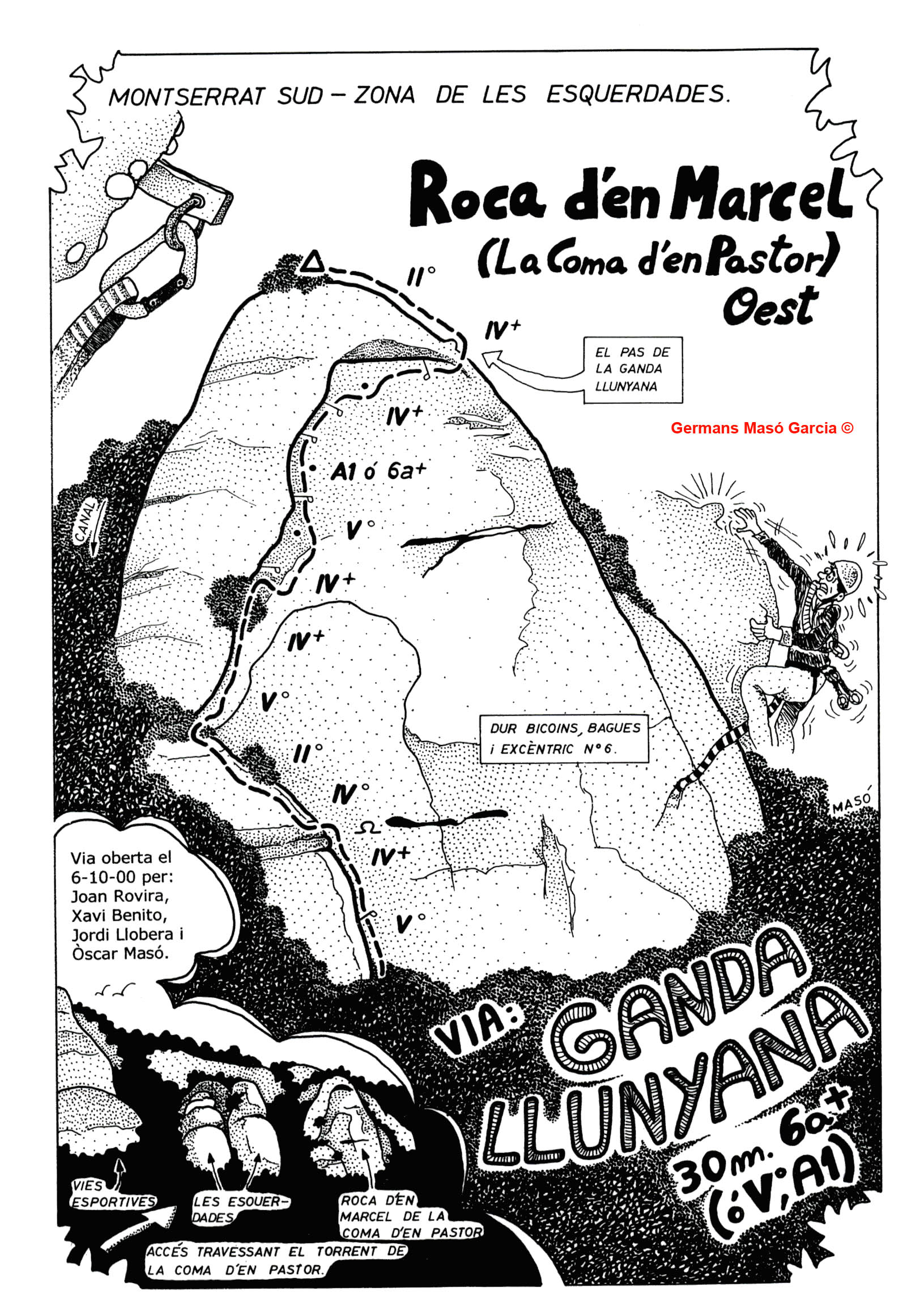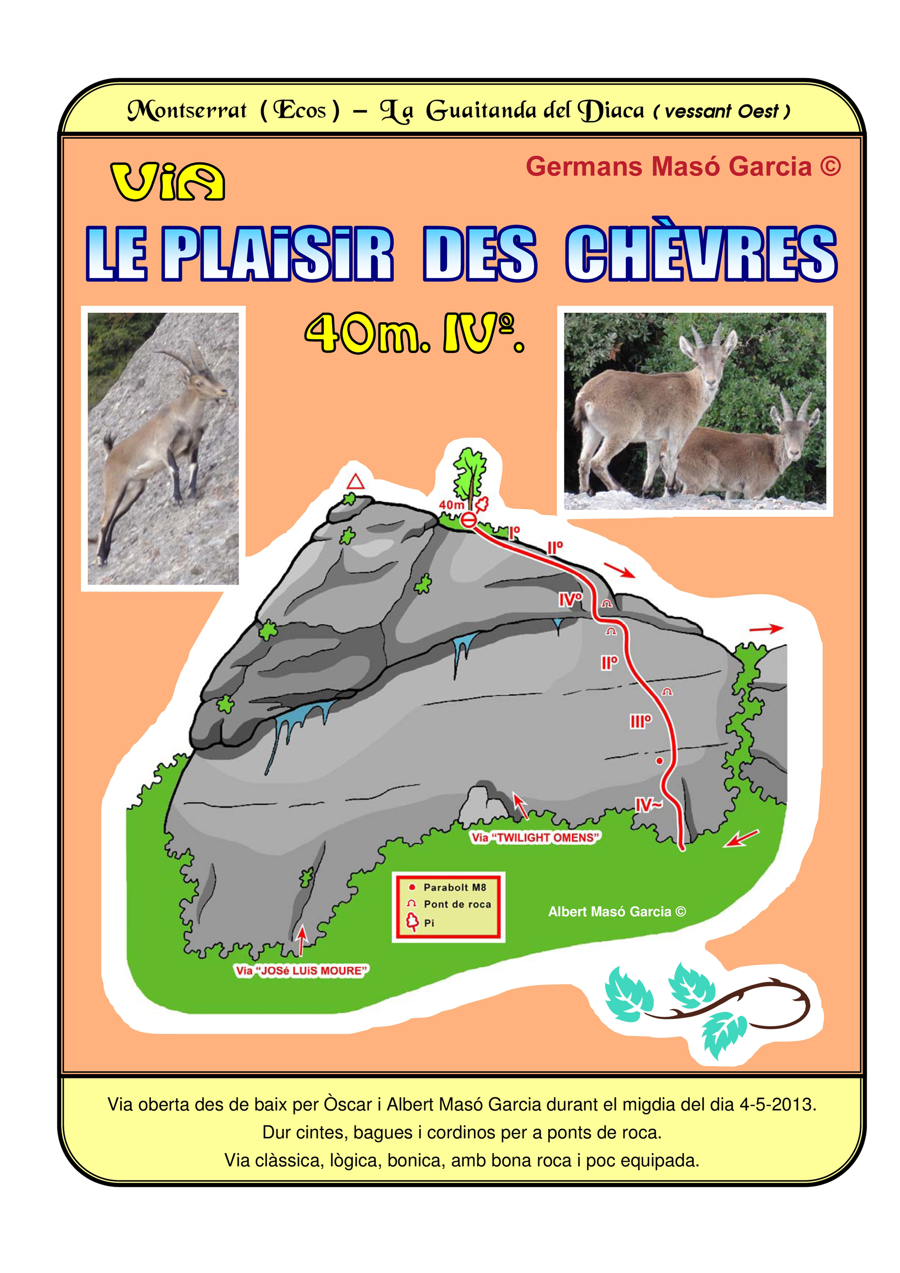 SEGURETAT: La pràctica de l’escalada és un esport que comporta risc. Tothom qui vulgui repetir alguna de les vies ressenyades en aquesta web és l’únic responsable de la seva pròpia seguretat i del conjunt de la cordada. En aquest sentit, els autors de les vies i les ressenyes declinen qualsevol responsabilitat.