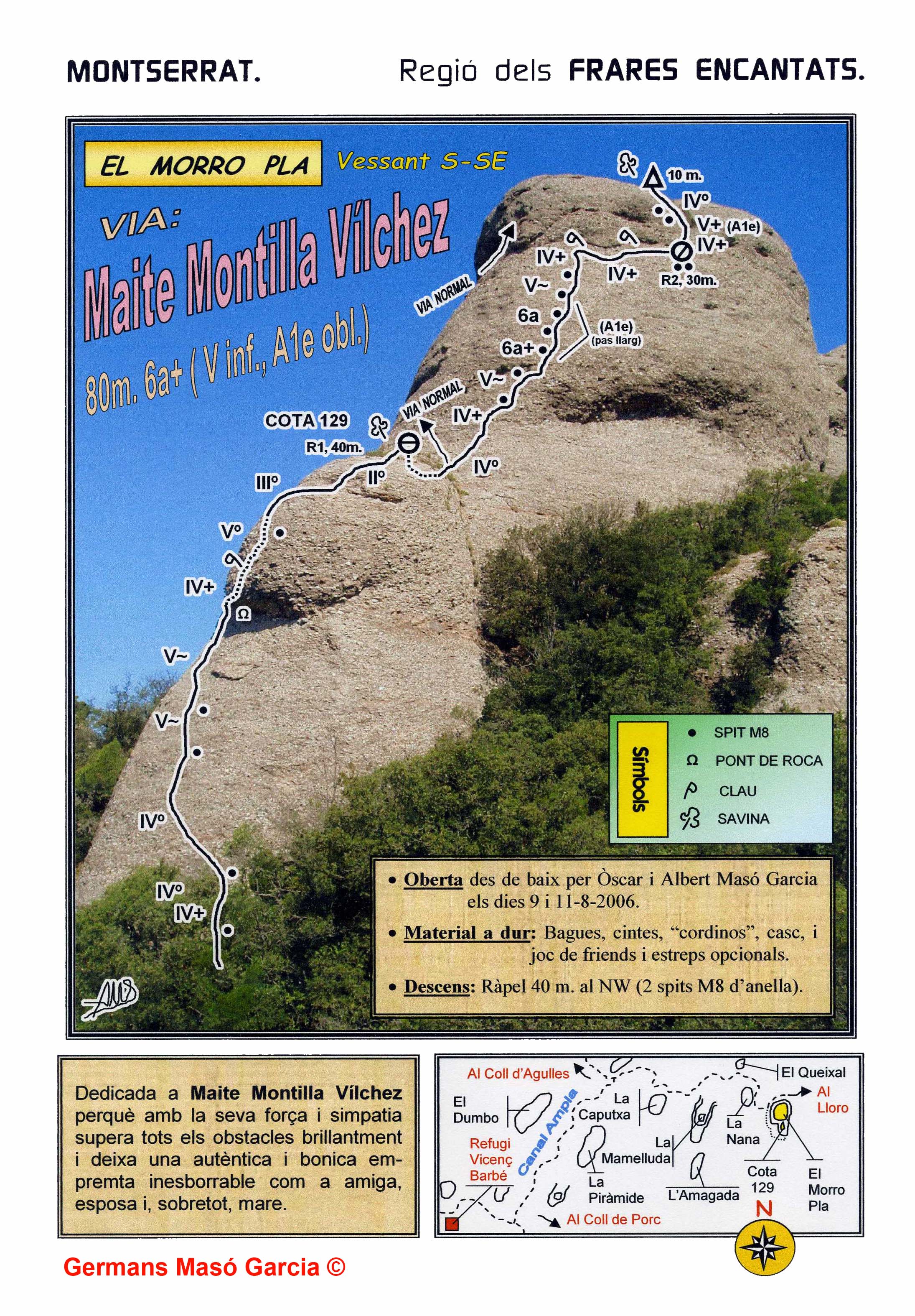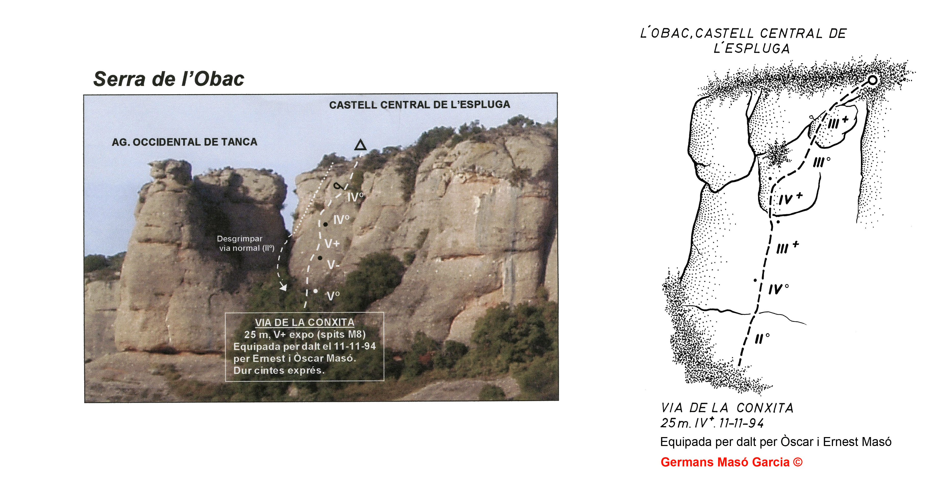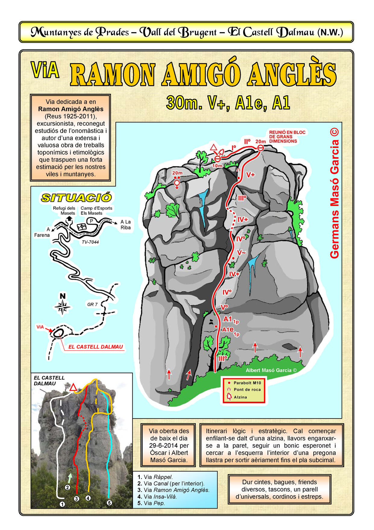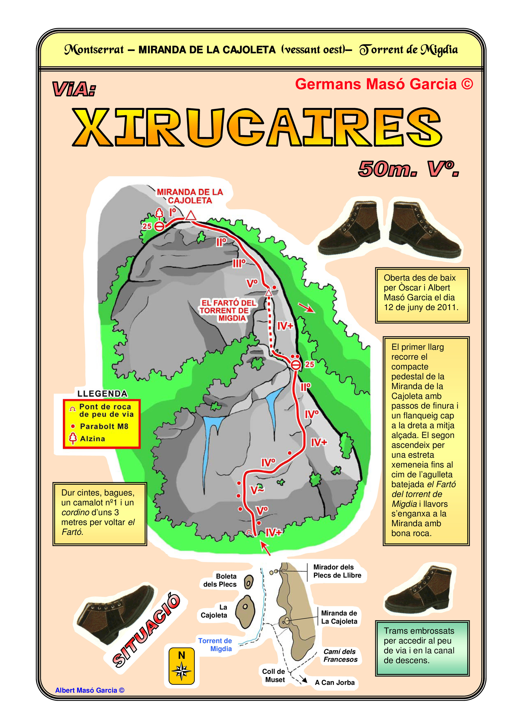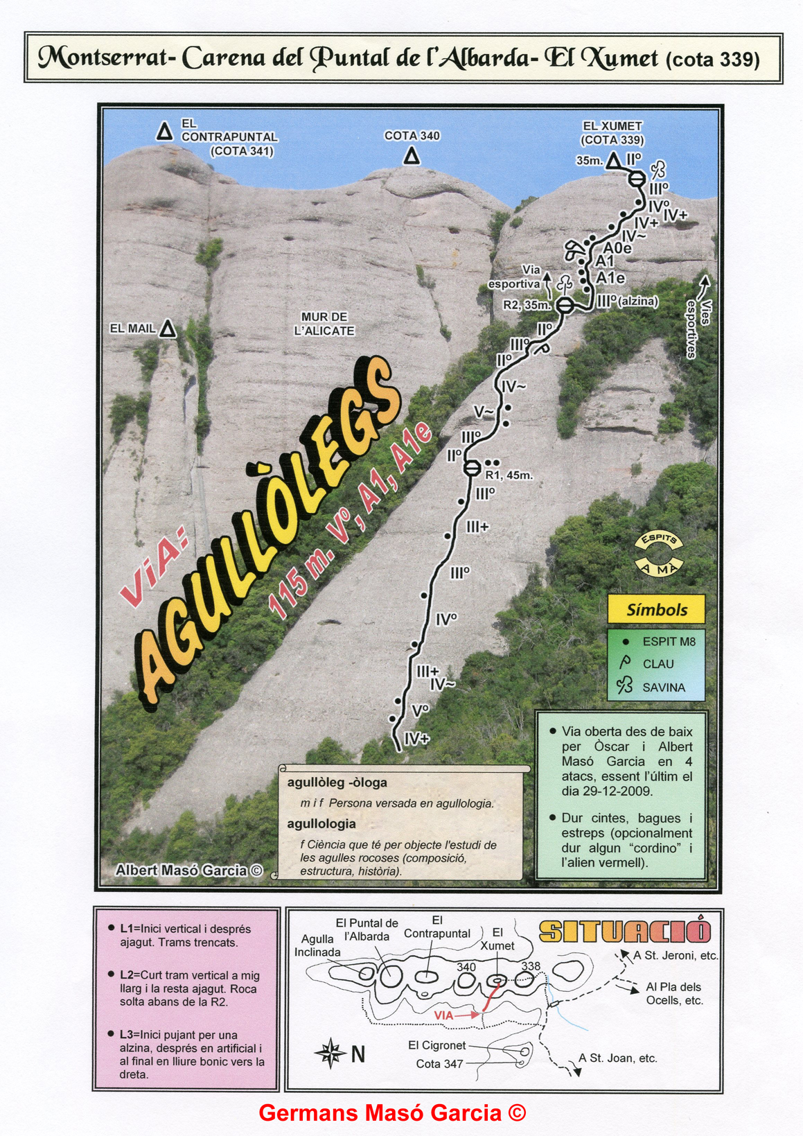 SEGURETAT: La pràctica de l’escalada és un esport que comporta risc. Tothom qui vulgui repetir alguna de les vies ressenyades en aquesta web és l’únic responsable de la seva pròpia seguretat i del conjunt de la cordada. En aquest sentit, els autors de les vies i les ressenyes declinen qualsevol responsabilitat.