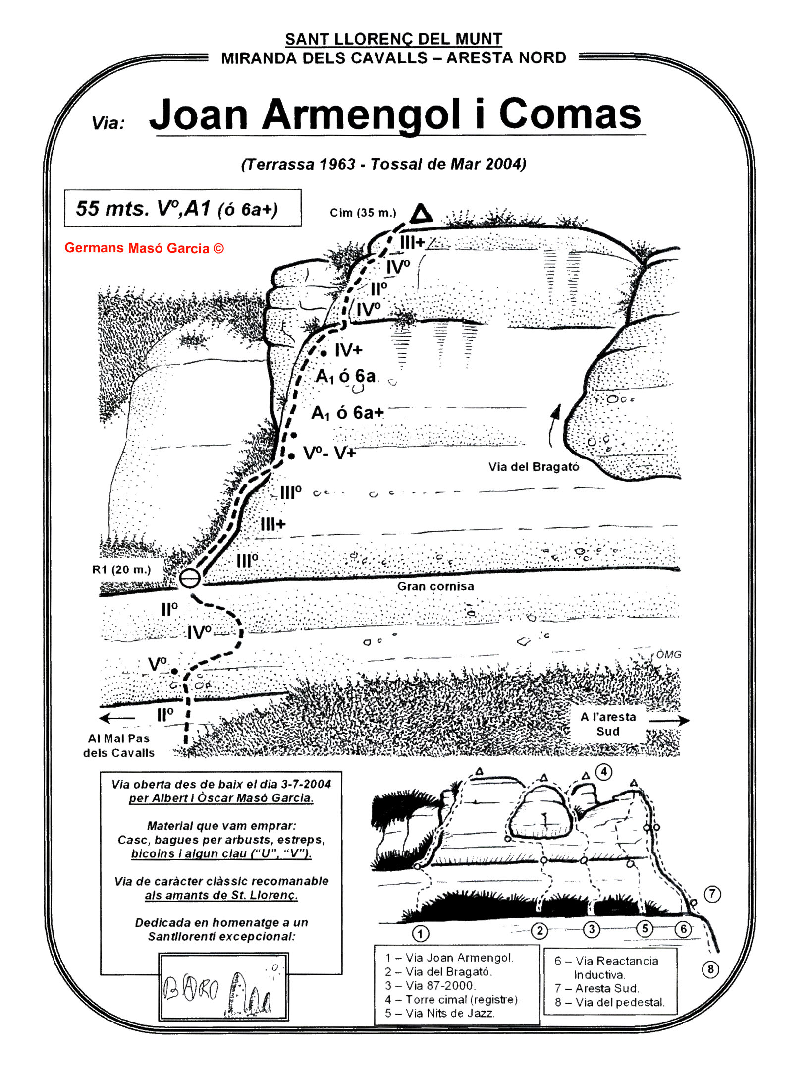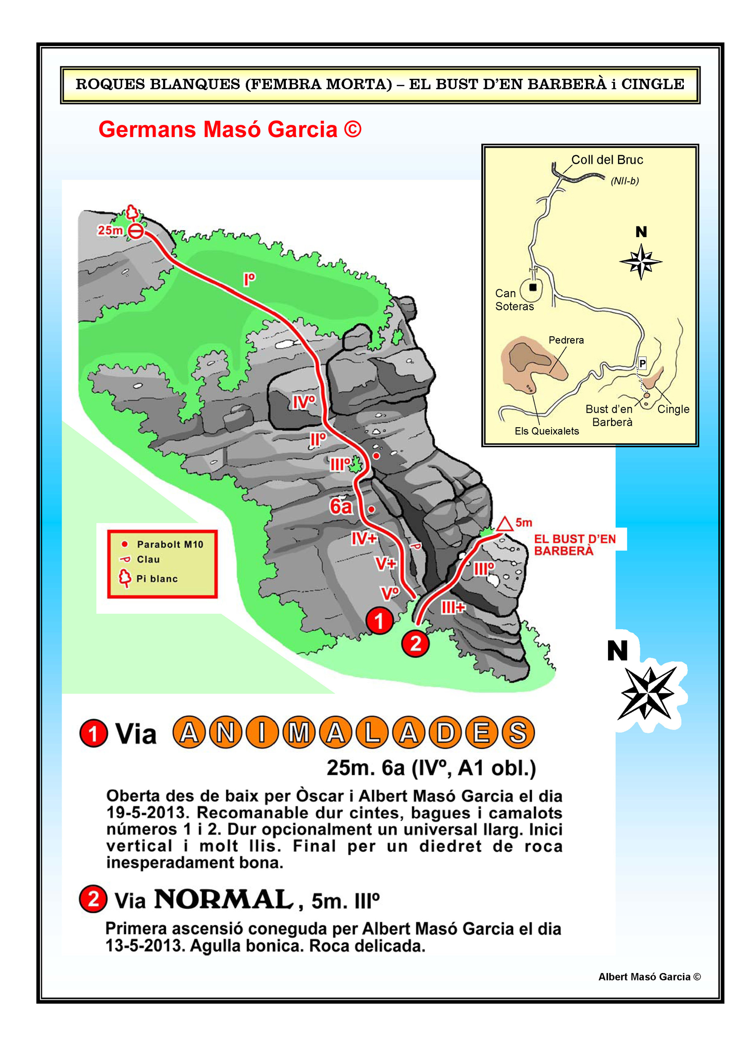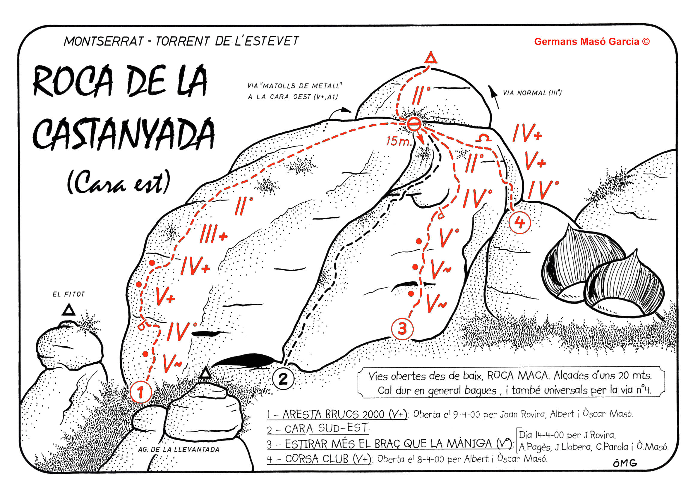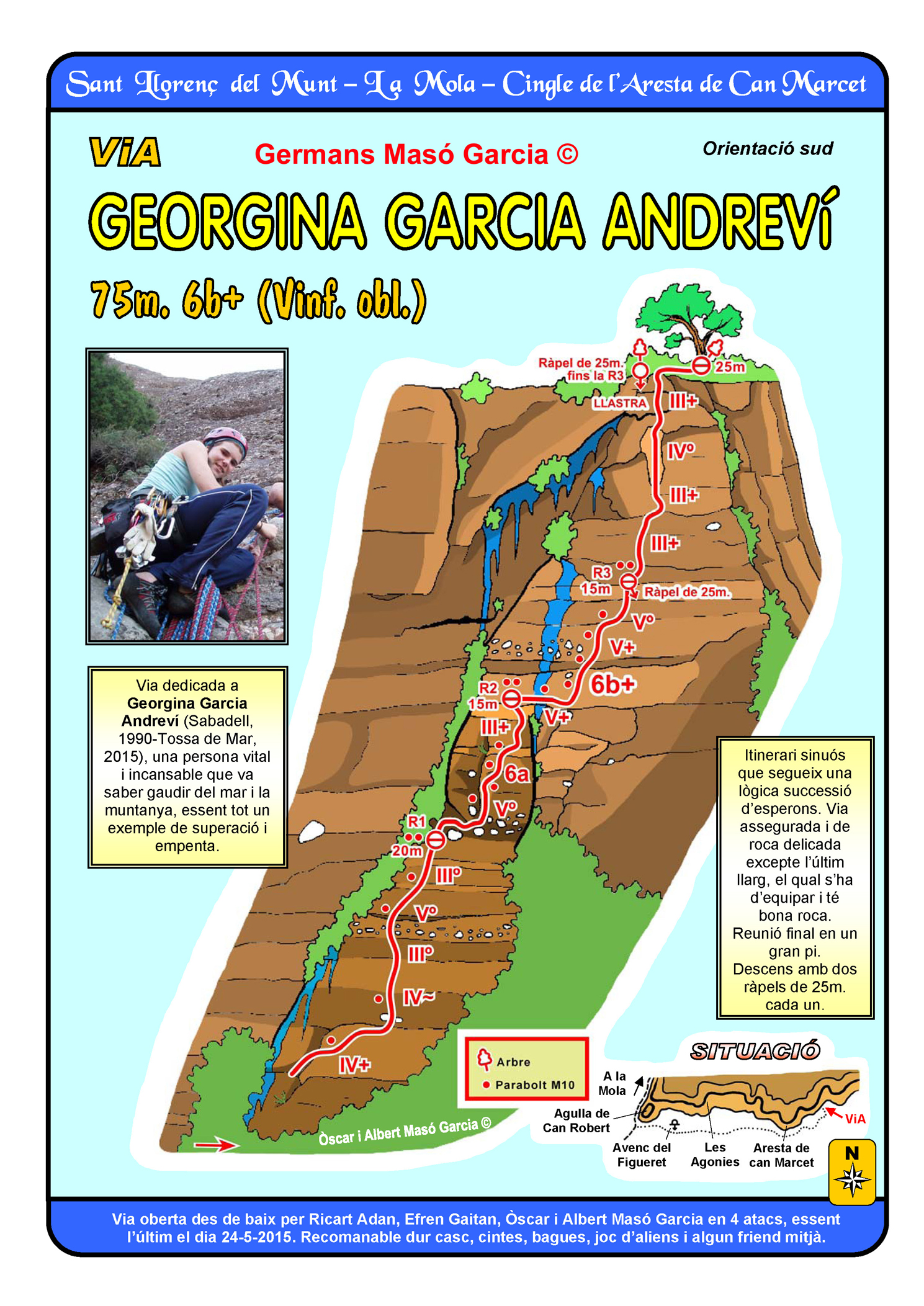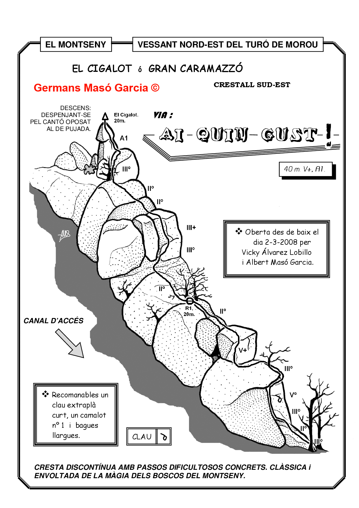 SEGURETAT: La pràctica de l’escalada és un esport que comporta risc. Tothom qui vulgui repetir alguna de les vies ressenyades en aquesta web és l’únic responsable de la seva pròpia seguretat i del conjunt de la cordada. En aquest sentit, els autors de les vies i les ressenyes declinen qualsevol responsabilitat.