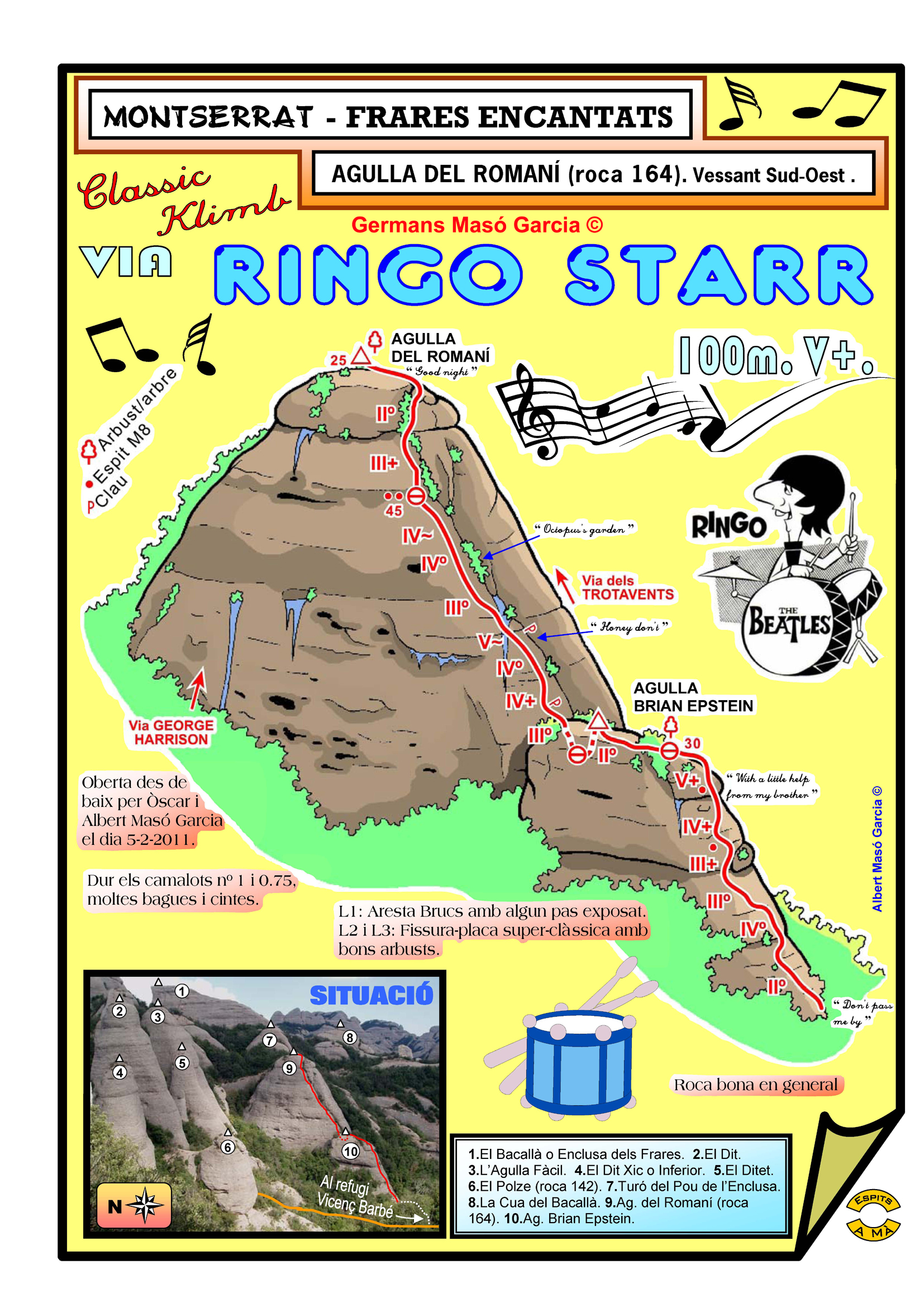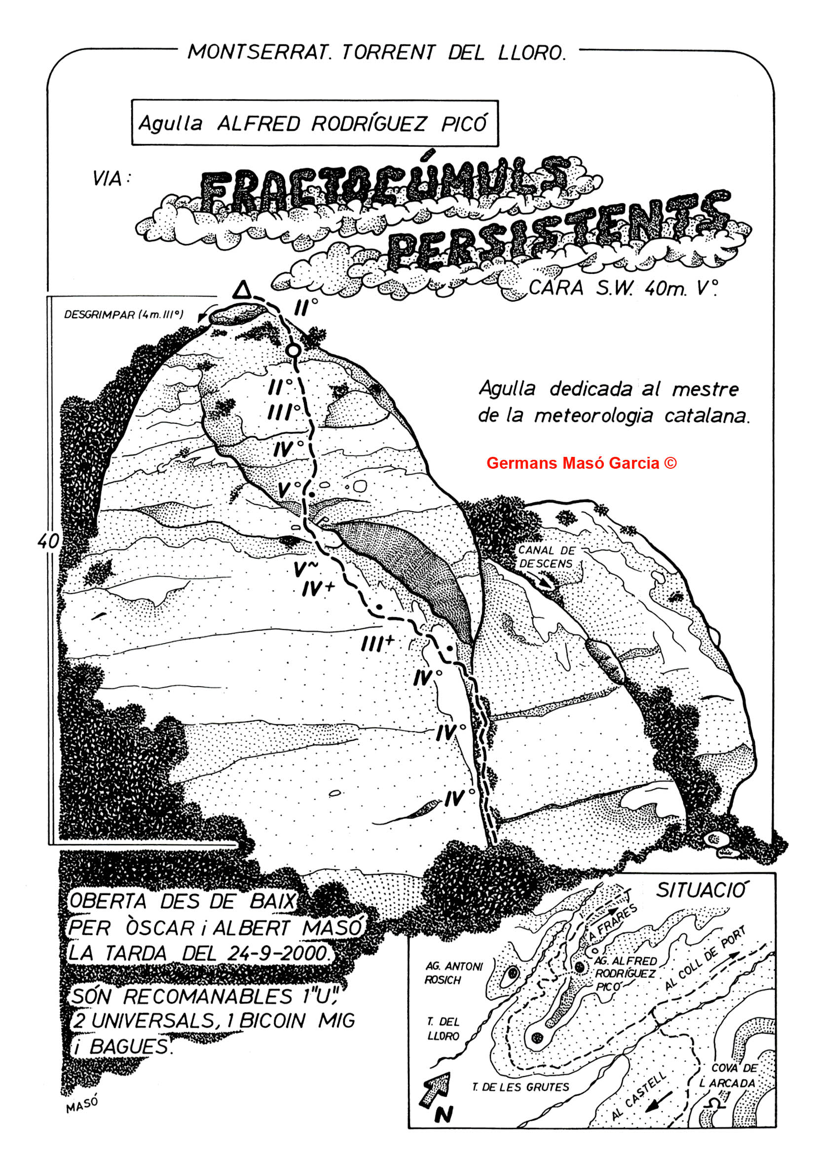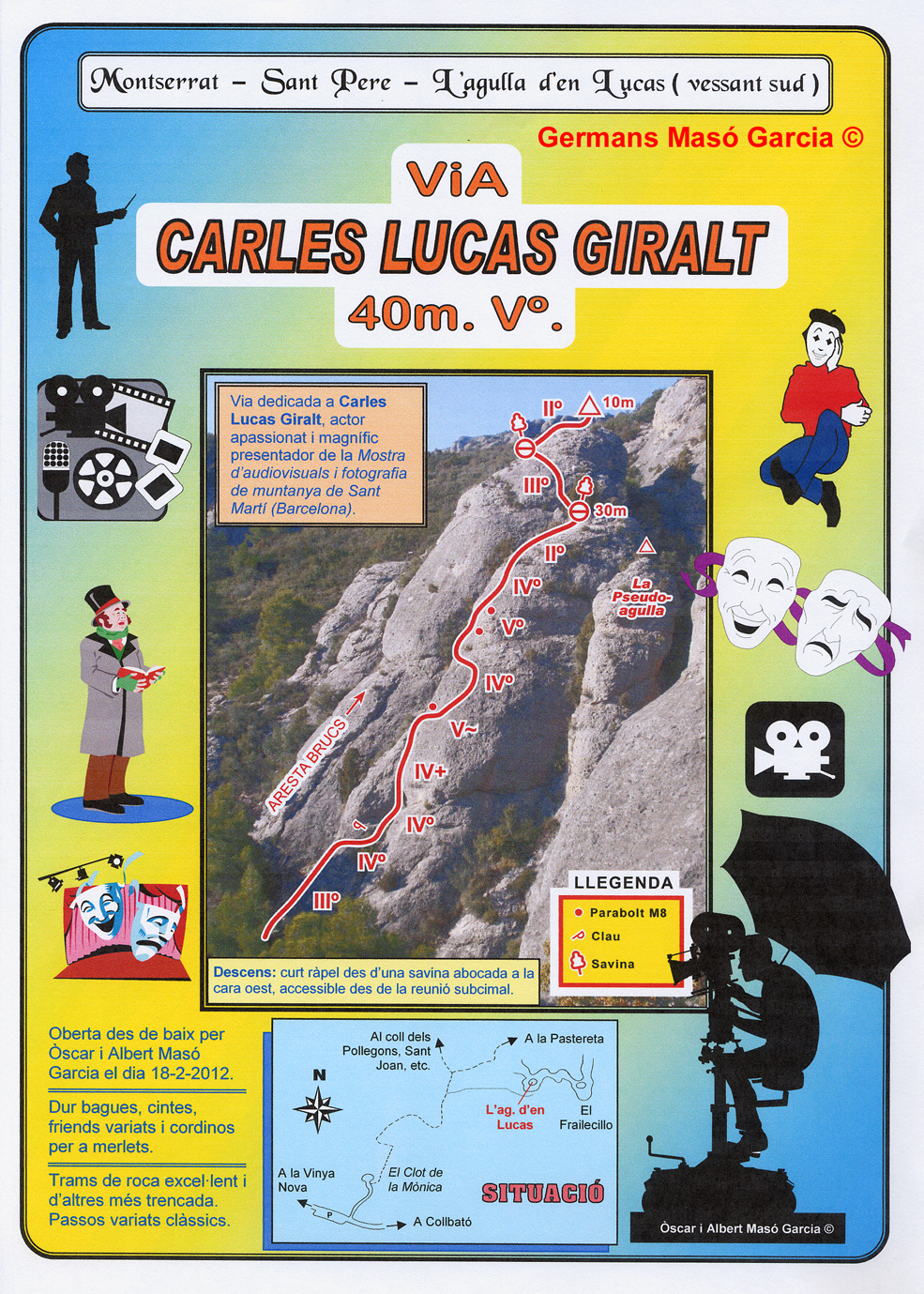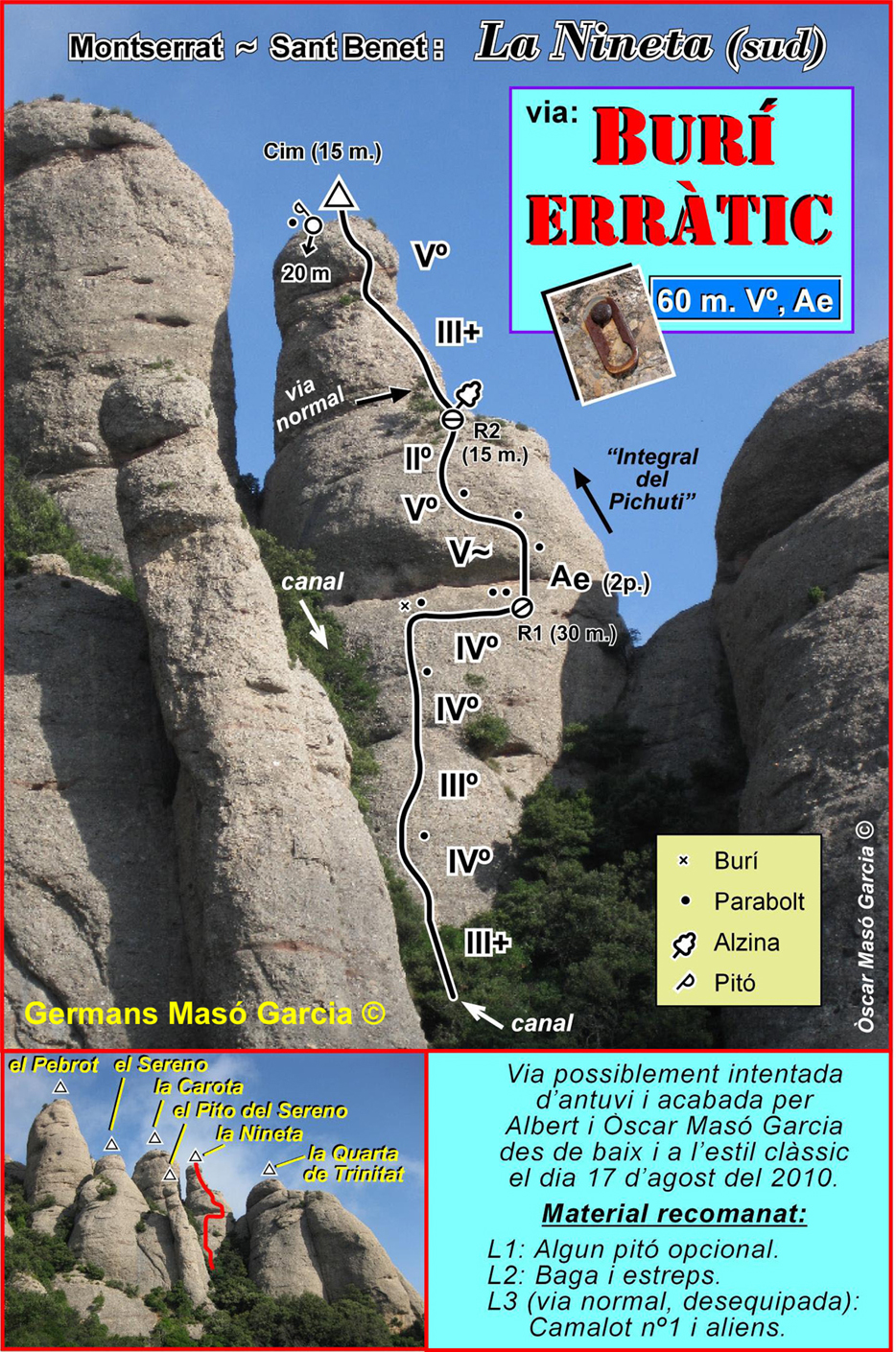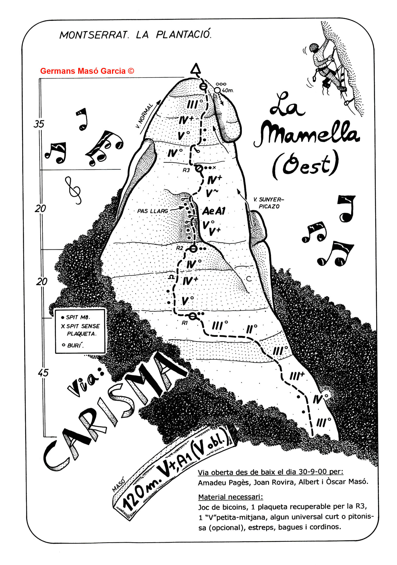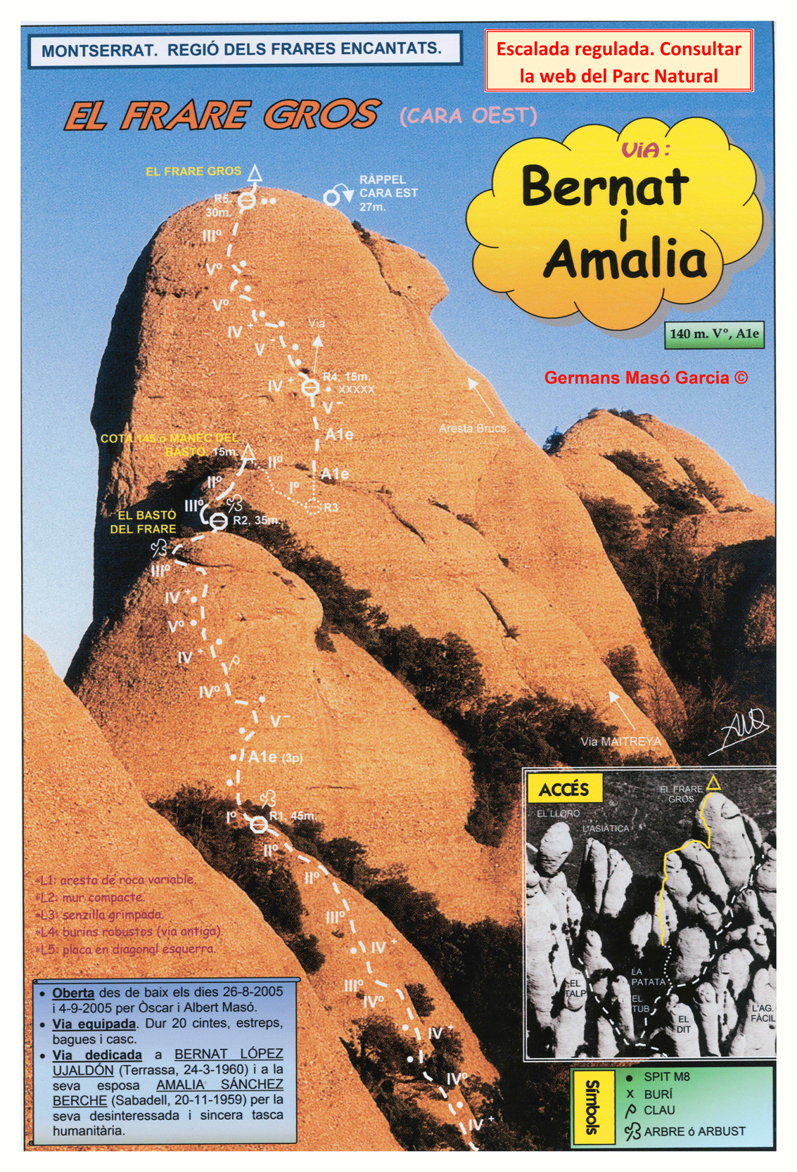 SEGURETAT: La pràctica de l’escalada és un esport que comporta risc. Tothom qui vulgui repetir alguna de les vies ressenyades en aquesta web és l’únic responsable de la seva pròpia seguretat i del conjunt de la cordada. En aquest sentit, els autors de les vies i les ressenyes declinen qualsevol responsabilitat.