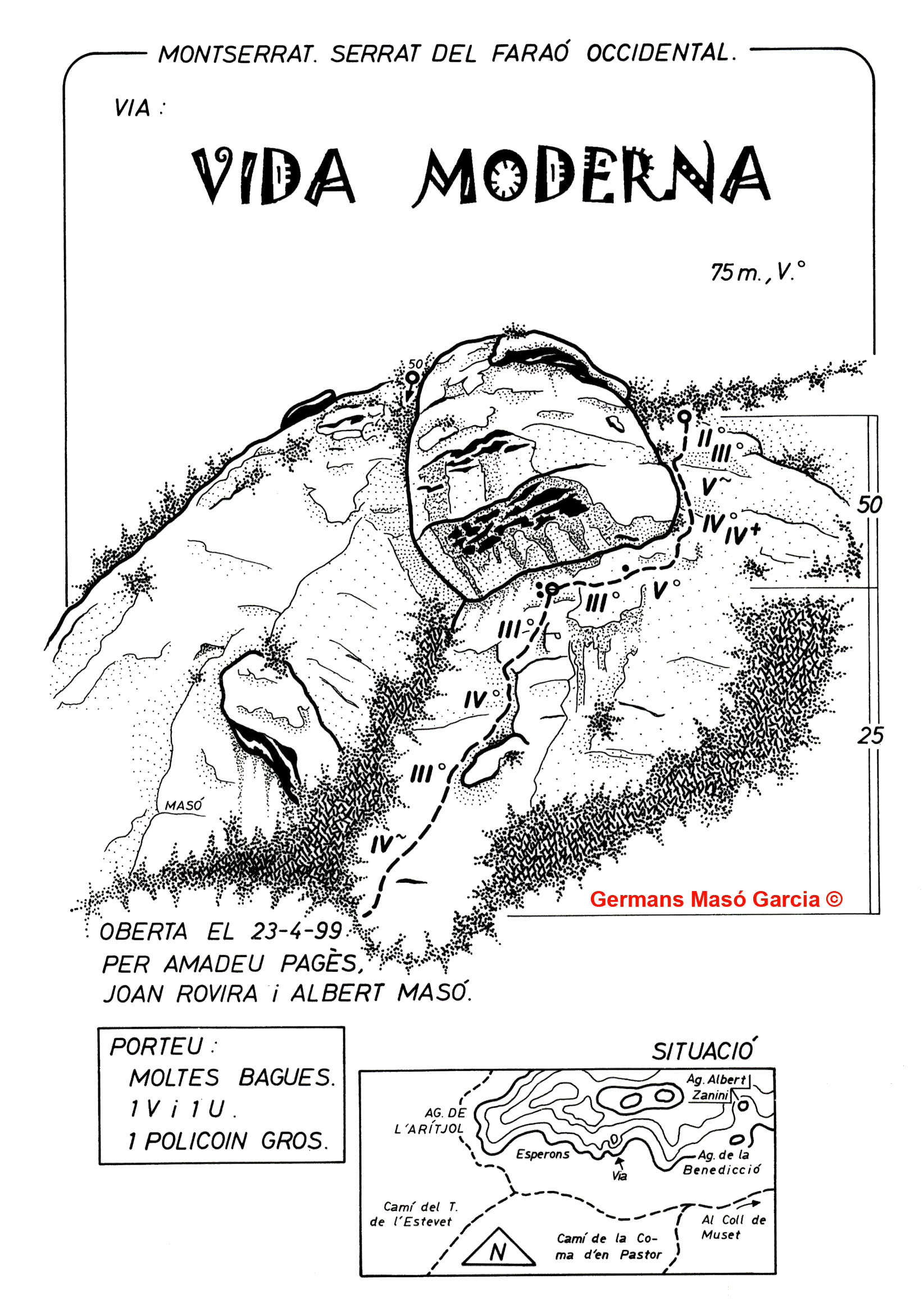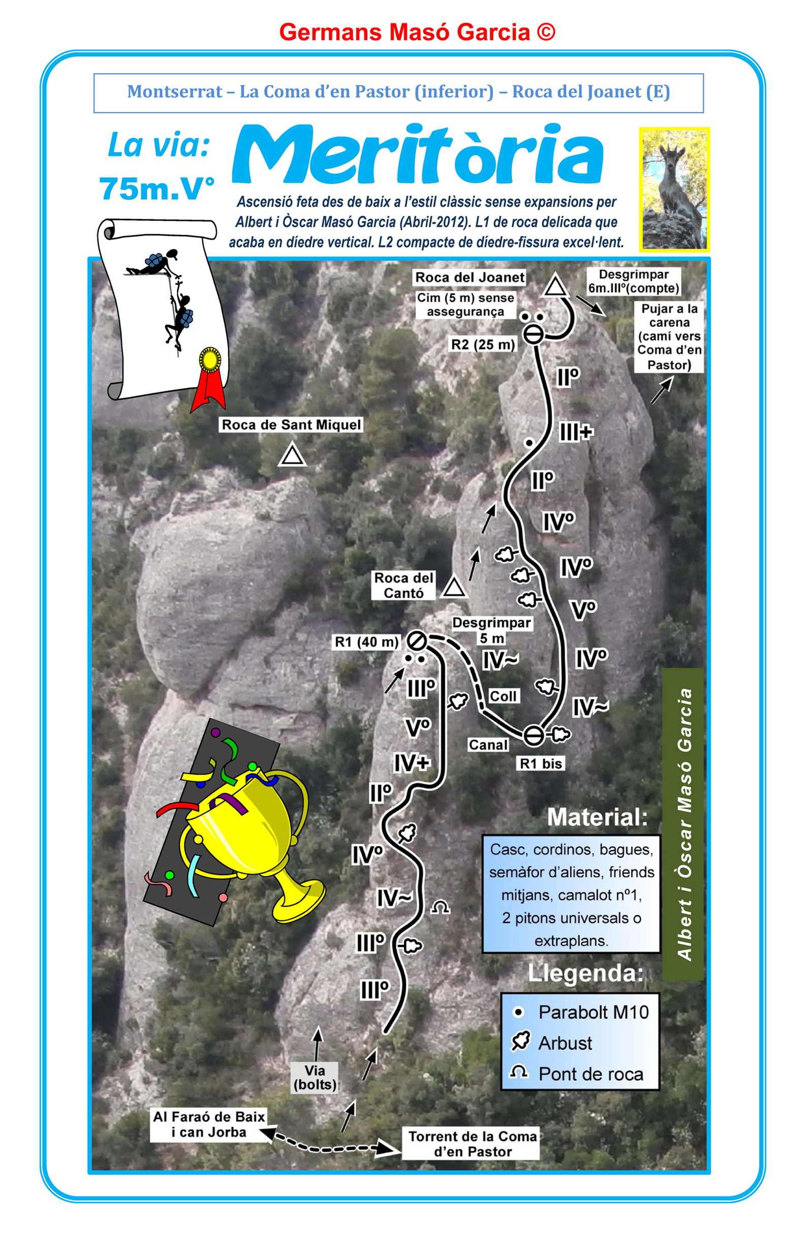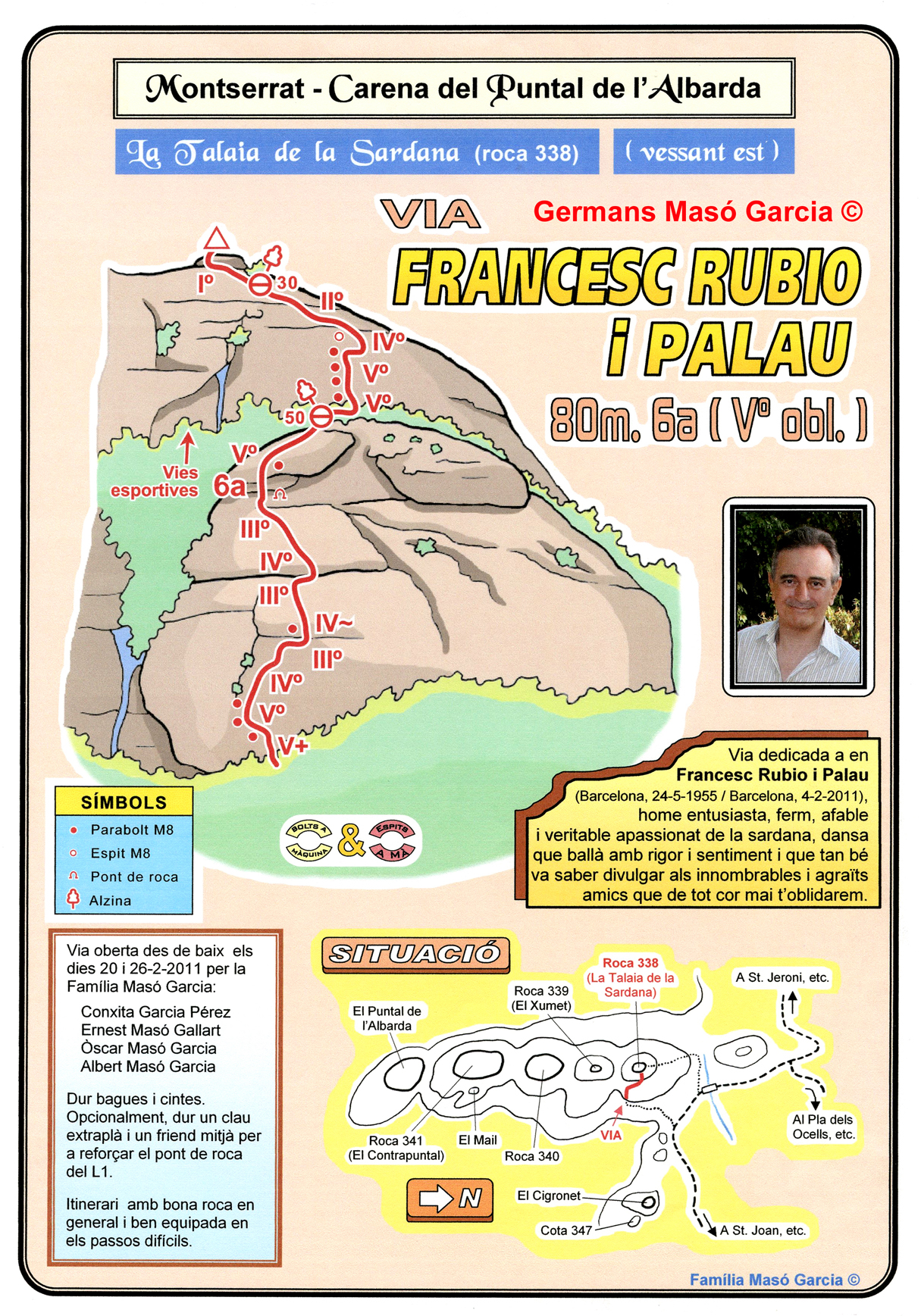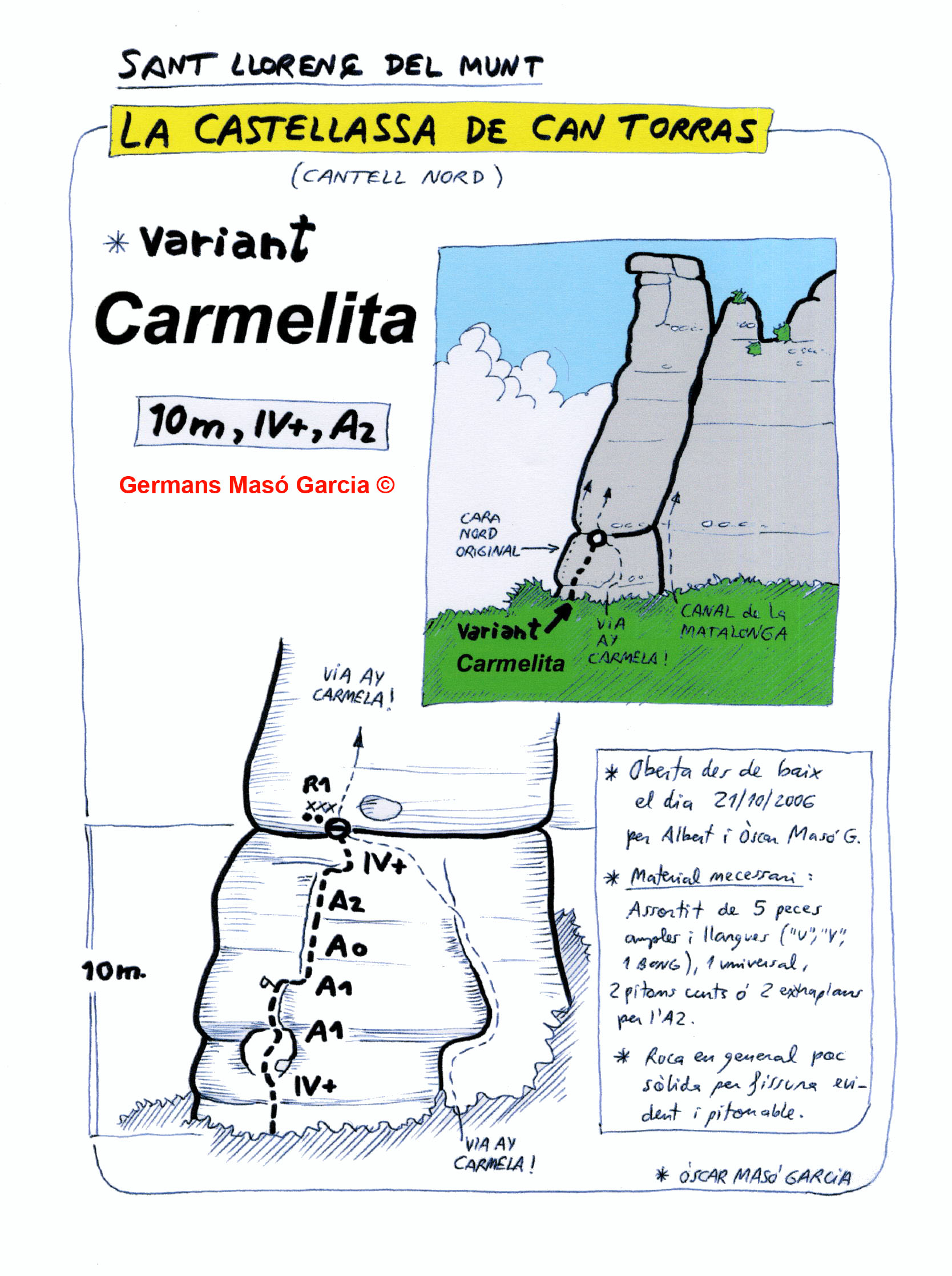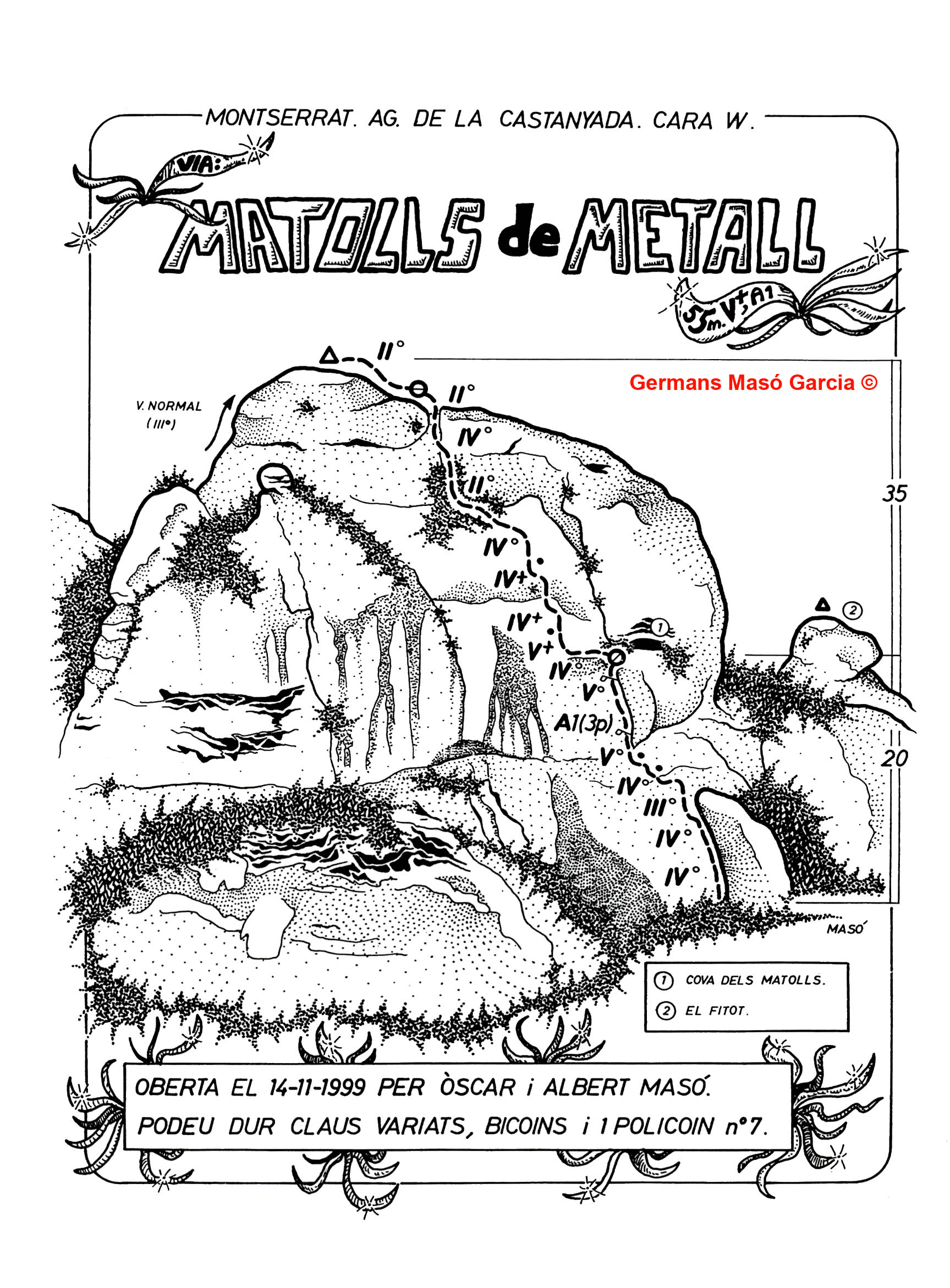 SEGURETAT: La pràctica de l’escalada és un esport que comporta risc. Tothom qui vulgui repetir alguna de les vies ressenyades en aquesta web és l’únic responsable de la seva pròpia seguretat i del conjunt de la cordada. En aquest sentit, els autors de les vies i les ressenyes declinen qualsevol responsabilitat.