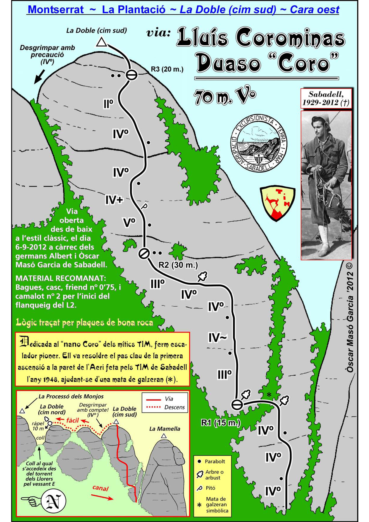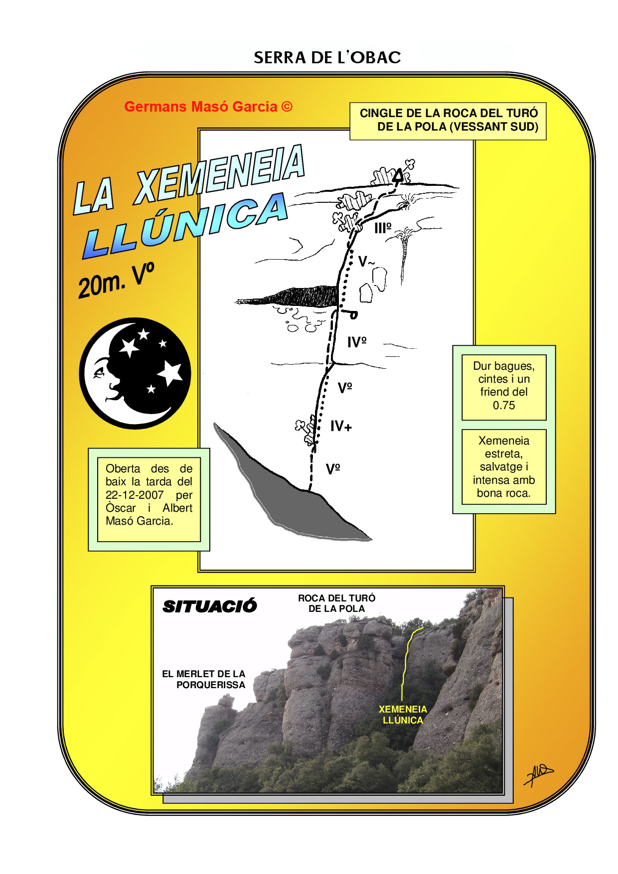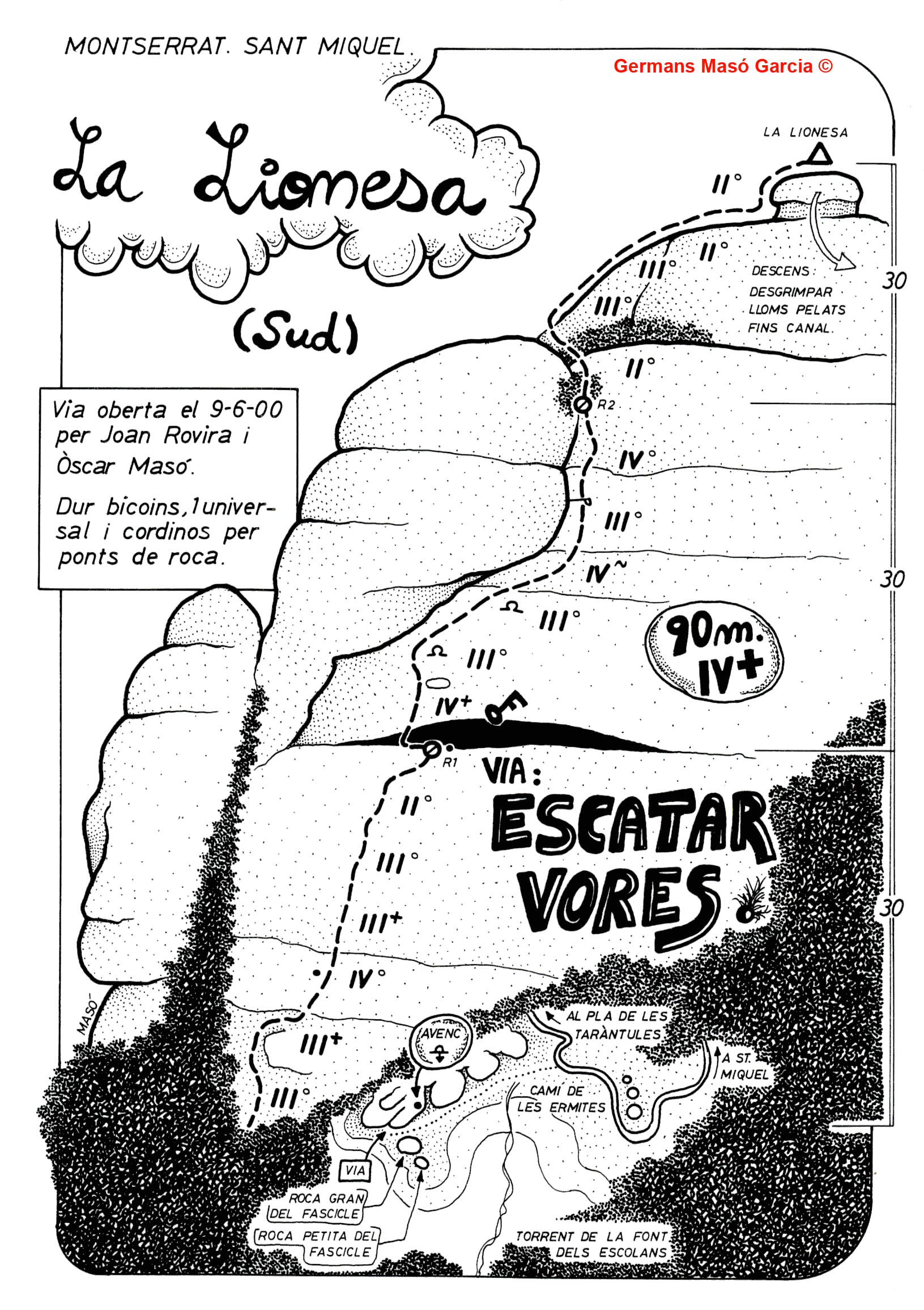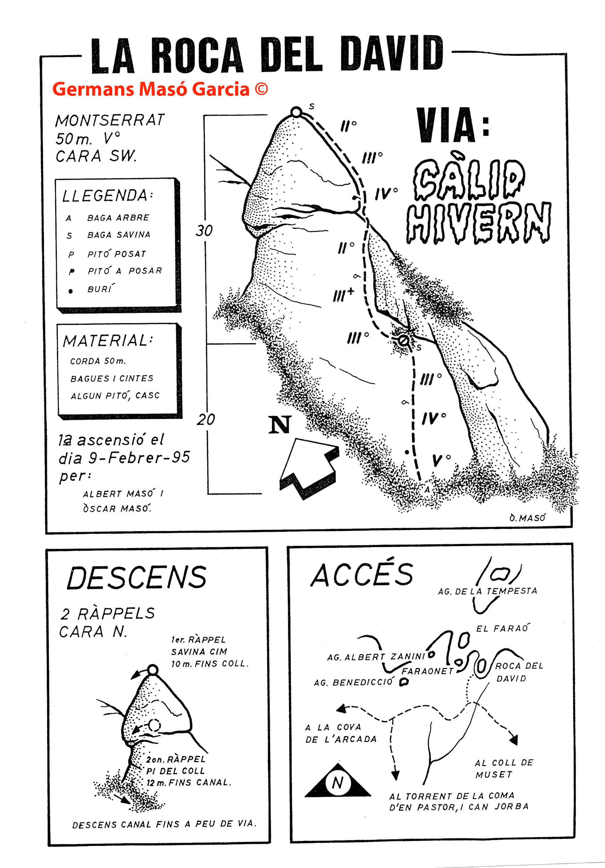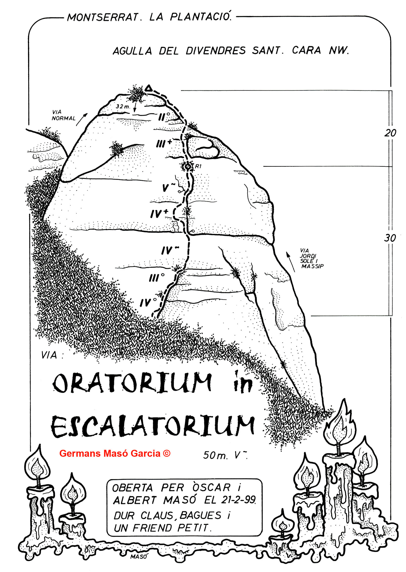SEGURETAT: La pràctica de l’escalada és un esport que comporta risc. Tothom qui vulgui repetir alguna de les vies ressenyades en aquesta web és l’únic responsable de la seva pròpia seguretat i del conjunt de la cordada. En aquest sentit, els autors de les vies i les ressenyes declinen qualsevol responsabilitat.