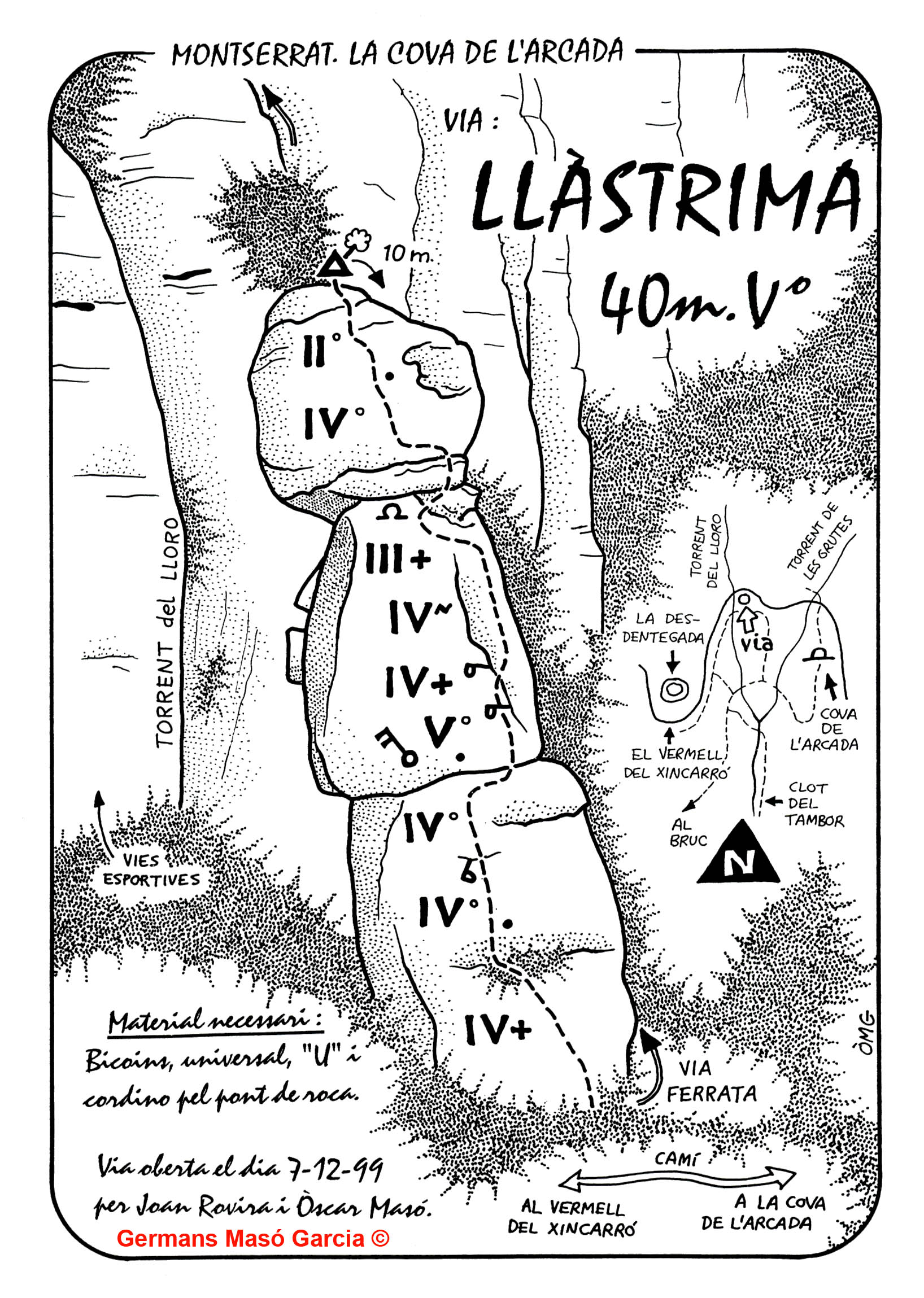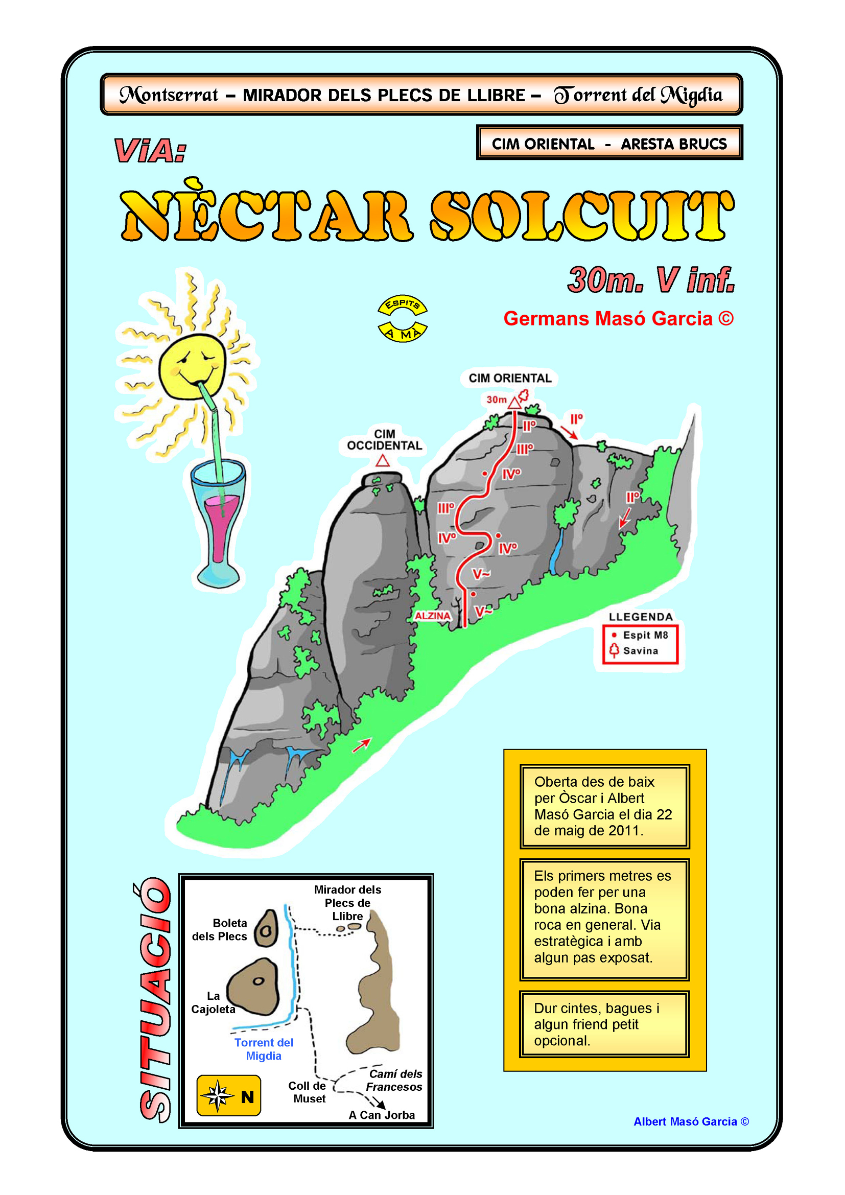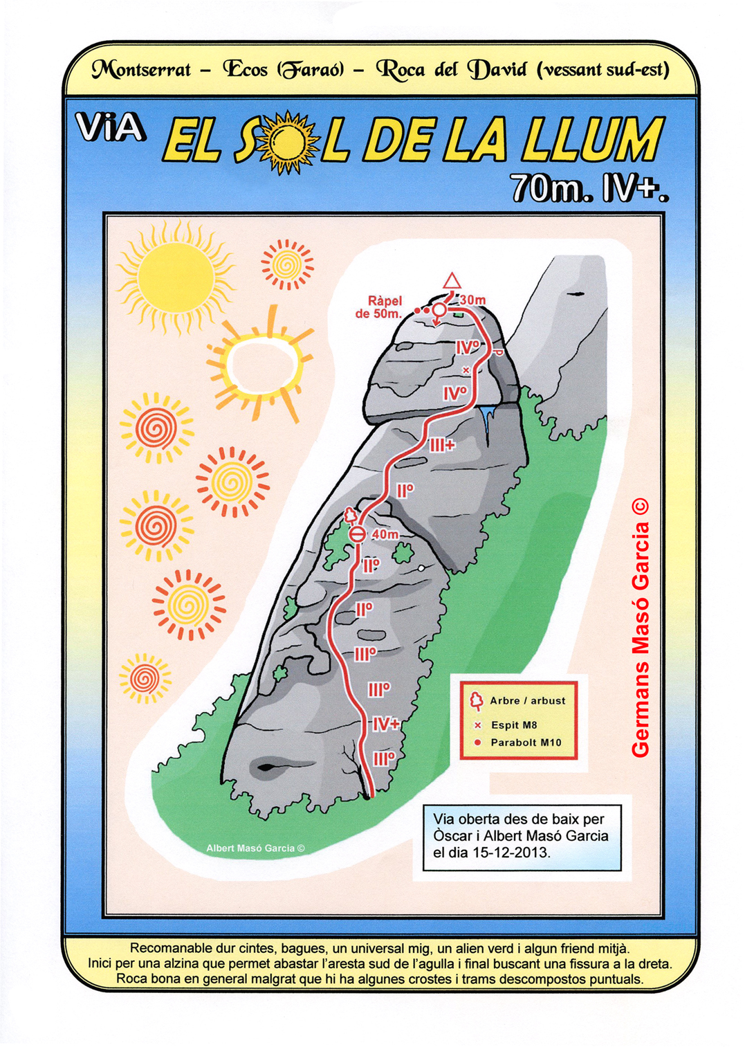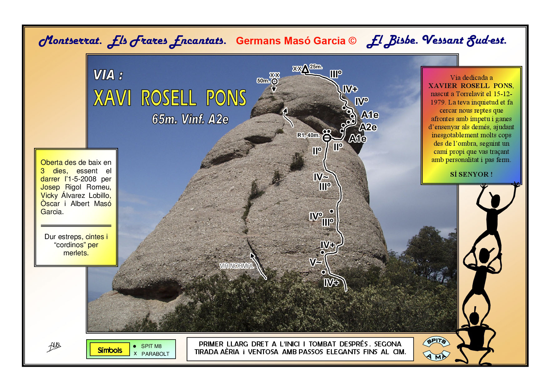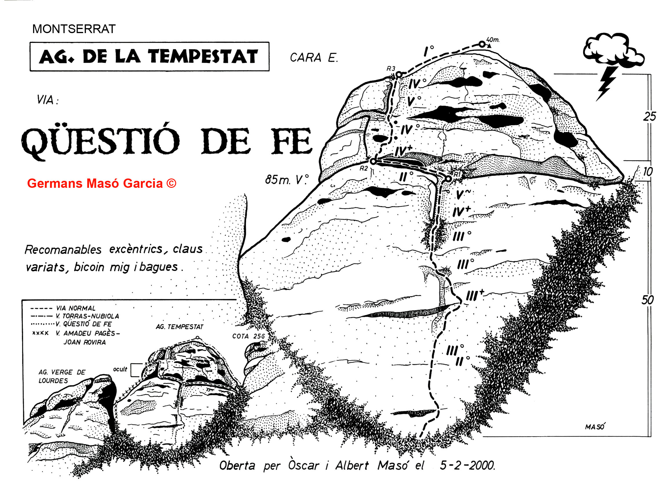 SEGURETAT: La pràctica de l’escalada és un esport que comporta risc. Tothom qui vulgui repetir alguna de les vies ressenyades en aquesta web és l’únic responsable de la seva pròpia seguretat i del conjunt de la cordada. En aquest sentit, els autors de les vies i les ressenyes declinen qualsevol responsabilitat.
