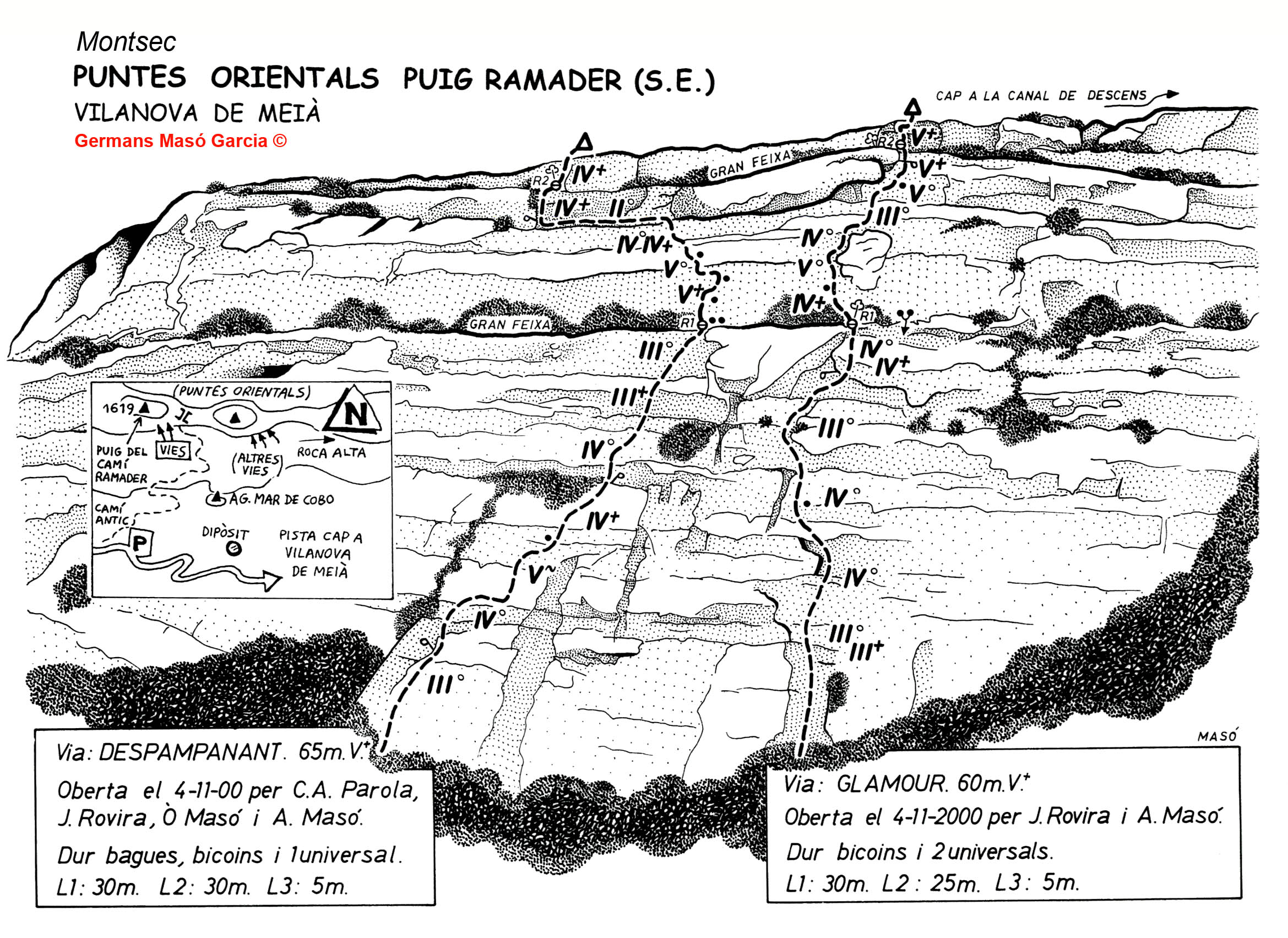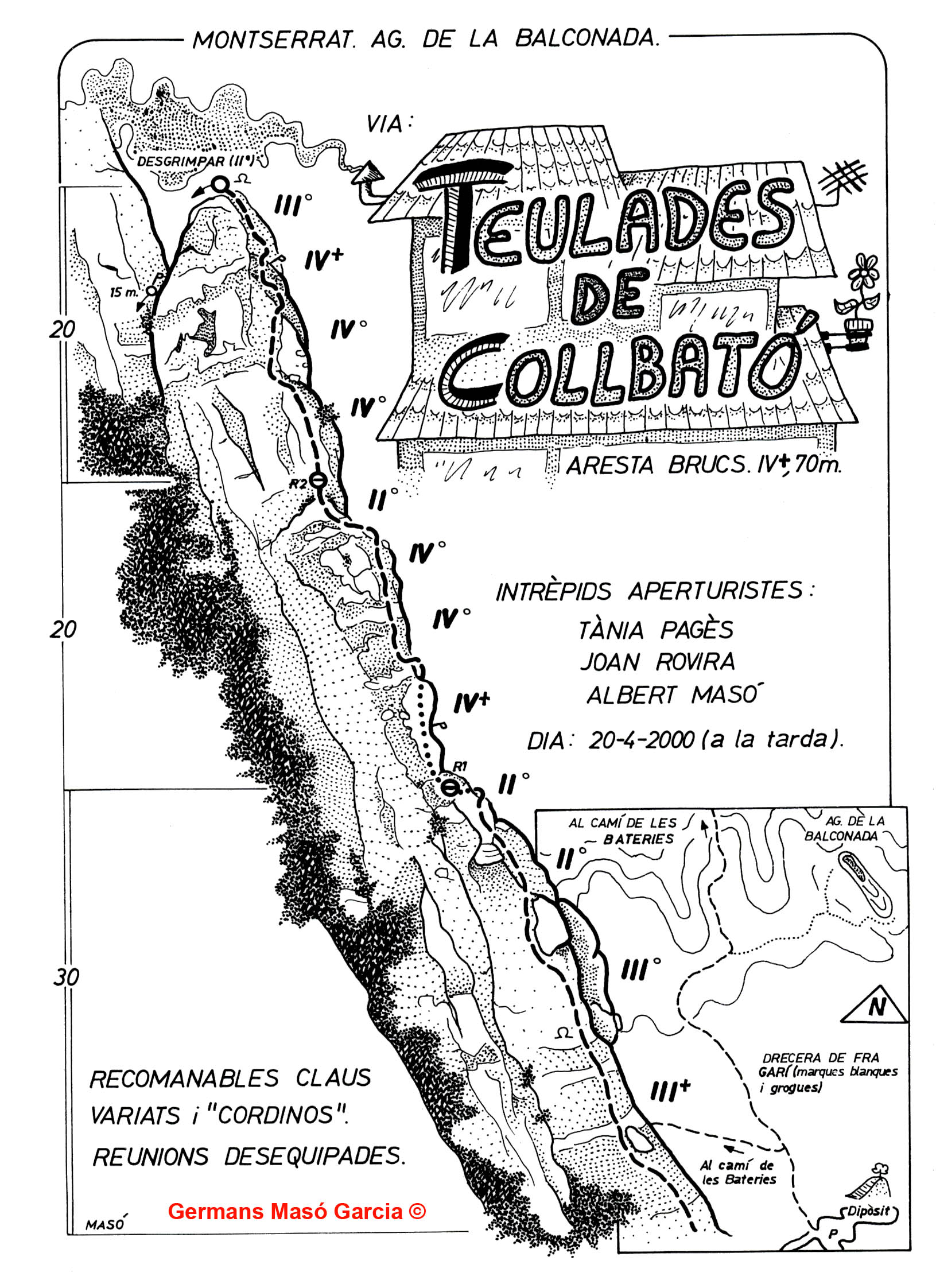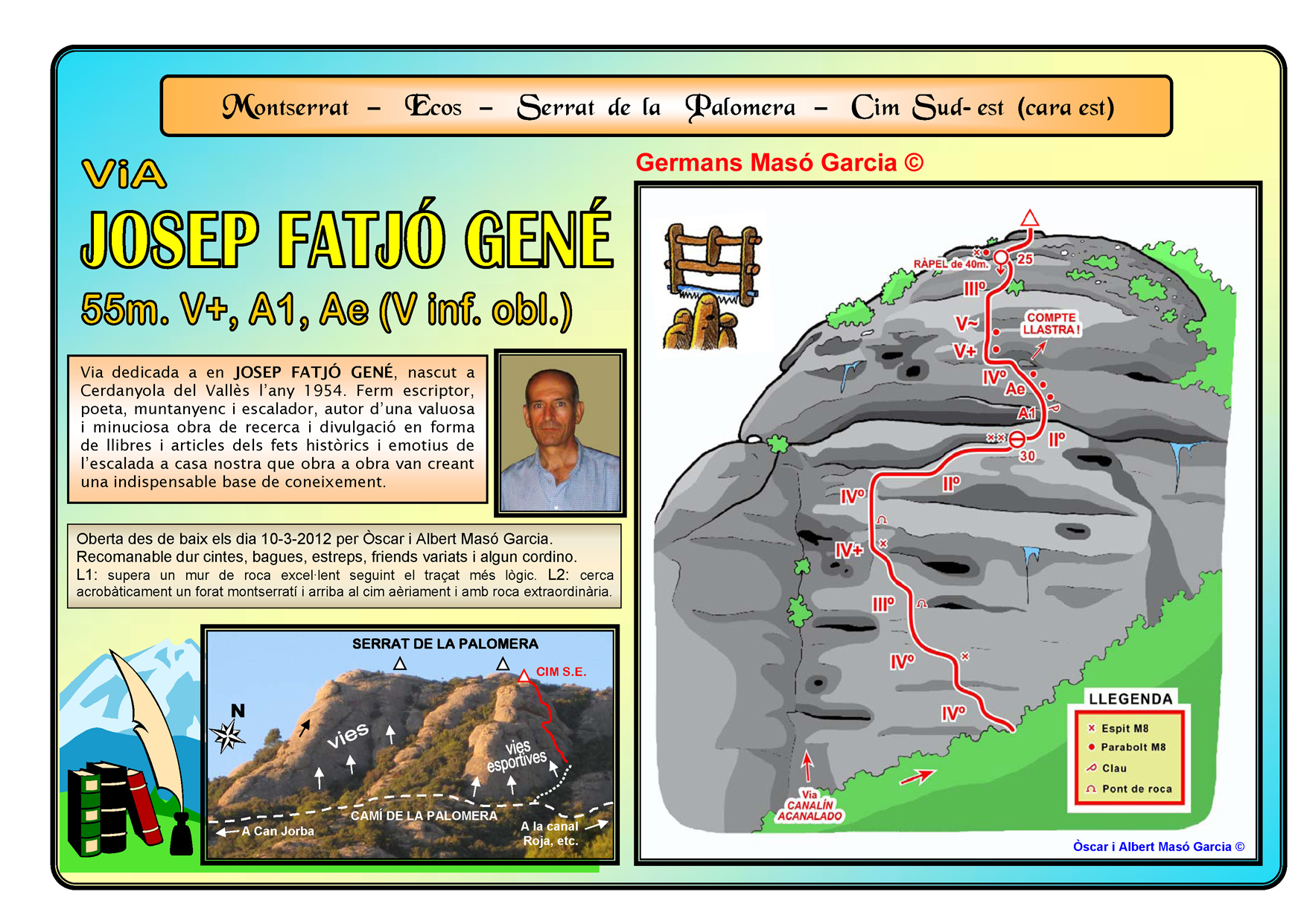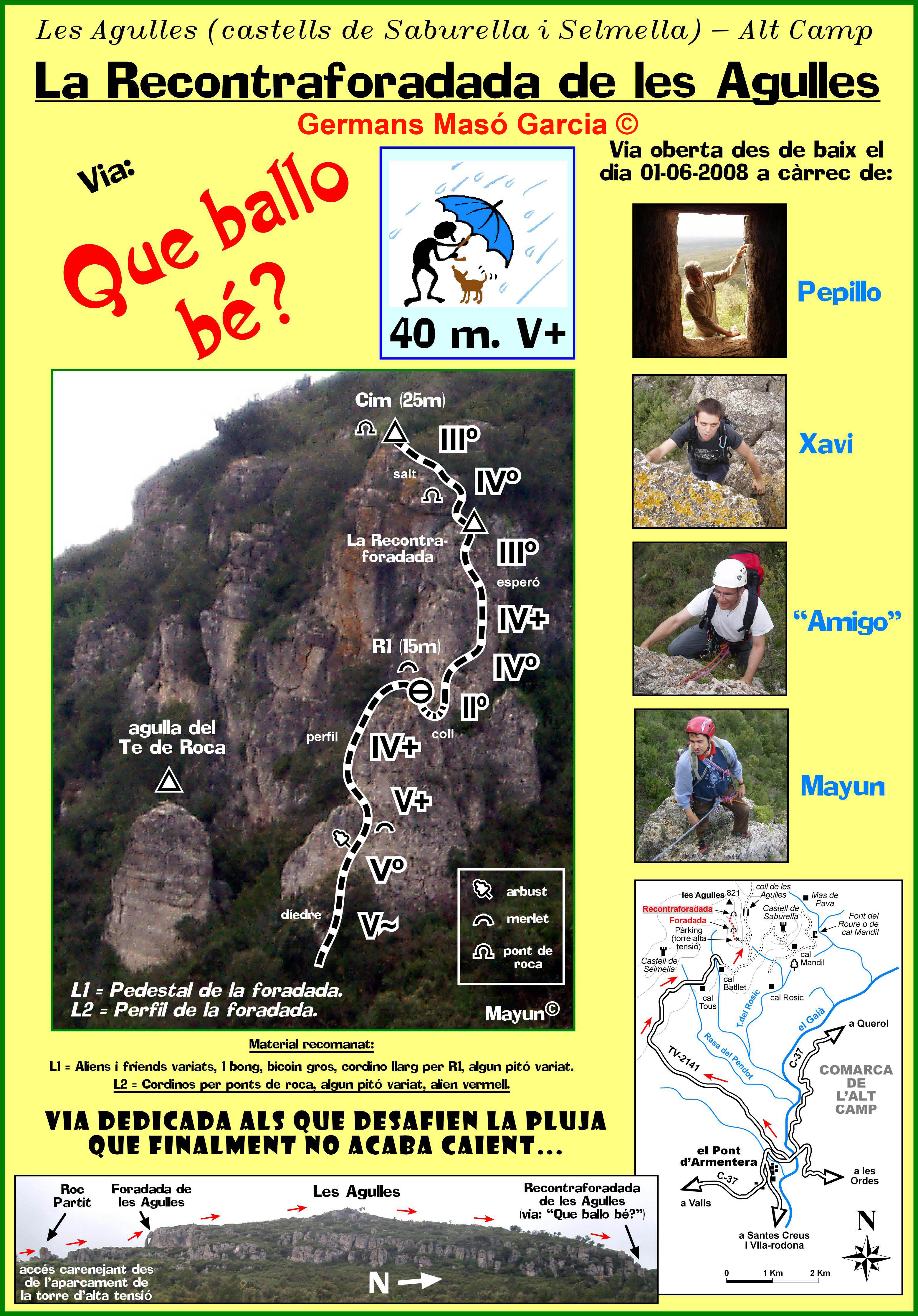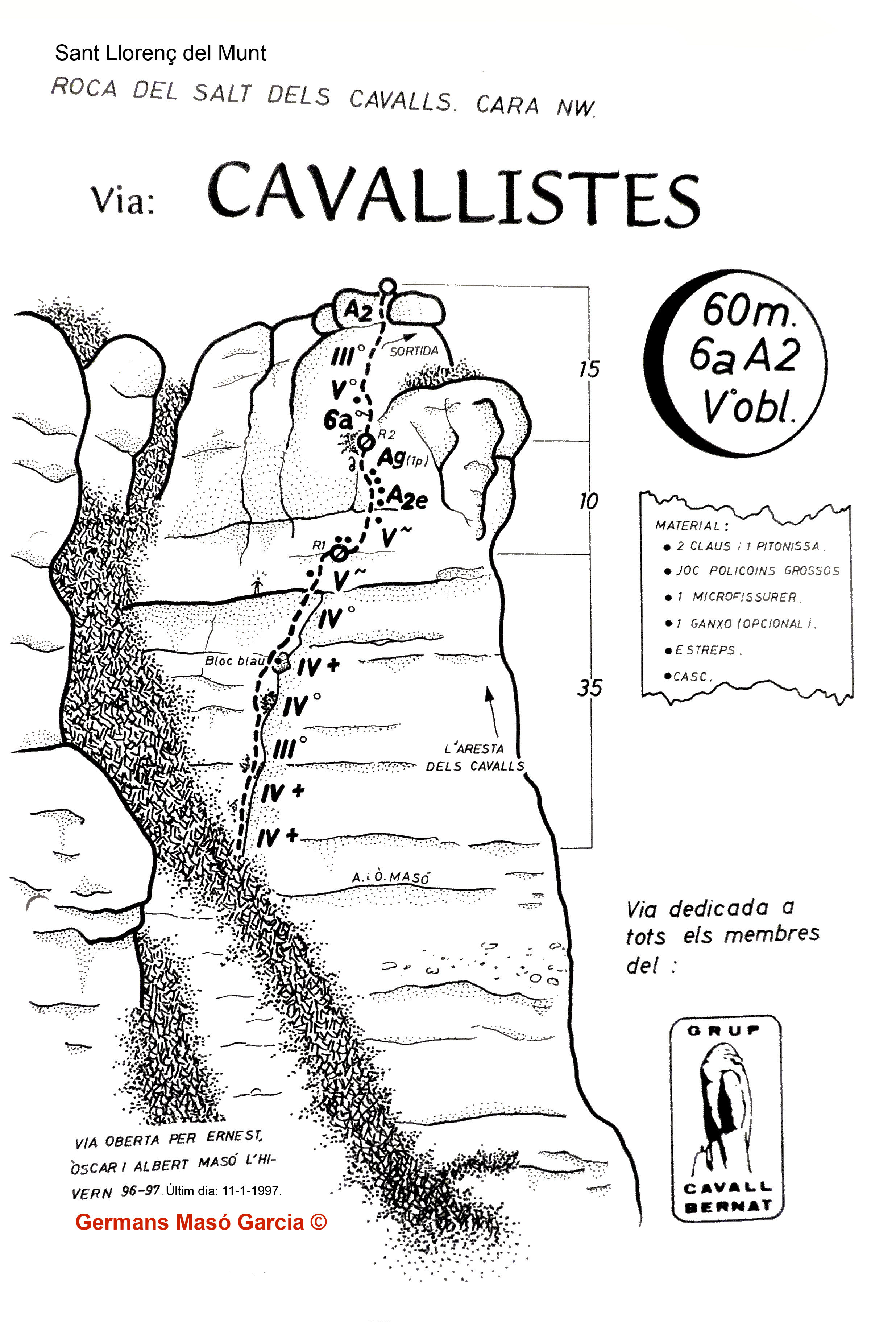 SEGURETAT: La pràctica de l’escalada és un esport que comporta risc. Tothom qui vulgui repetir alguna de les vies ressenyades en aquesta web és l’únic responsable de la seva pròpia seguretat i del conjunt de la cordada. En aquest sentit, els autors de les vies i les ressenyes declinen qualsevol responsabilitat.