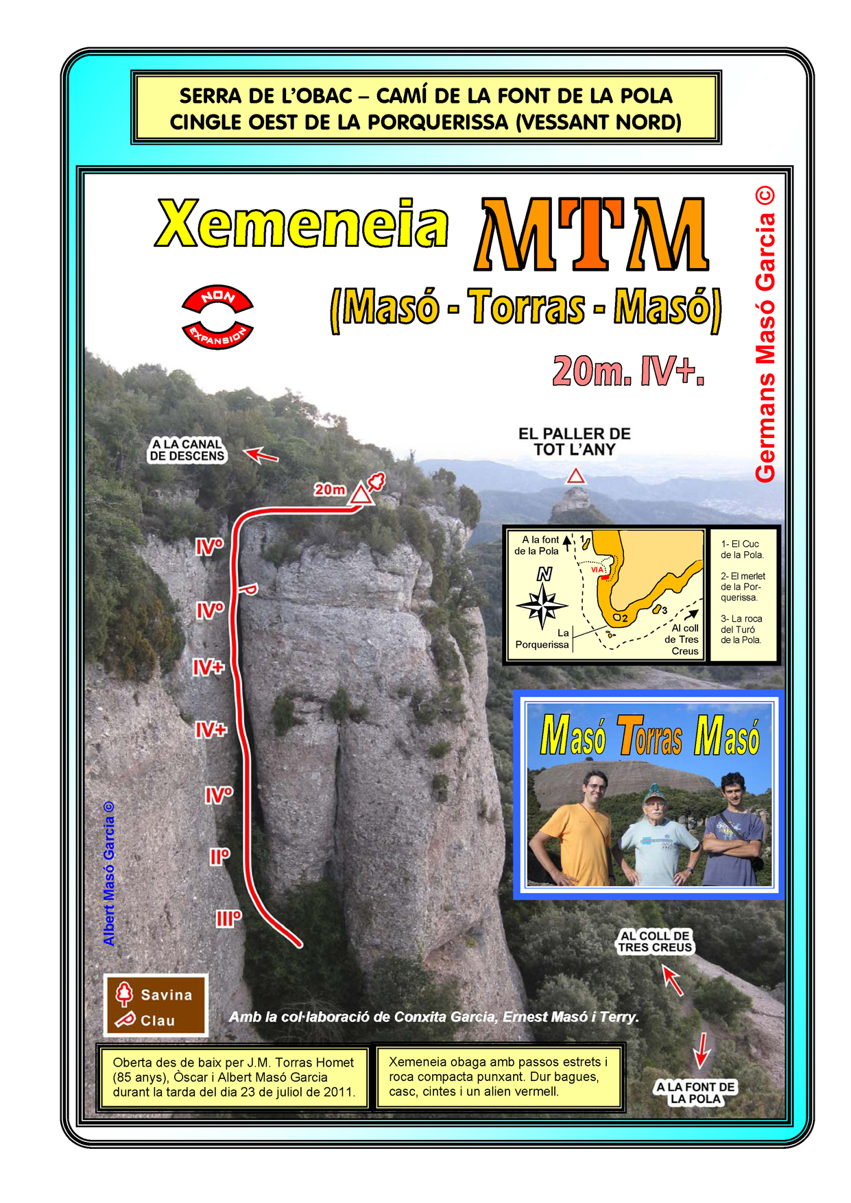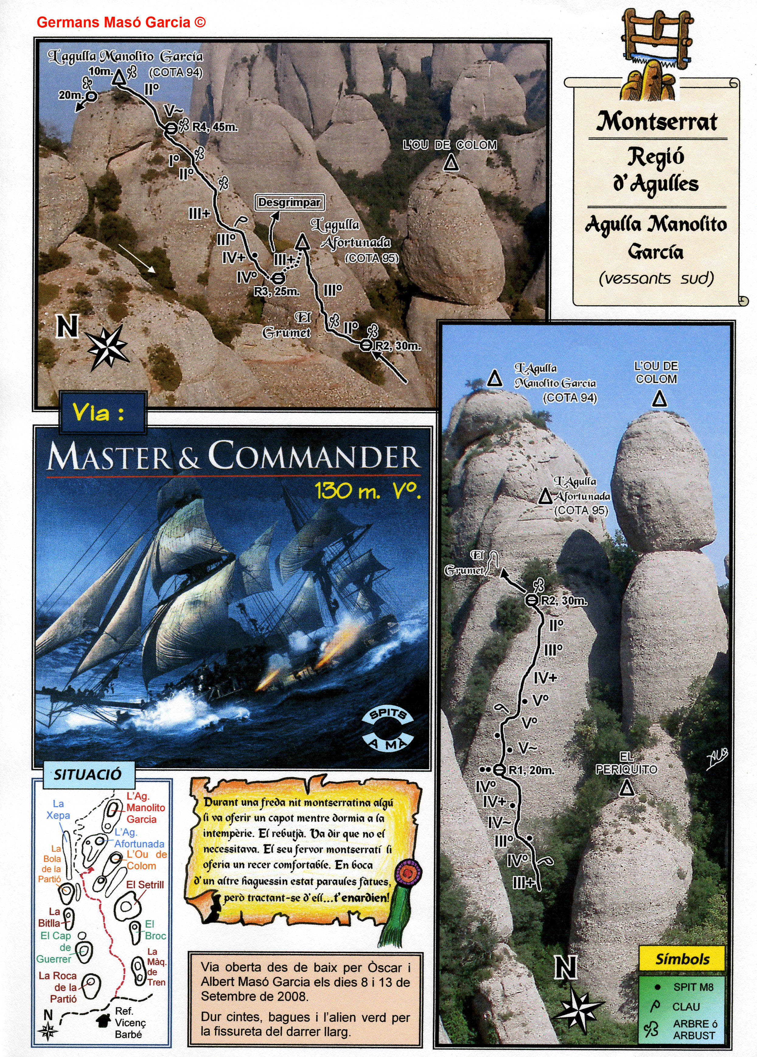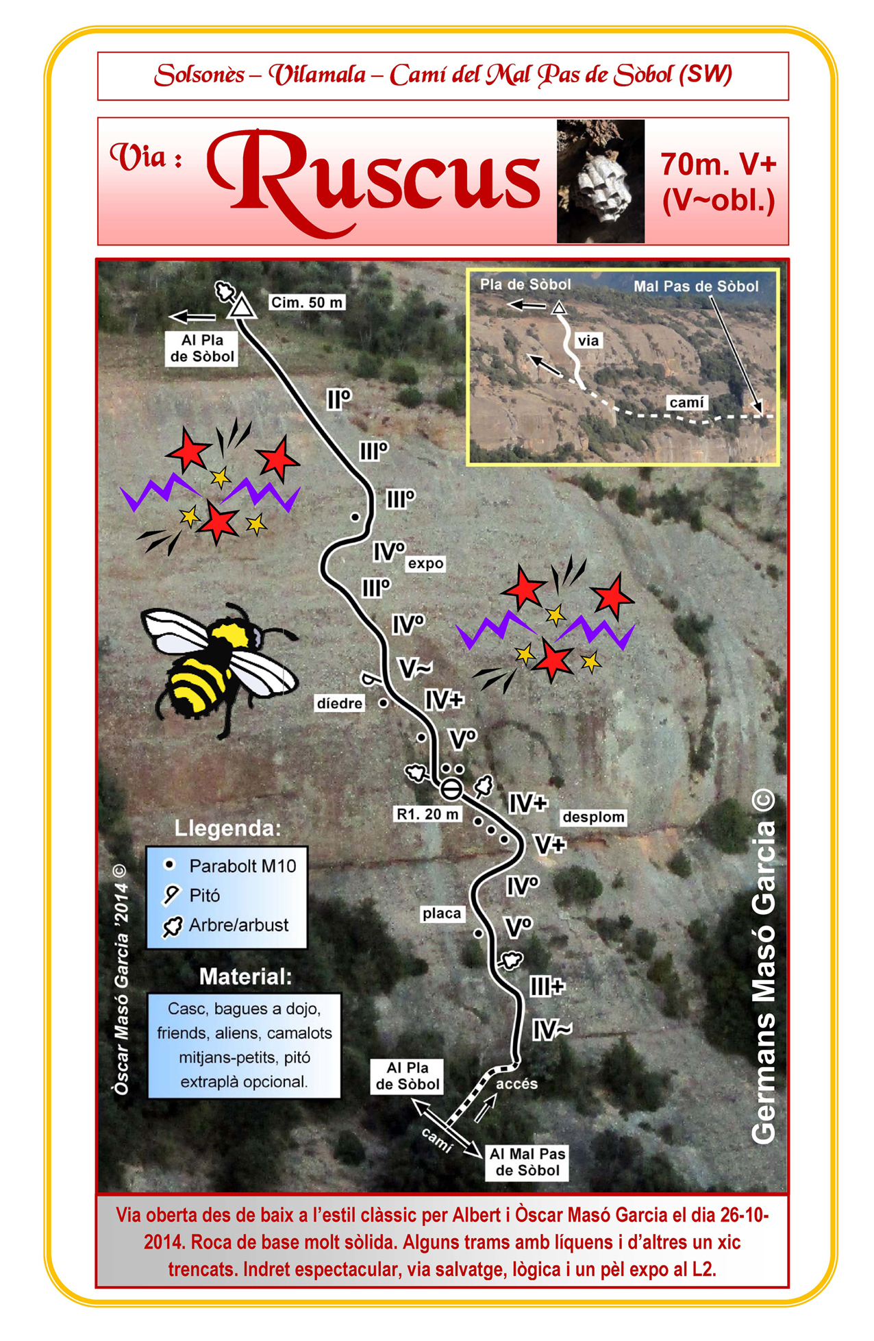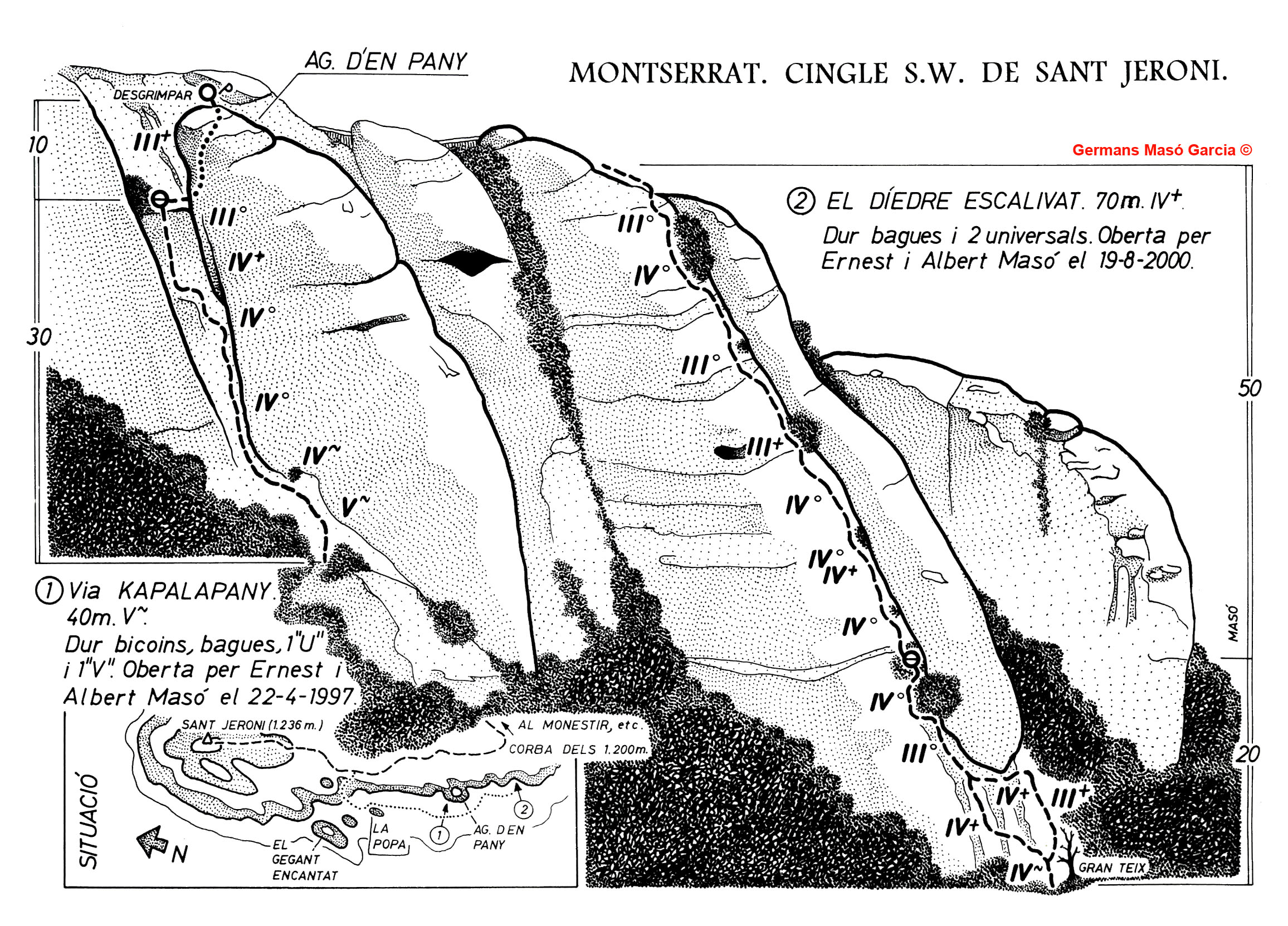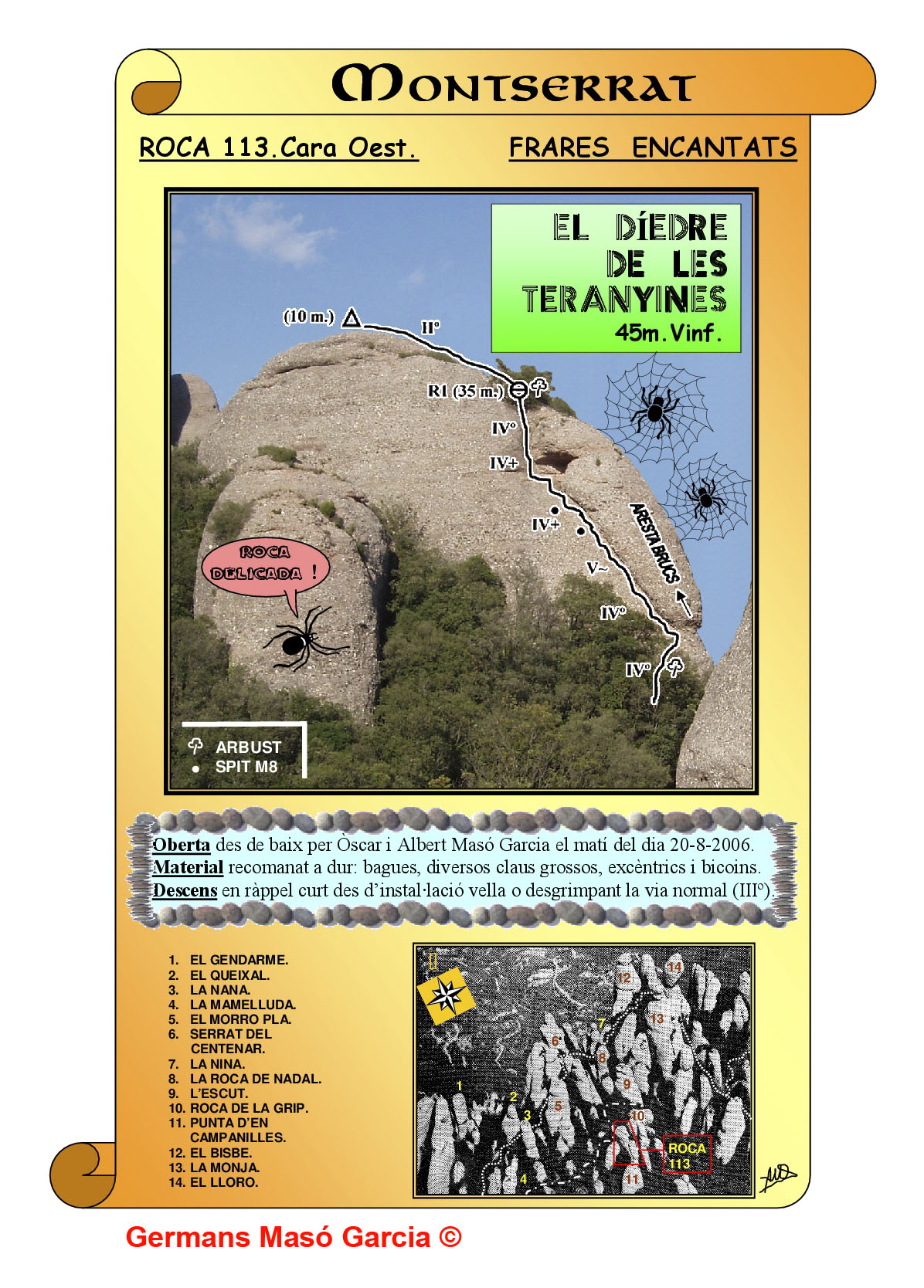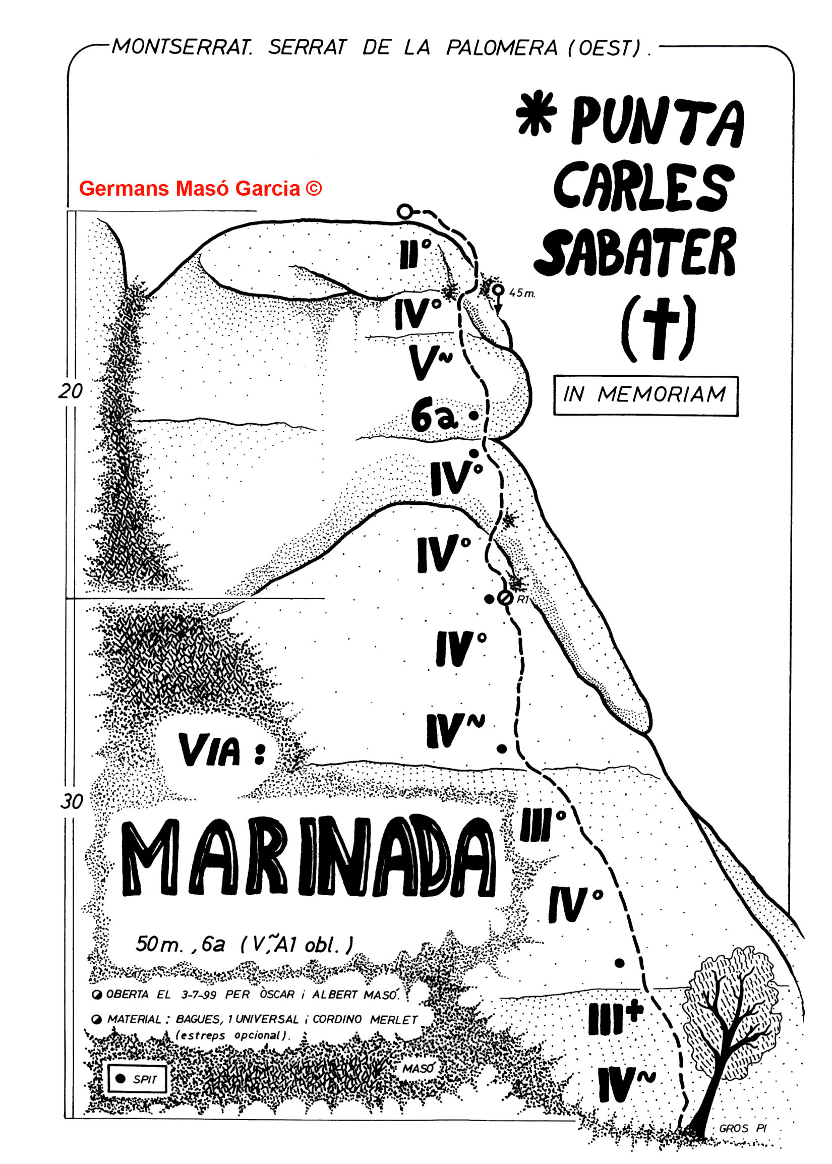 SEGURETAT: La pràctica de l’escalada és un esport que comporta risc. Tothom qui vulgui repetir alguna de les vies ressenyades en aquesta web és l’únic responsable de la seva pròpia seguretat i del conjunt de la cordada. En aquest sentit, els autors de les vies i les ressenyes declinen qualsevol responsabilitat.