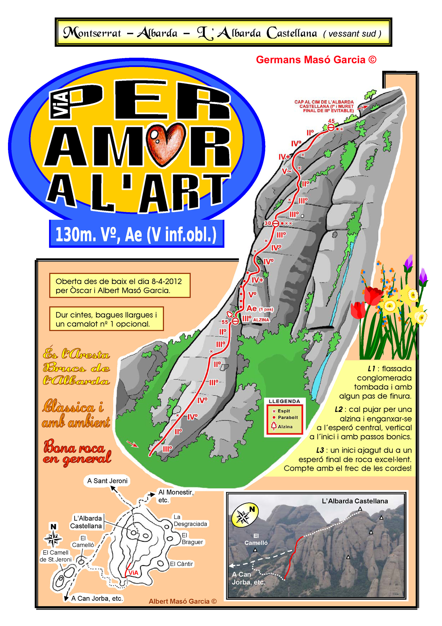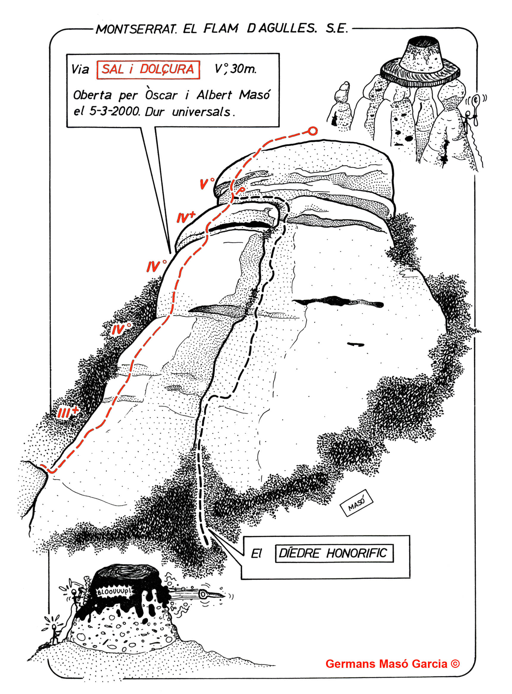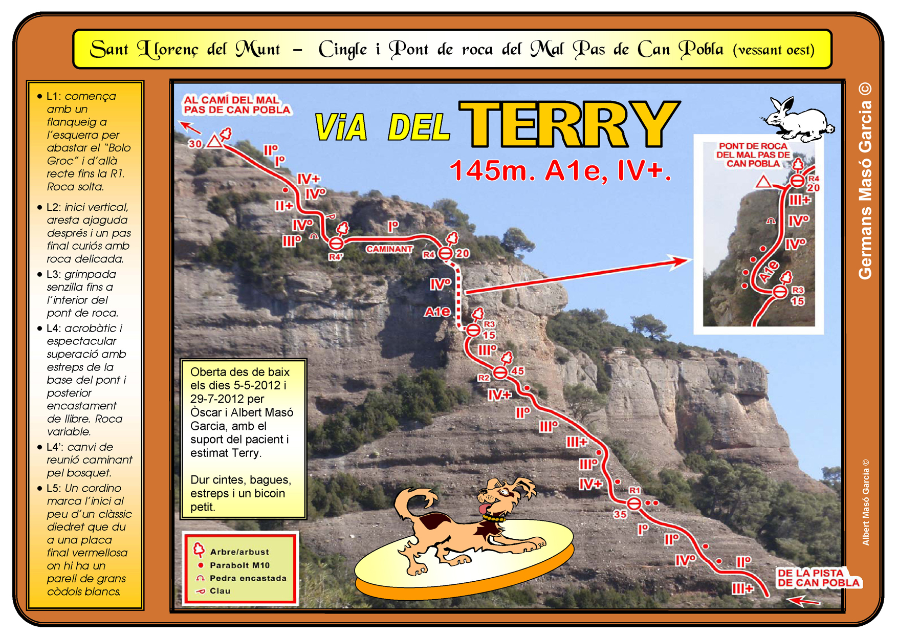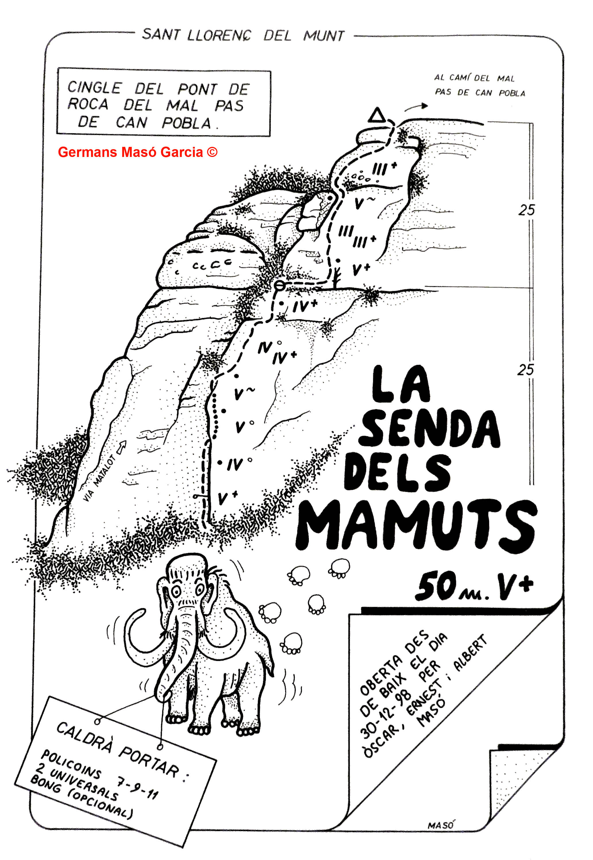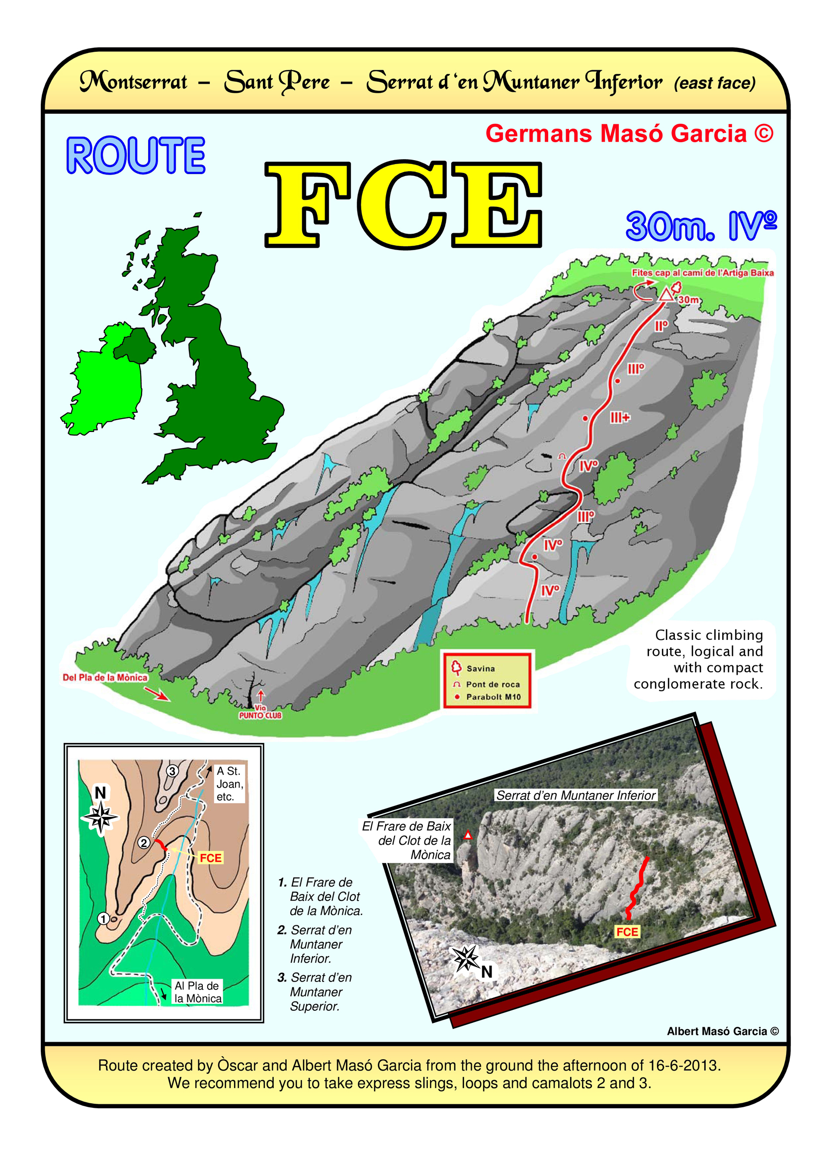 SEGURETAT: La pràctica de l’escalada és un esport que comporta risc. Tothom qui vulgui repetir alguna de les vies ressenyades en aquesta web és l’únic responsable de la seva pròpia seguretat i del conjunt de la cordada. En aquest sentit, els autors de les vies i les ressenyes declinen qualsevol responsabilitat.