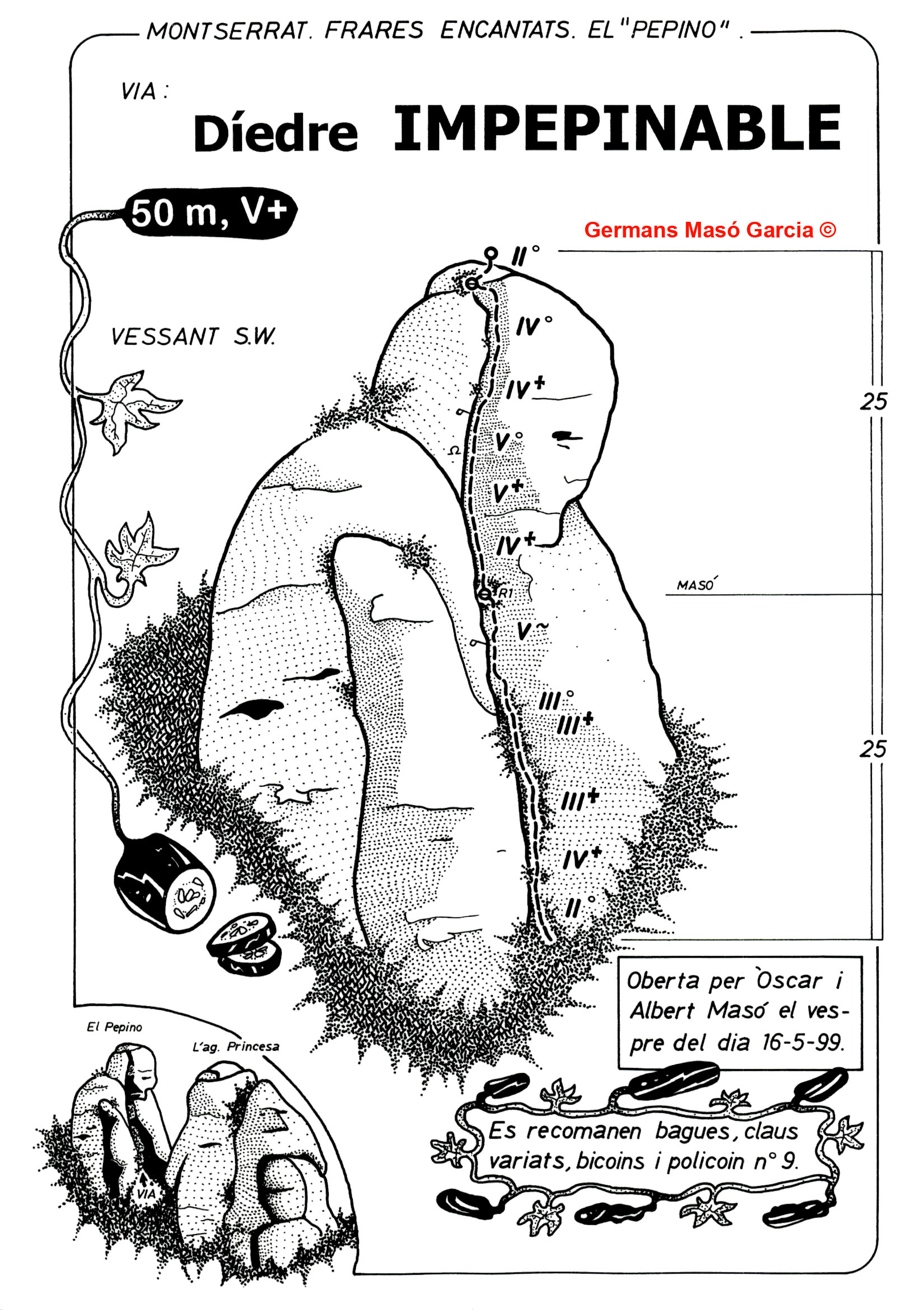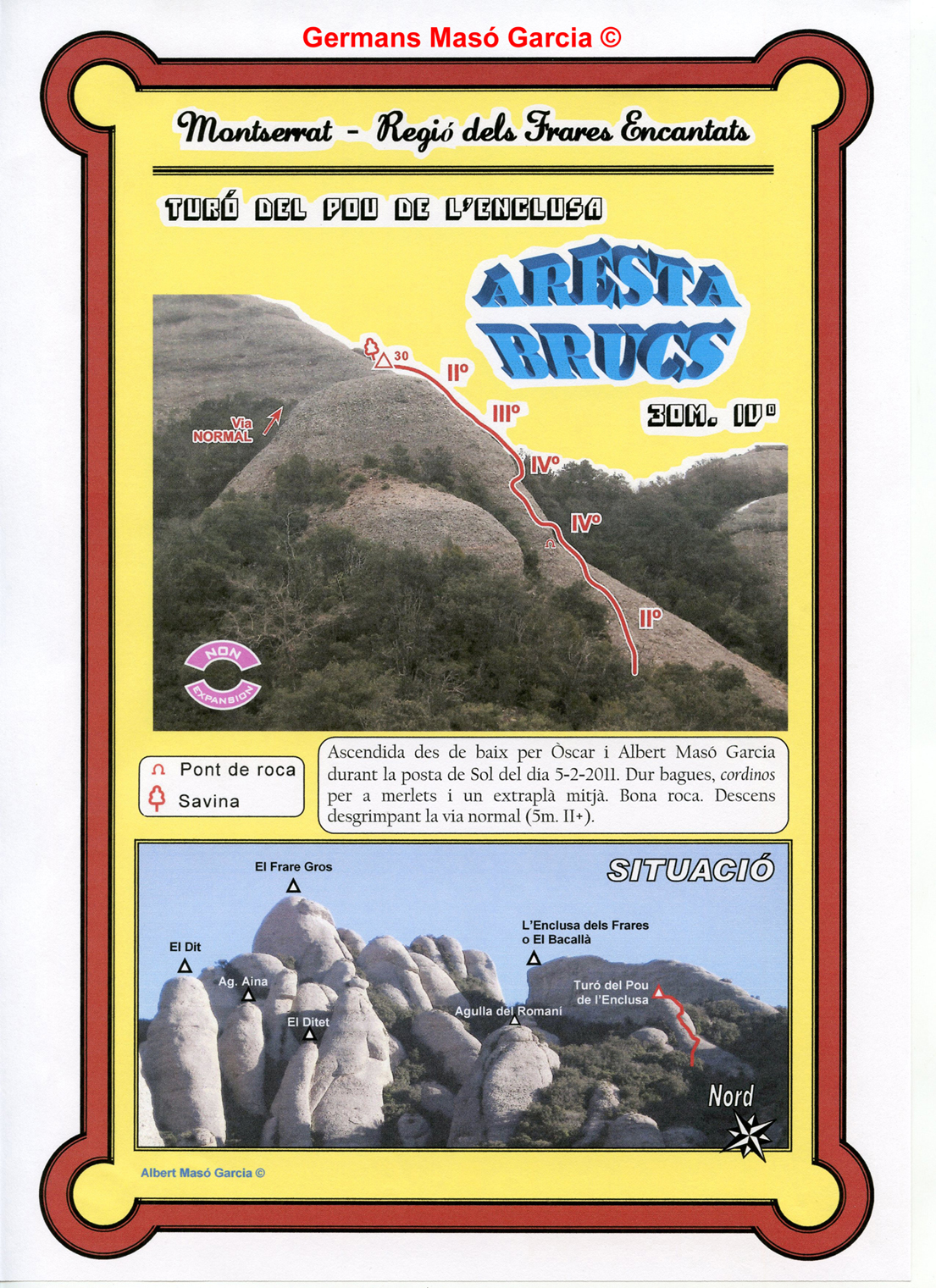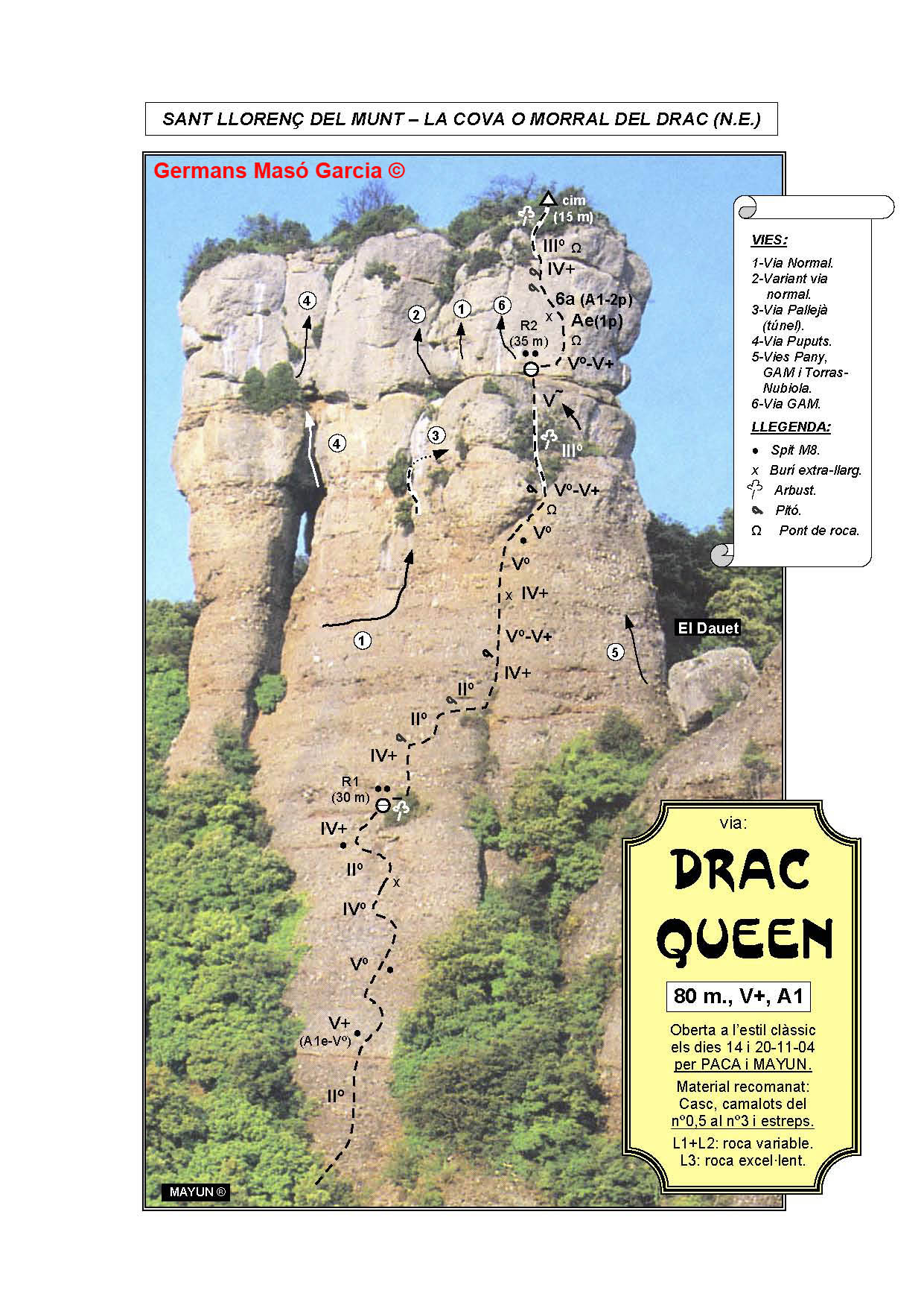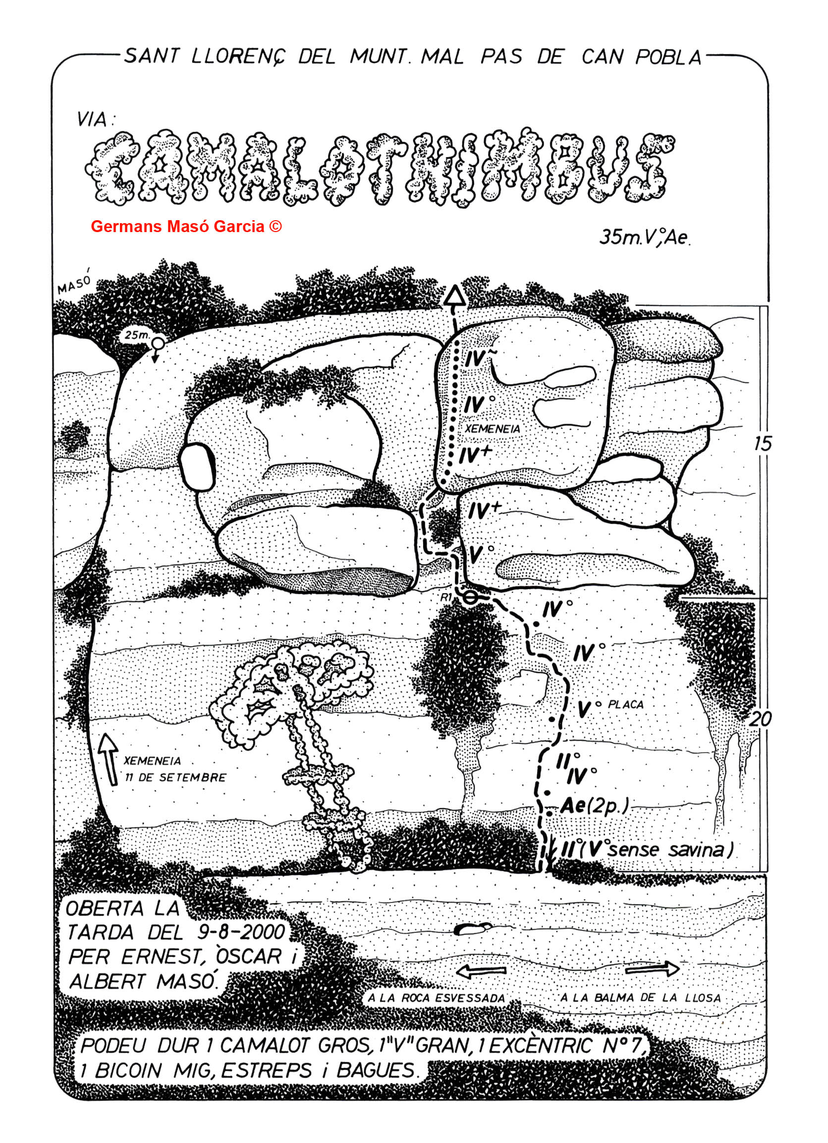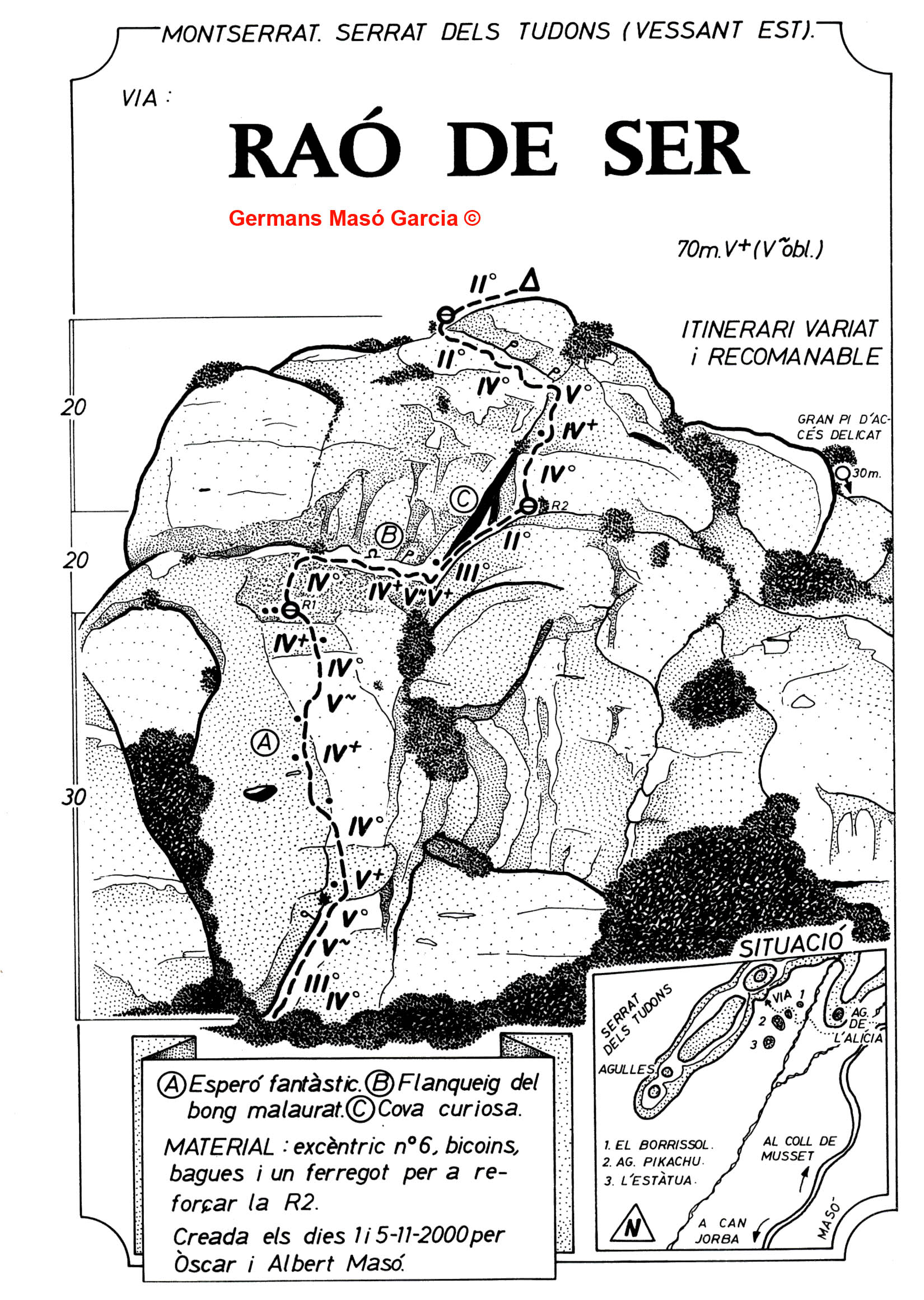 SEGURETAT: La pràctica de l’escalada és un esport que comporta risc. Tothom qui vulgui repetir alguna de les vies ressenyades en aquesta web és l’únic responsable de la seva pròpia seguretat i del conjunt de la cordada. En aquest sentit, els autors de les vies i les ressenyes declinen qualsevol responsabilitat.