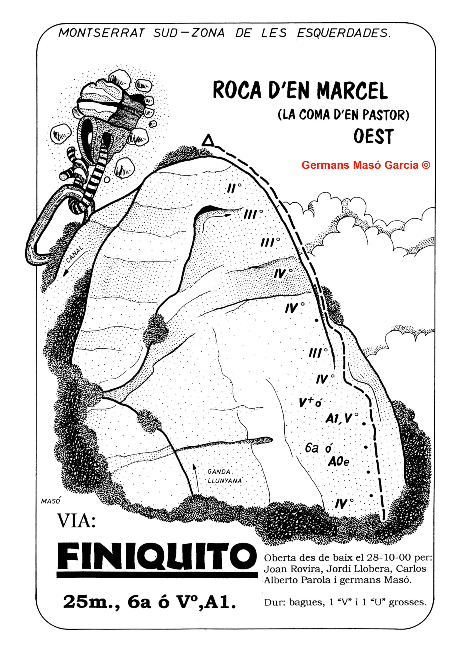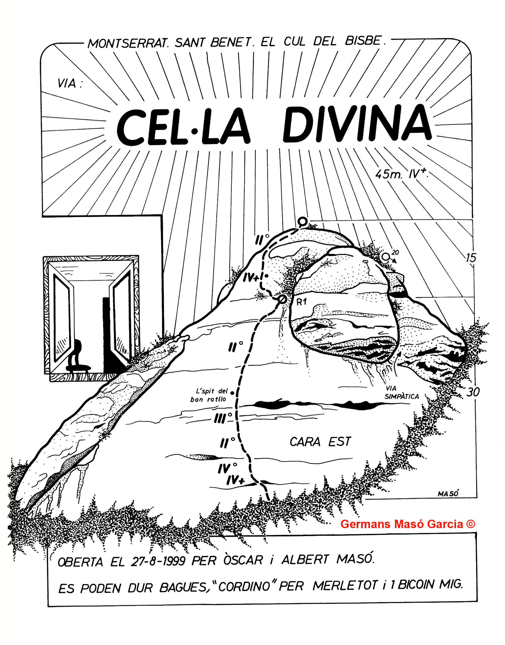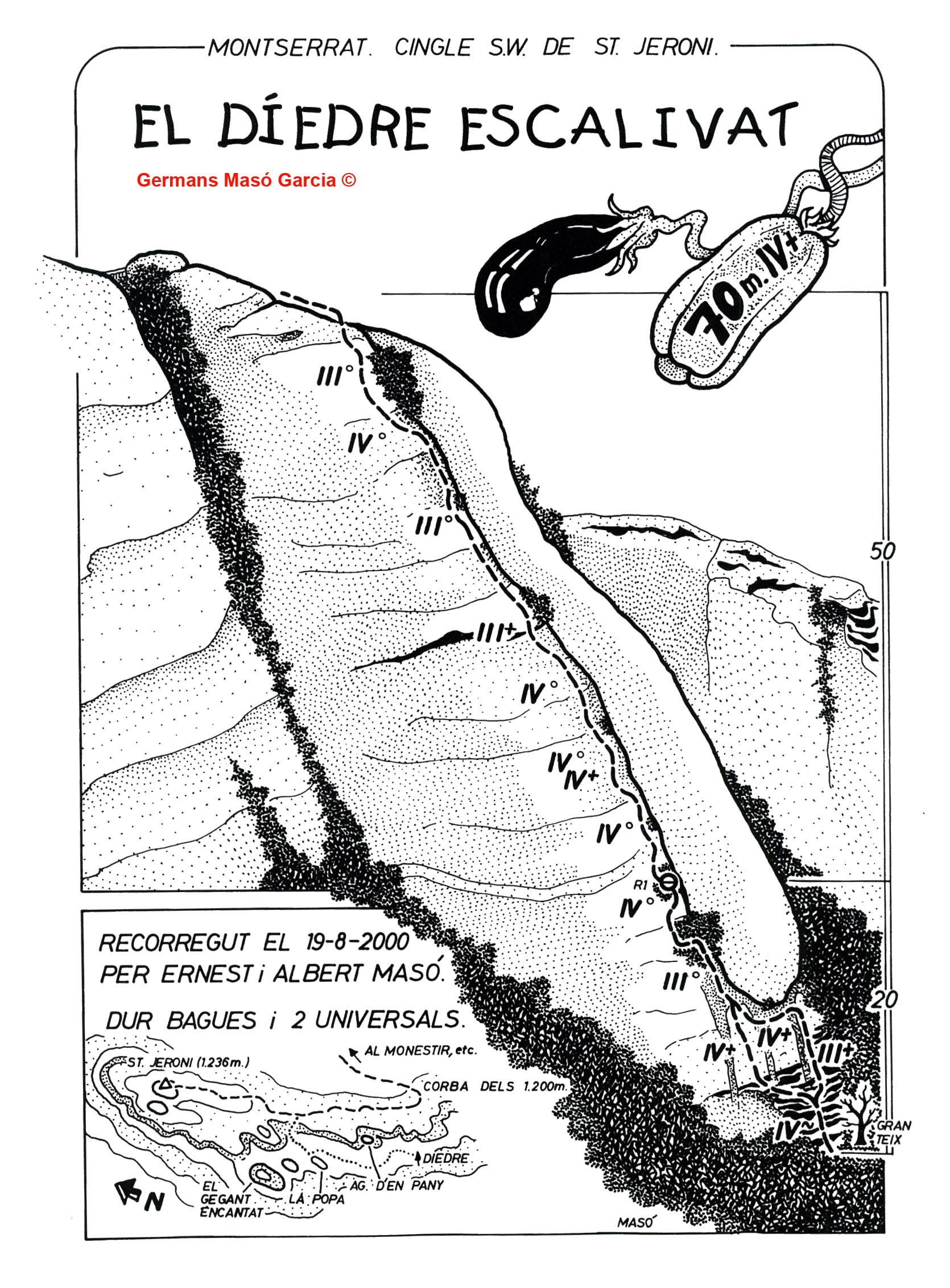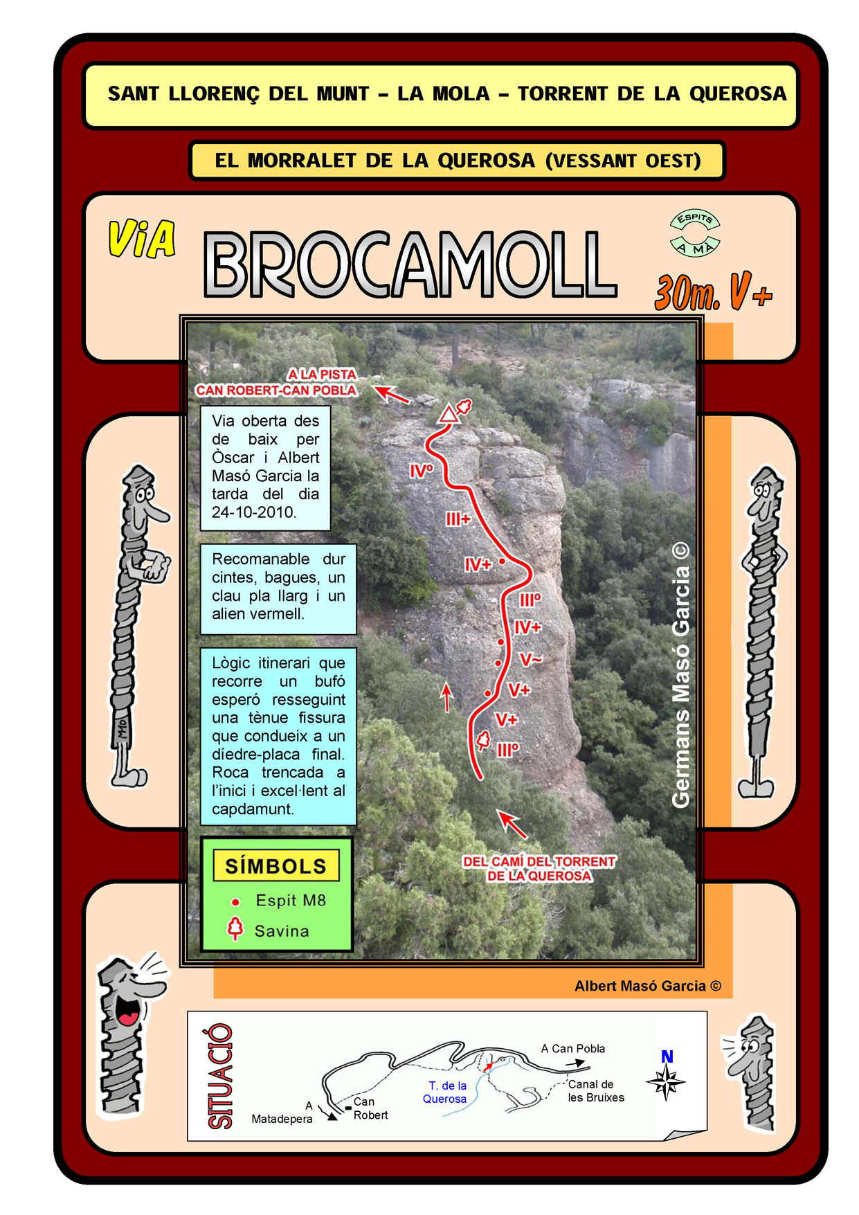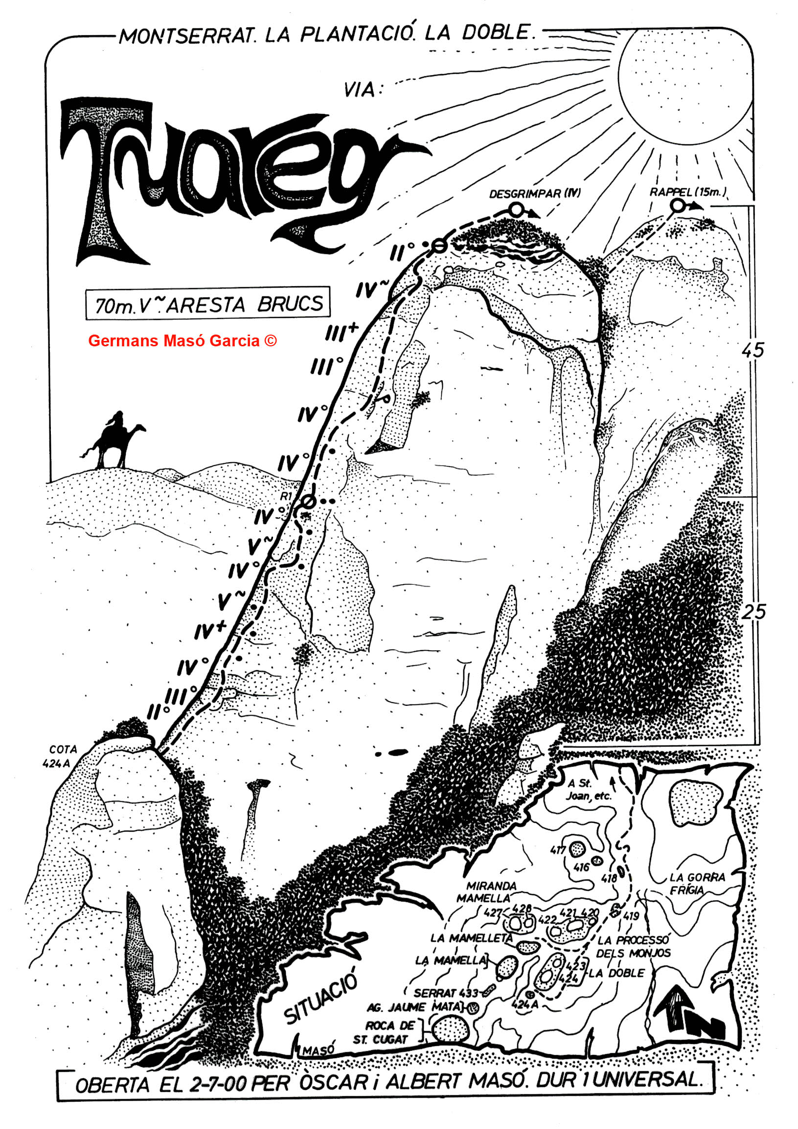 SEGURETAT: La pràctica de l’escalada és un esport que comporta risc. Tothom qui vulgui repetir alguna de les vies ressenyades en aquesta web és l’únic responsable de la seva pròpia seguretat i del conjunt de la cordada. En aquest sentit, els autors de les vies i les ressenyes declinen qualsevol responsabilitat.