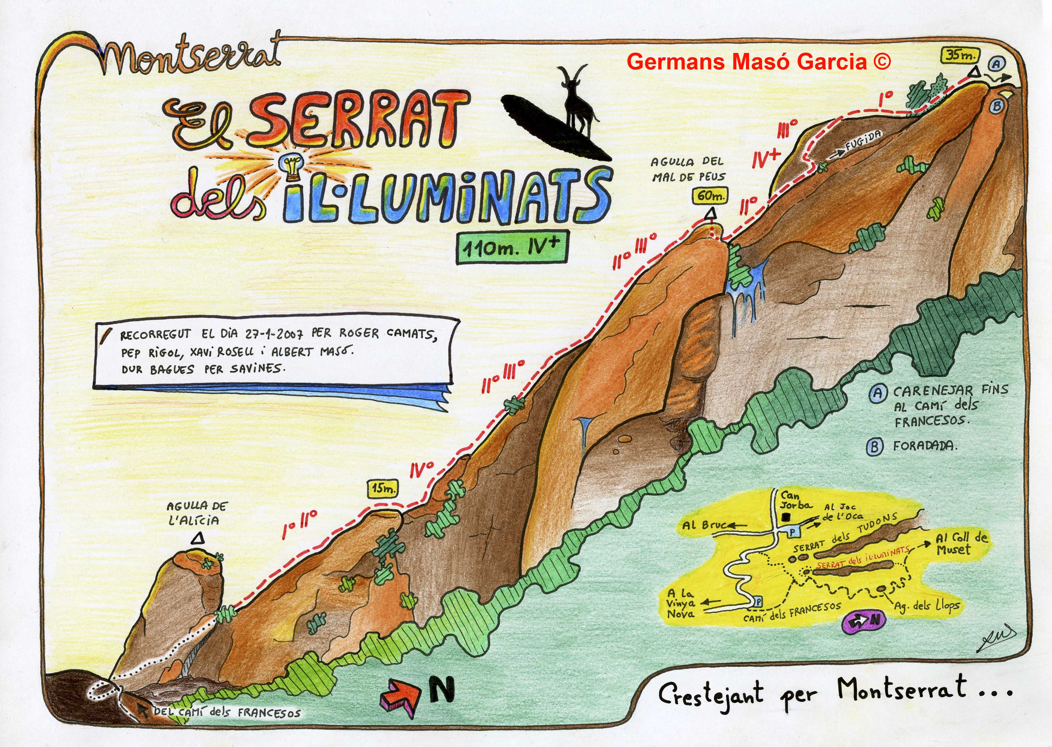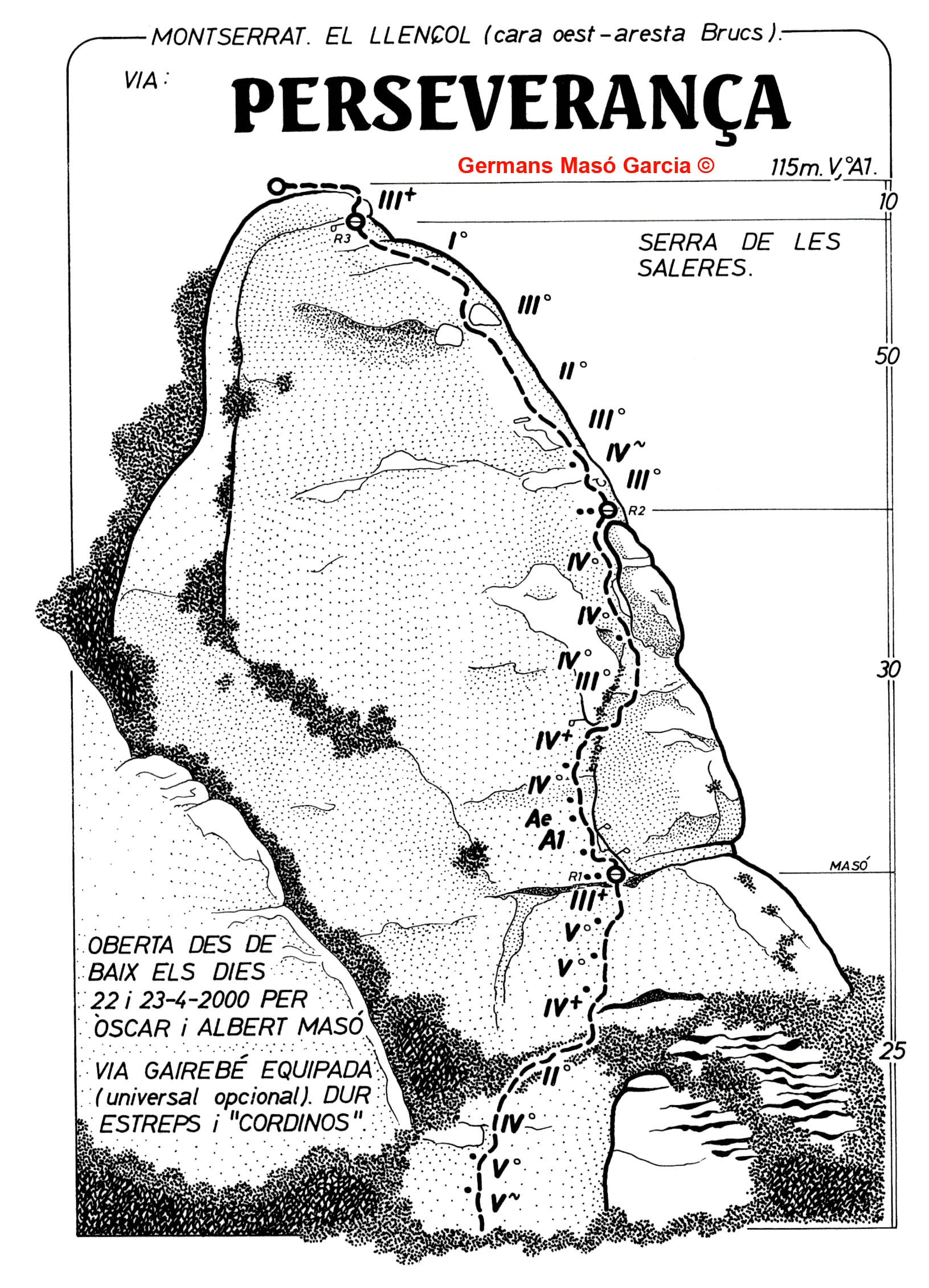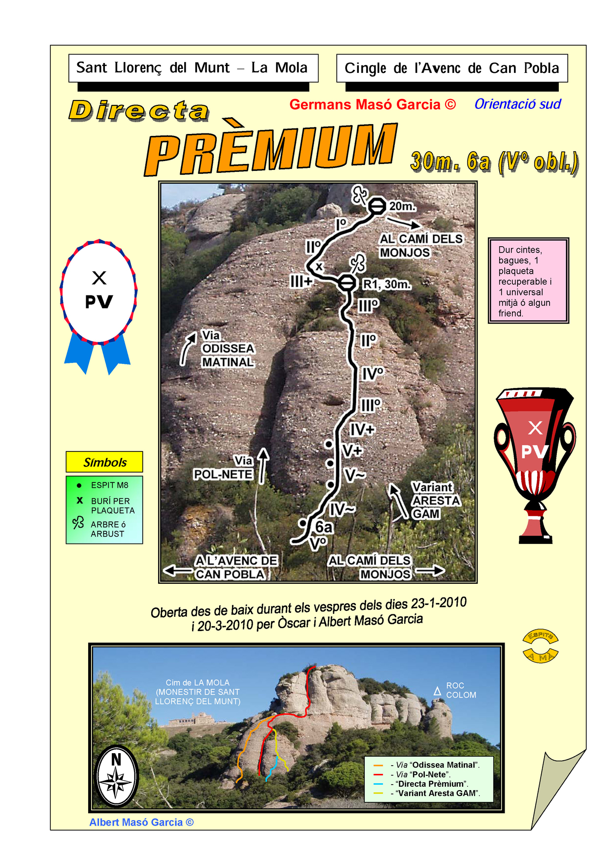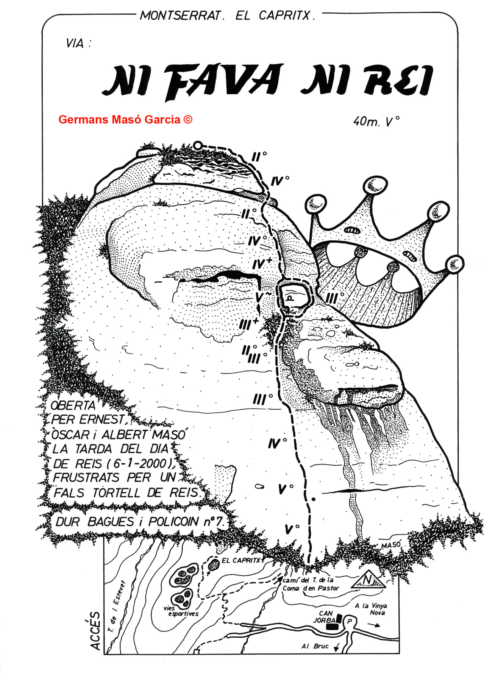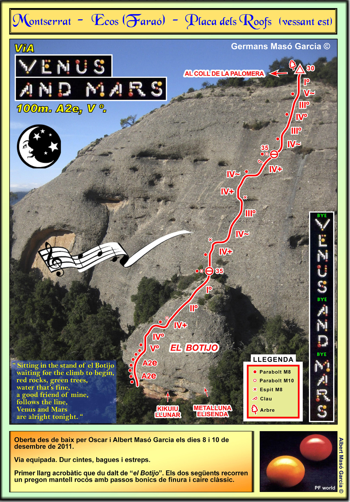 SEGURETAT: La pràctica de l’escalada és un esport que comporta risc. Tothom qui vulgui repetir alguna de les vies ressenyades en aquesta web és l’únic responsable de la seva pròpia seguretat i del conjunt de la cordada. En aquest sentit, els autors de les vies i les ressenyes declinen qualsevol responsabilitat.