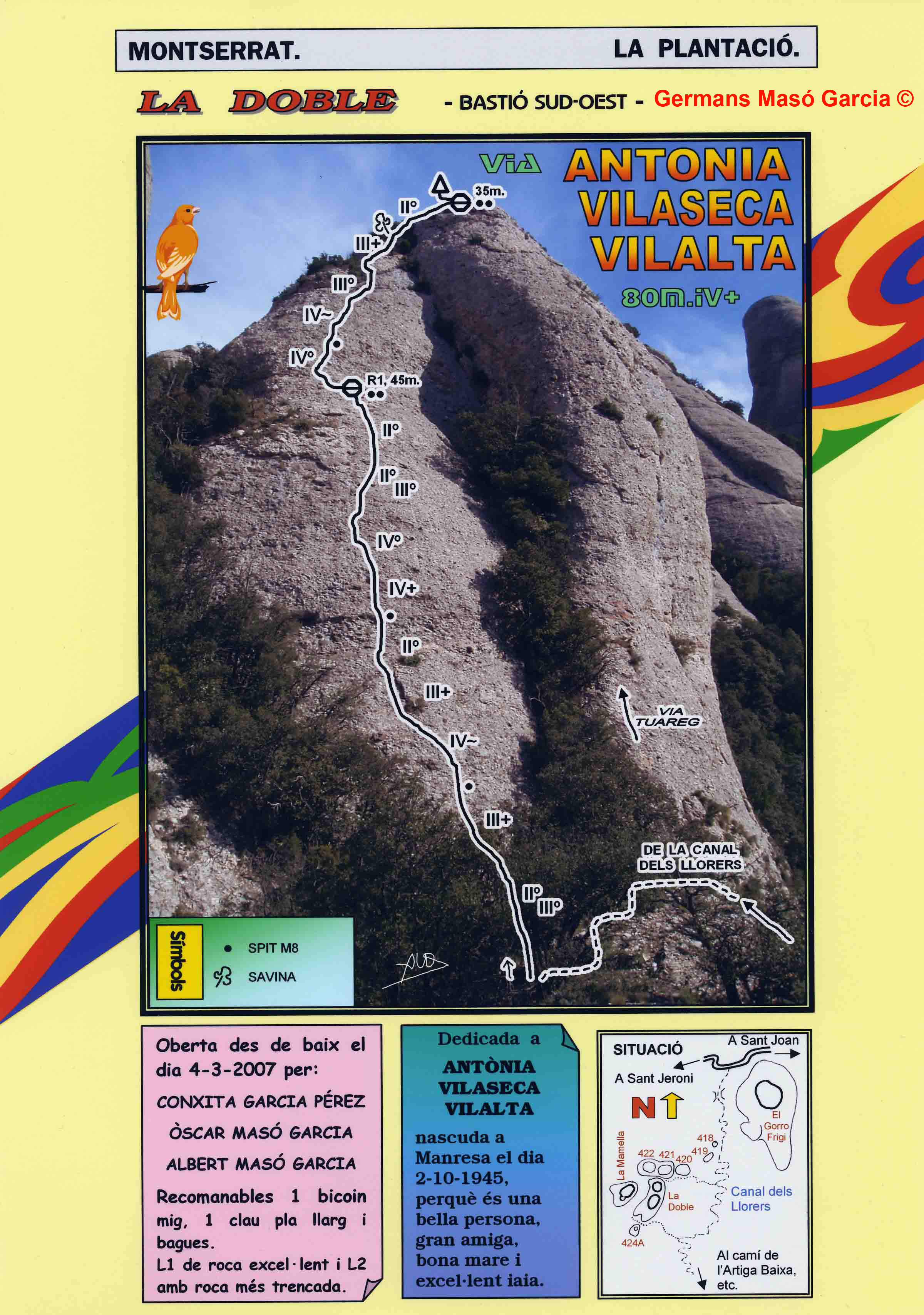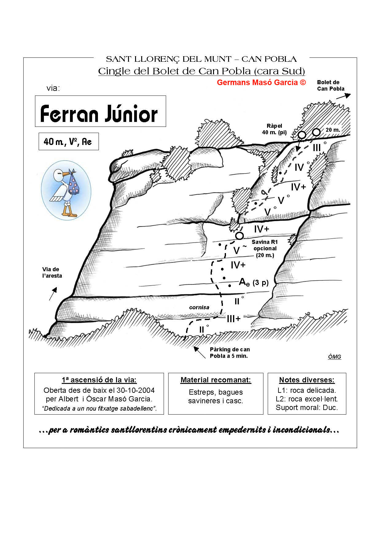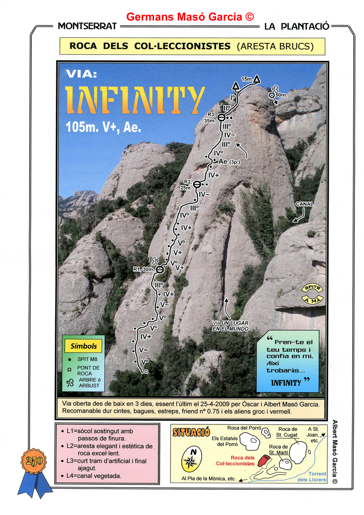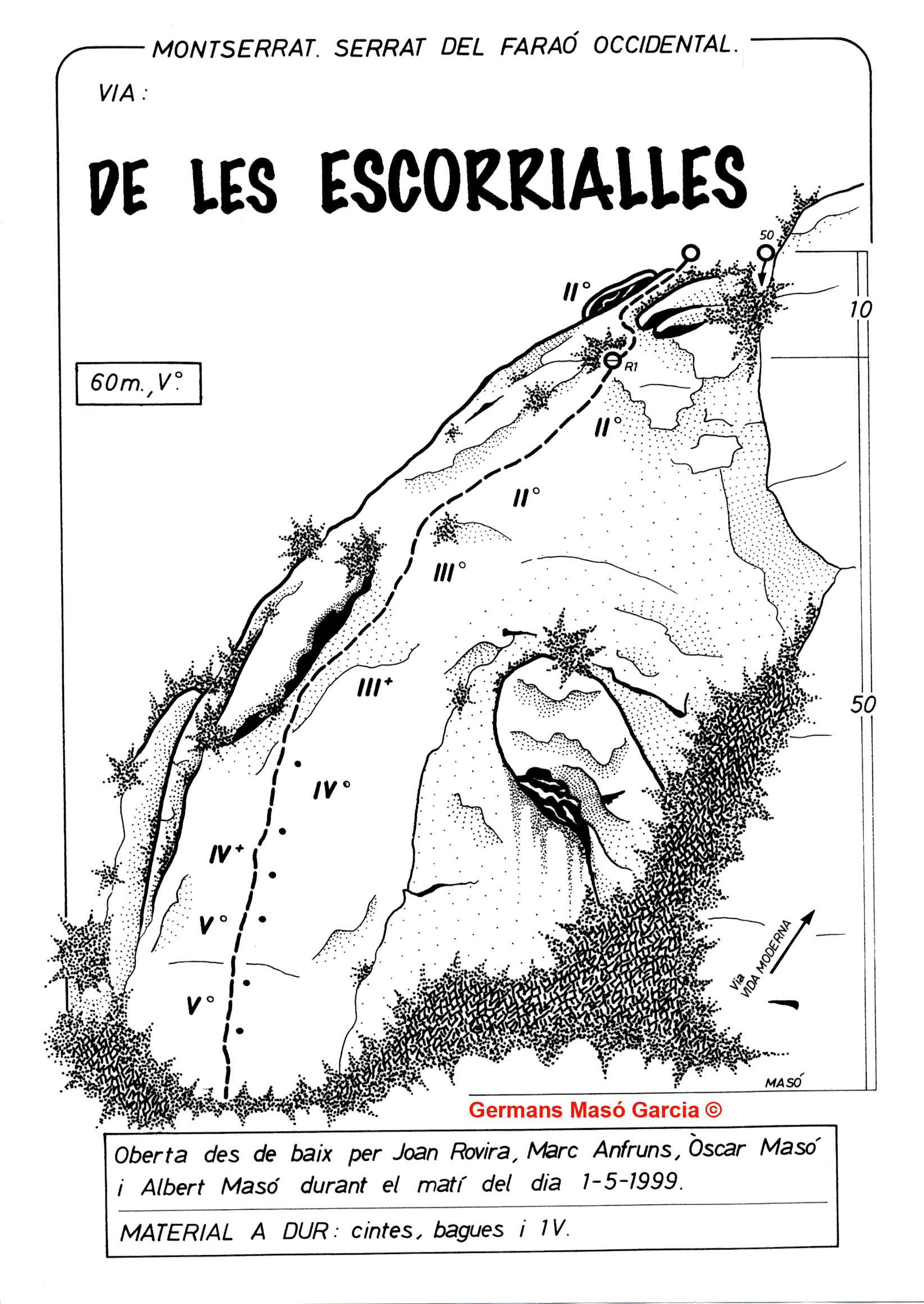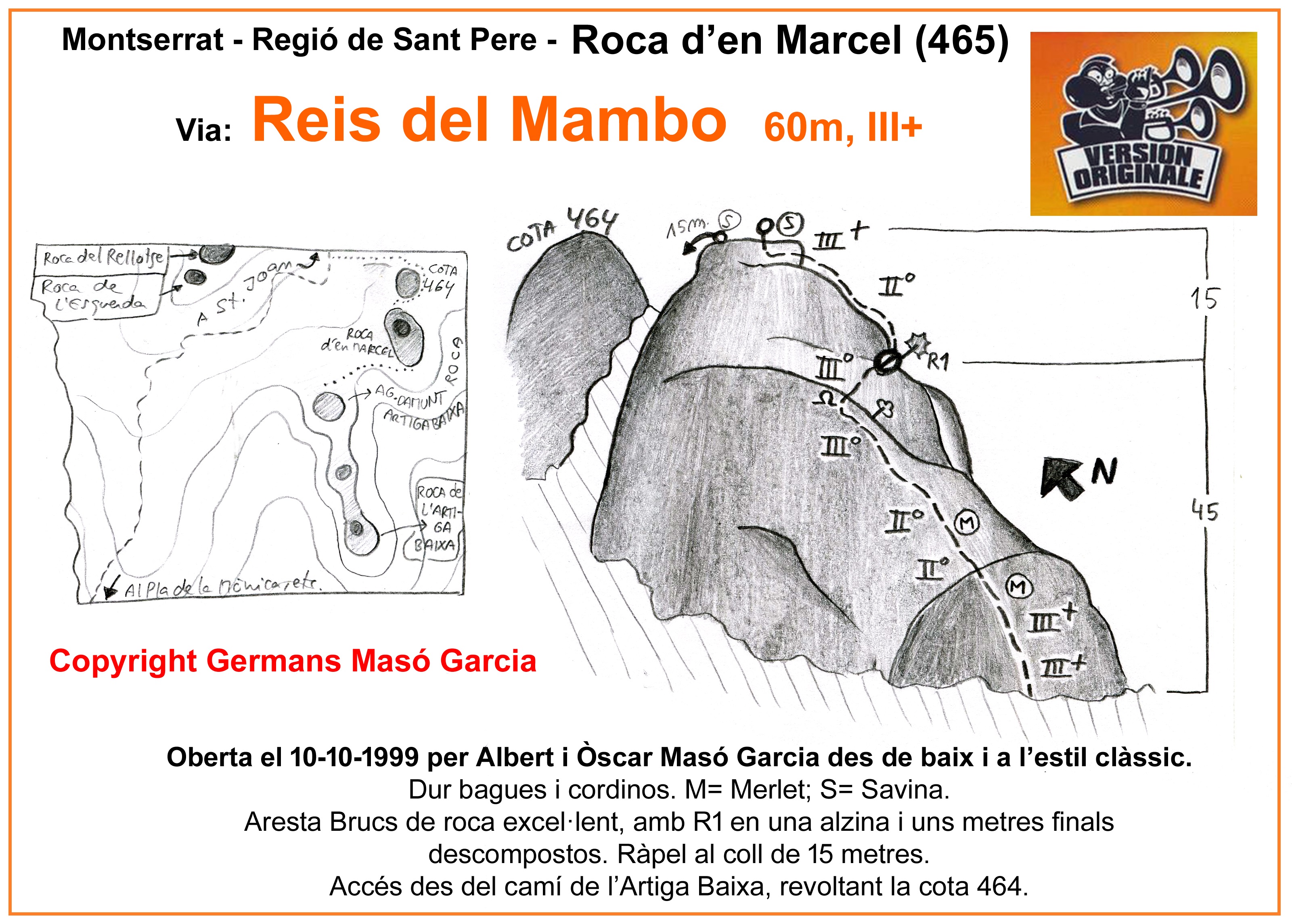 SEGURETAT: La pràctica de l’escalada és un esport que comporta risc. Tothom qui vulgui repetir alguna de les vies ressenyades en aquesta web és l’únic responsable de la seva pròpia seguretat i del conjunt de la cordada. En aquest sentit, els autors de les vies i les ressenyes declinen qualsevol responsabilitat.