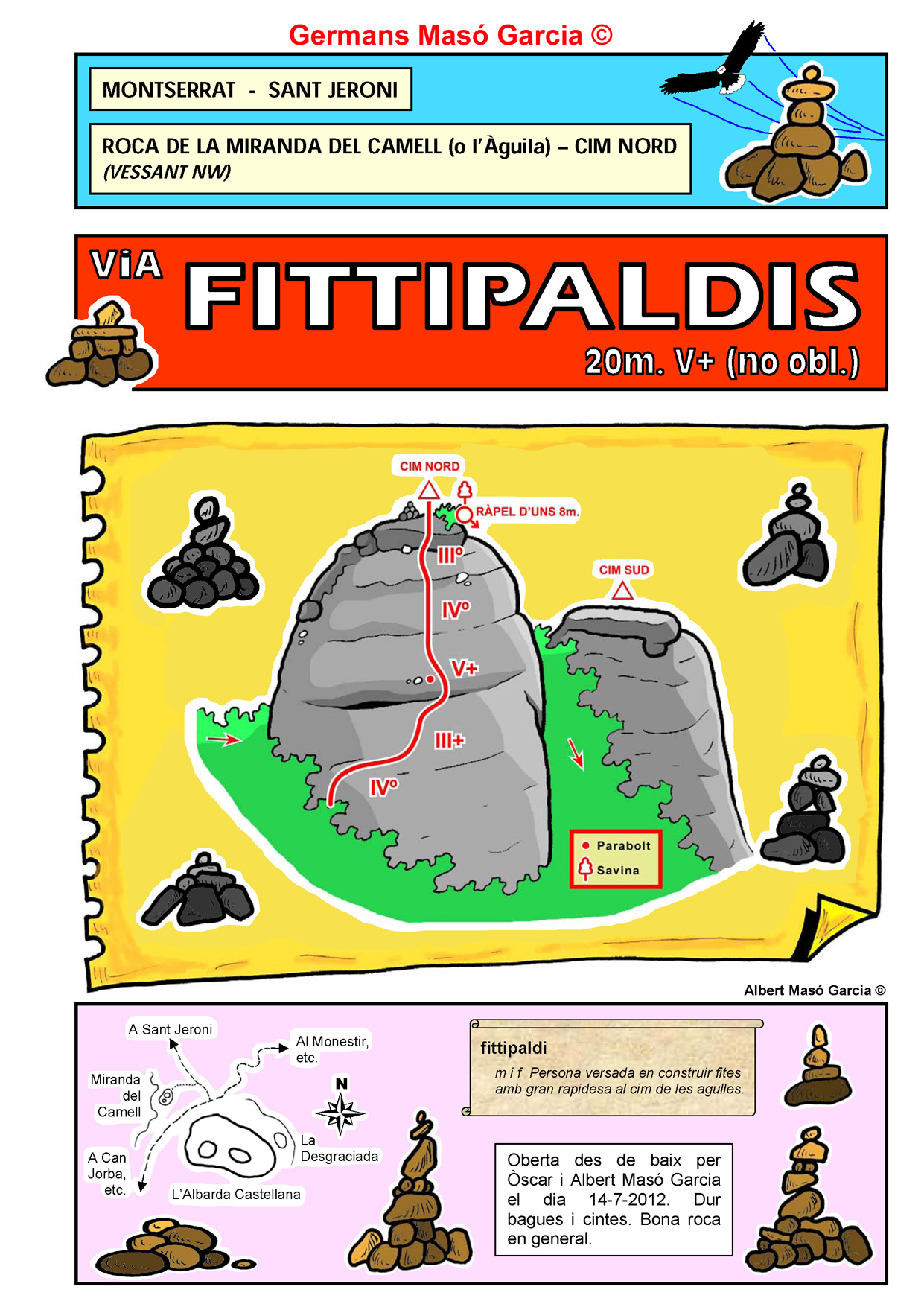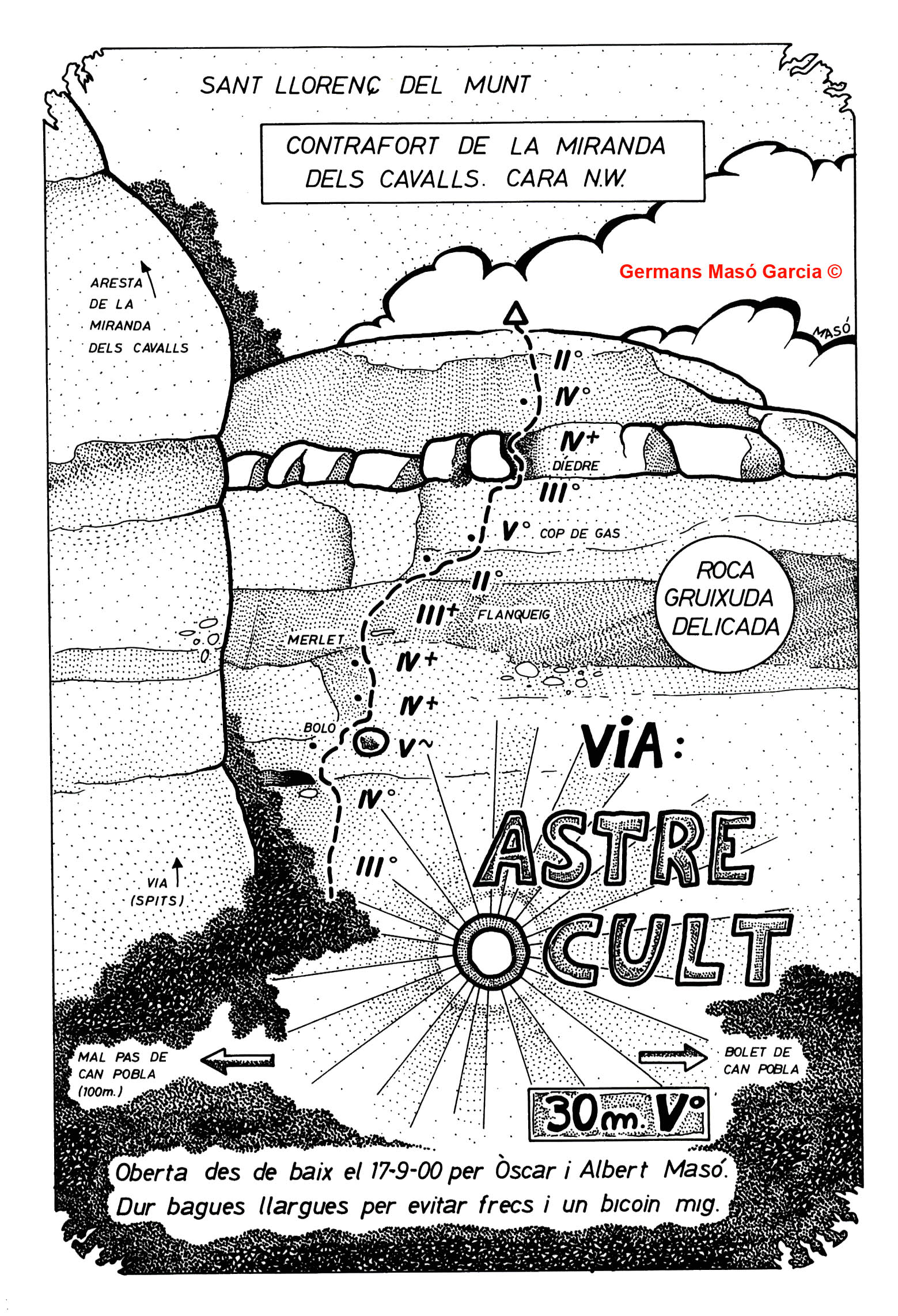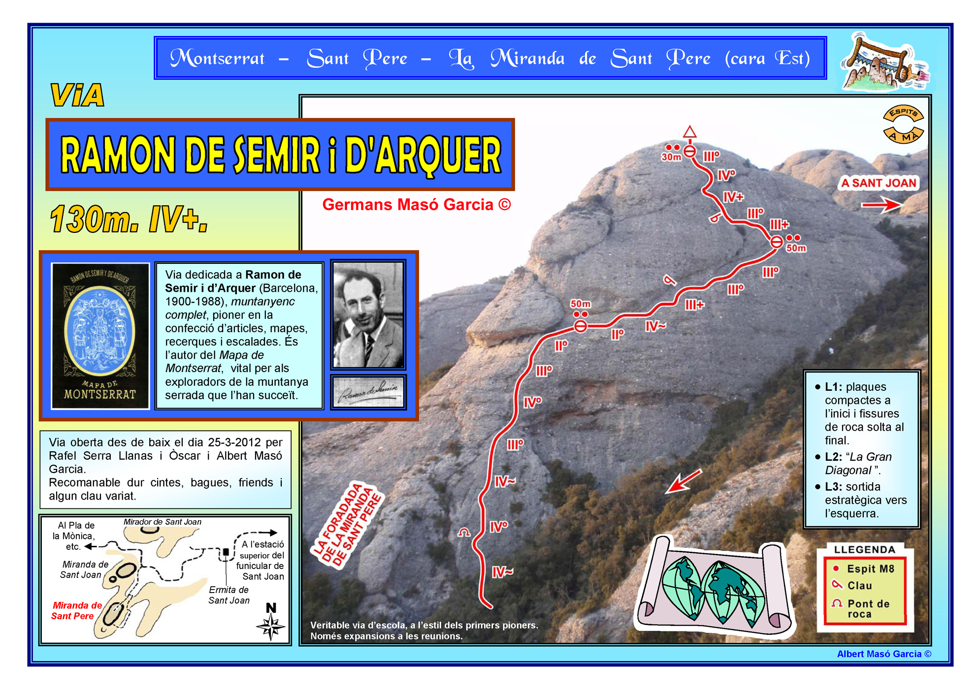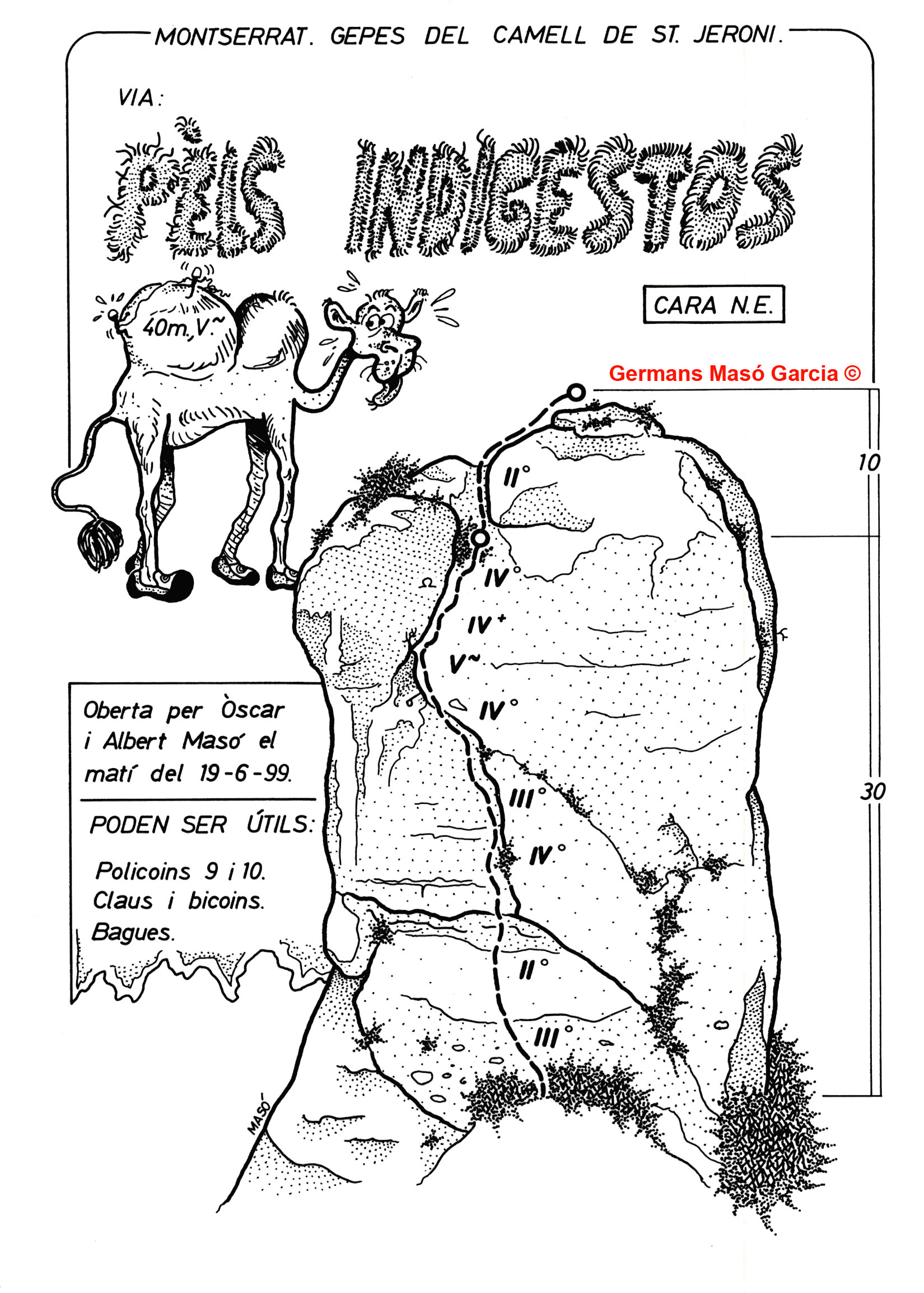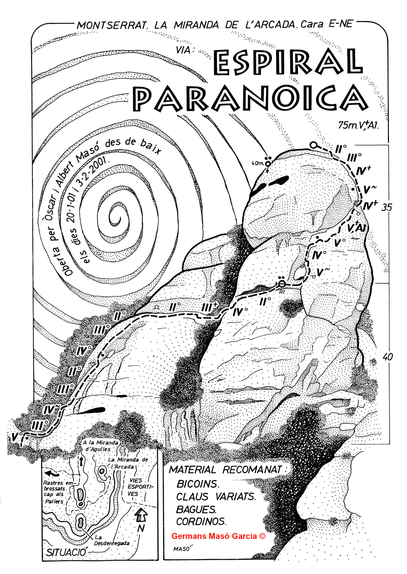 SEGURETAT: La pràctica de l’escalada és un esport que comporta risc. Tothom qui vulgui repetir alguna de les vies ressenyades en aquesta web és l’únic responsable de la seva pròpia seguretat i del conjunt de la cordada. En aquest sentit, els autors de les vies i les ressenyes declinen qualsevol responsabilitat.