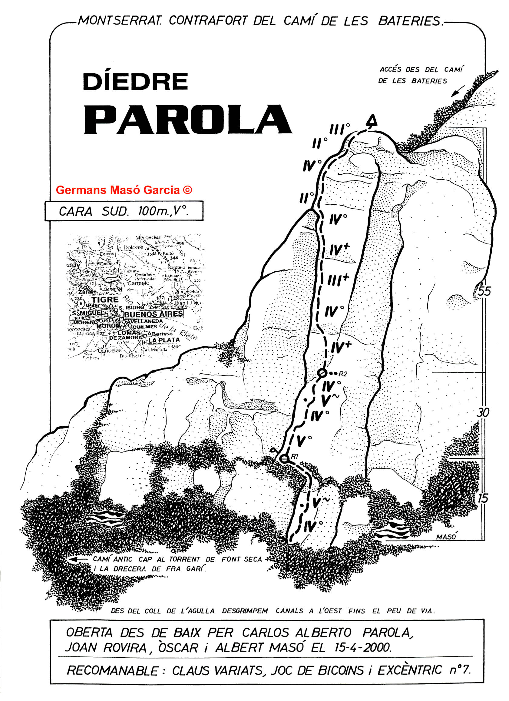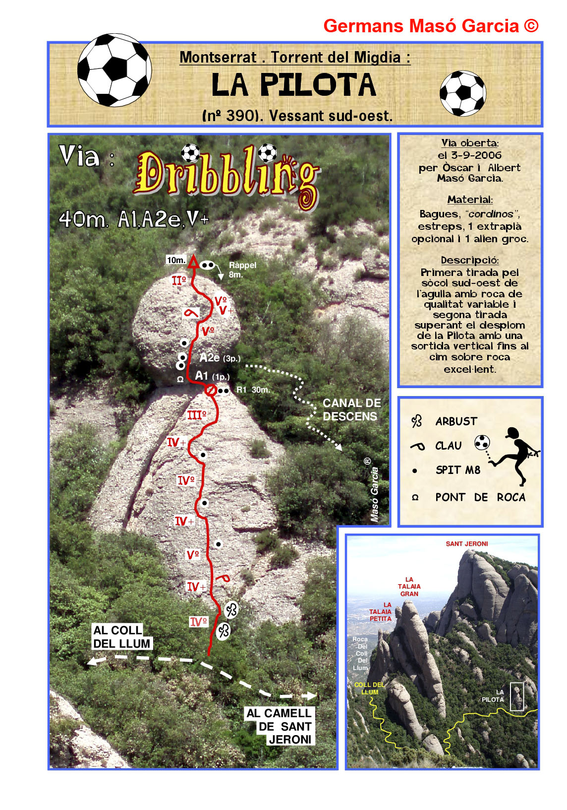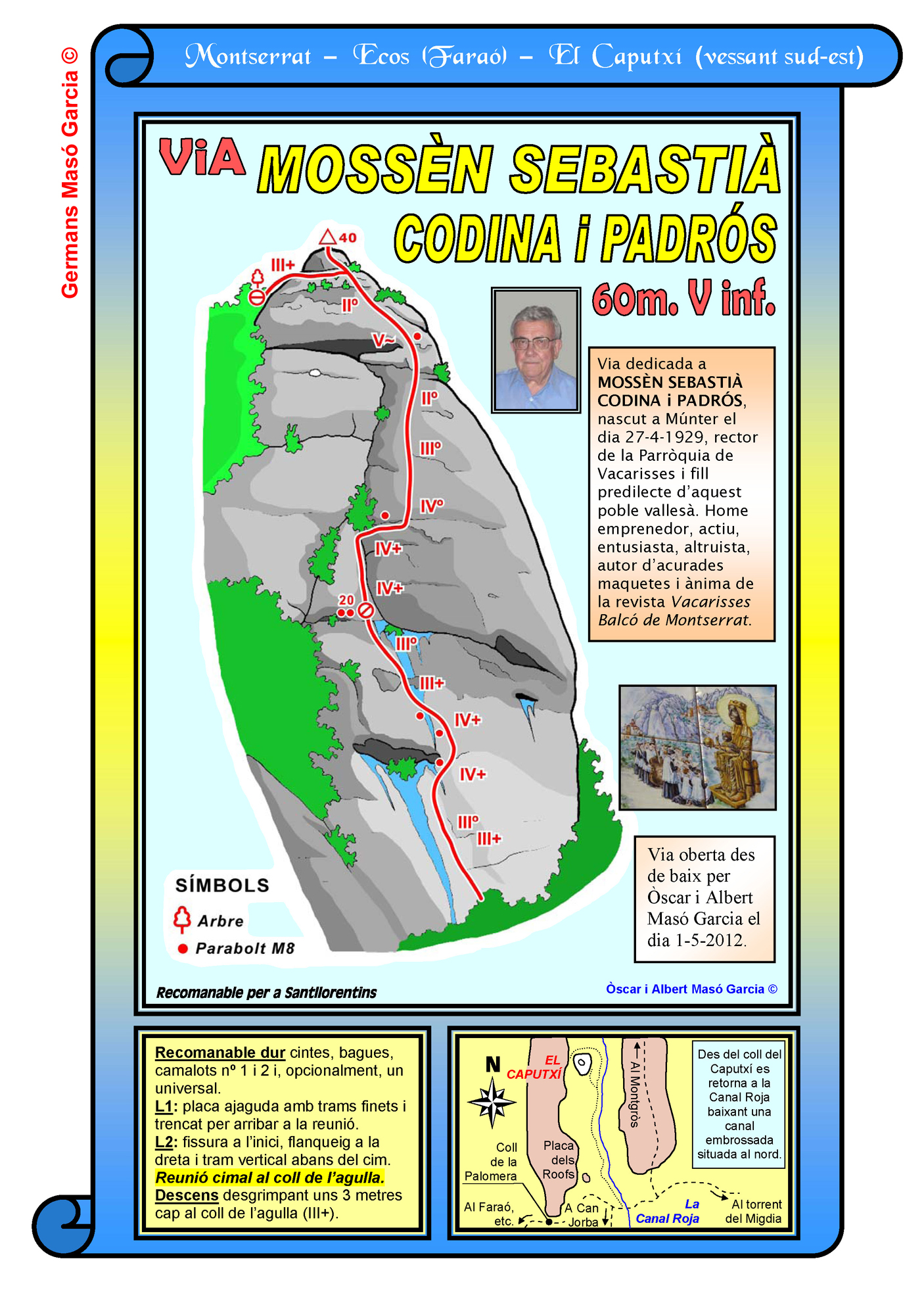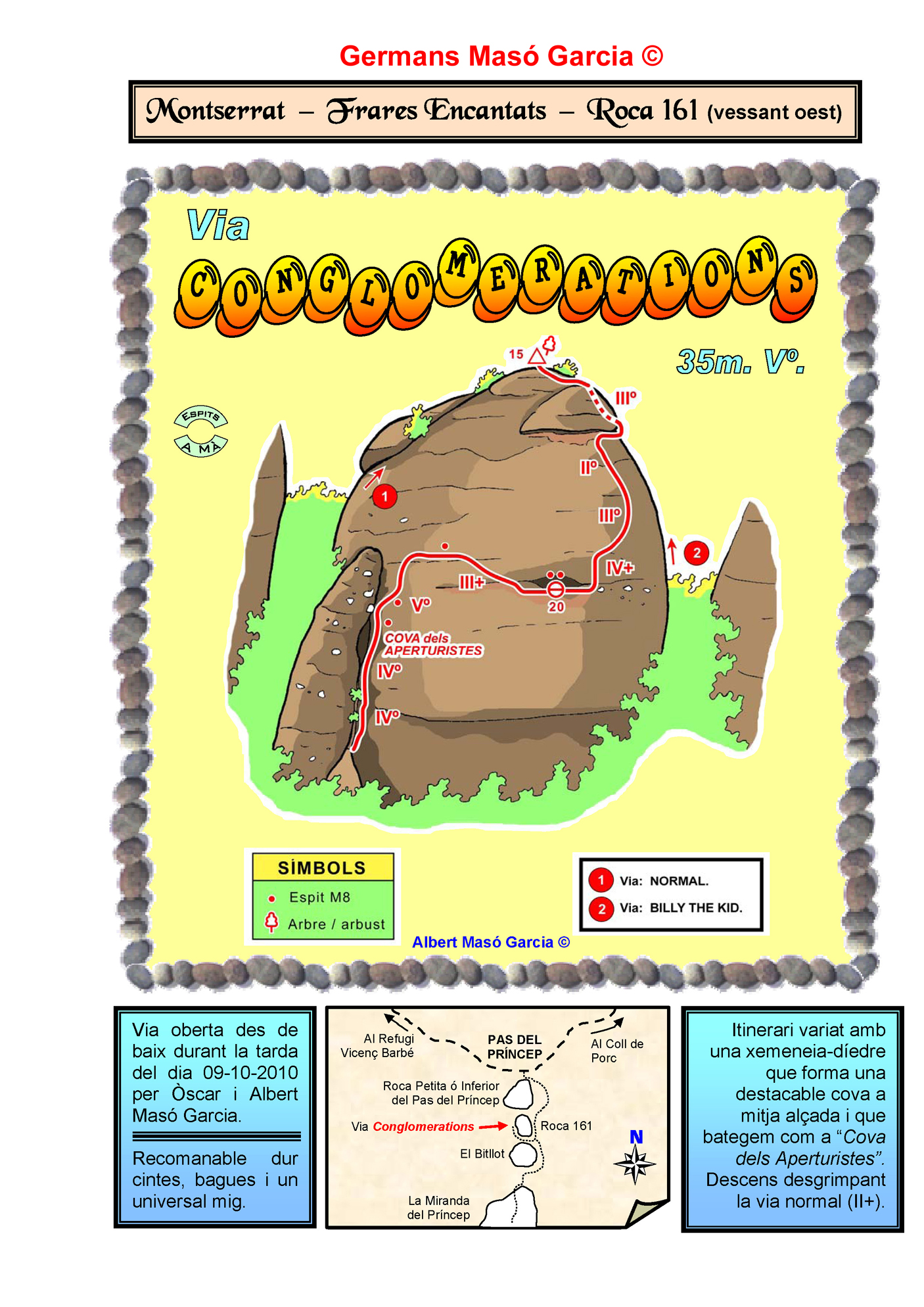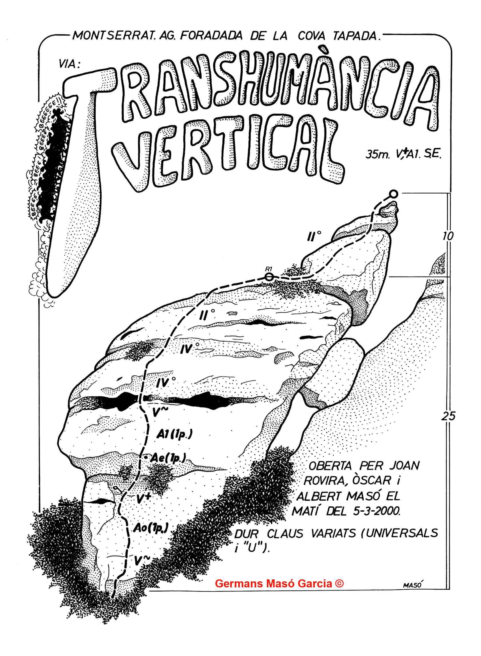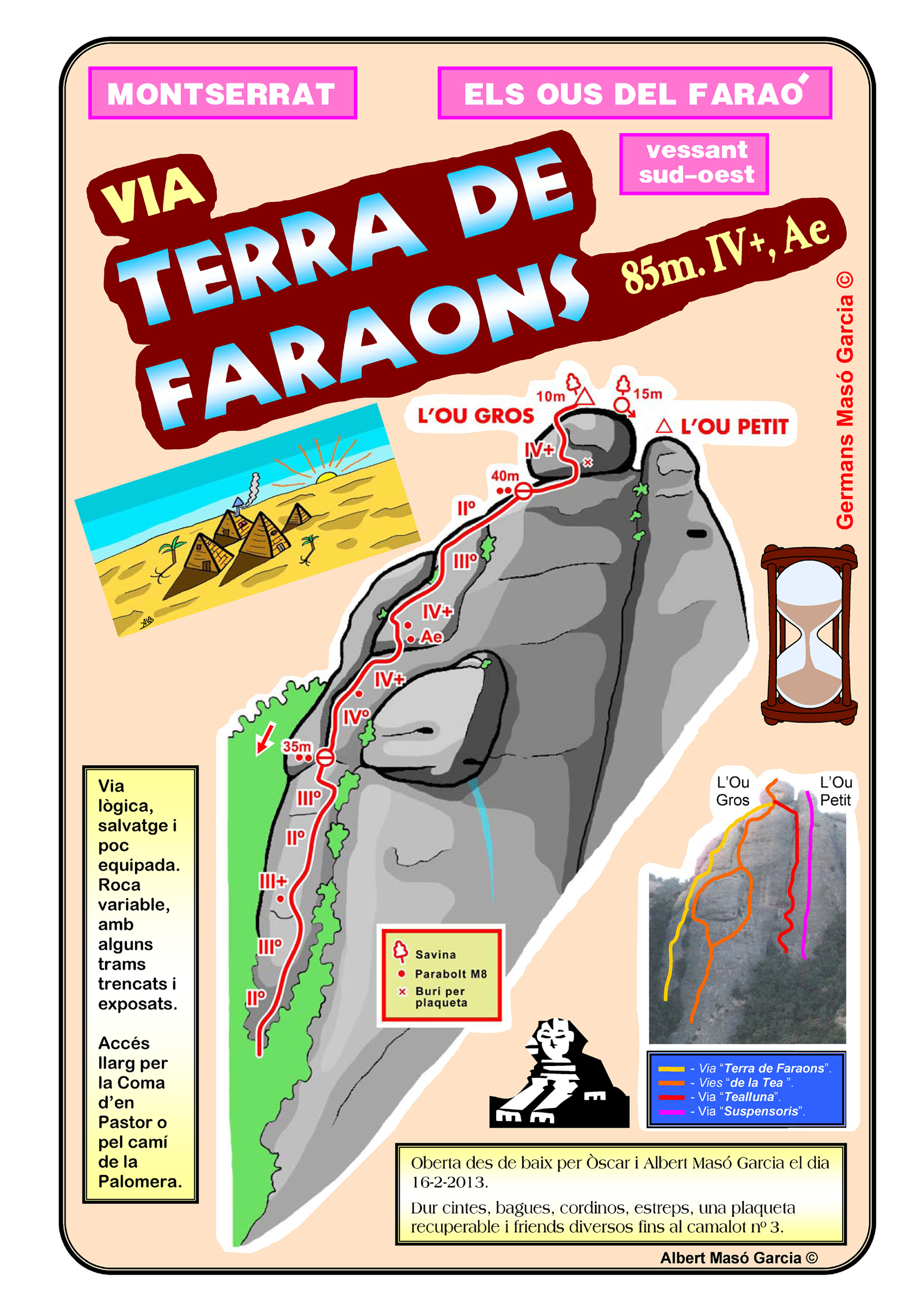 SEGURETAT: La pràctica de l’escalada és un esport que comporta risc. Tothom qui vulgui repetir alguna de les vies ressenyades en aquesta web és l’únic responsable de la seva pròpia seguretat i del conjunt de la cordada. En aquest sentit, els autors de les vies i les ressenyes declinen qualsevol responsabilitat.