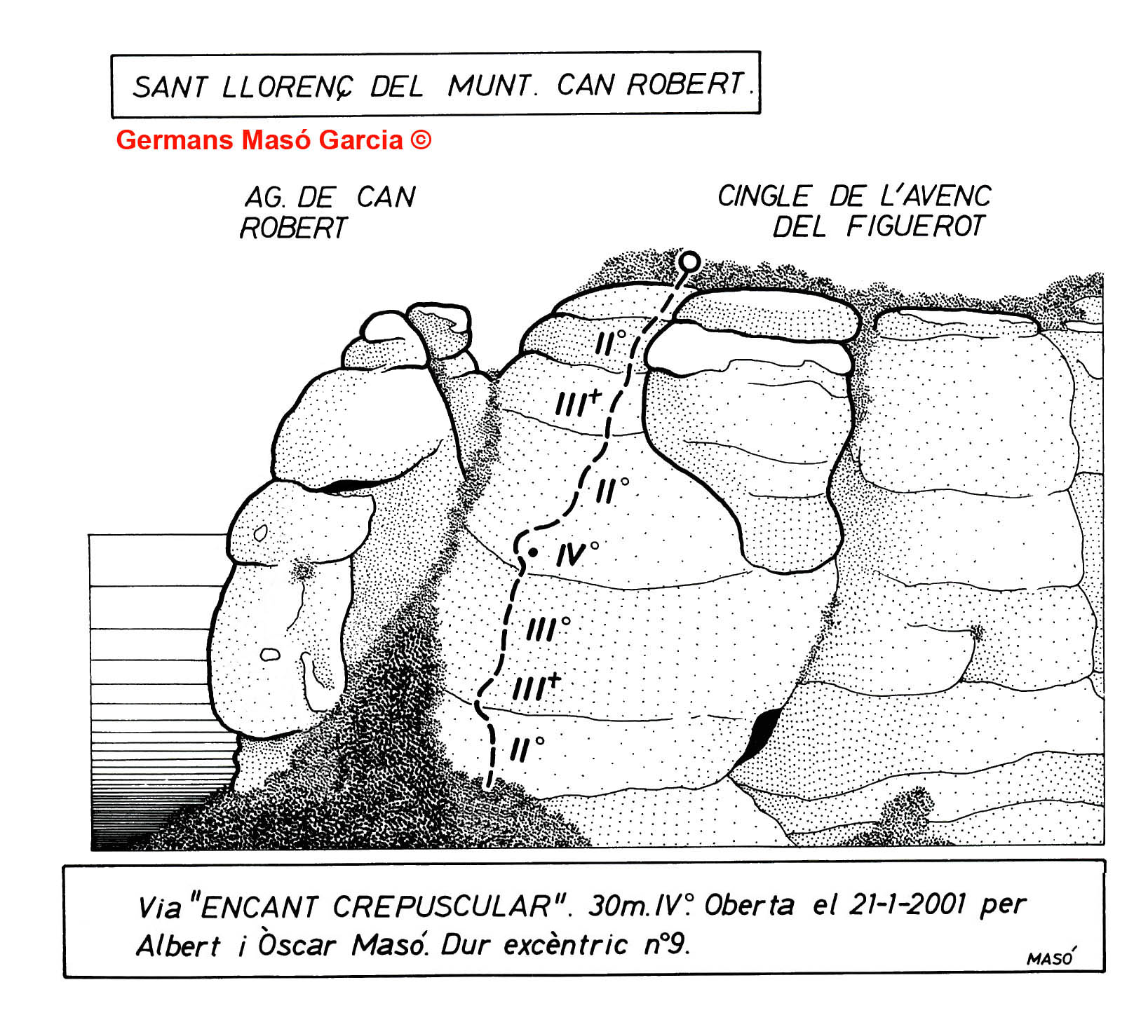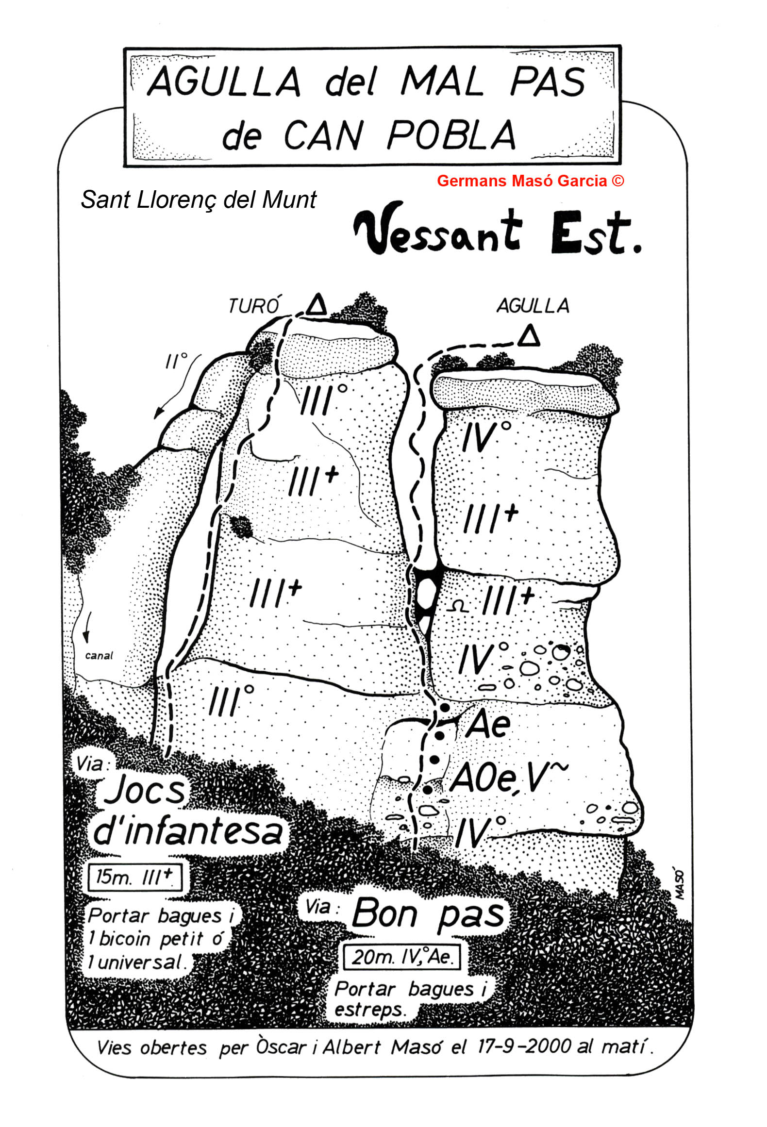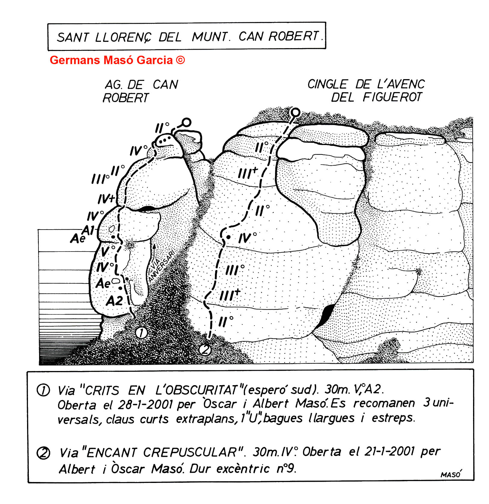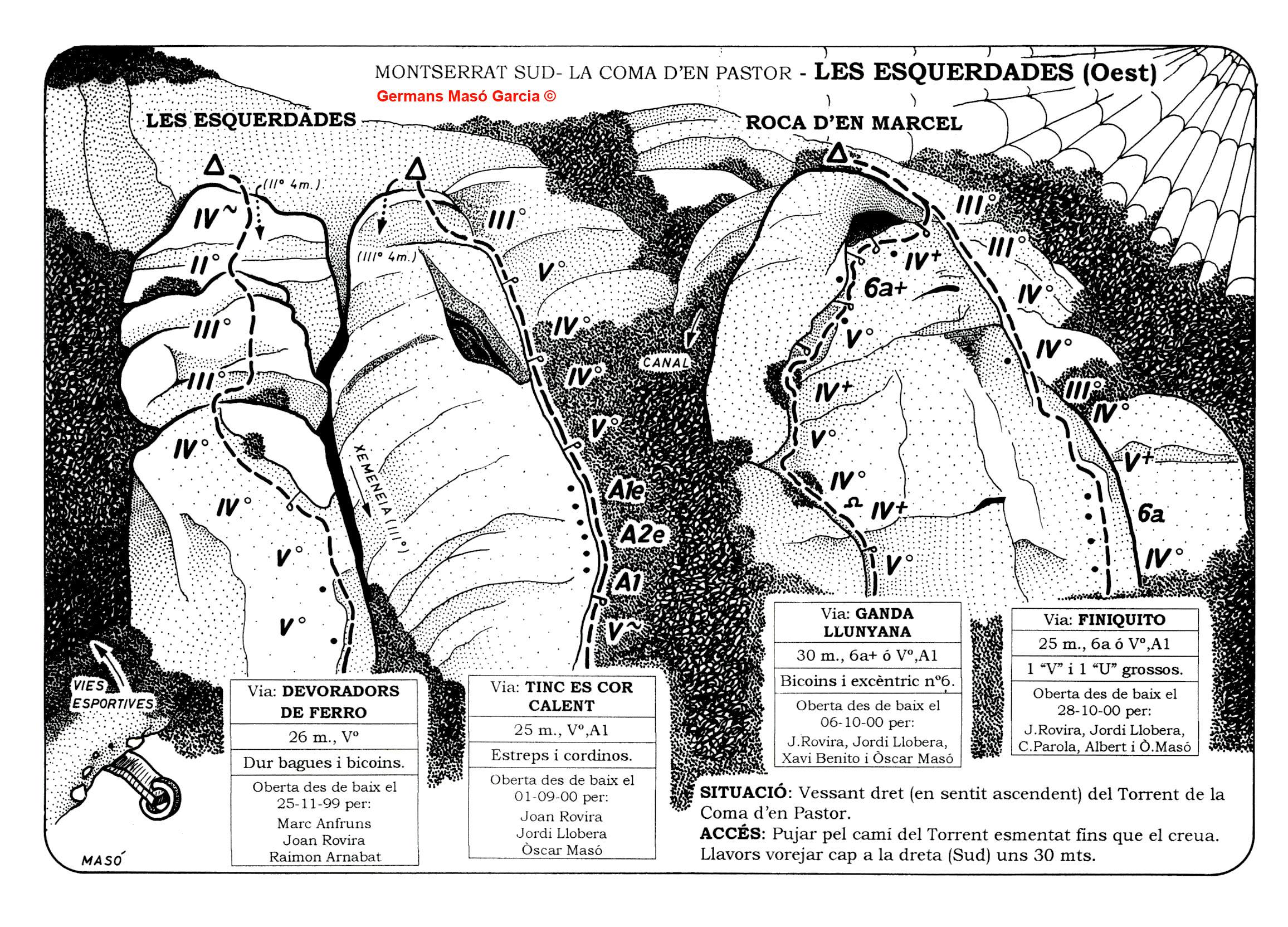 Els germans Albert i Òscar Masó Garcia han obert més de 400 vies d’escalada en roca, de caire clàssic i majoritàriament obertes des de baix en diversos massissos catalans. En el següent mapa s’indiquen els llocs on han obert vies: